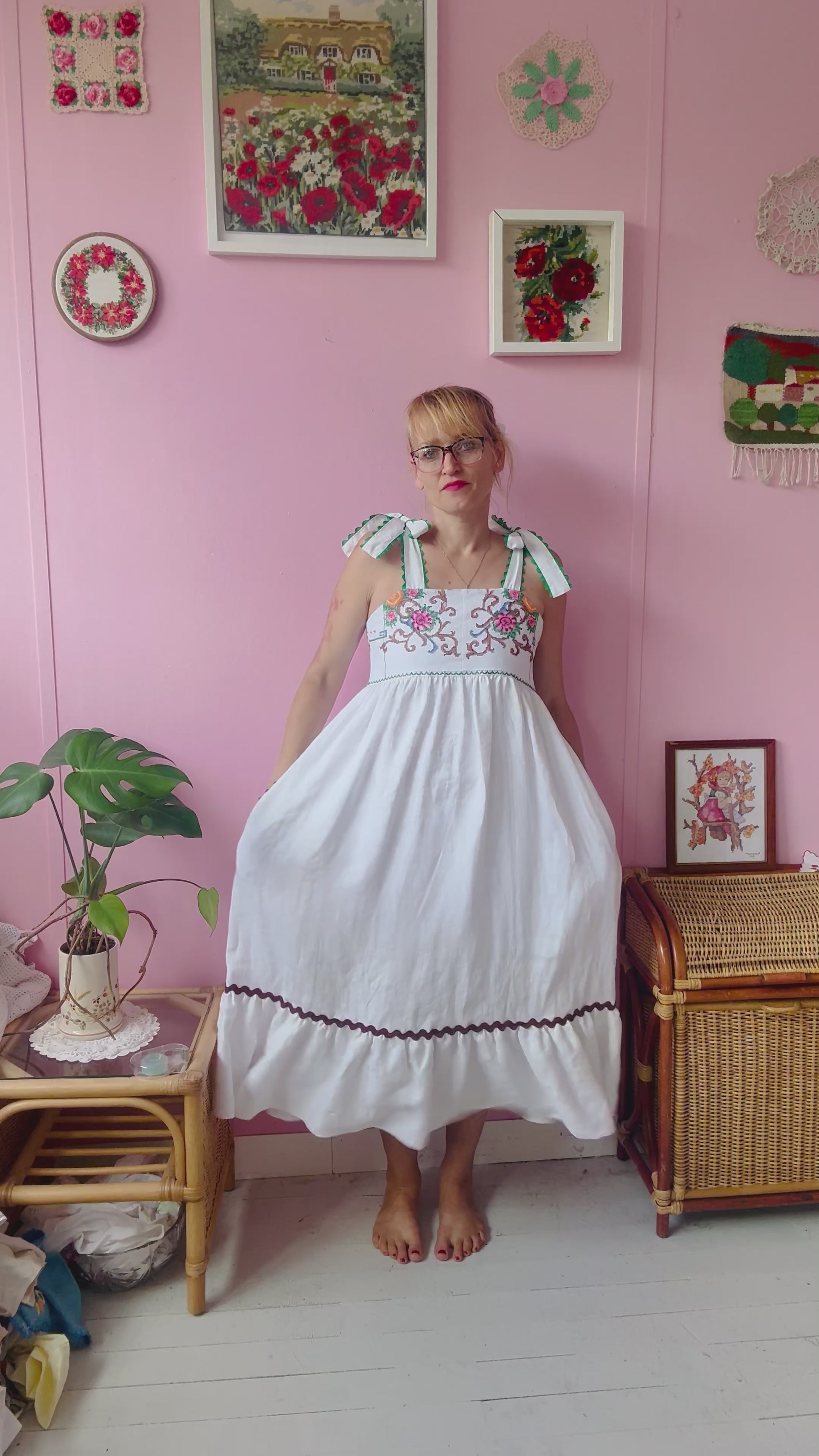 Midi dress made from vintage tablecloths with hand embroidery-top part is tablecloth with cross stitching details and bottom part is white vintage damask