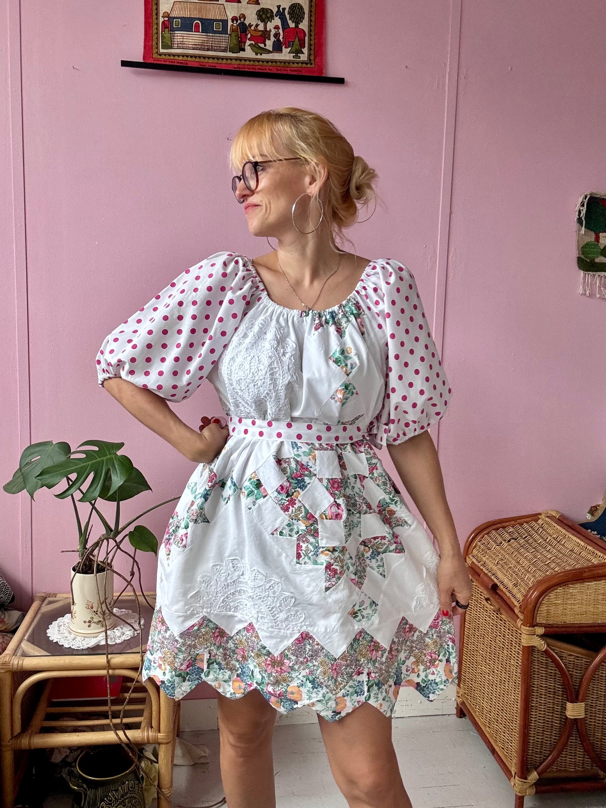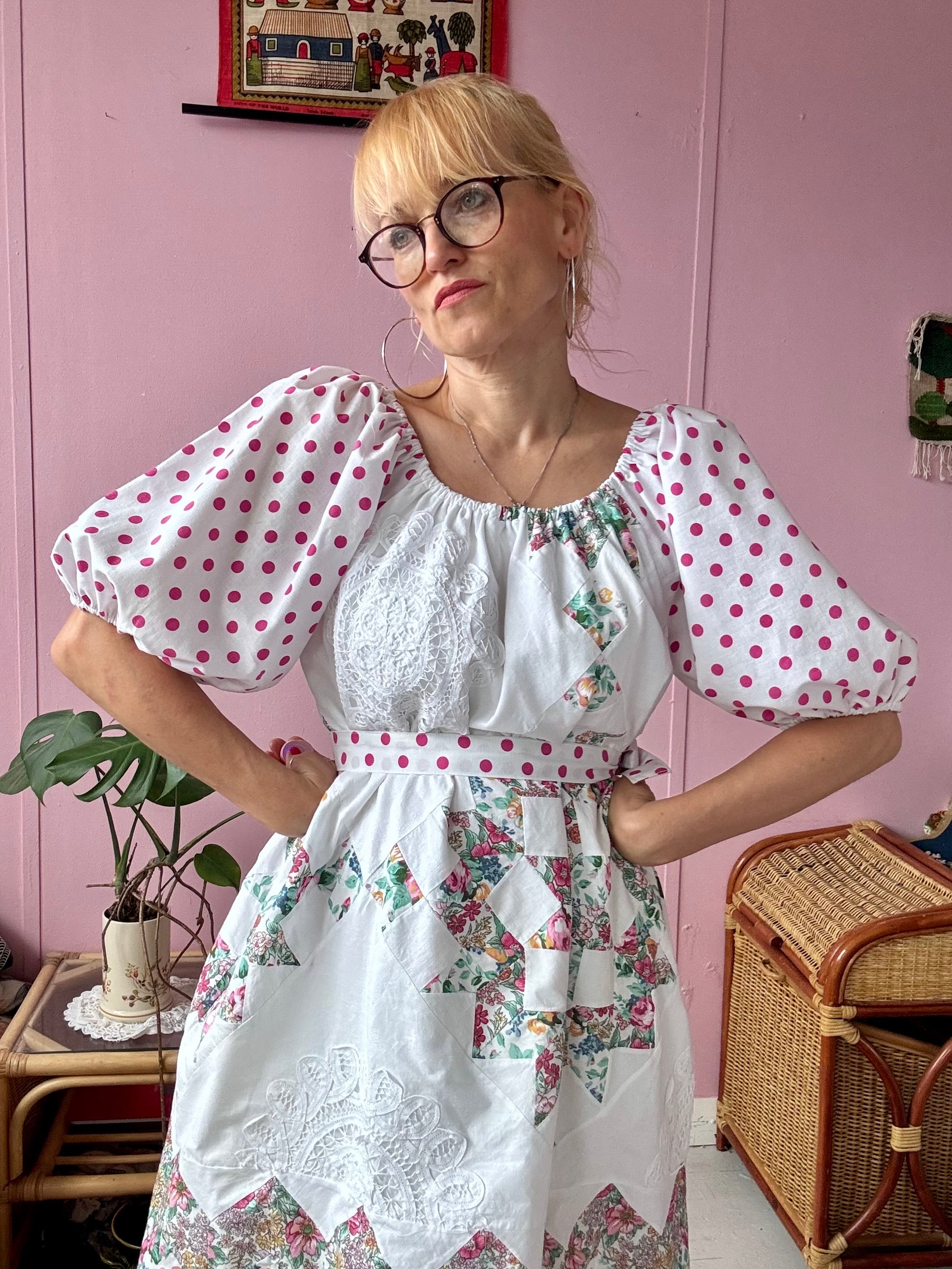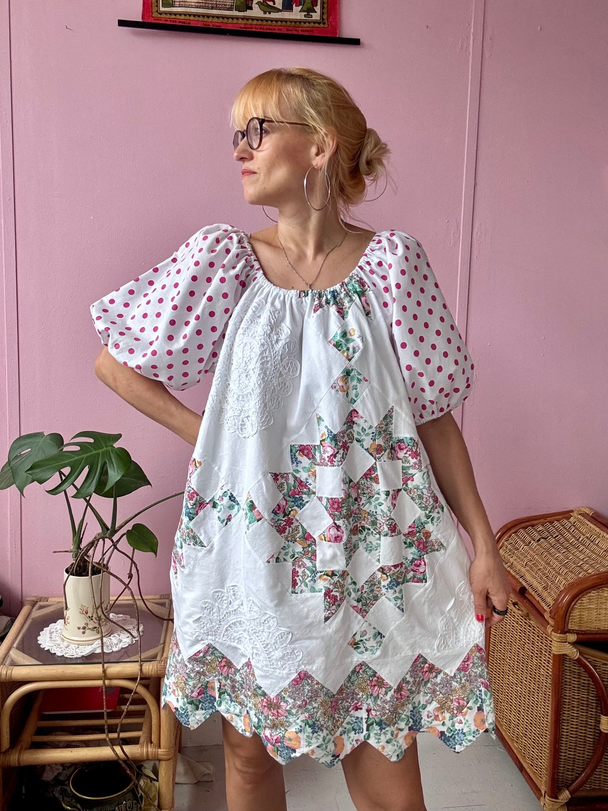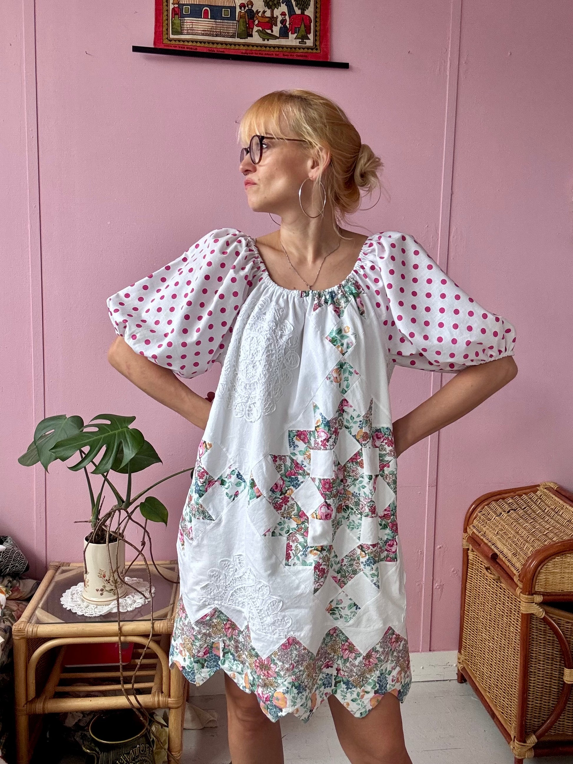 Short dress made from vintage patchwork blanket(quite thin-I think it was bed topper) and vintage polka dots fabric