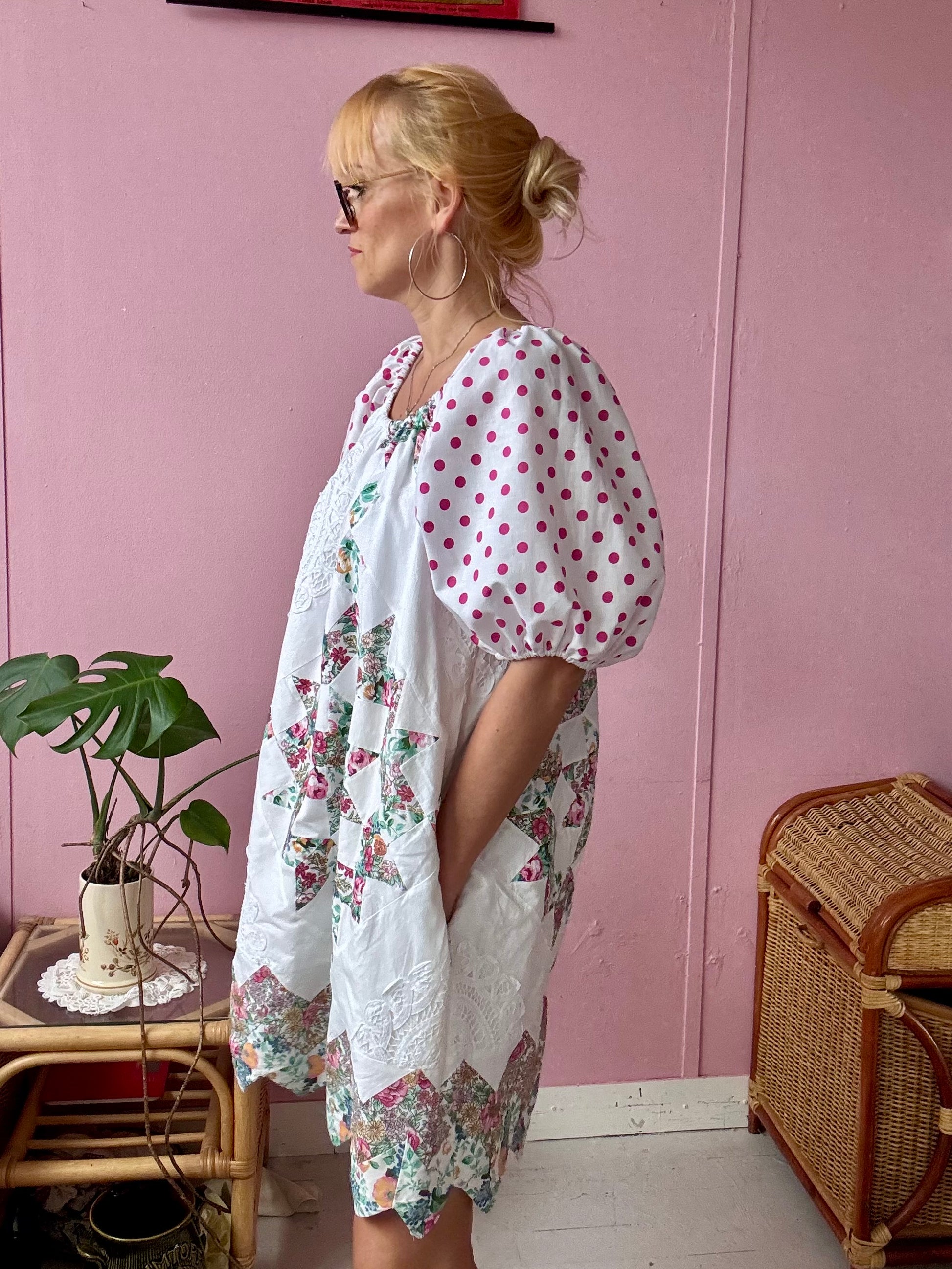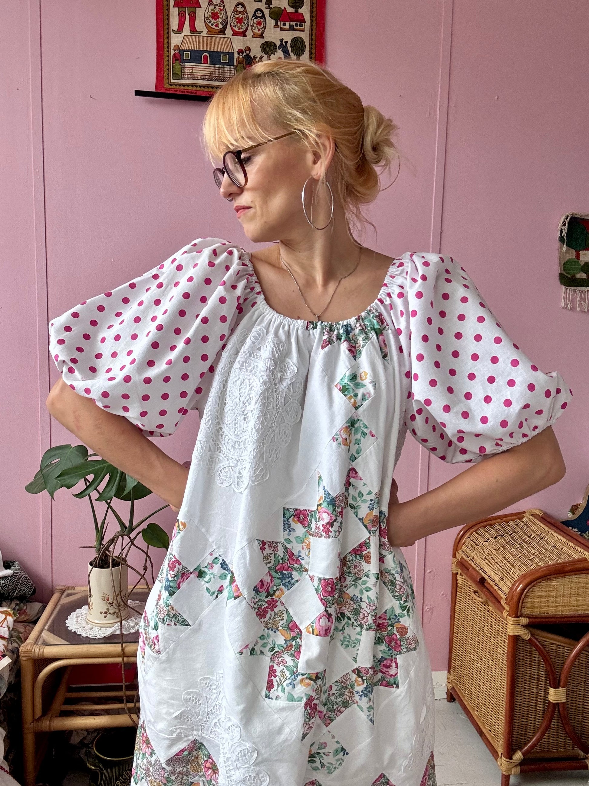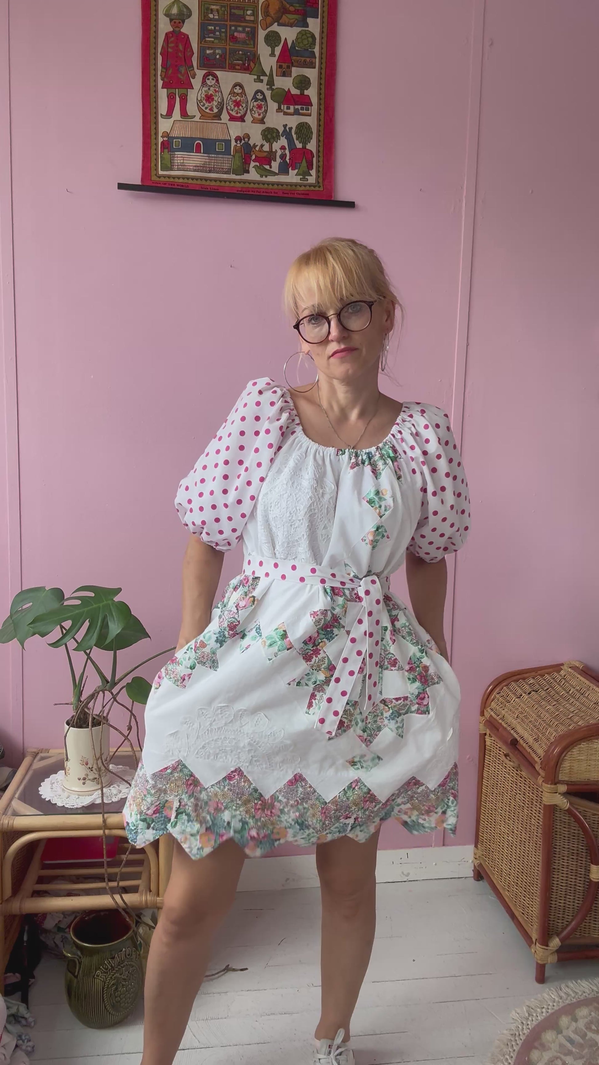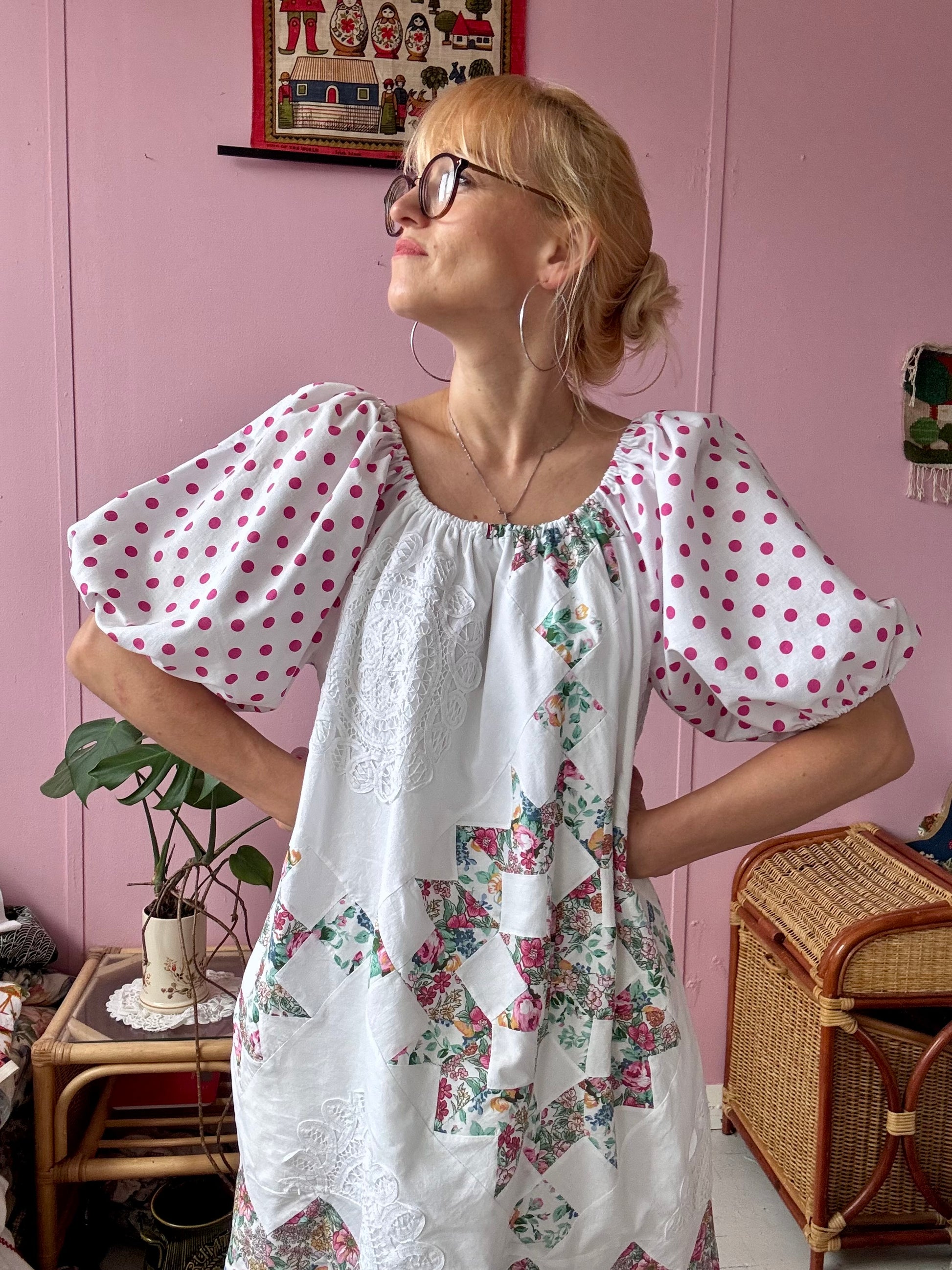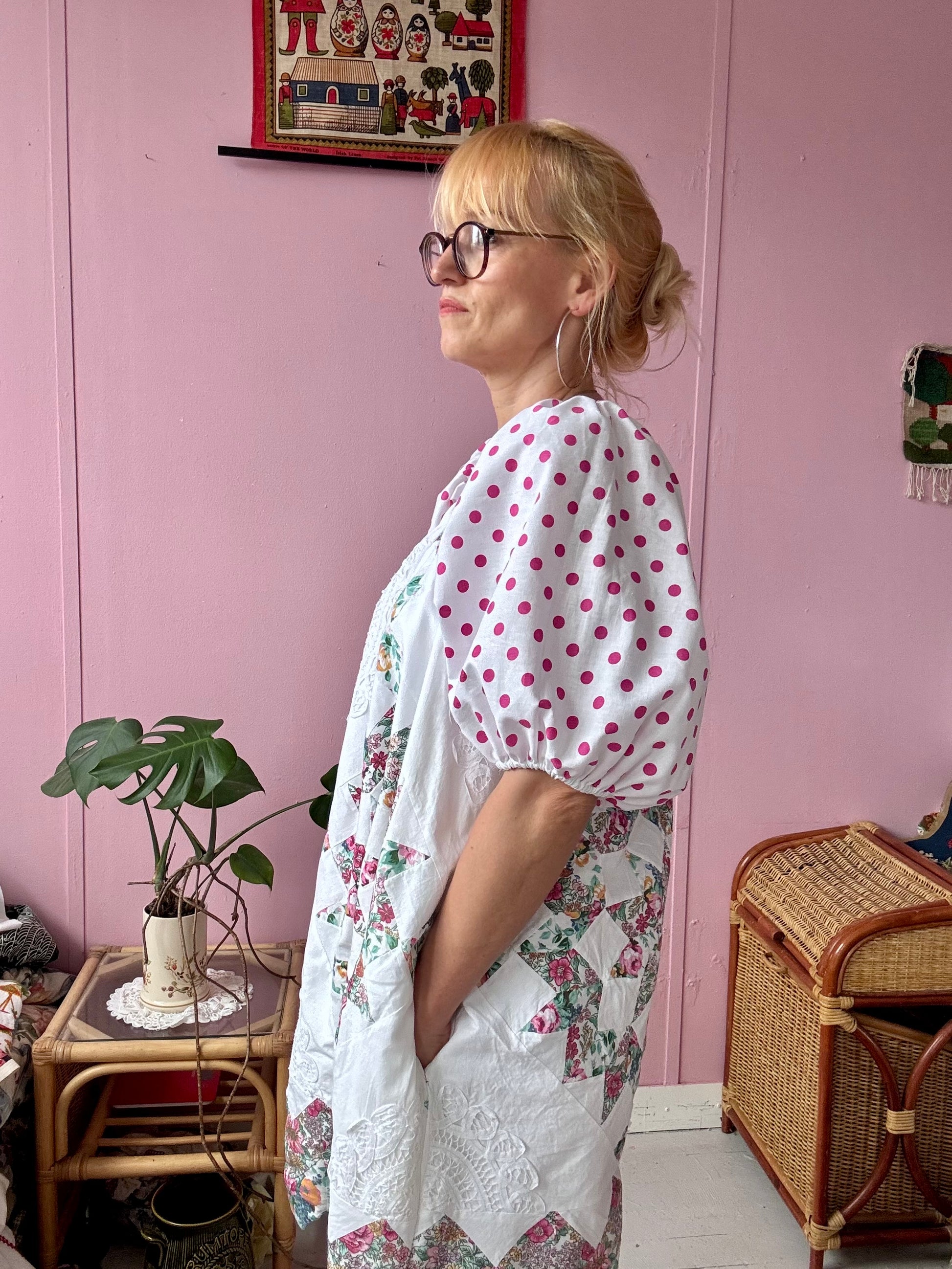 Short dress made from vintage patchwork blanket(quite thin-I think it was bed topper) and vintage polka dots fabric