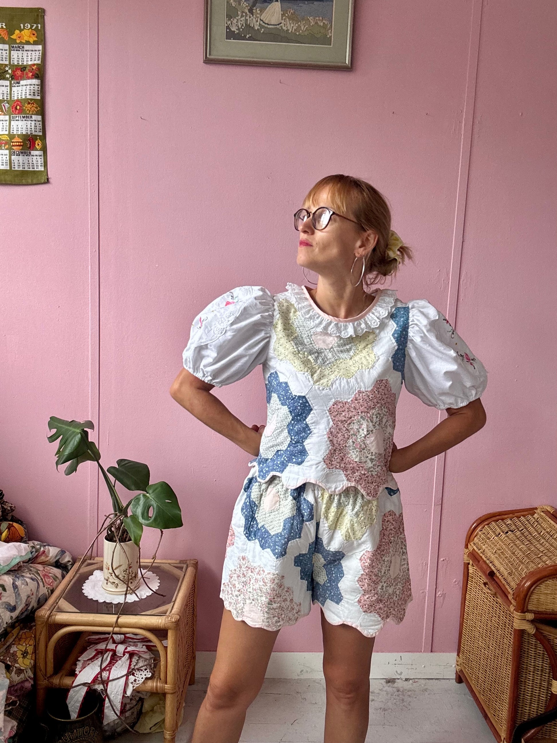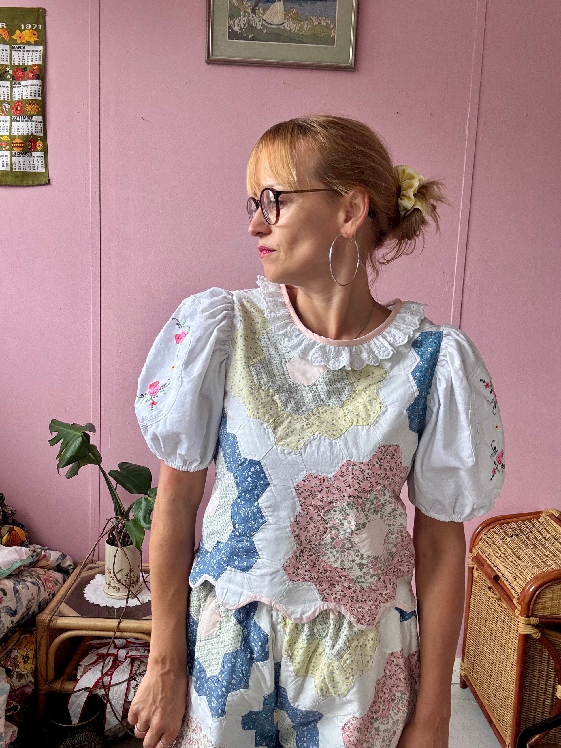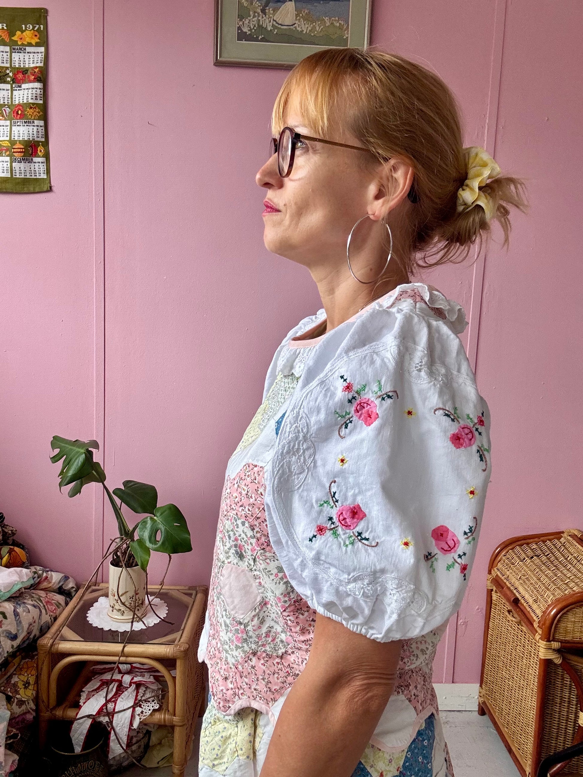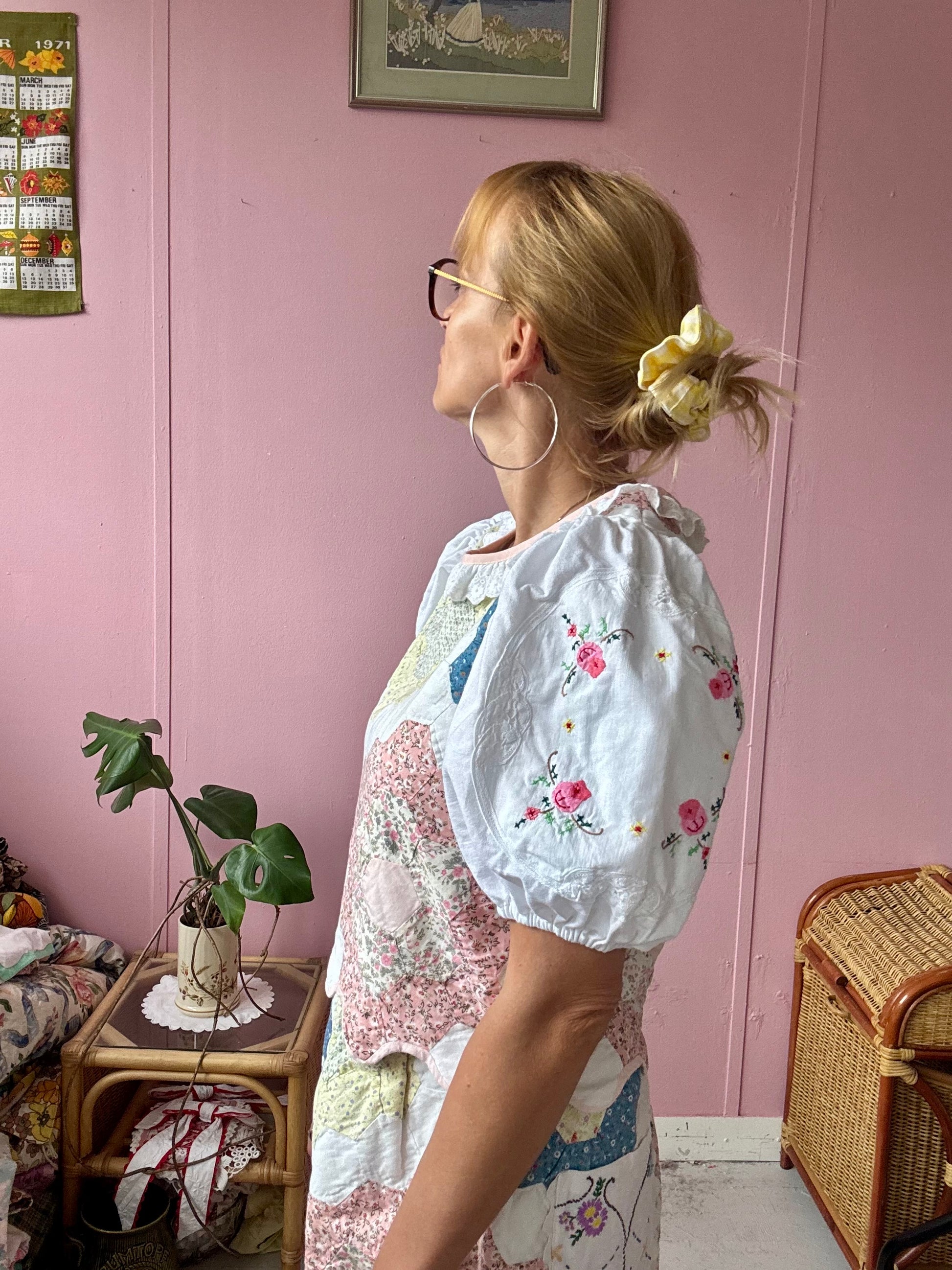Short puffy sleeves with embroidery central pieces stitched on-appliques and lace details