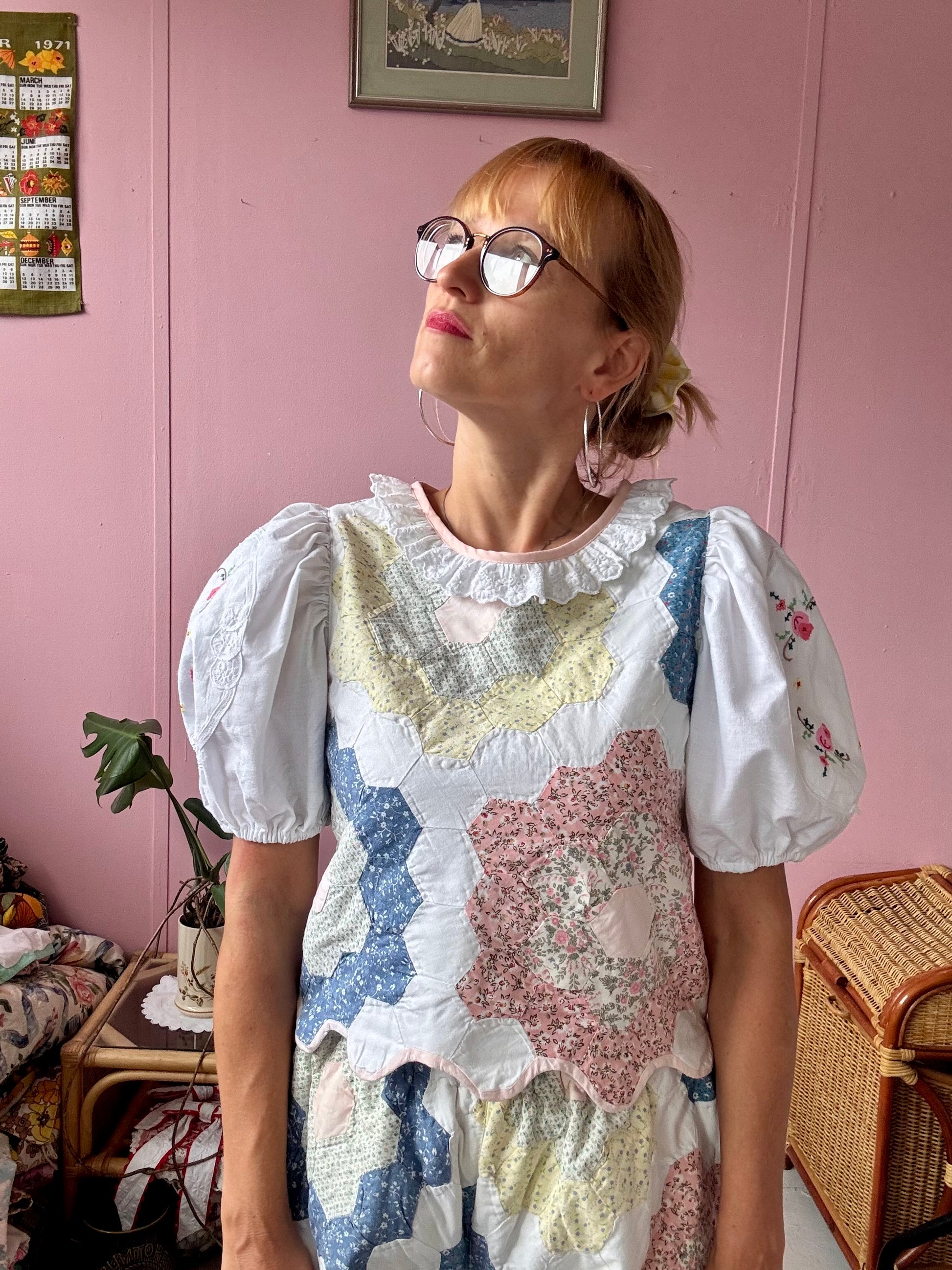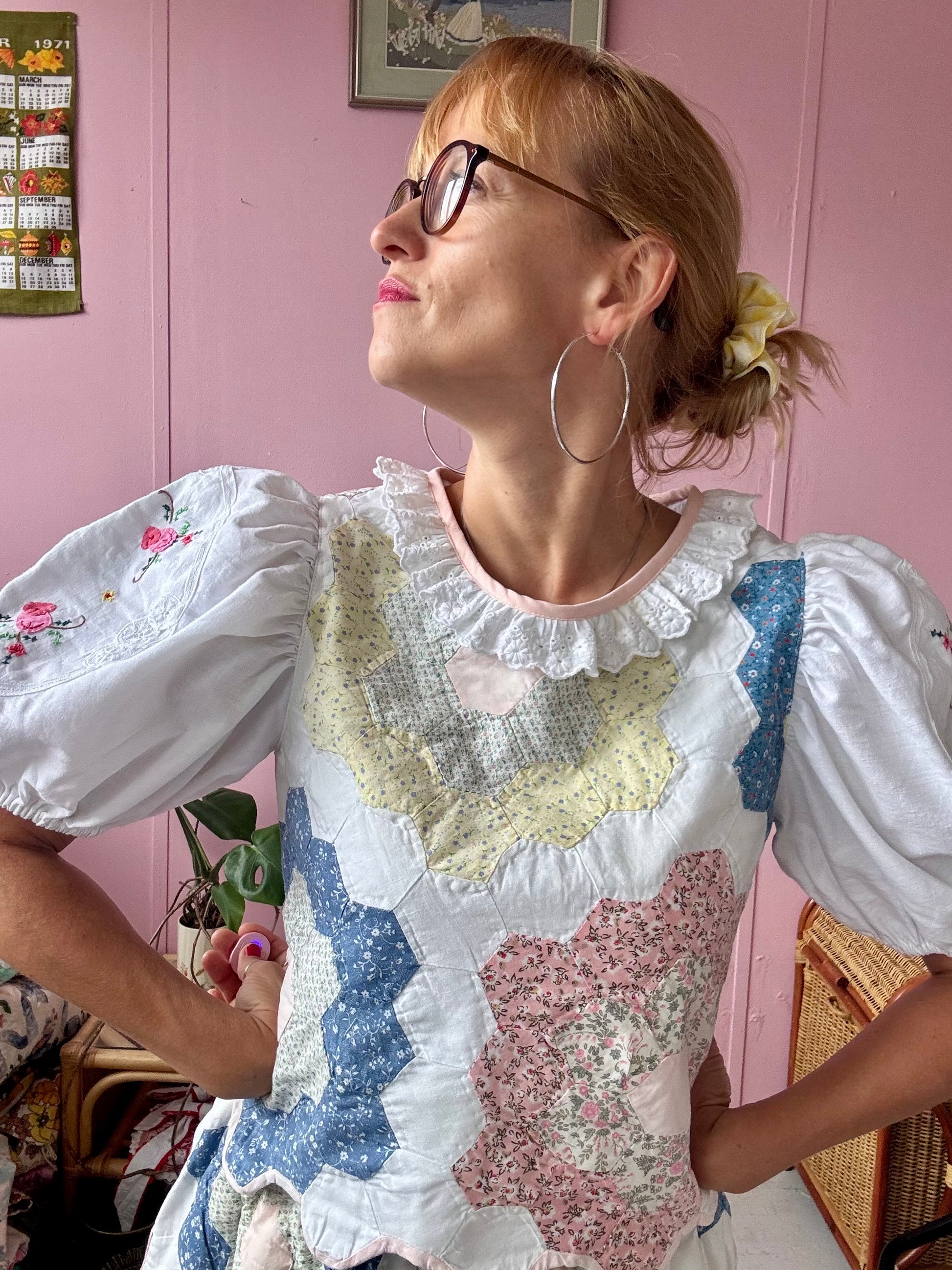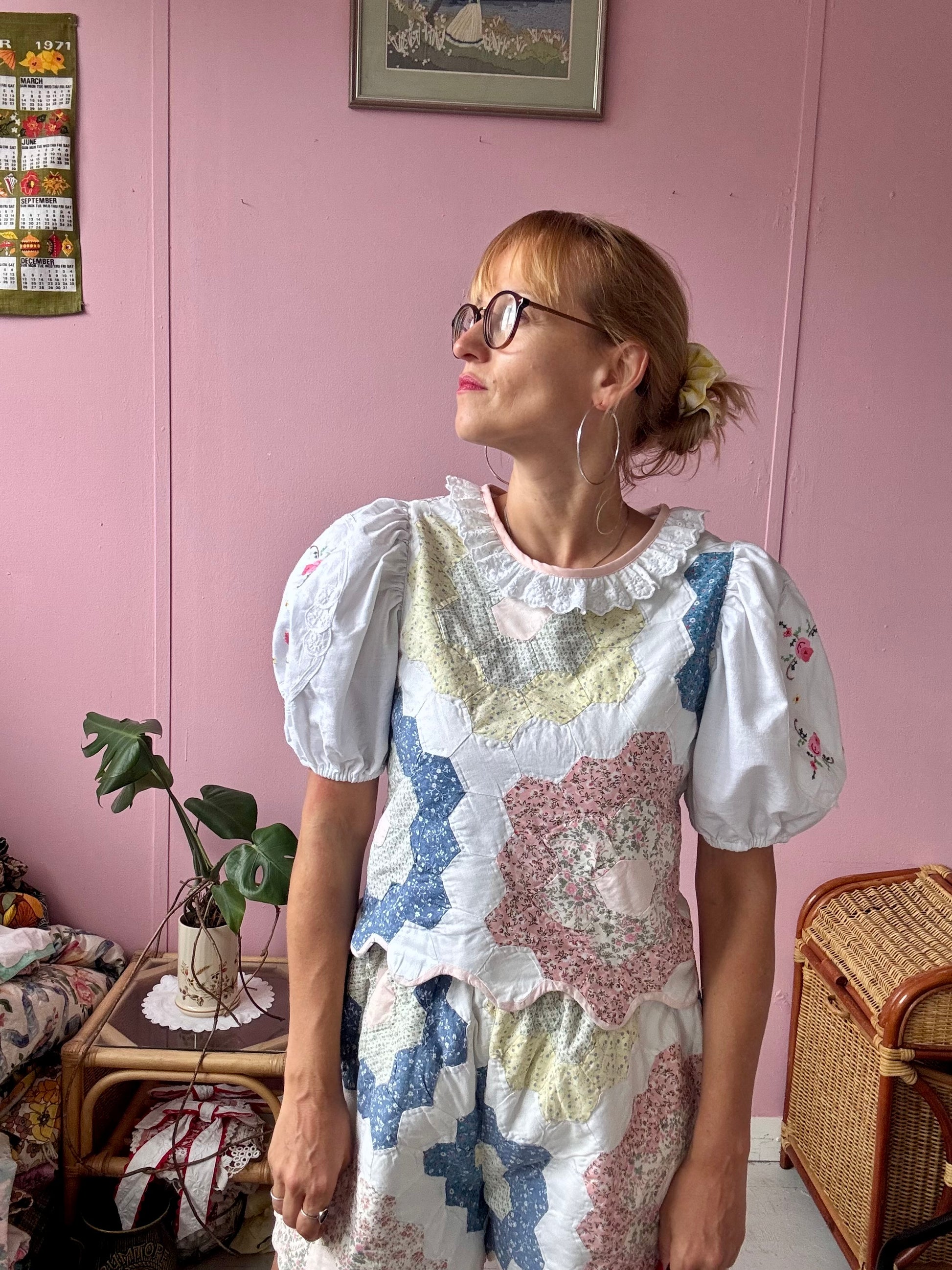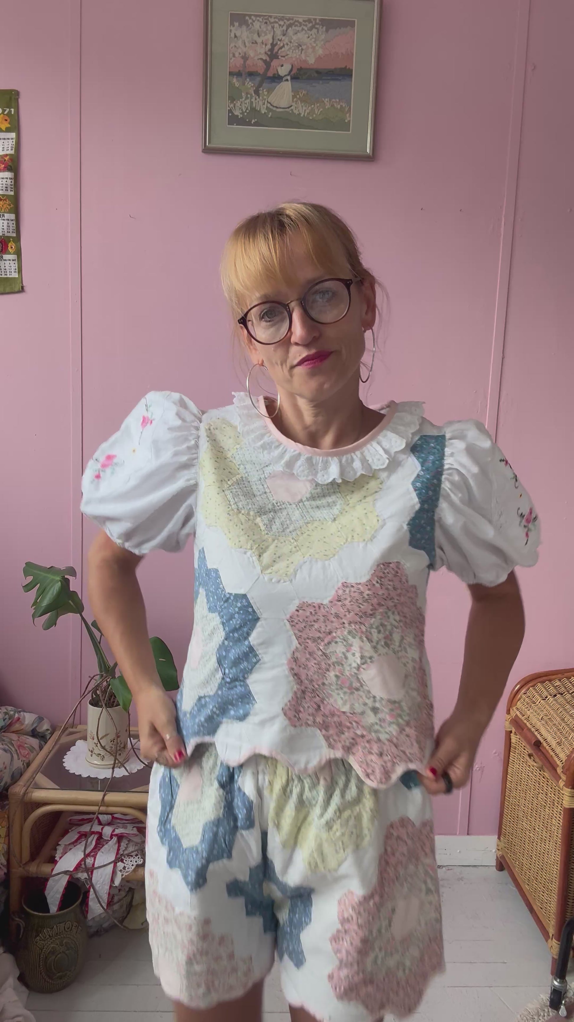 Short puffy sleeves with embroidery central pieces stitched on-appliques and lace details