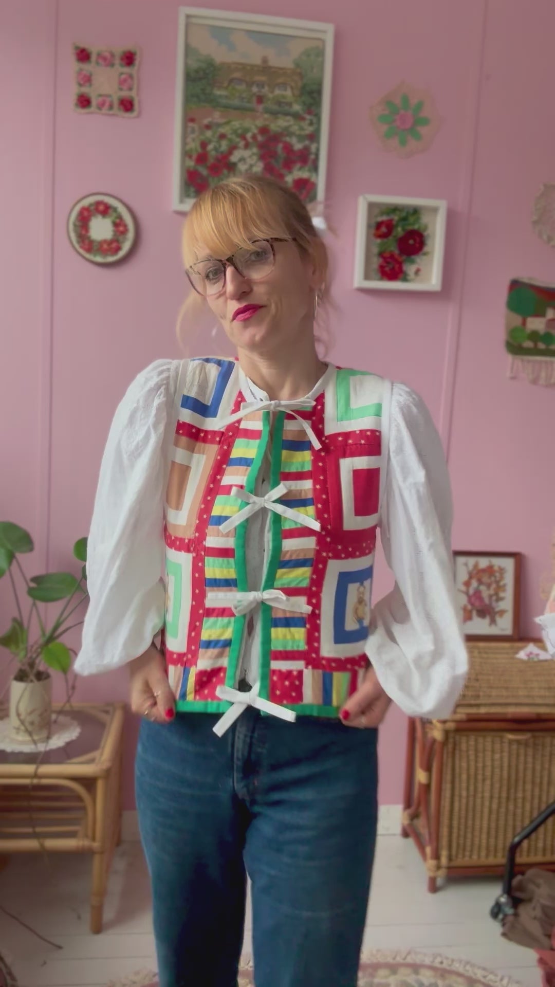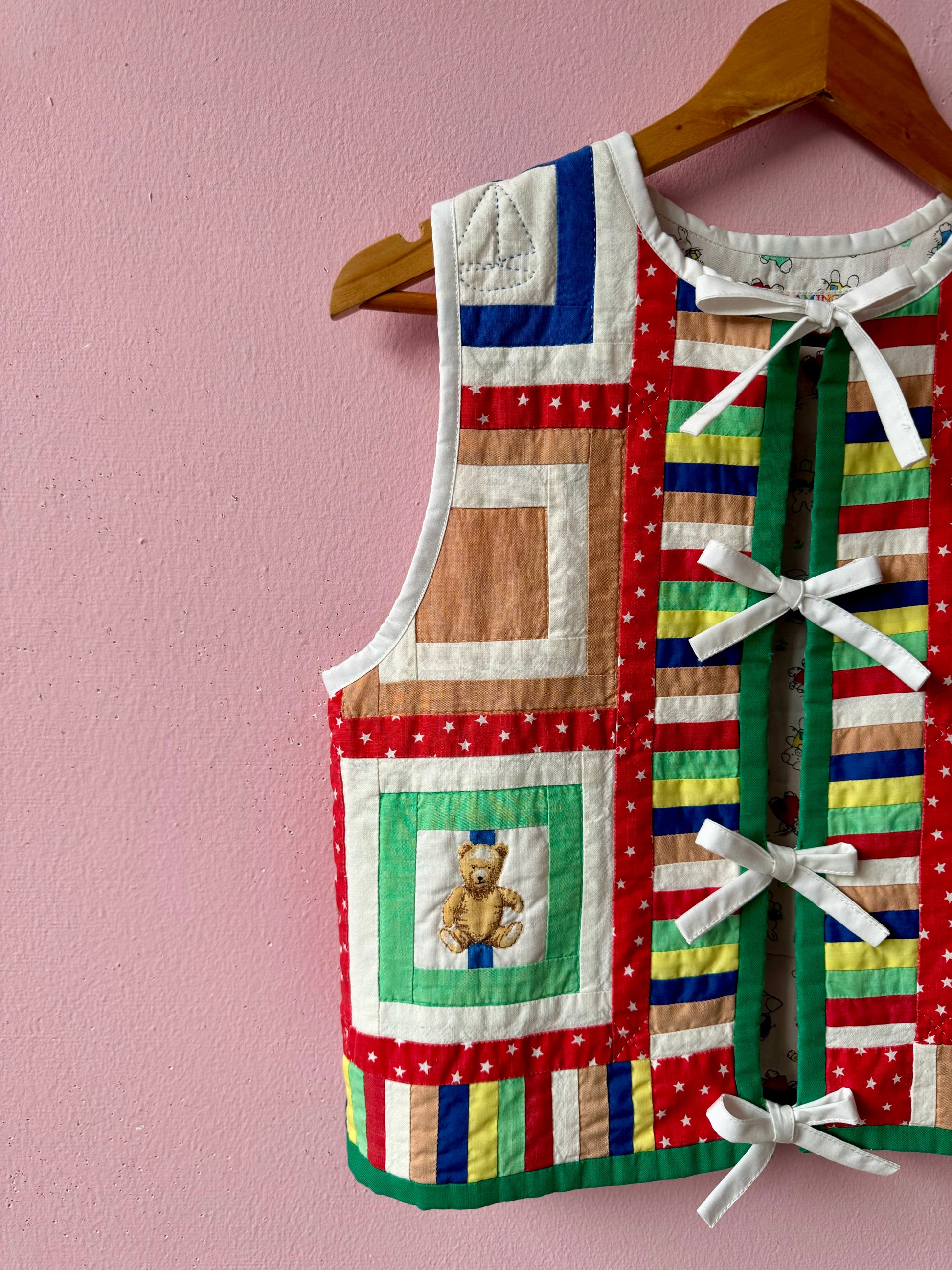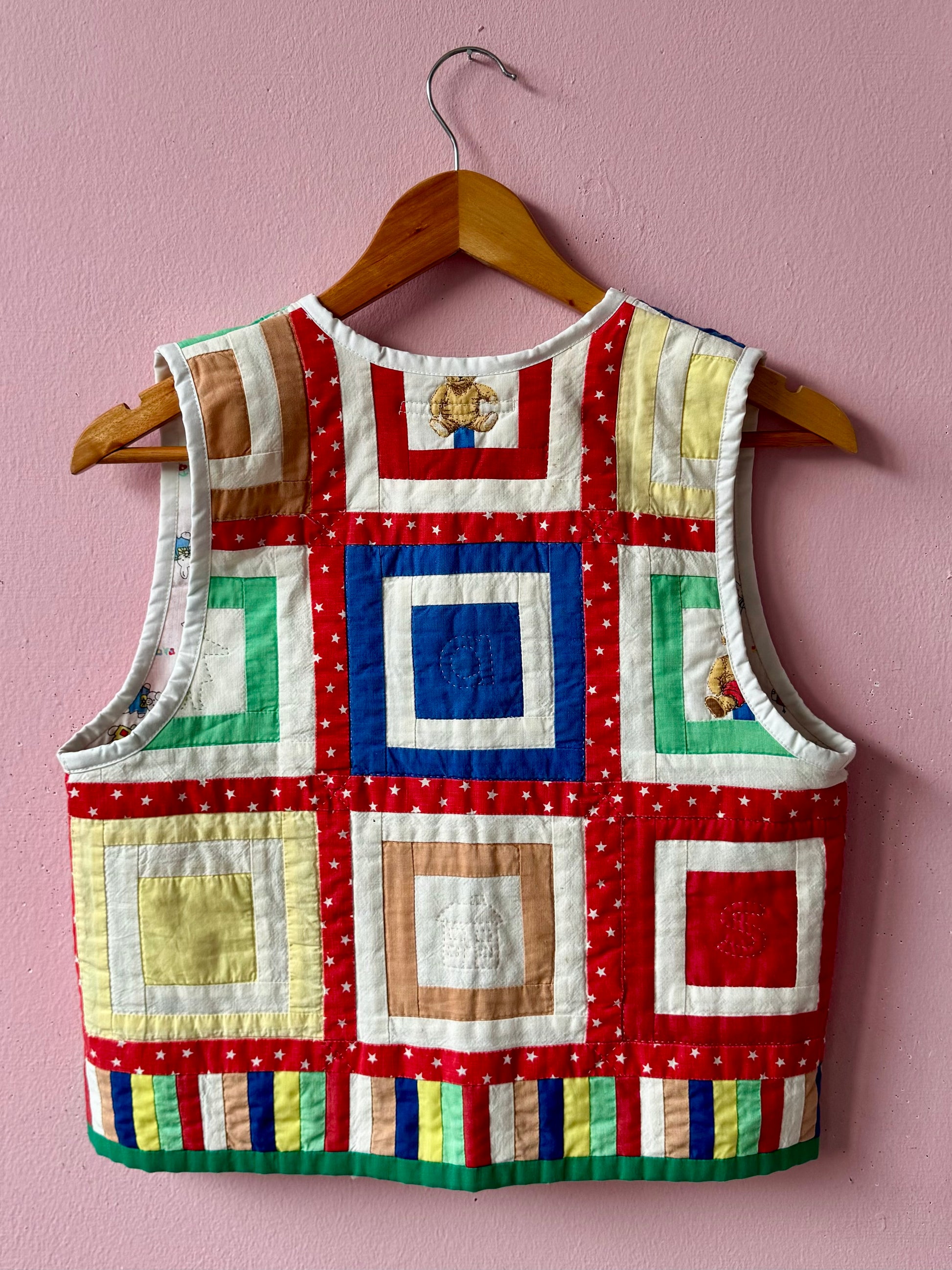 Patchwork vest made from vintage blanket with bears