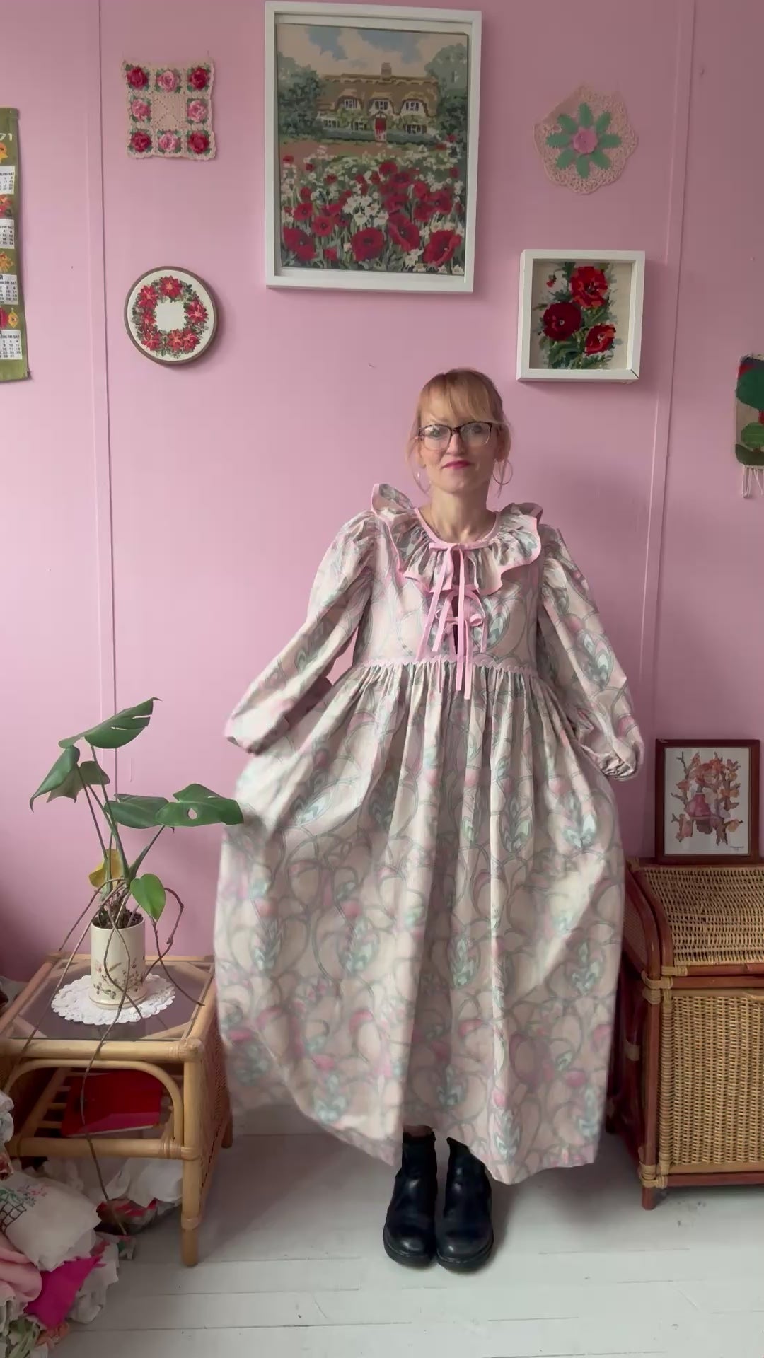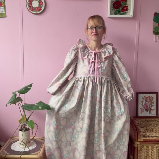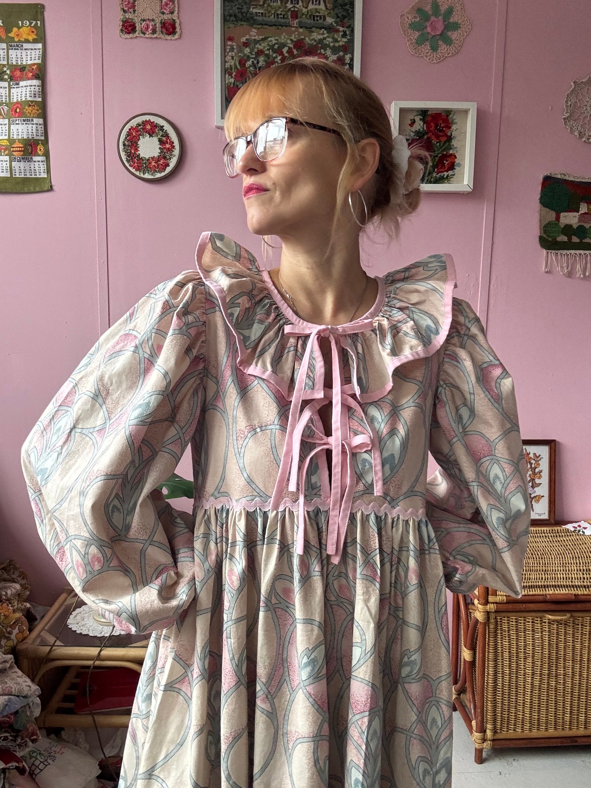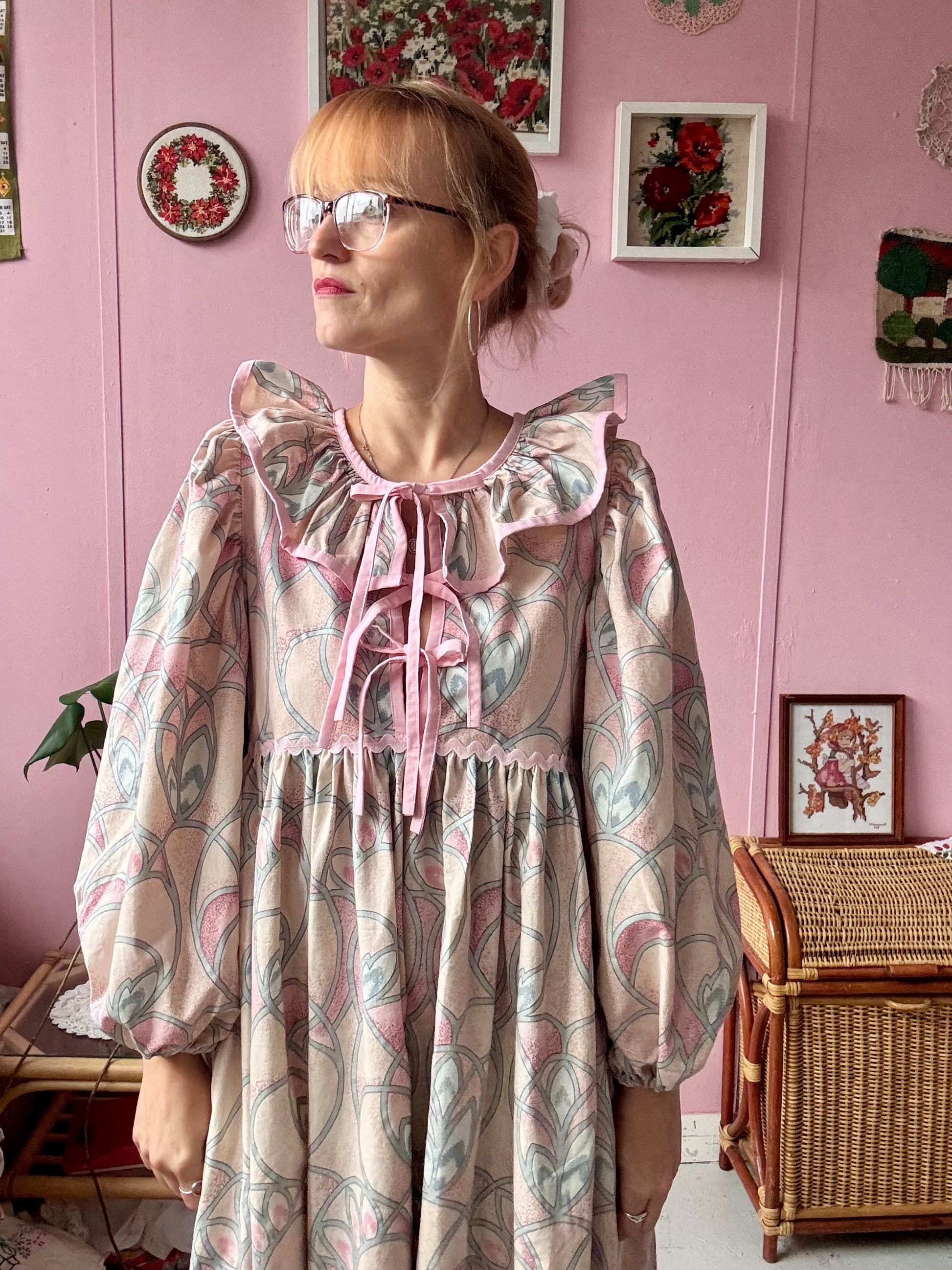 Maxi dress with long sleeves made from vintage curtains with pink/peach/silver pattern
