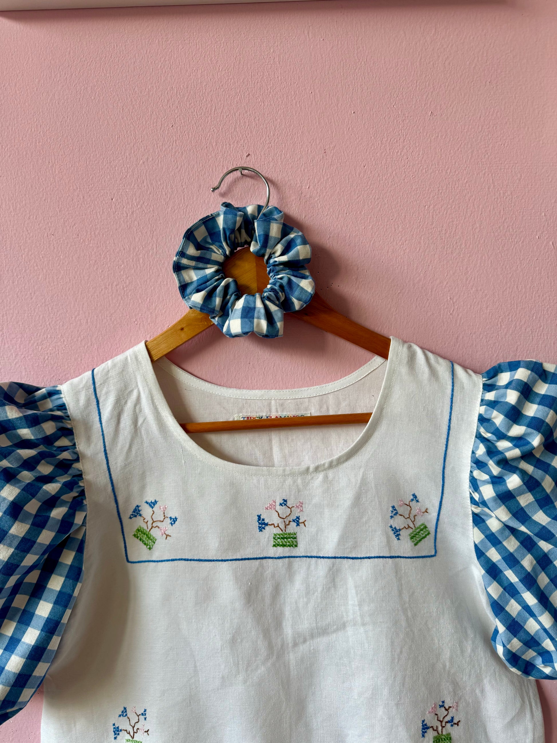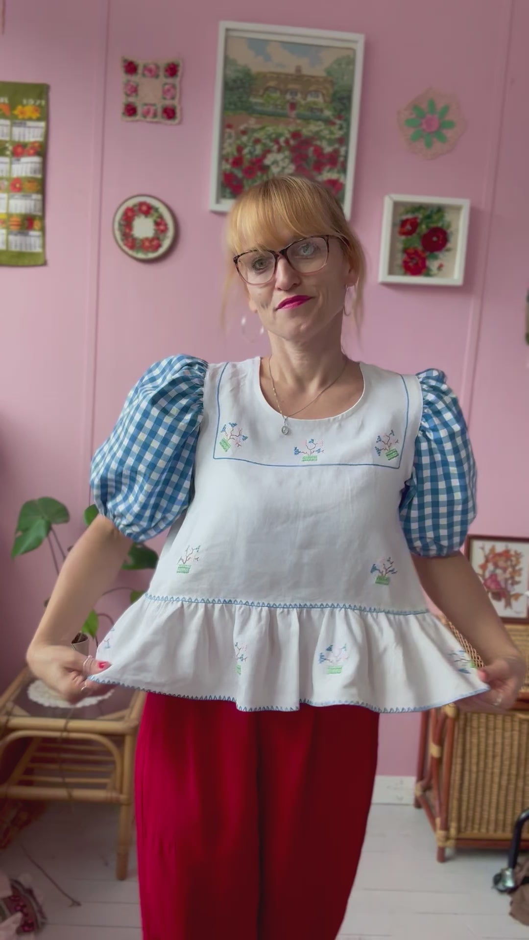 Peplum style blouse made from vintage tablecloth with cross stitching hand embroidery and blue borders