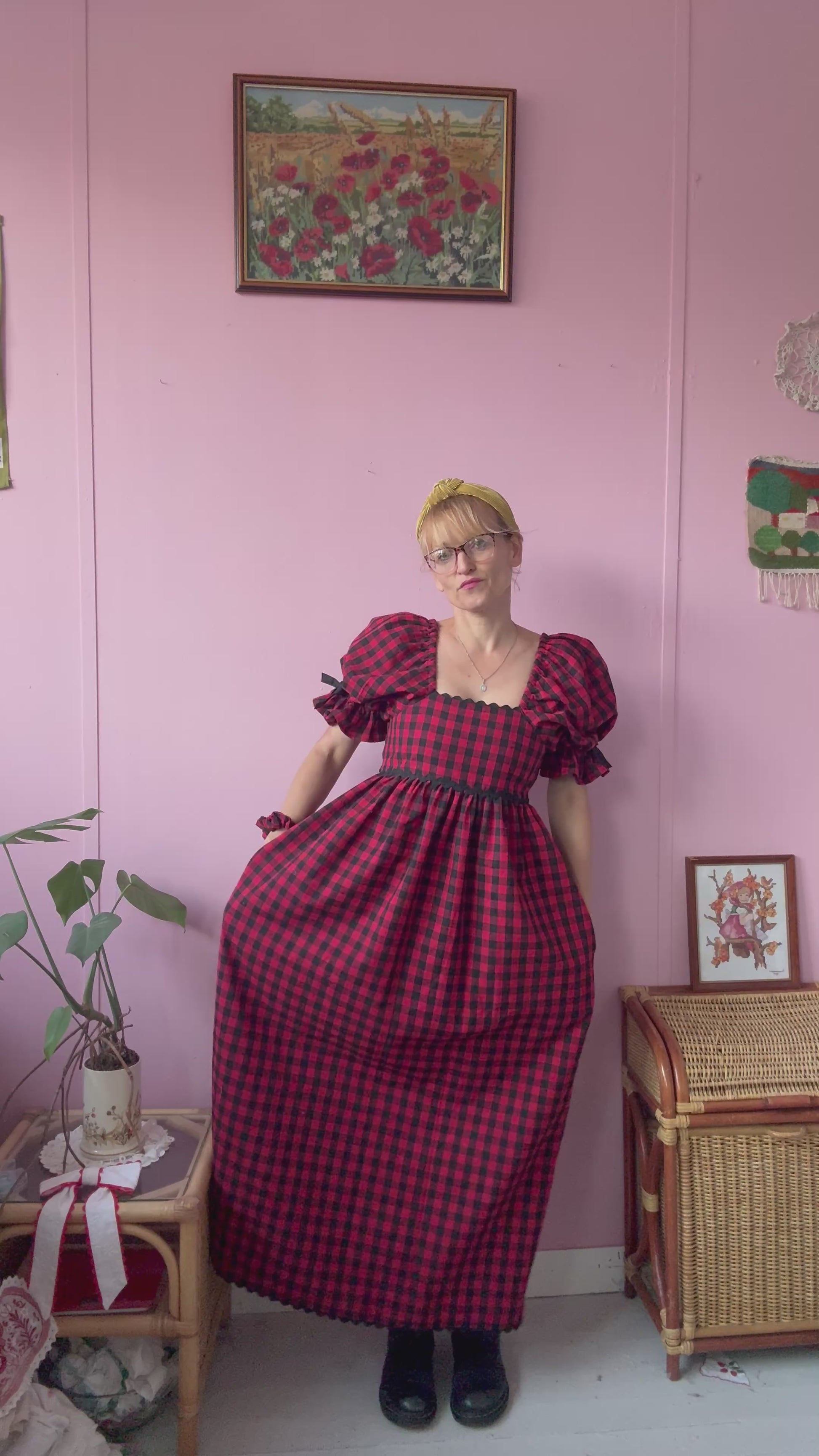 Red/black gingham maxi dress made from donated end of roll fabric -it’s mix cotton and linen