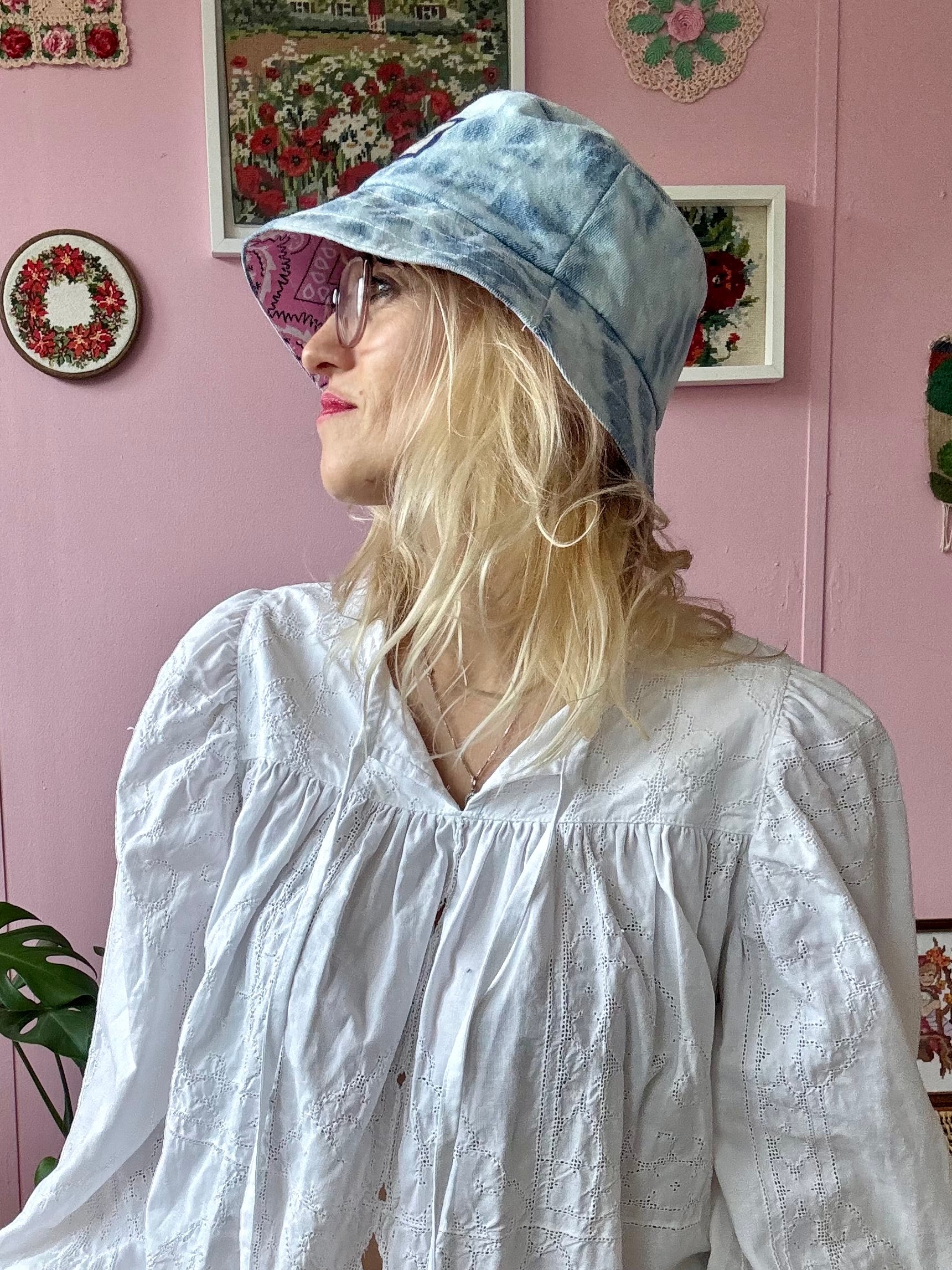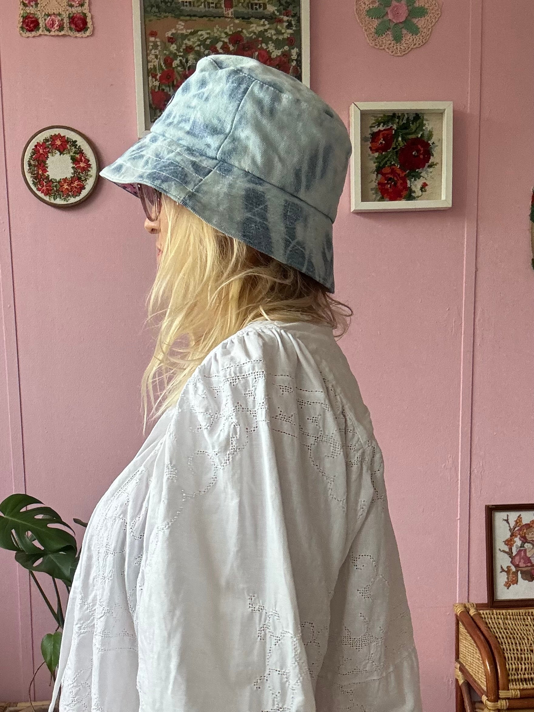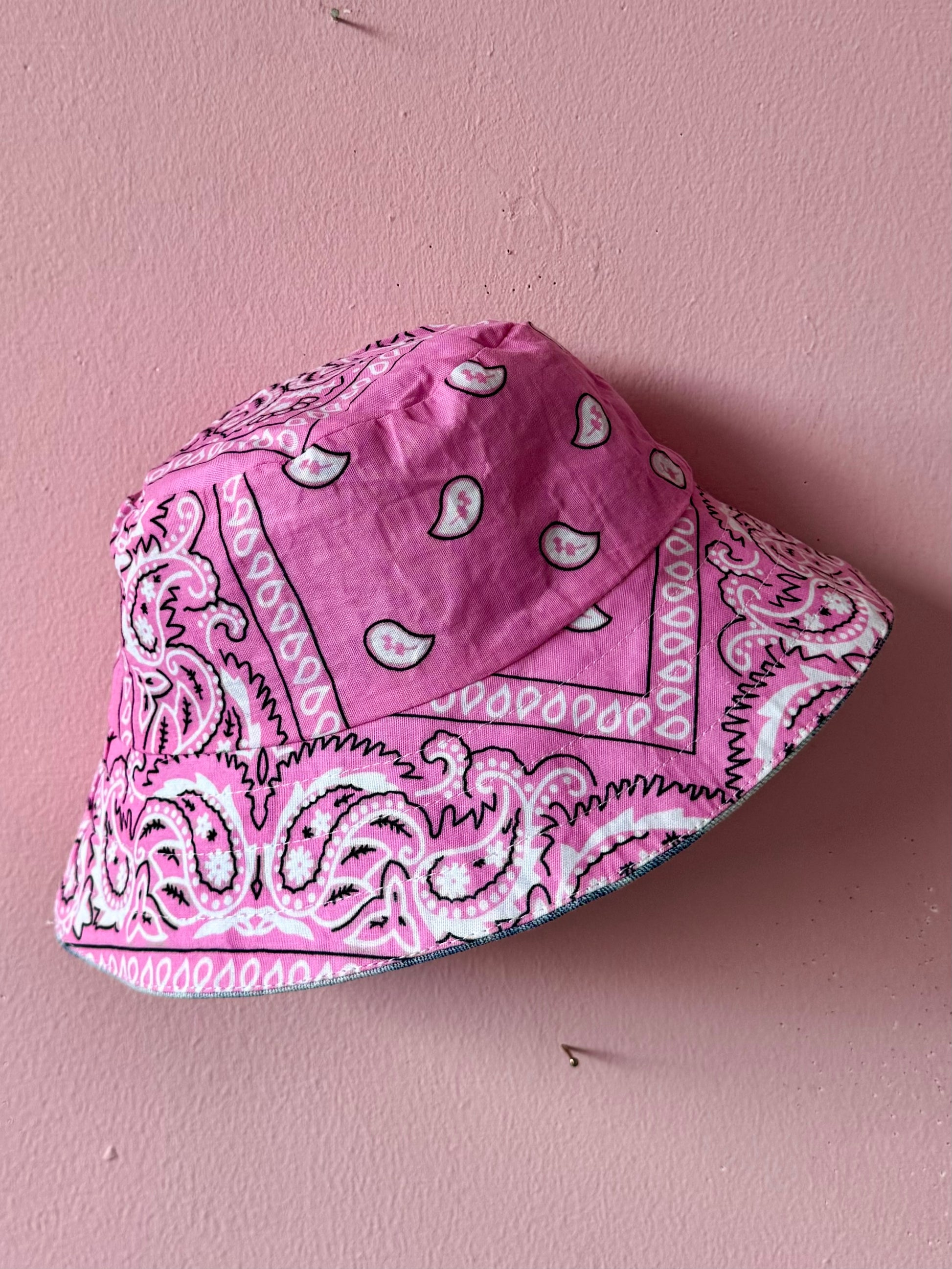 Reversible denim and pink print bucket hat