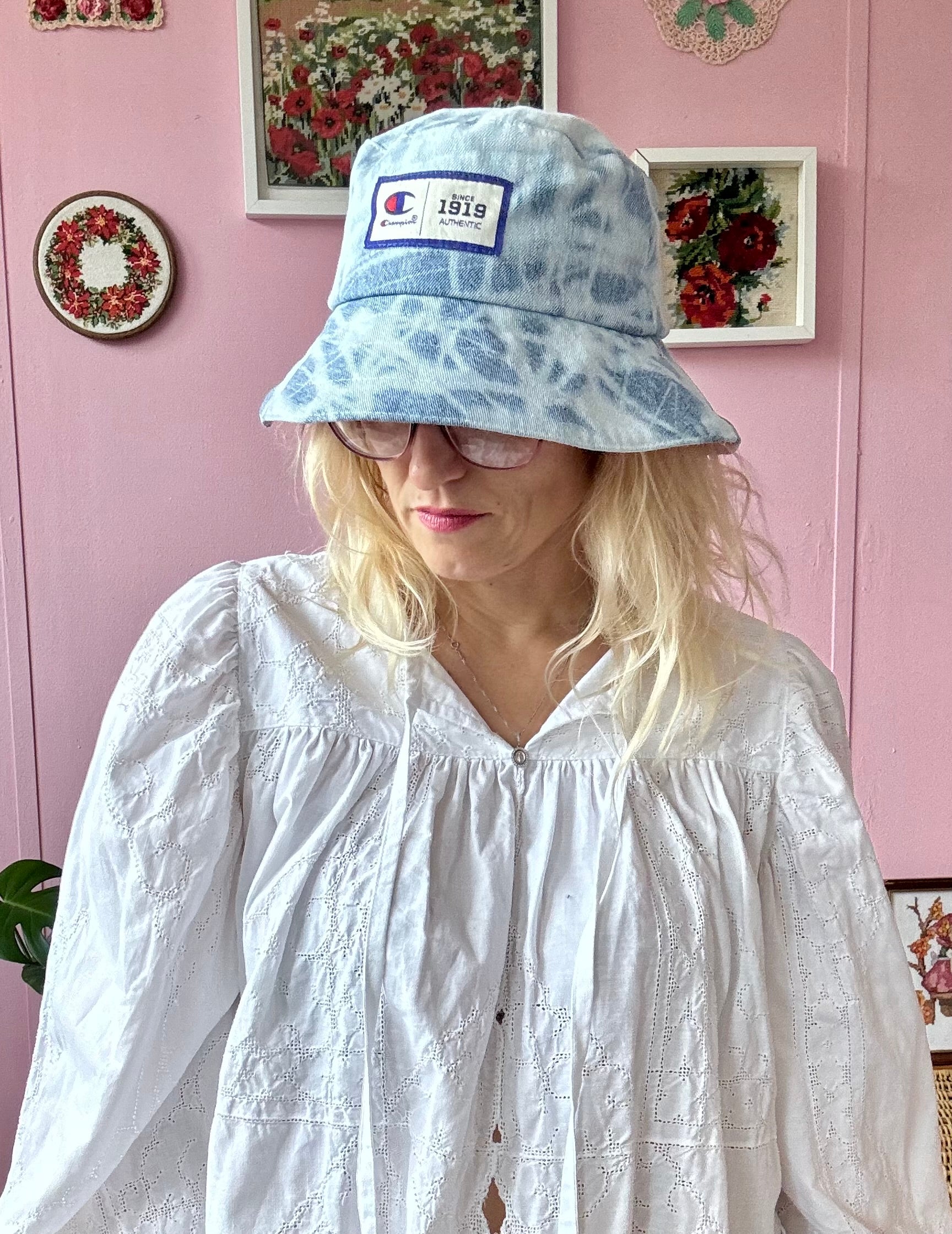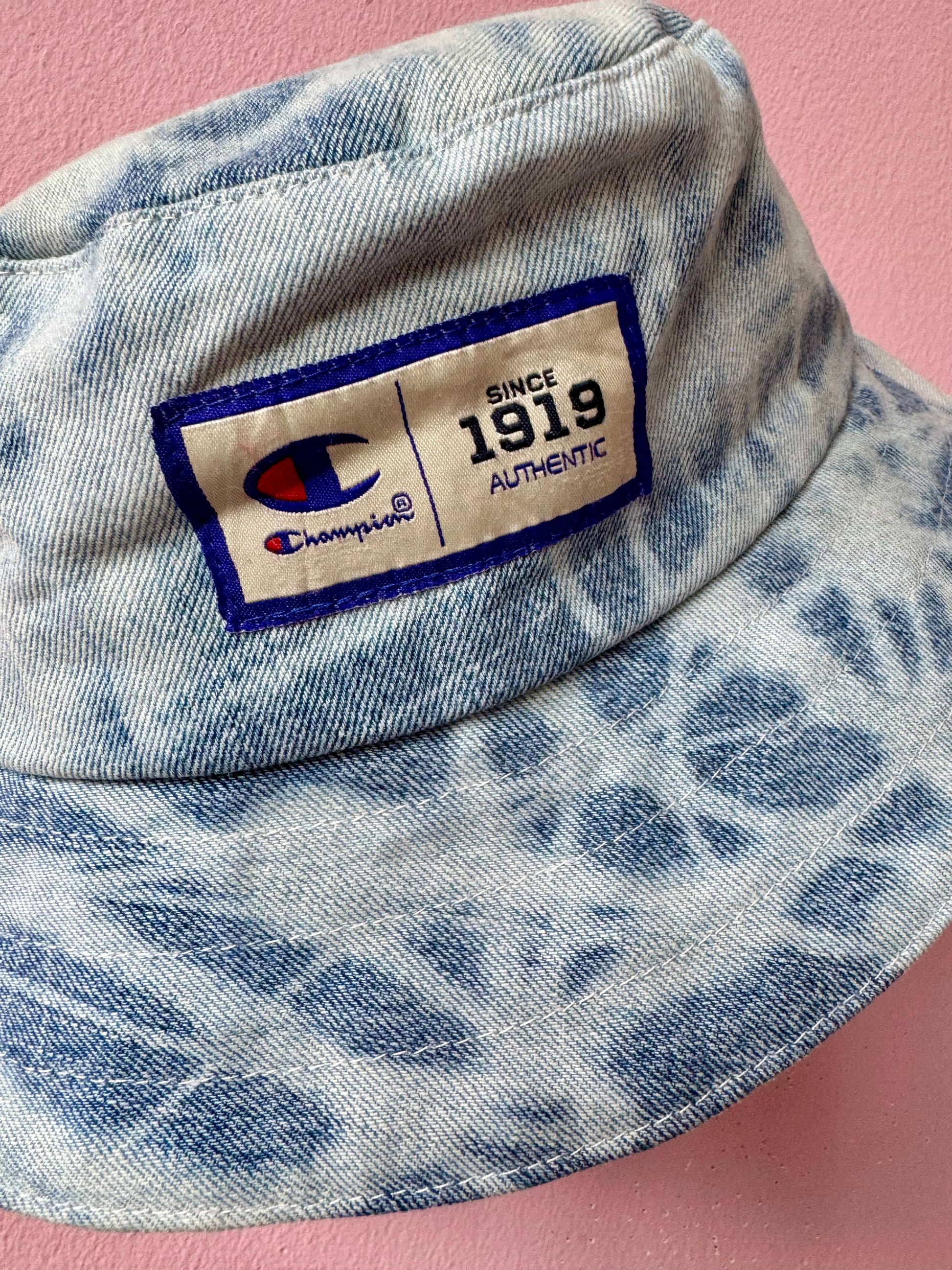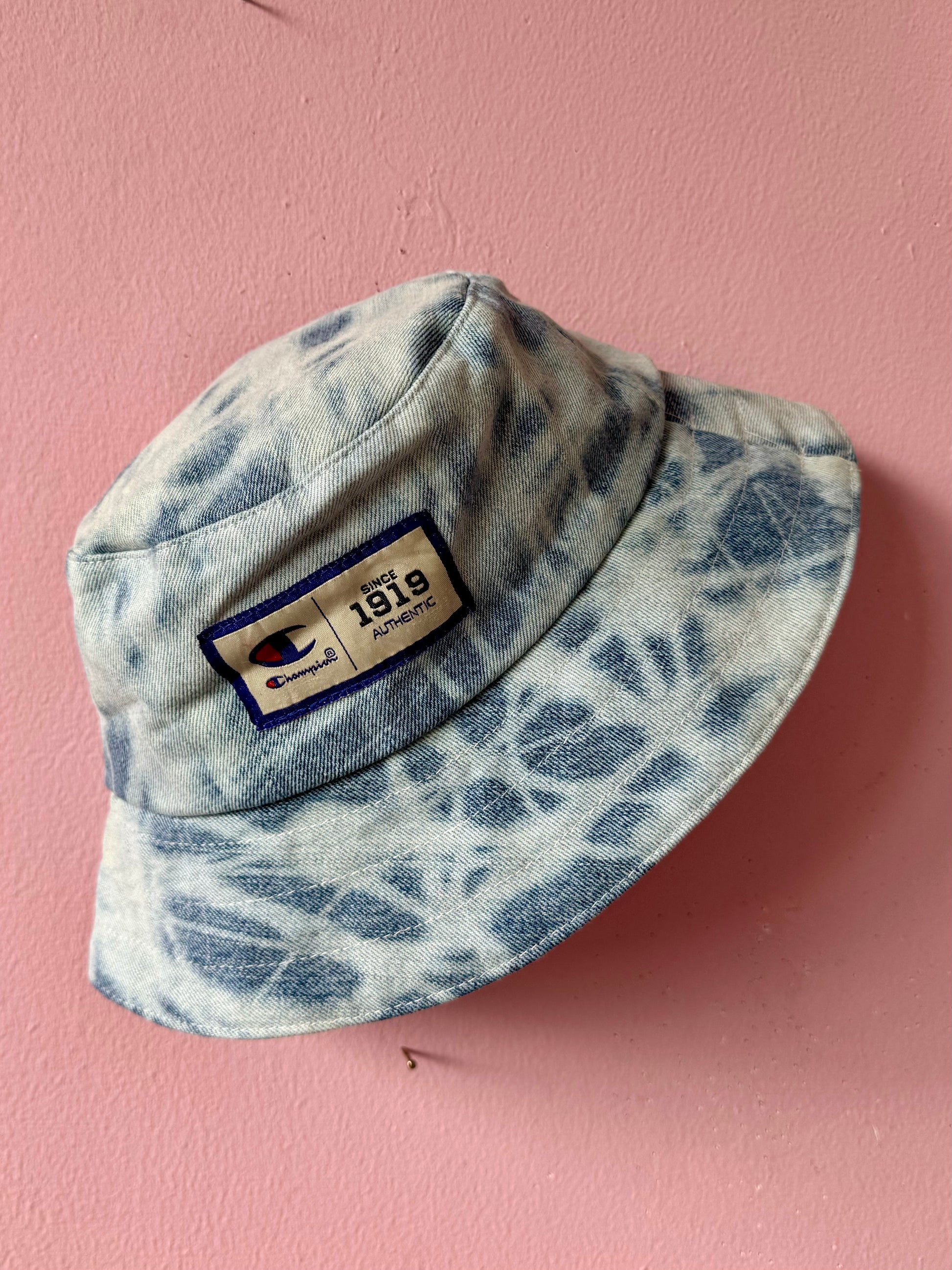 Reversible denim and pink print bucket hat