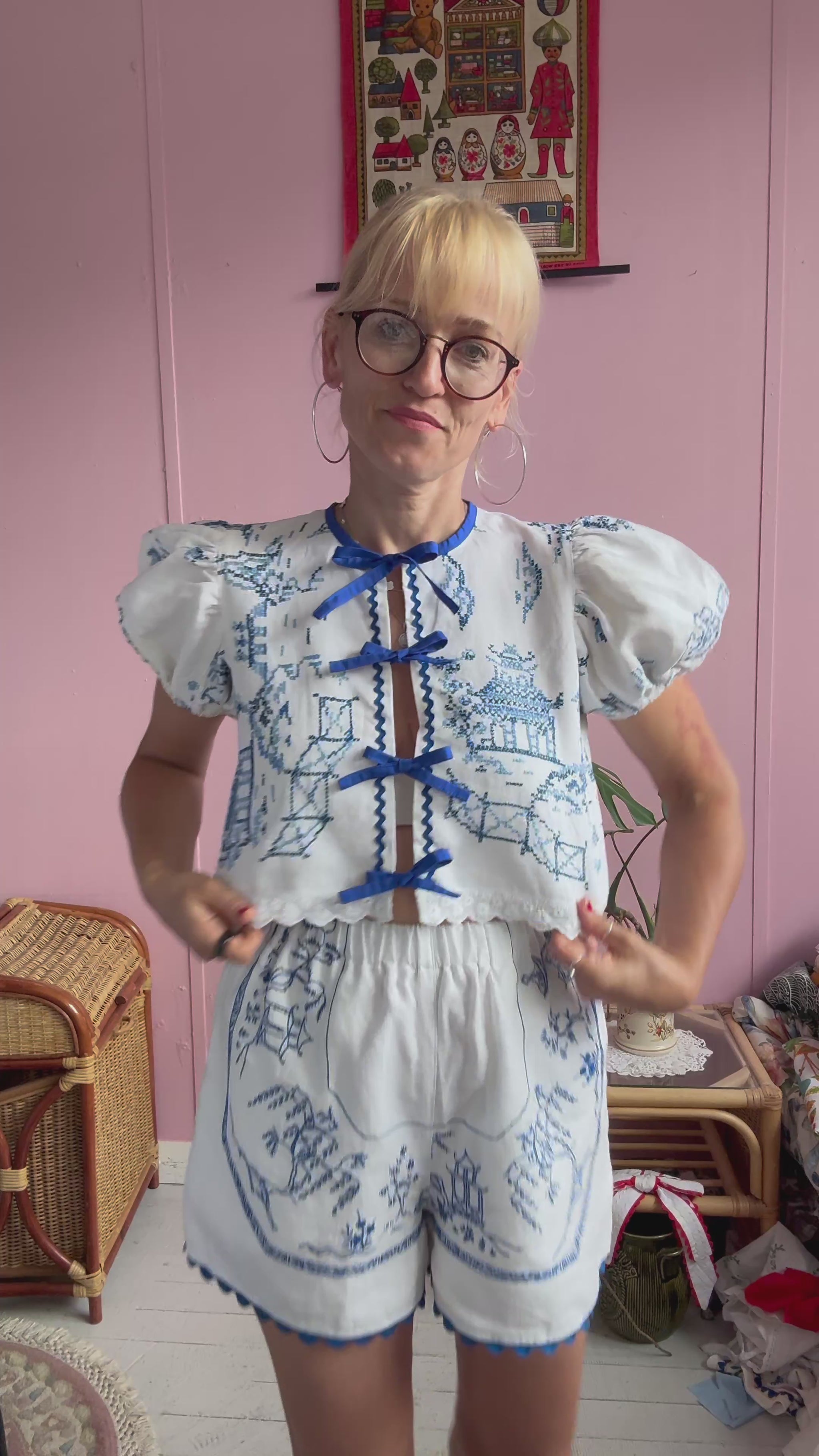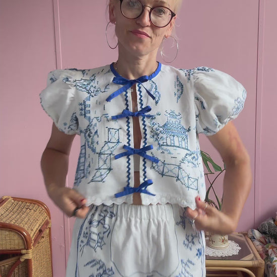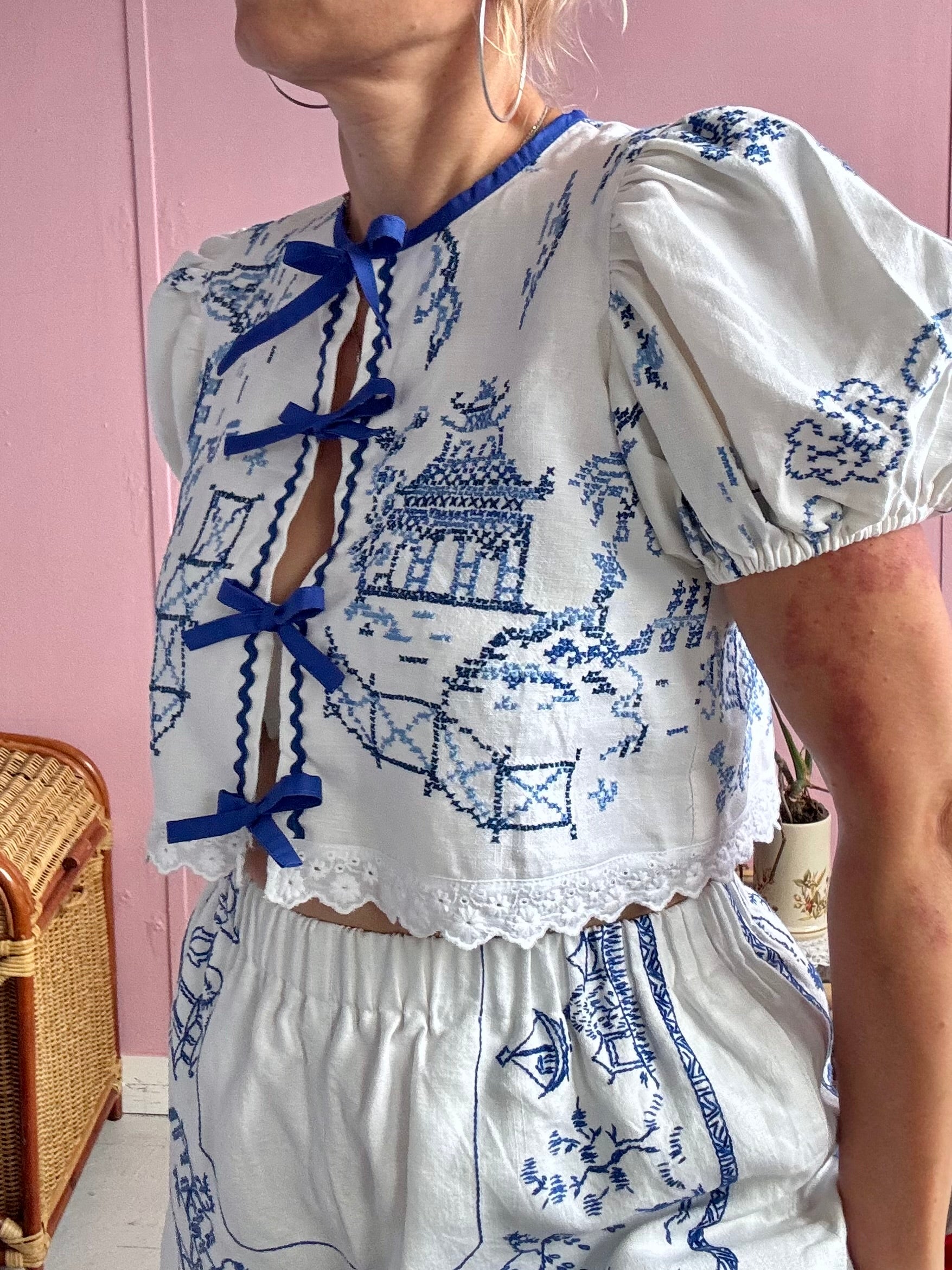 White blouse made from vintage tablecloth with blue hand embroidery -amazing hand embroidery details all over