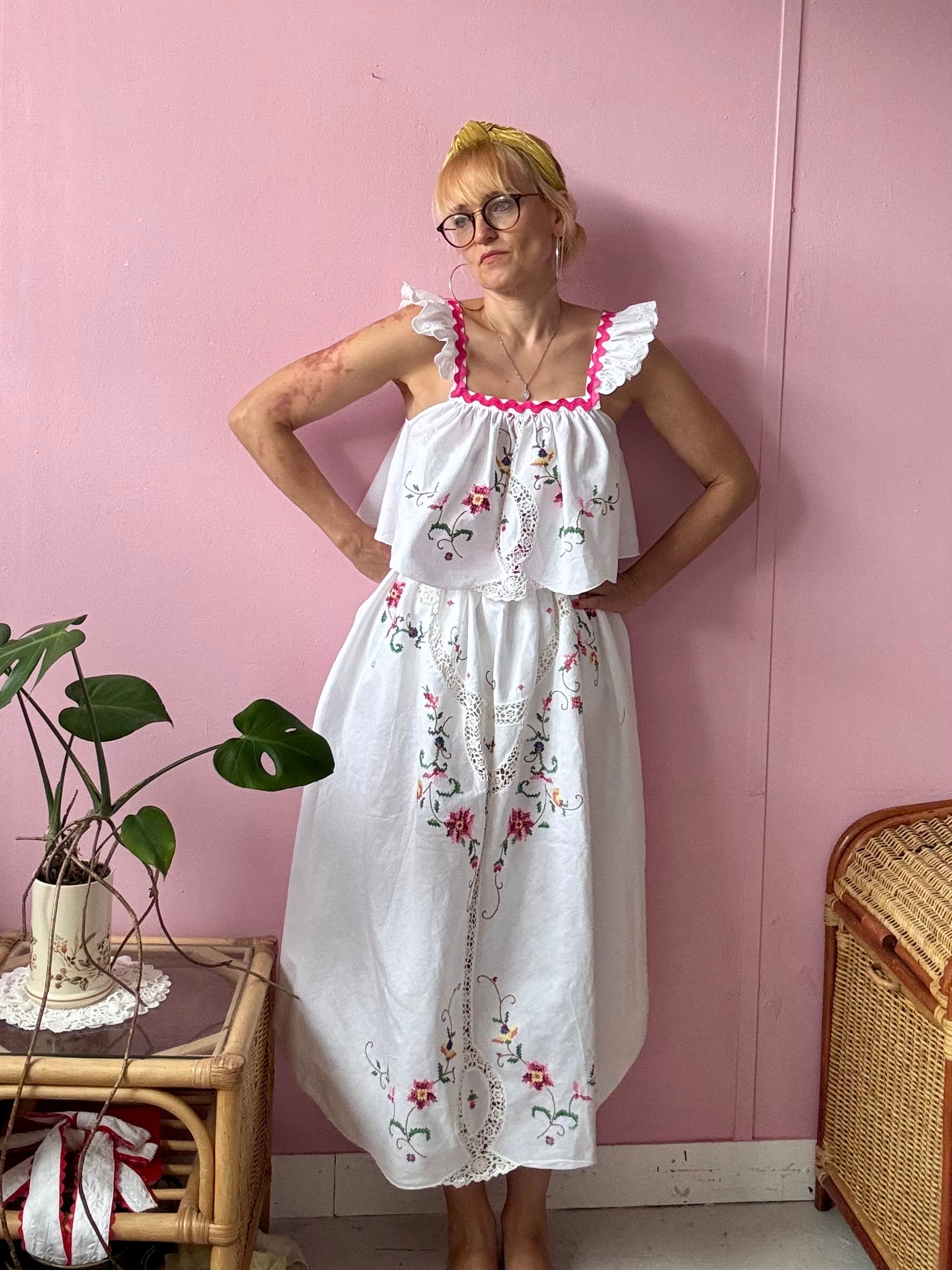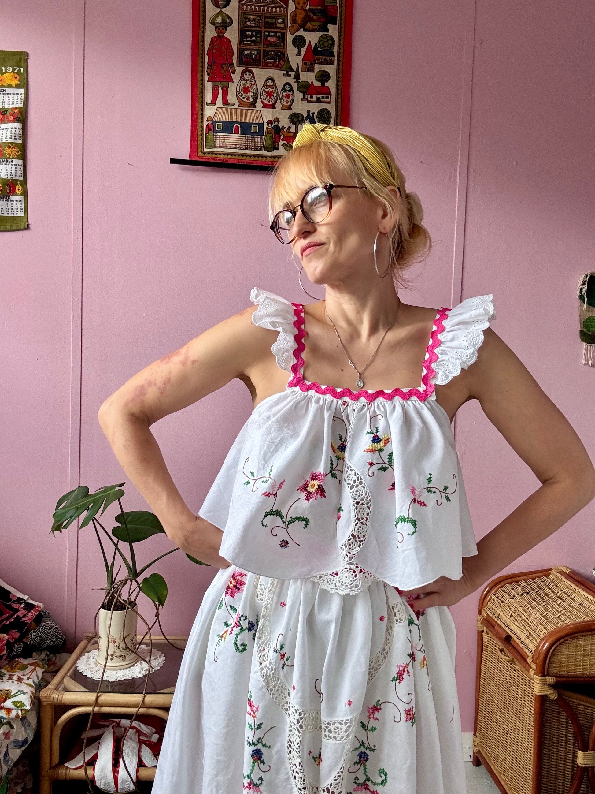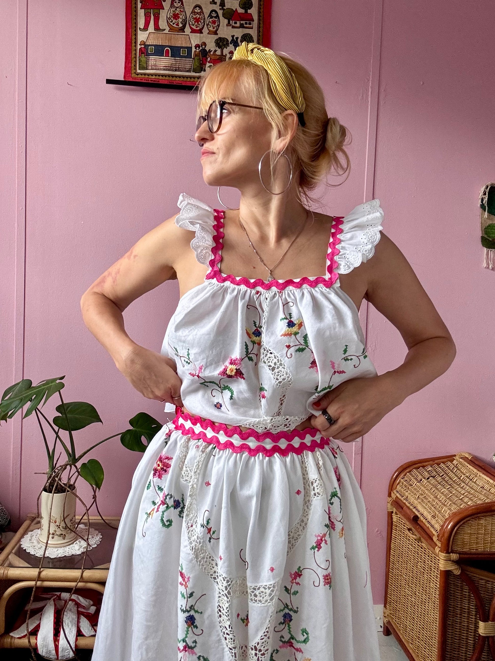 Off White cotton skirt and top set made from vintage tablecloth with floral hand embroidery and lace details