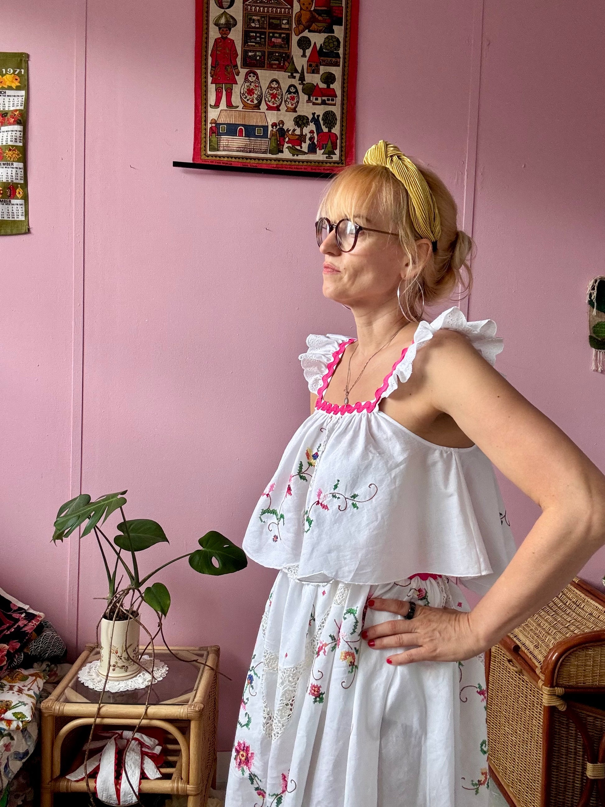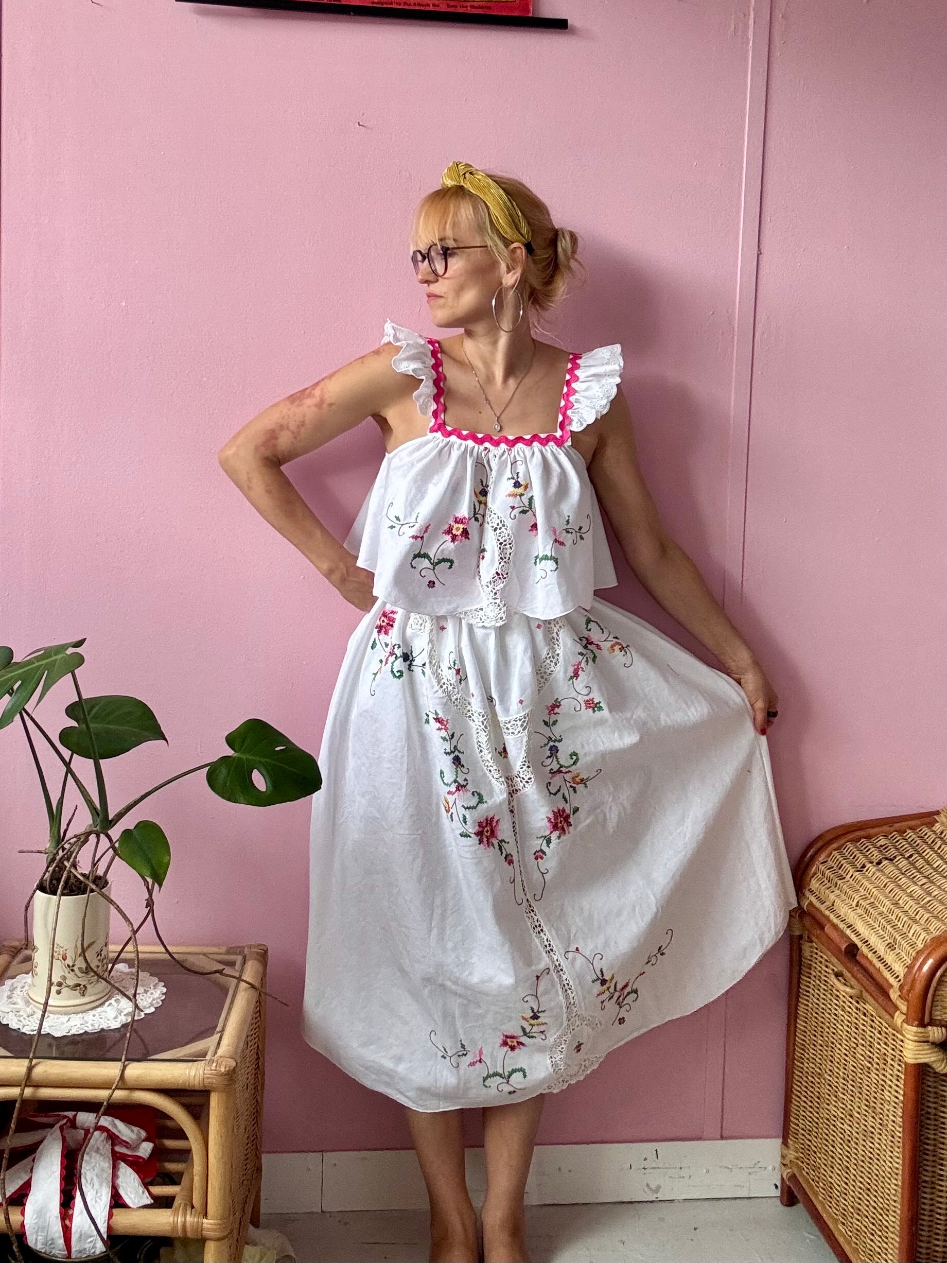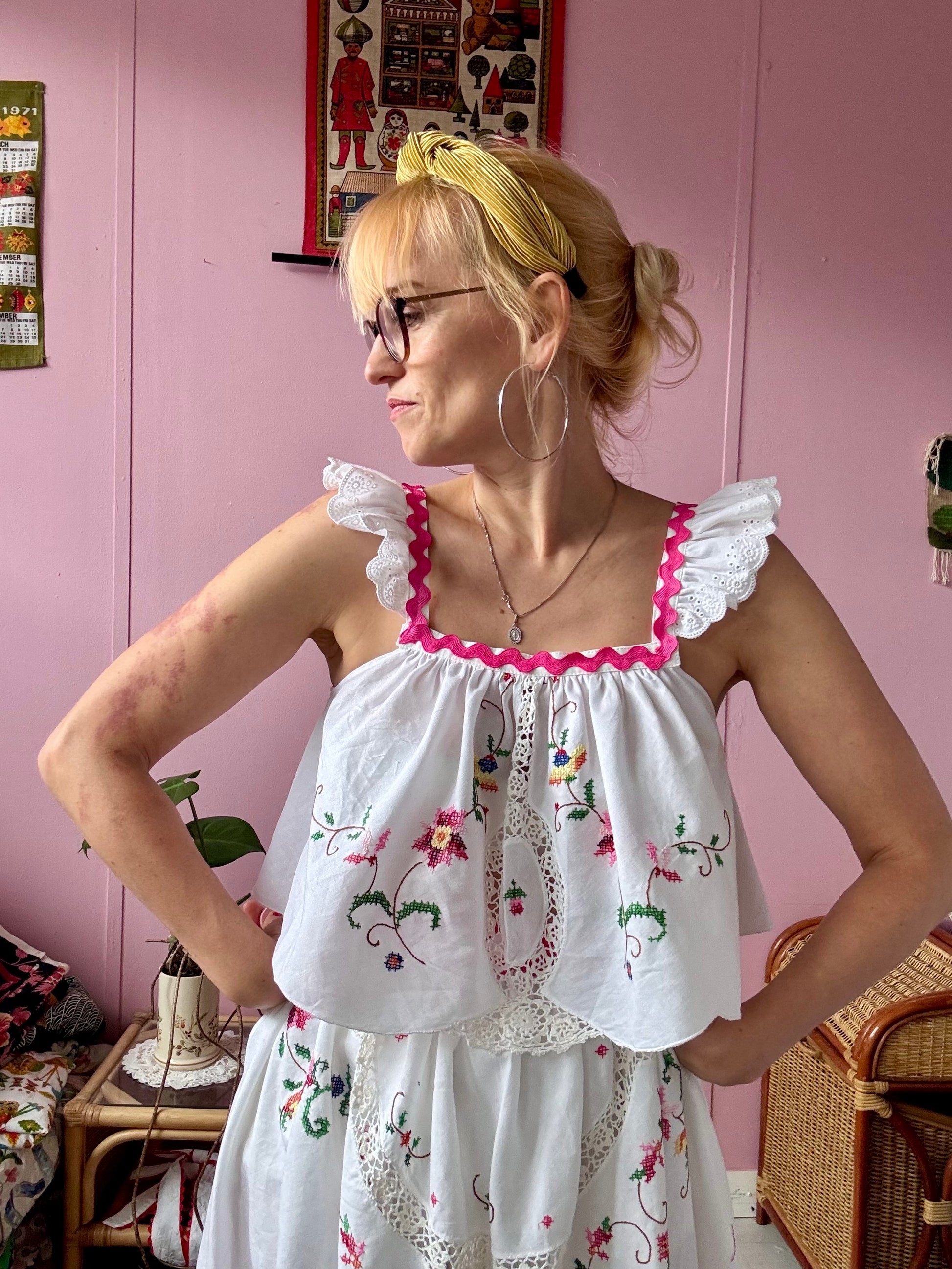 Off White cotton skirt and top set made from vintage tablecloth with floral hand embroidery and lace details