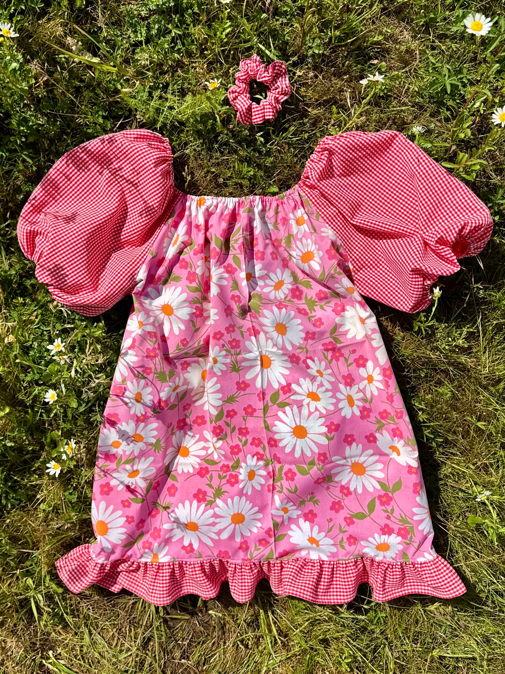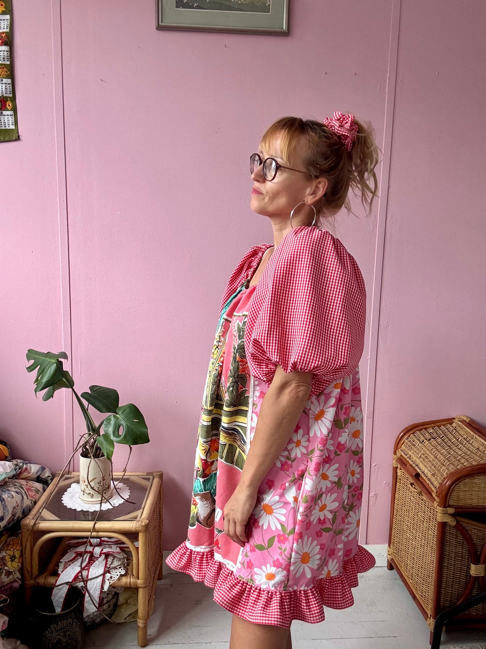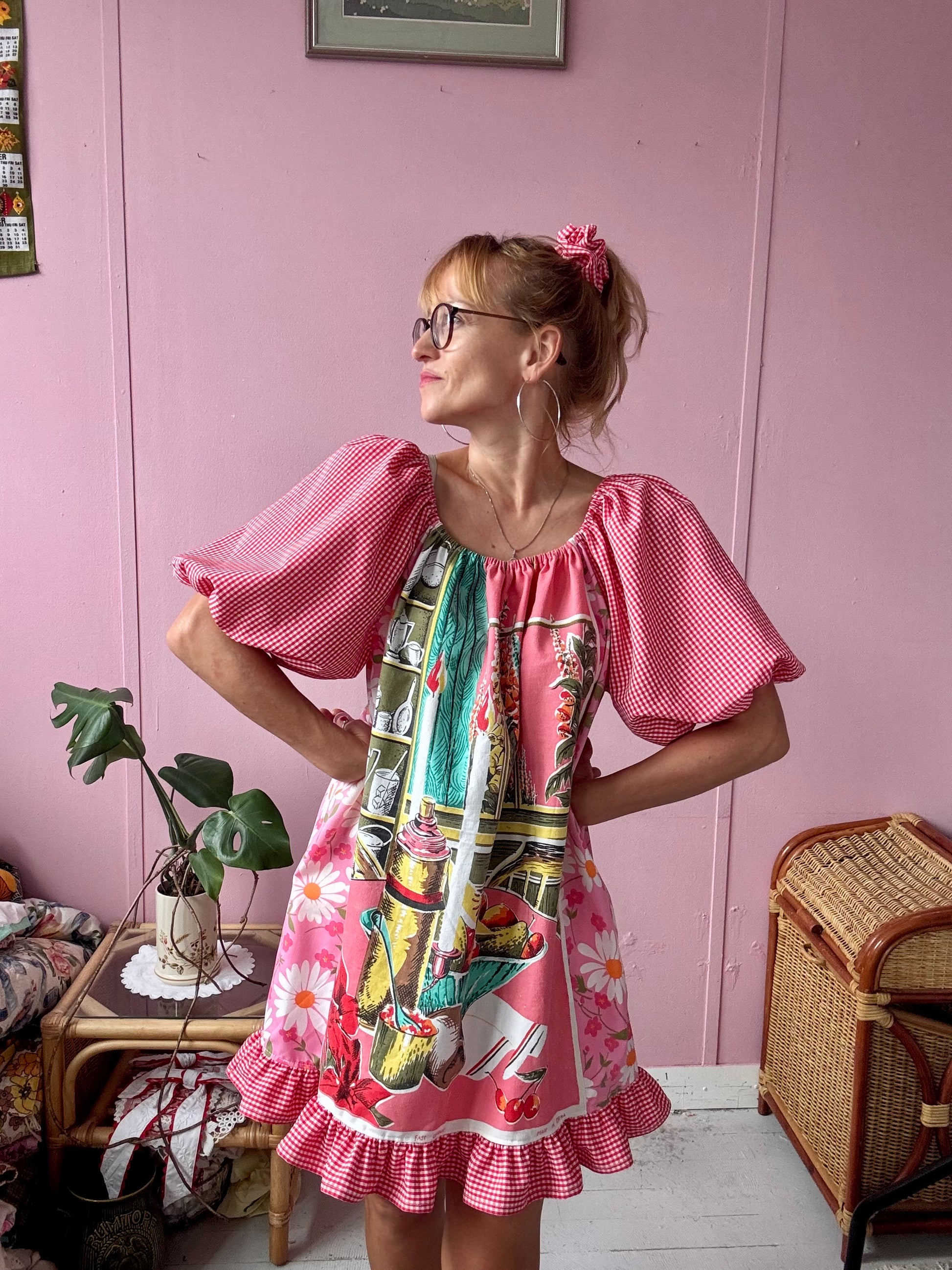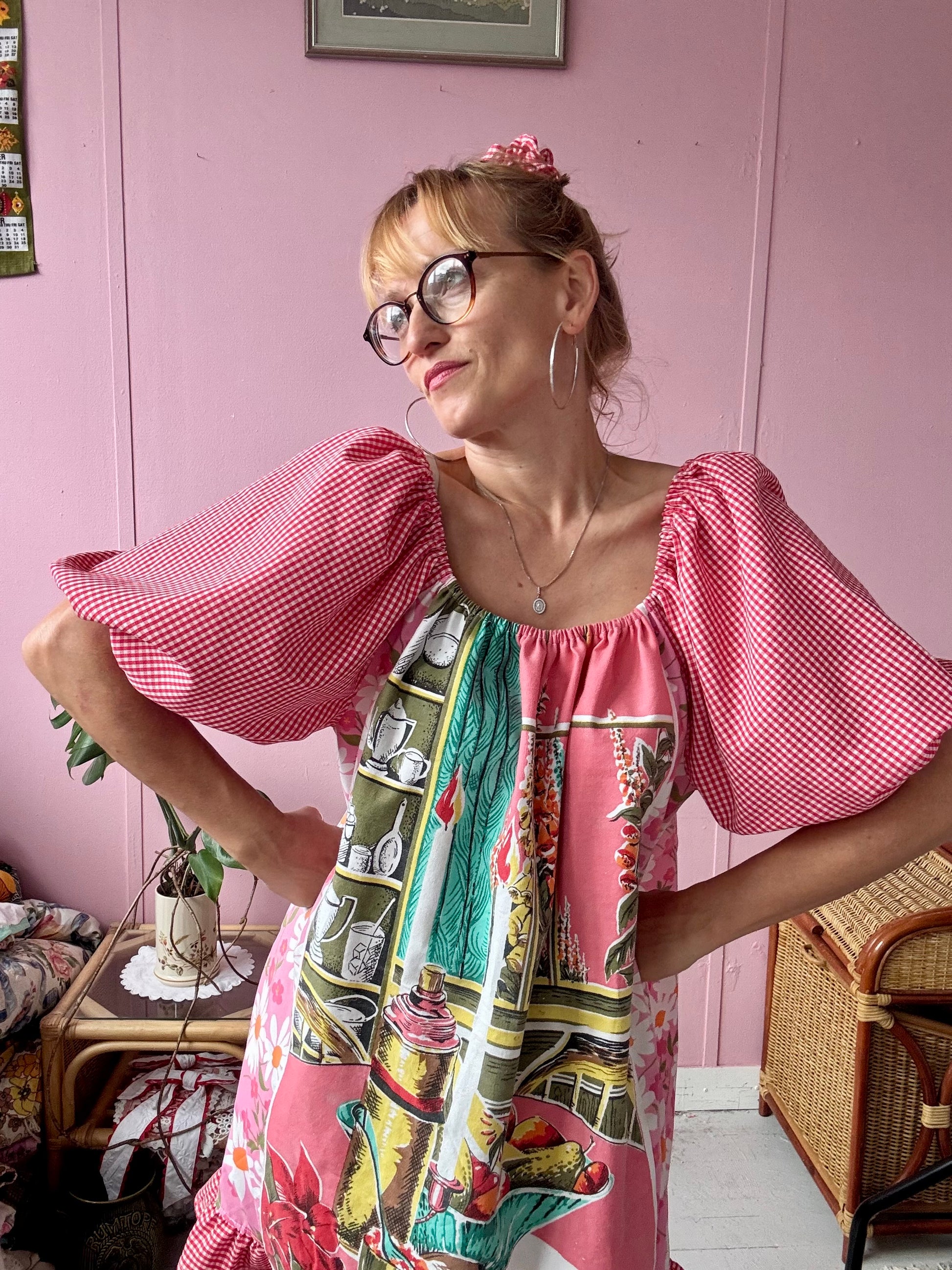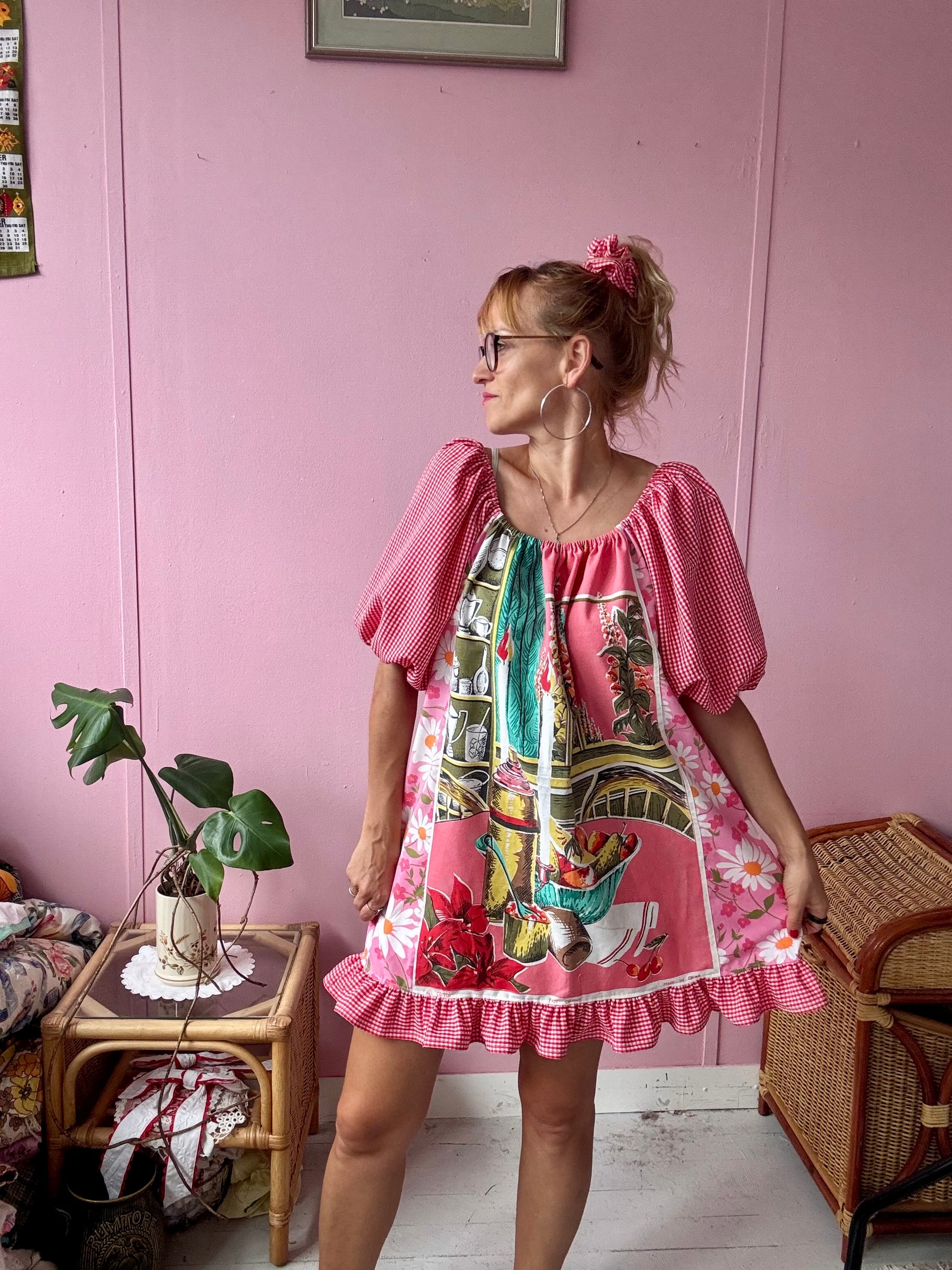 Teatowel and floral dress made from vintage teatowel and vintage bedheet