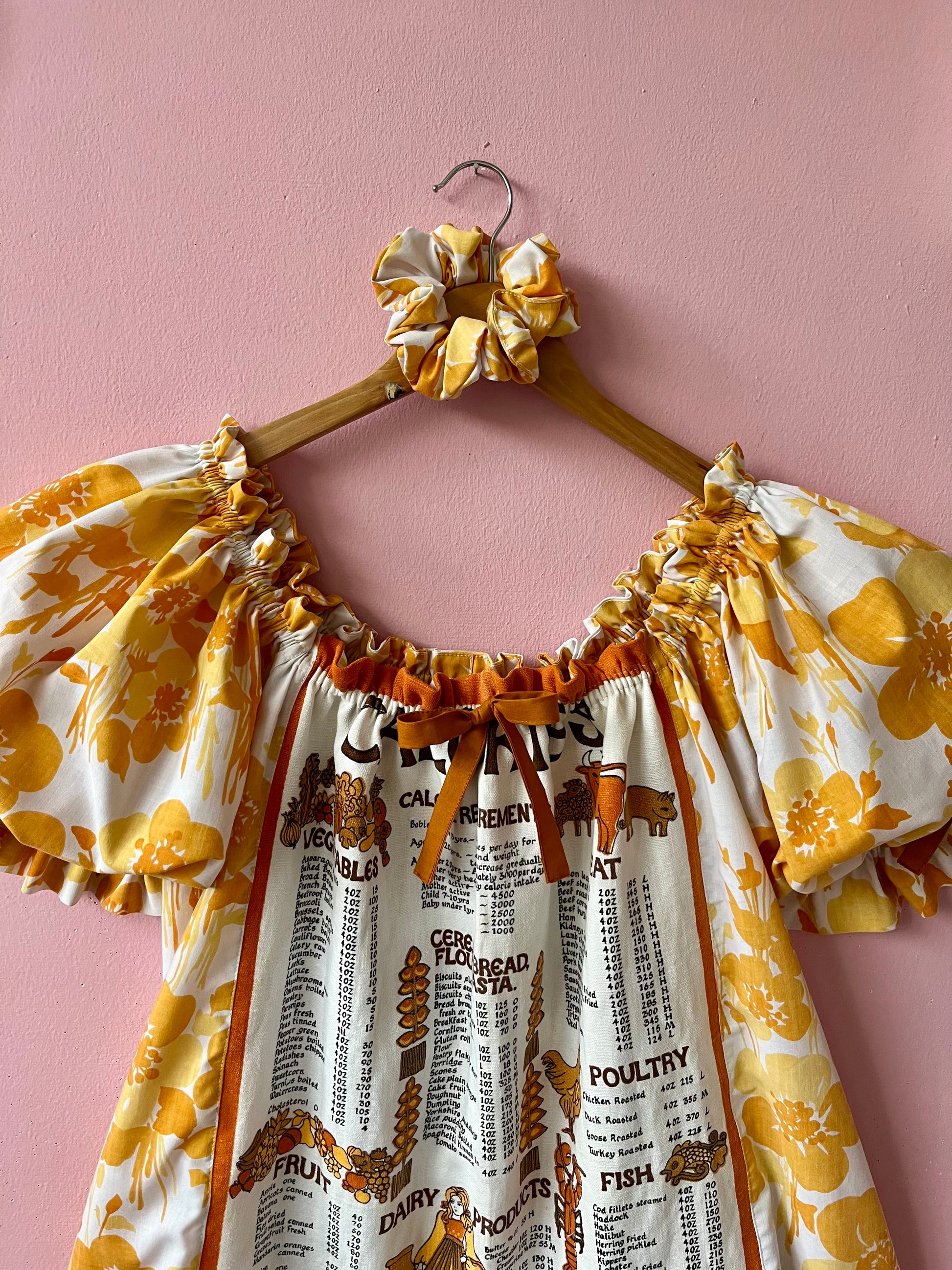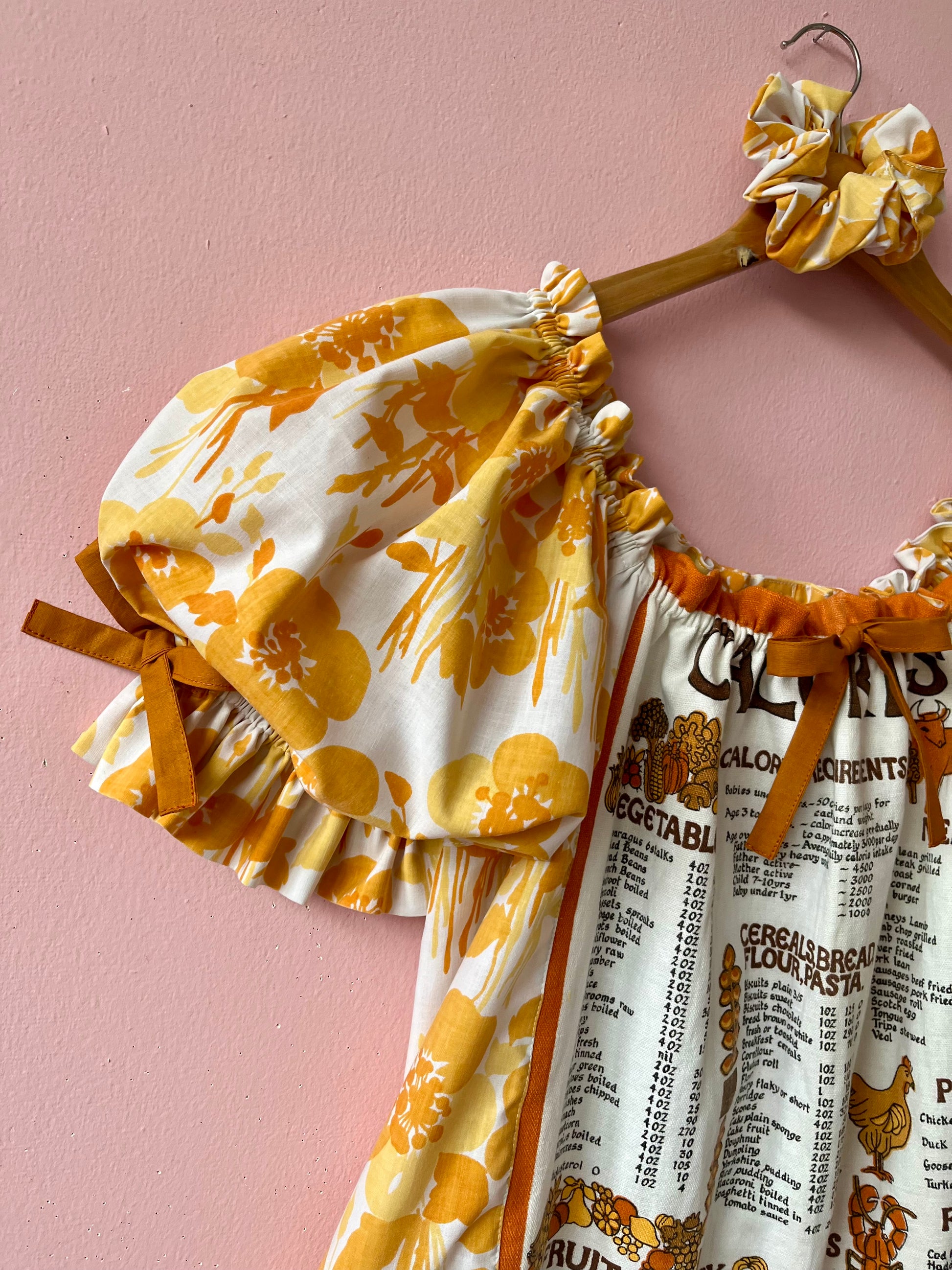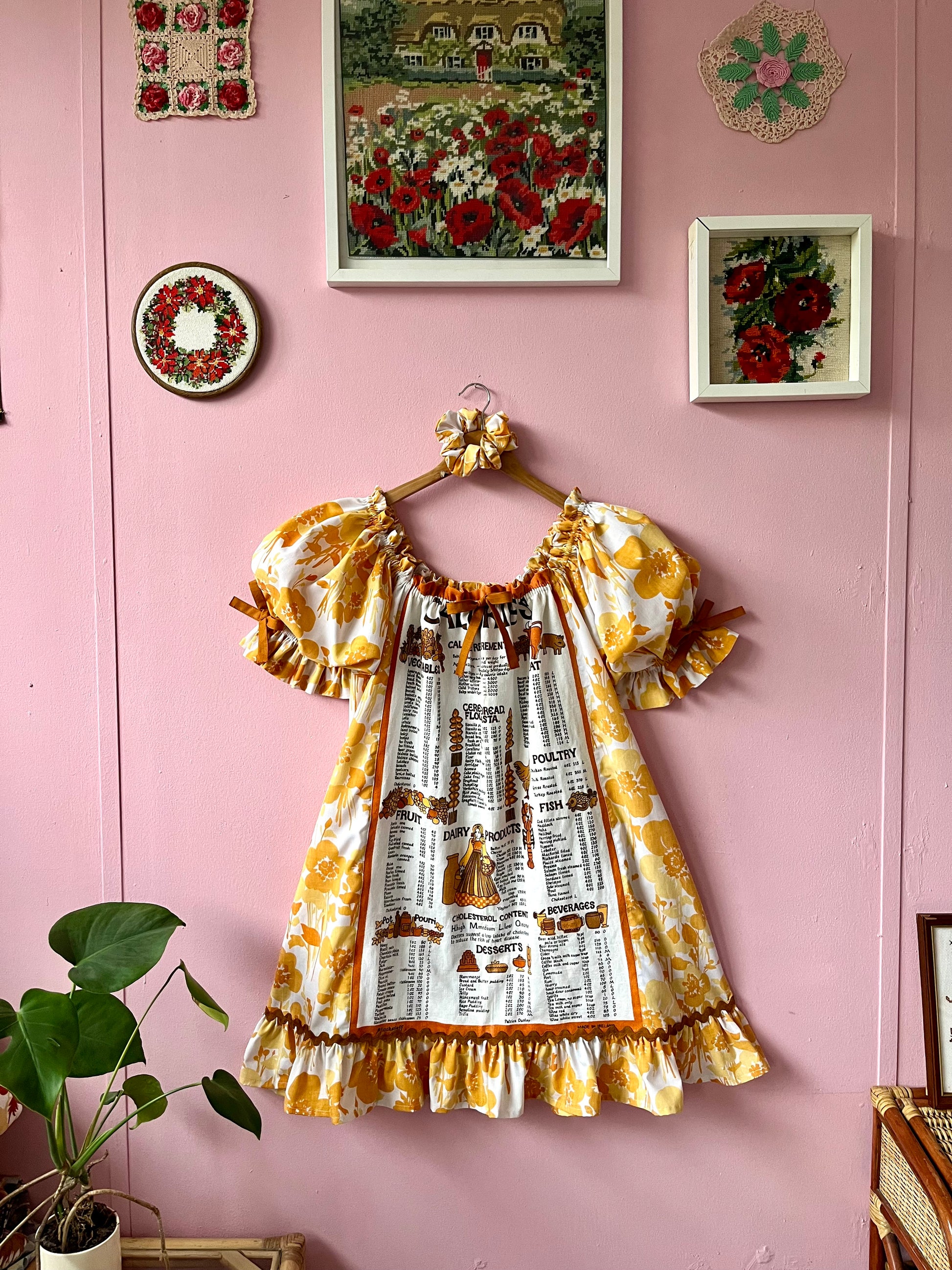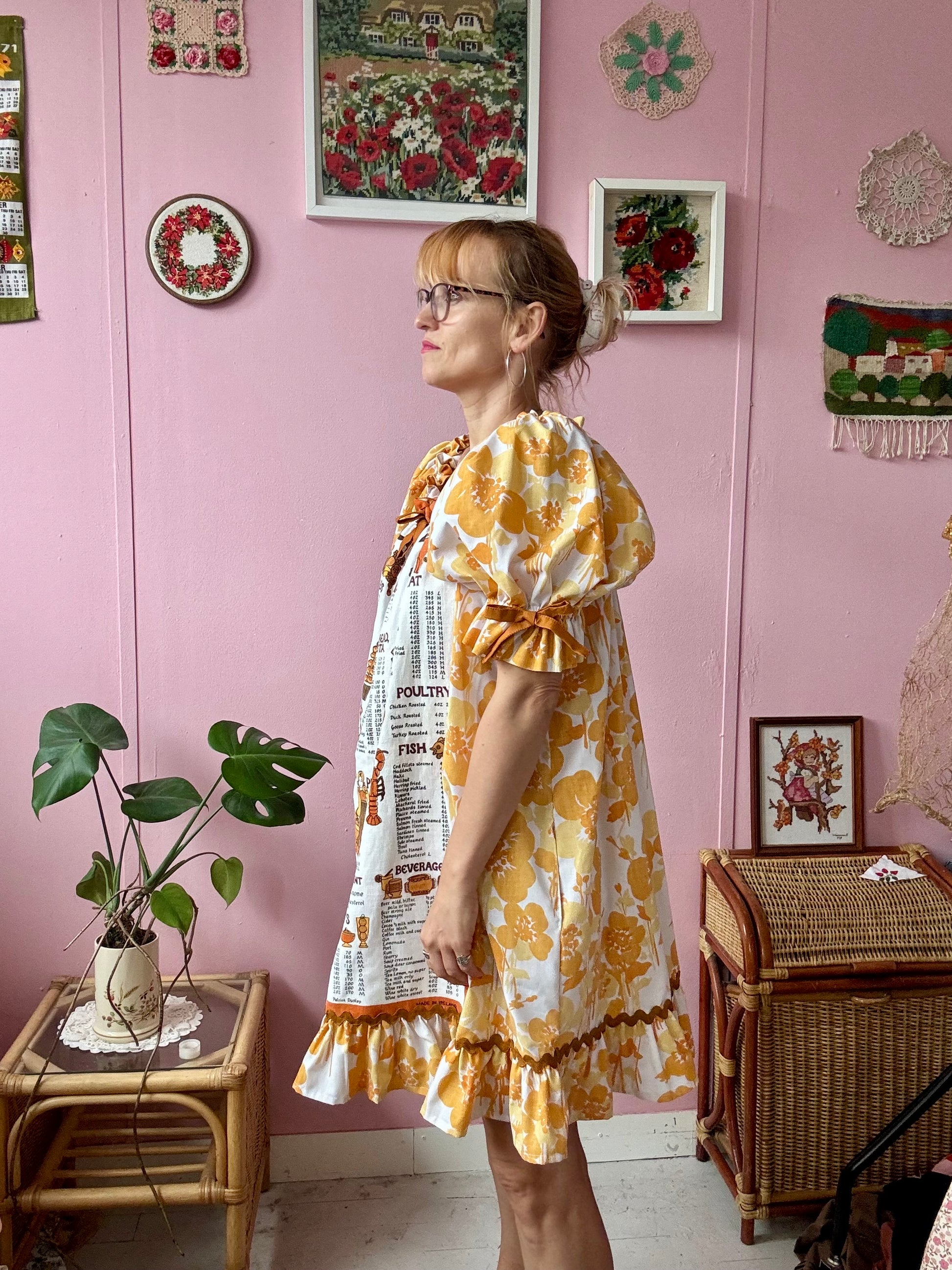Teatowel and floral dress made from vintage teatowel and vintage bedheet