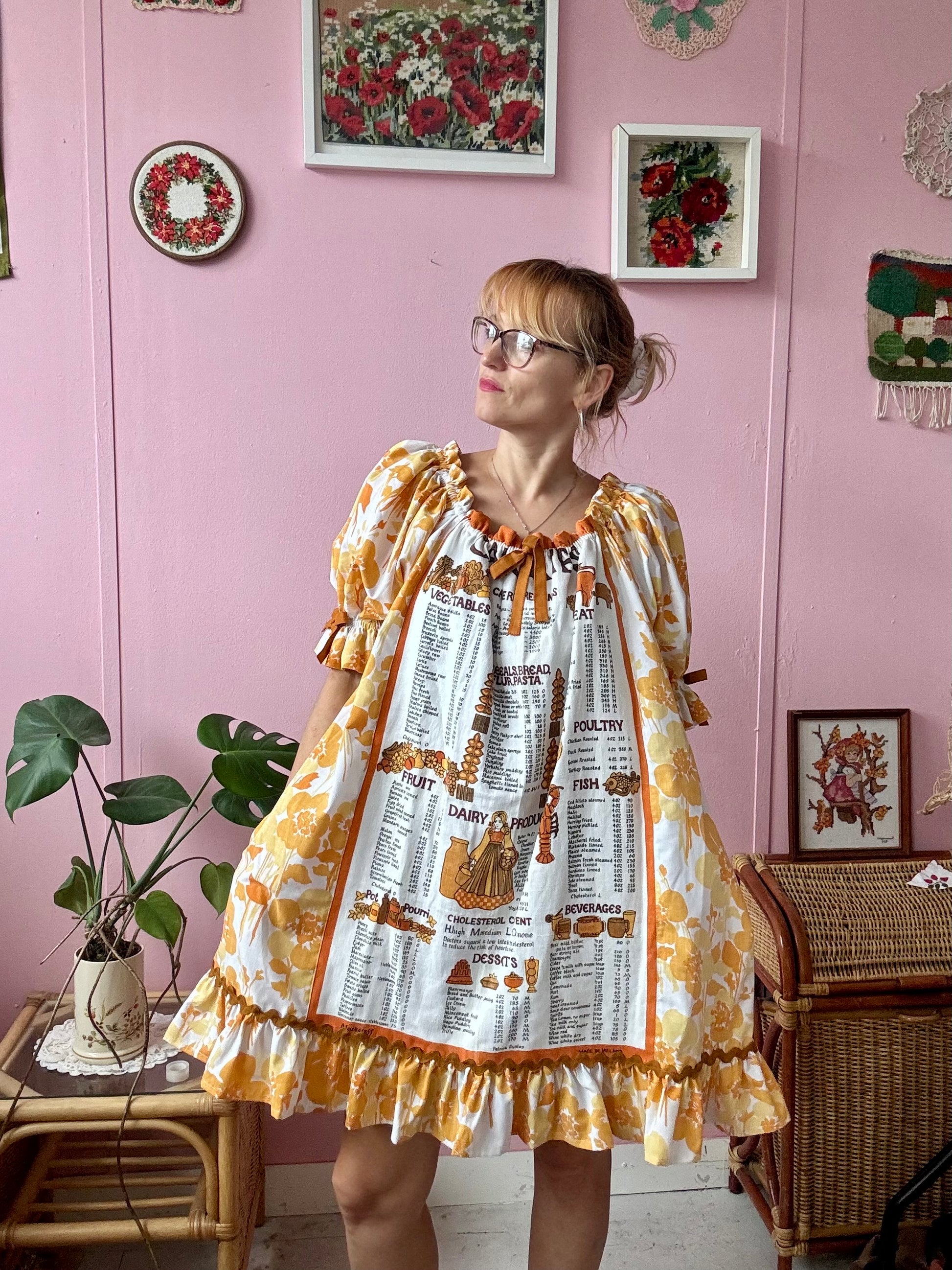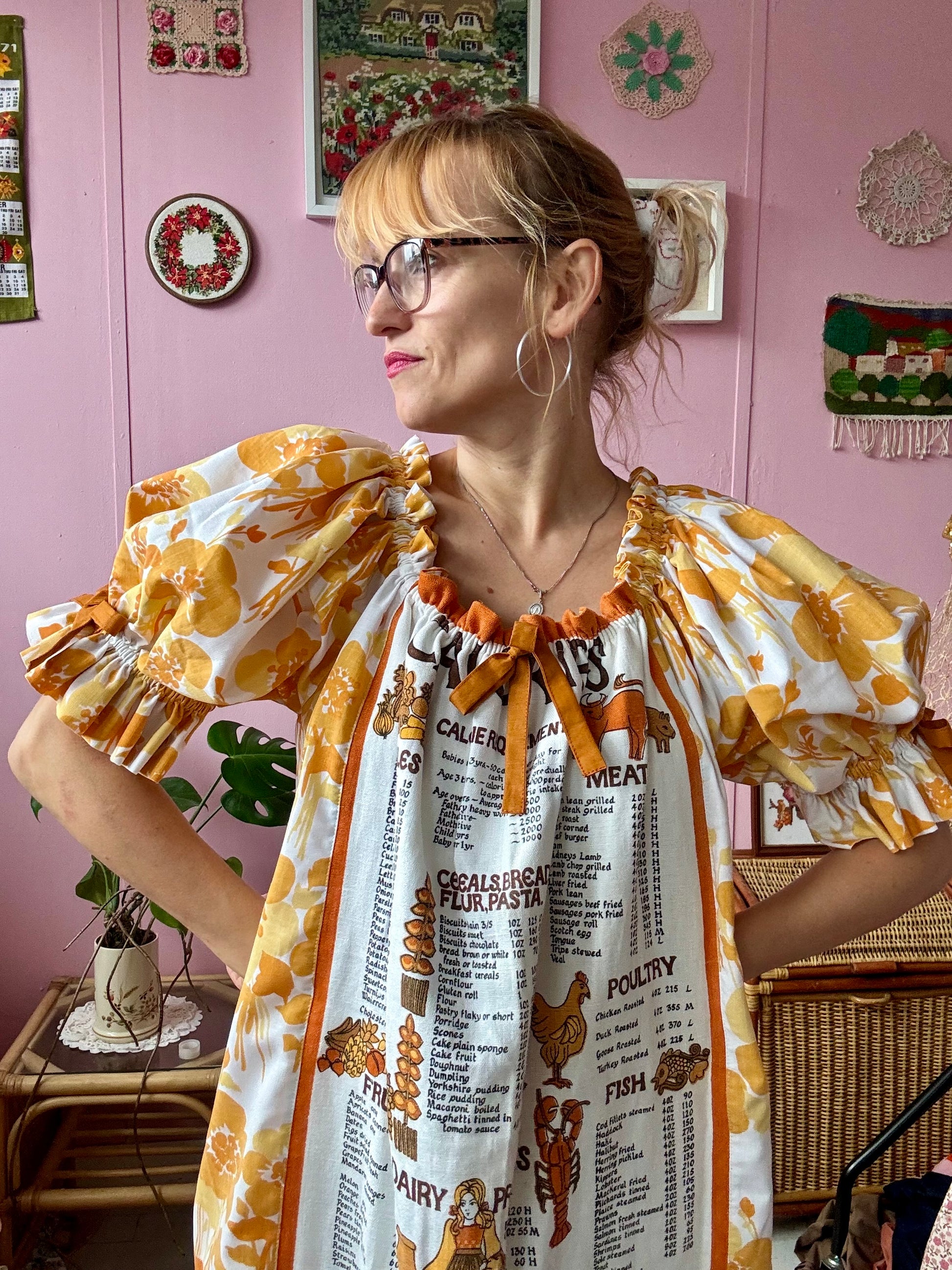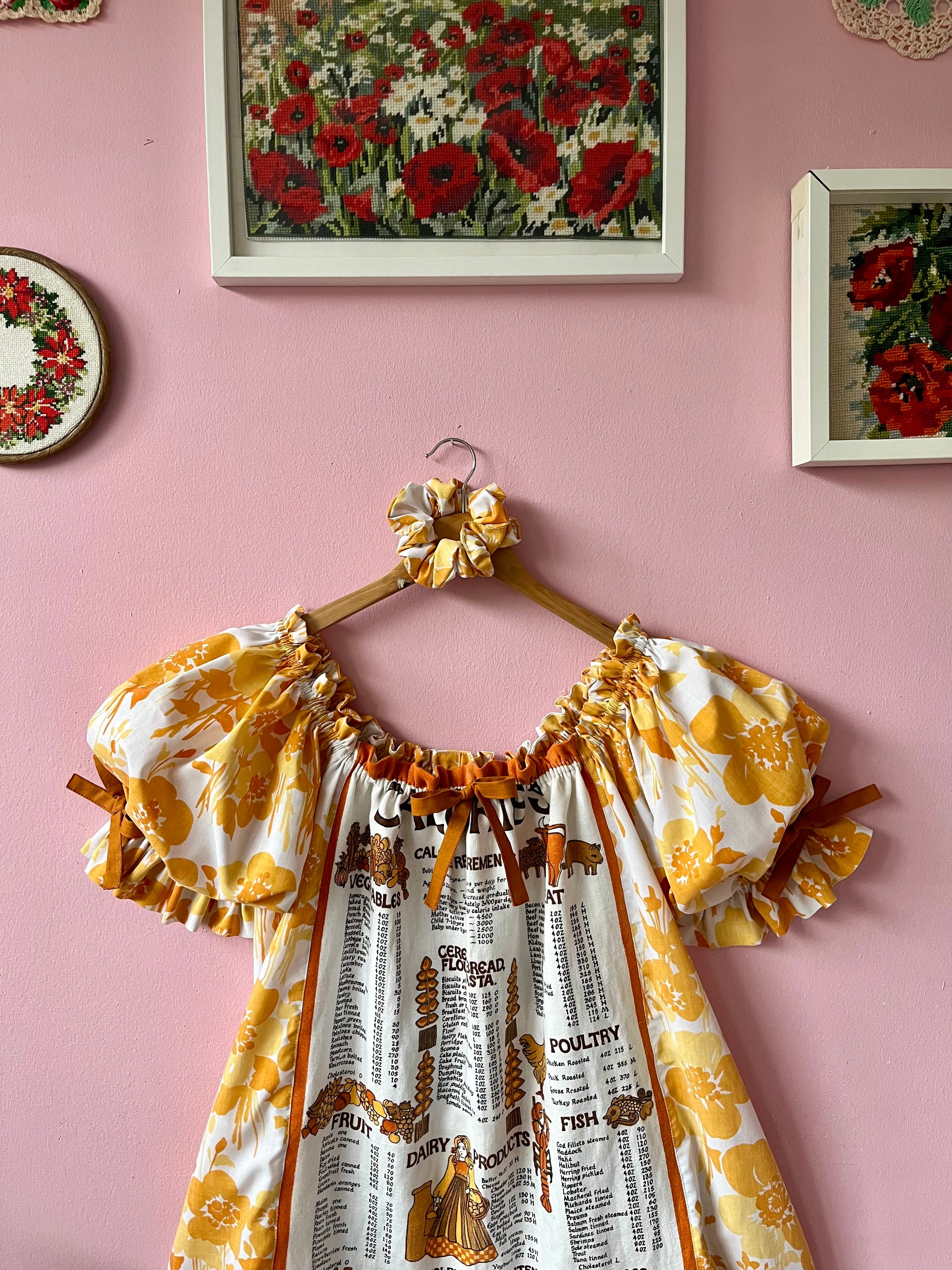 Teatowel and floral dress made from vintage teatowel and vintage bedheet