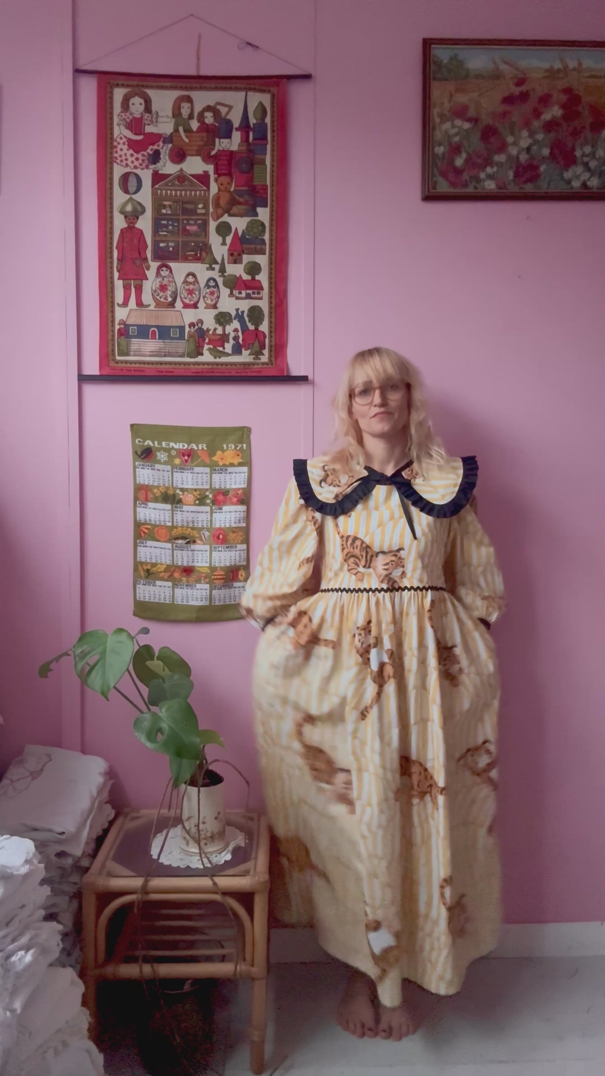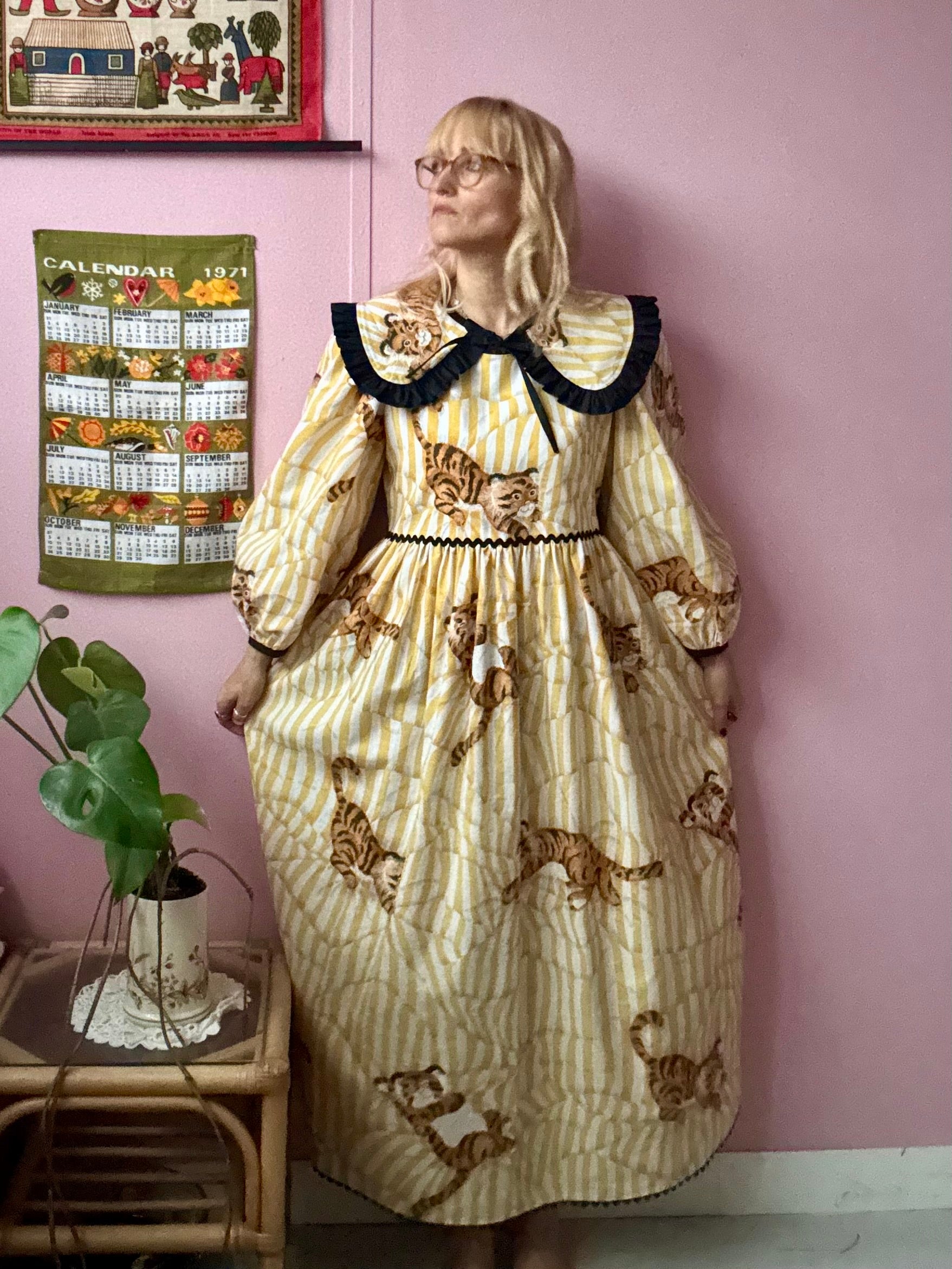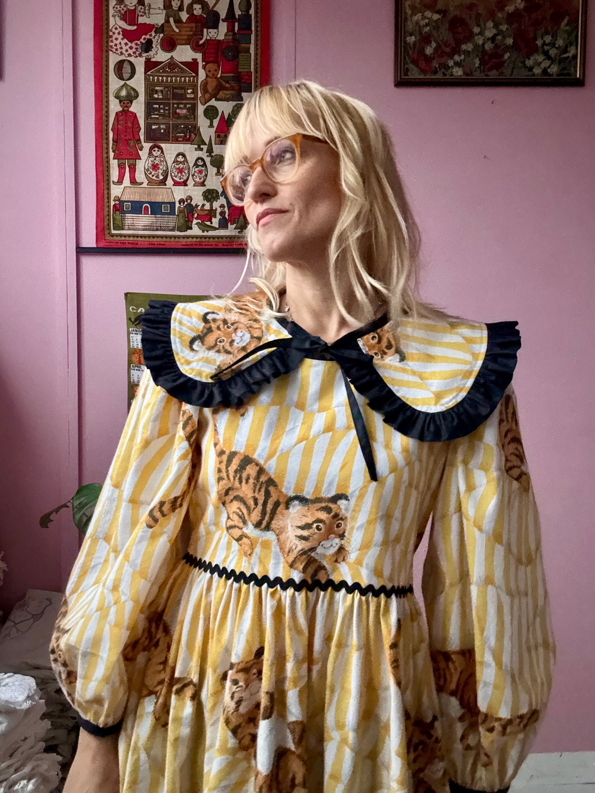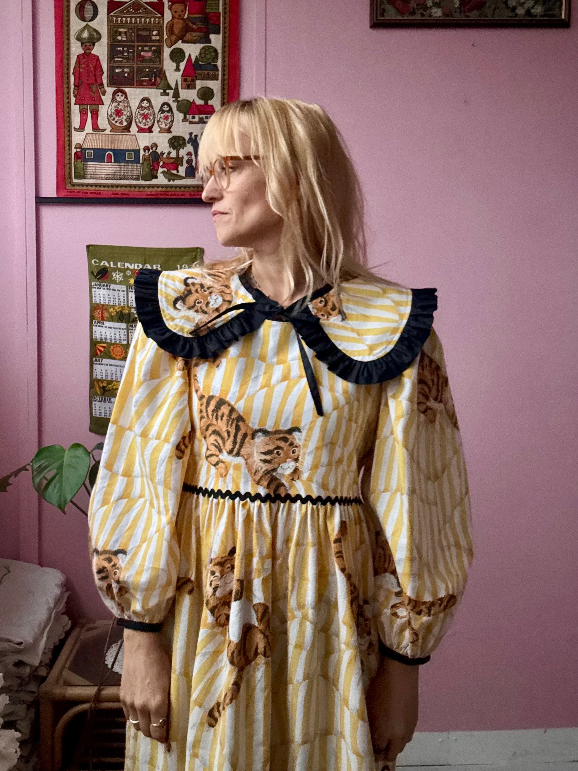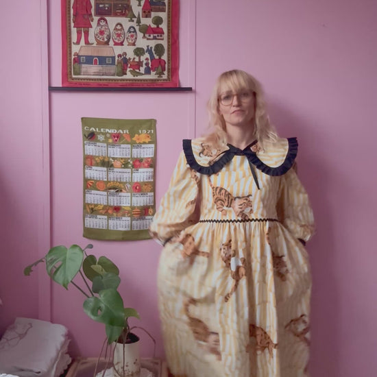 Tiger dress made from vintage curtains with an amazing print-white/yellow stripes and baby tigers