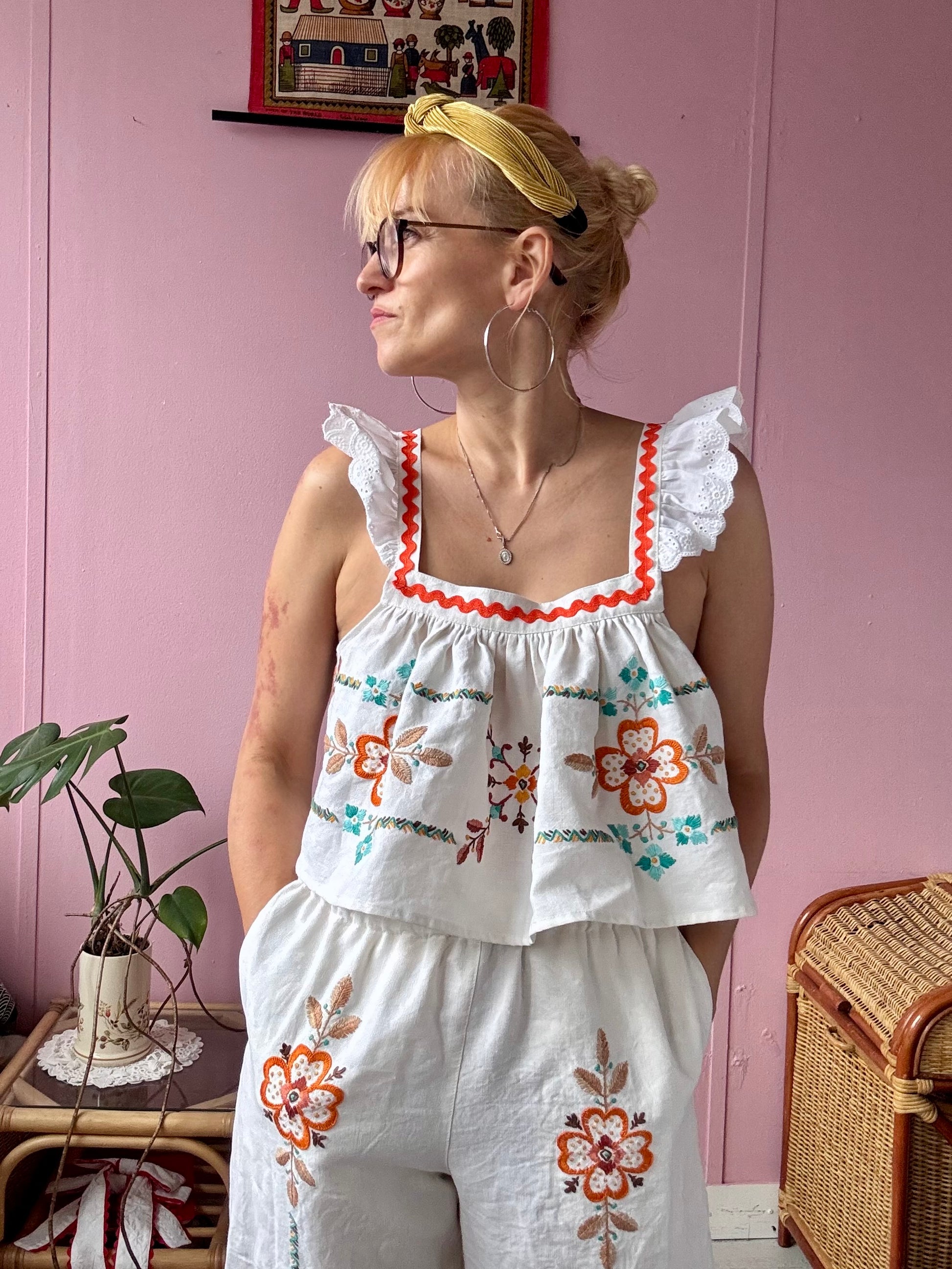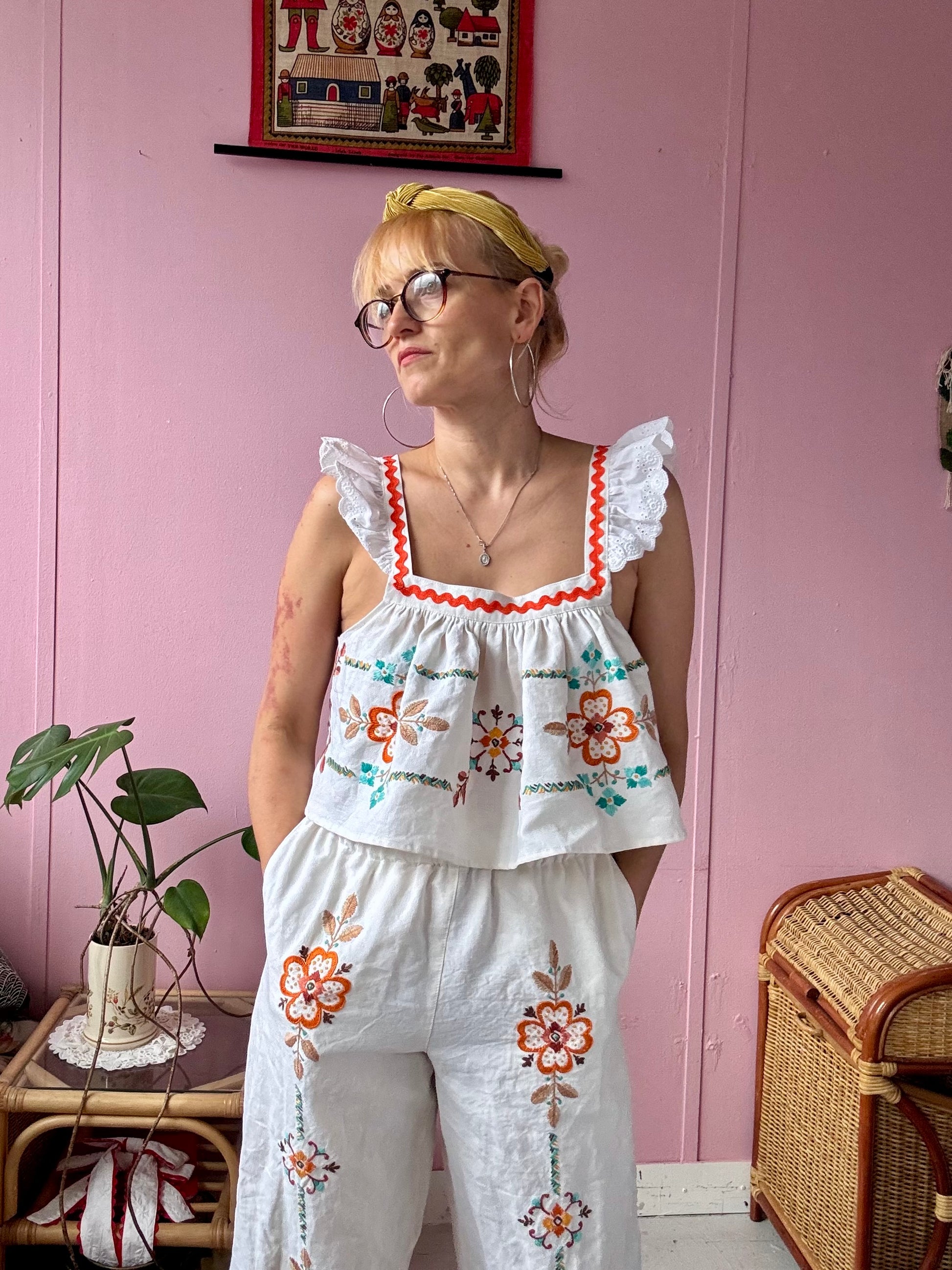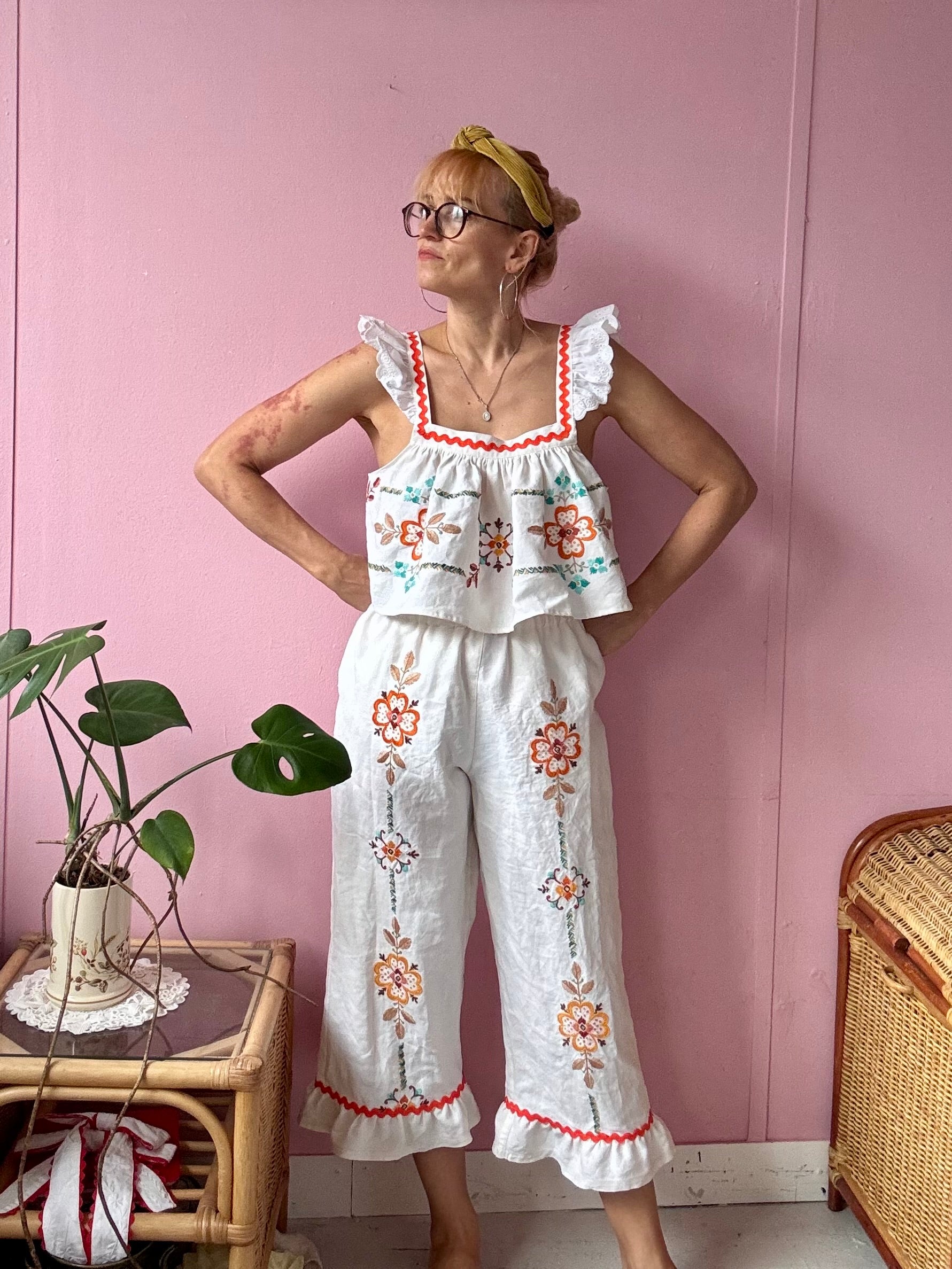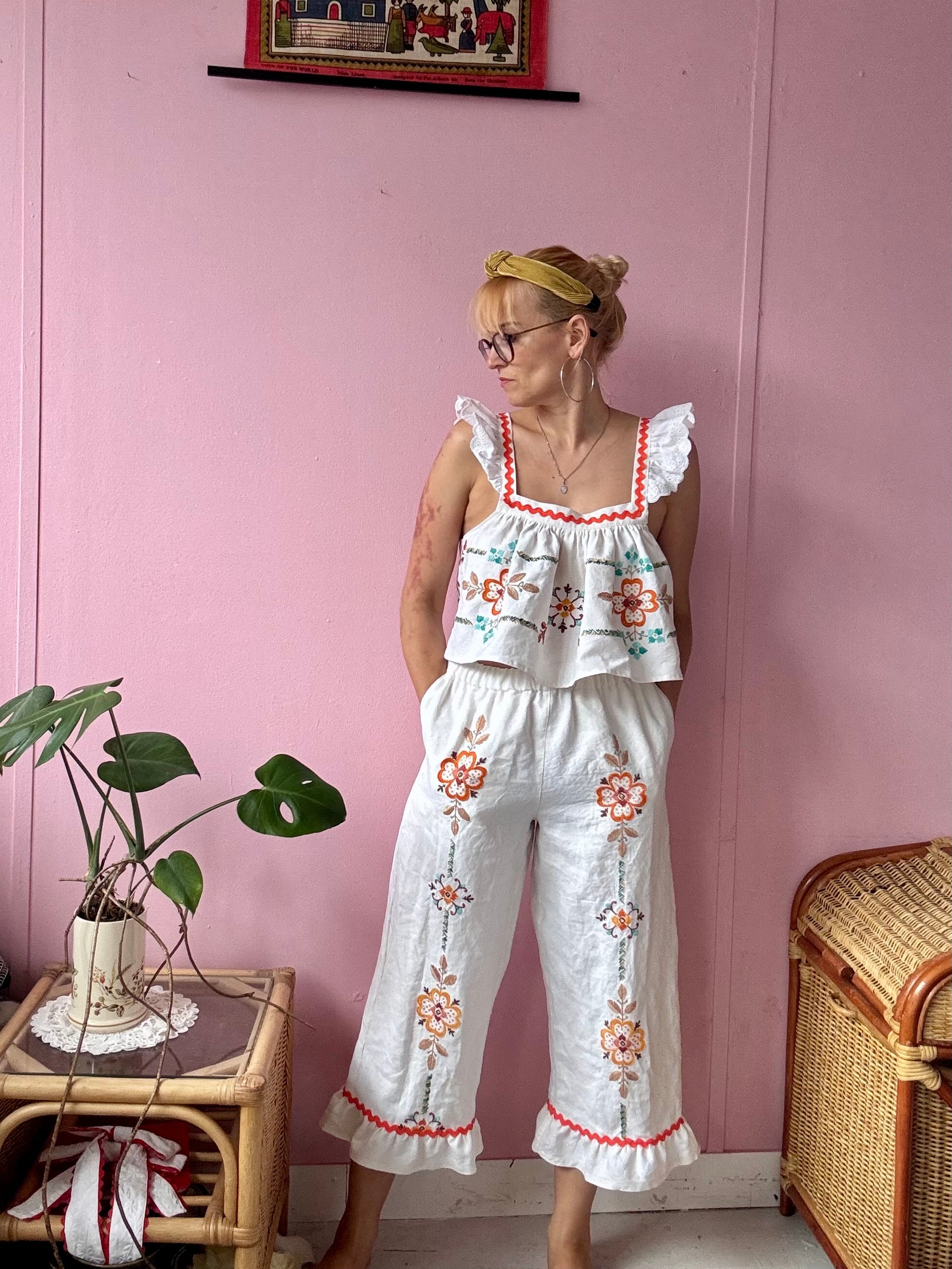 Trousers twin set made from vintage linen tablecloth with hand embroidery