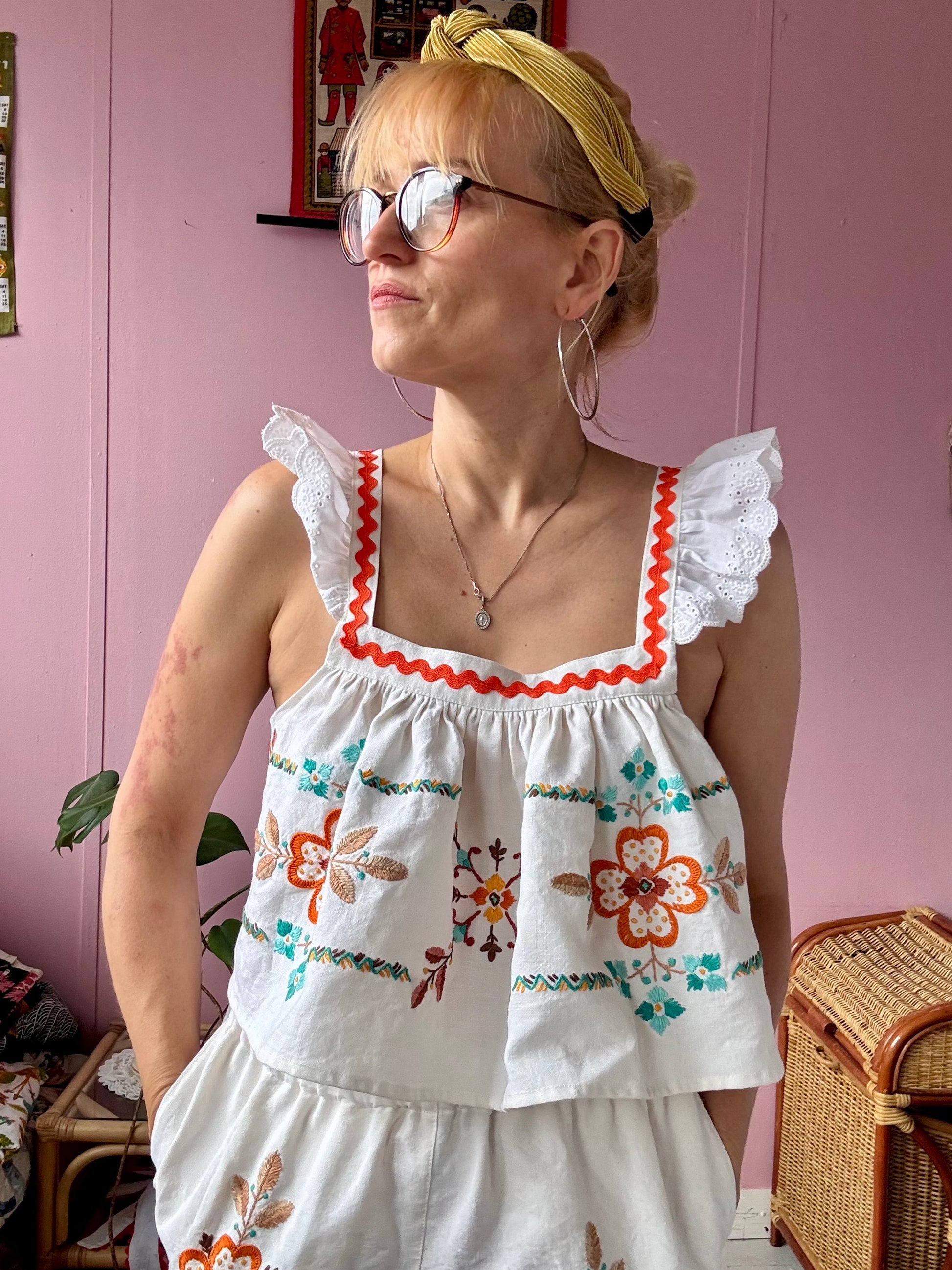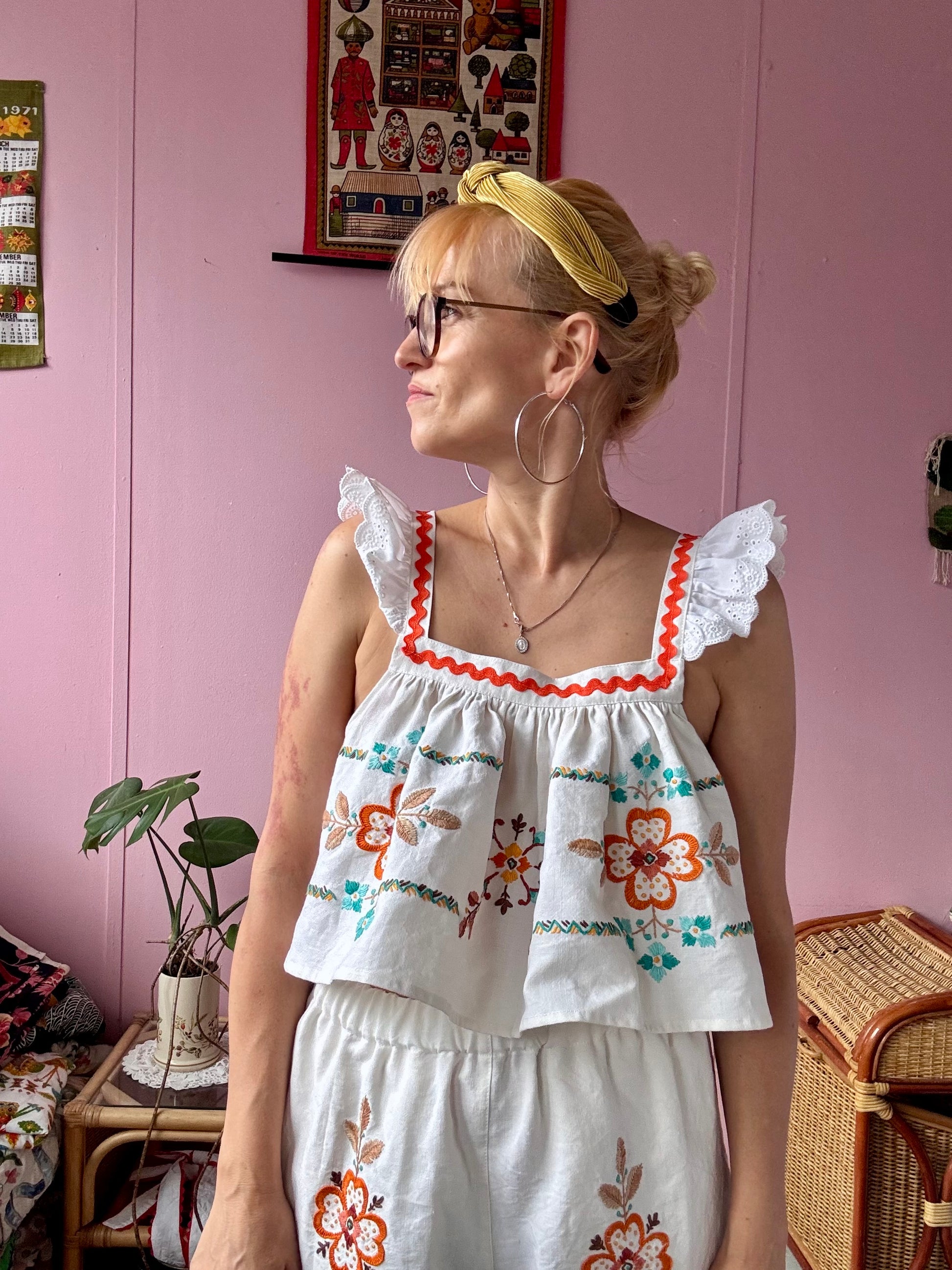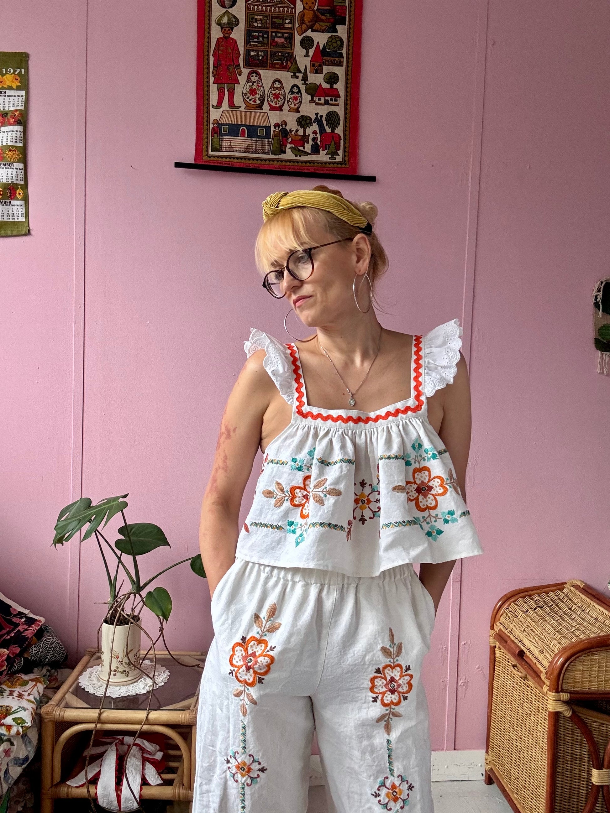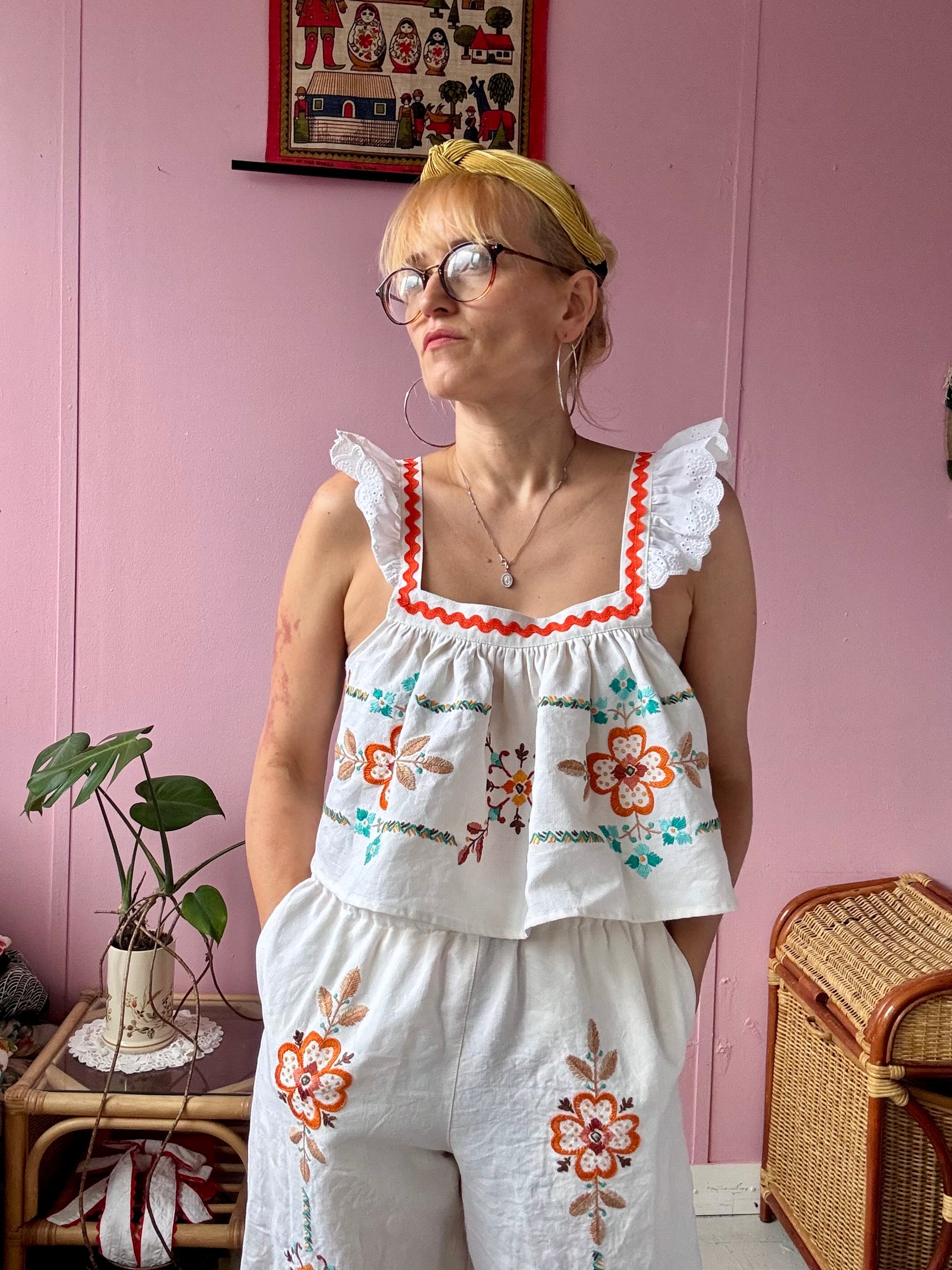 Trousers twin set made from vintage linen tablecloth with hand embroidery