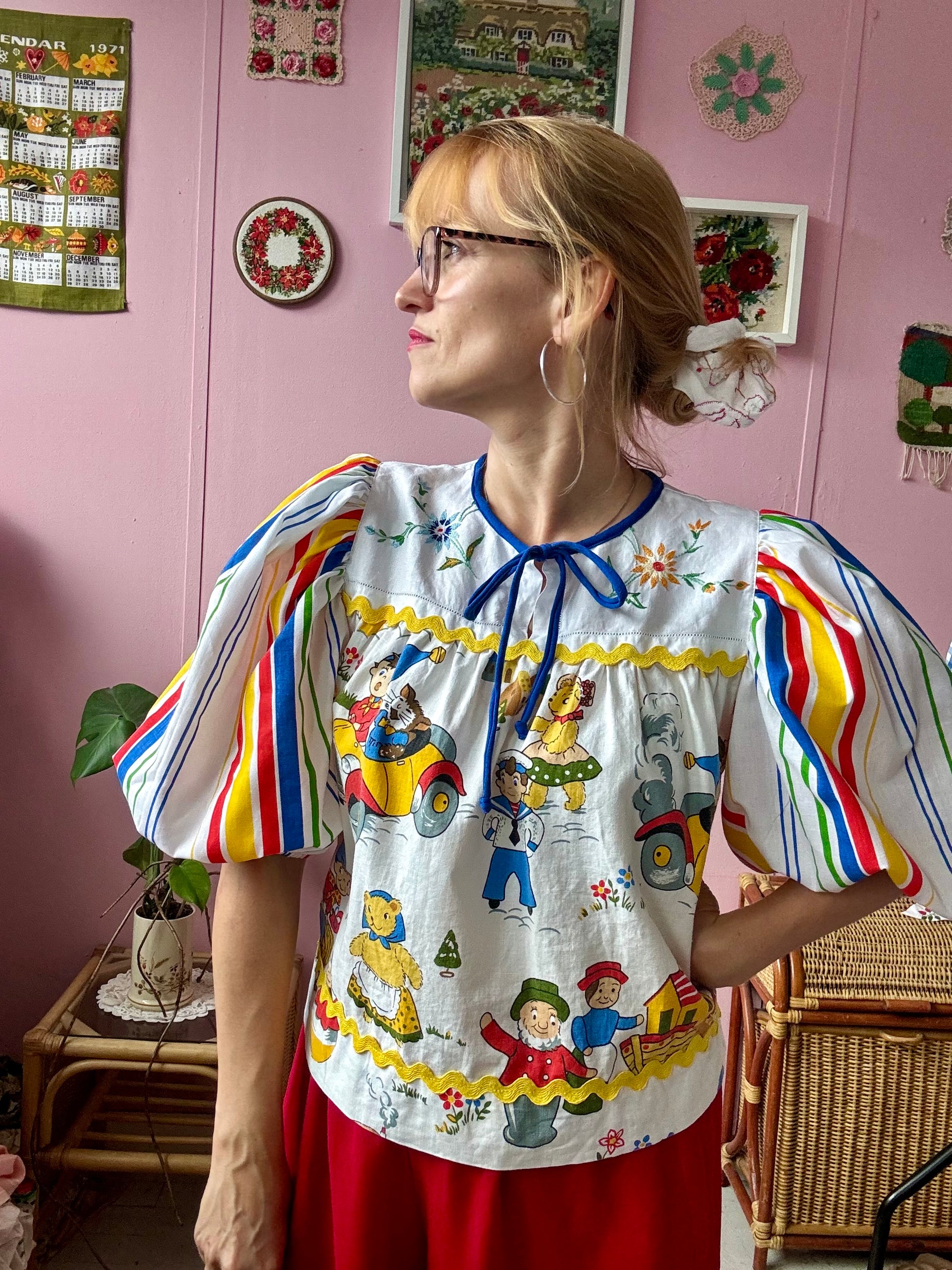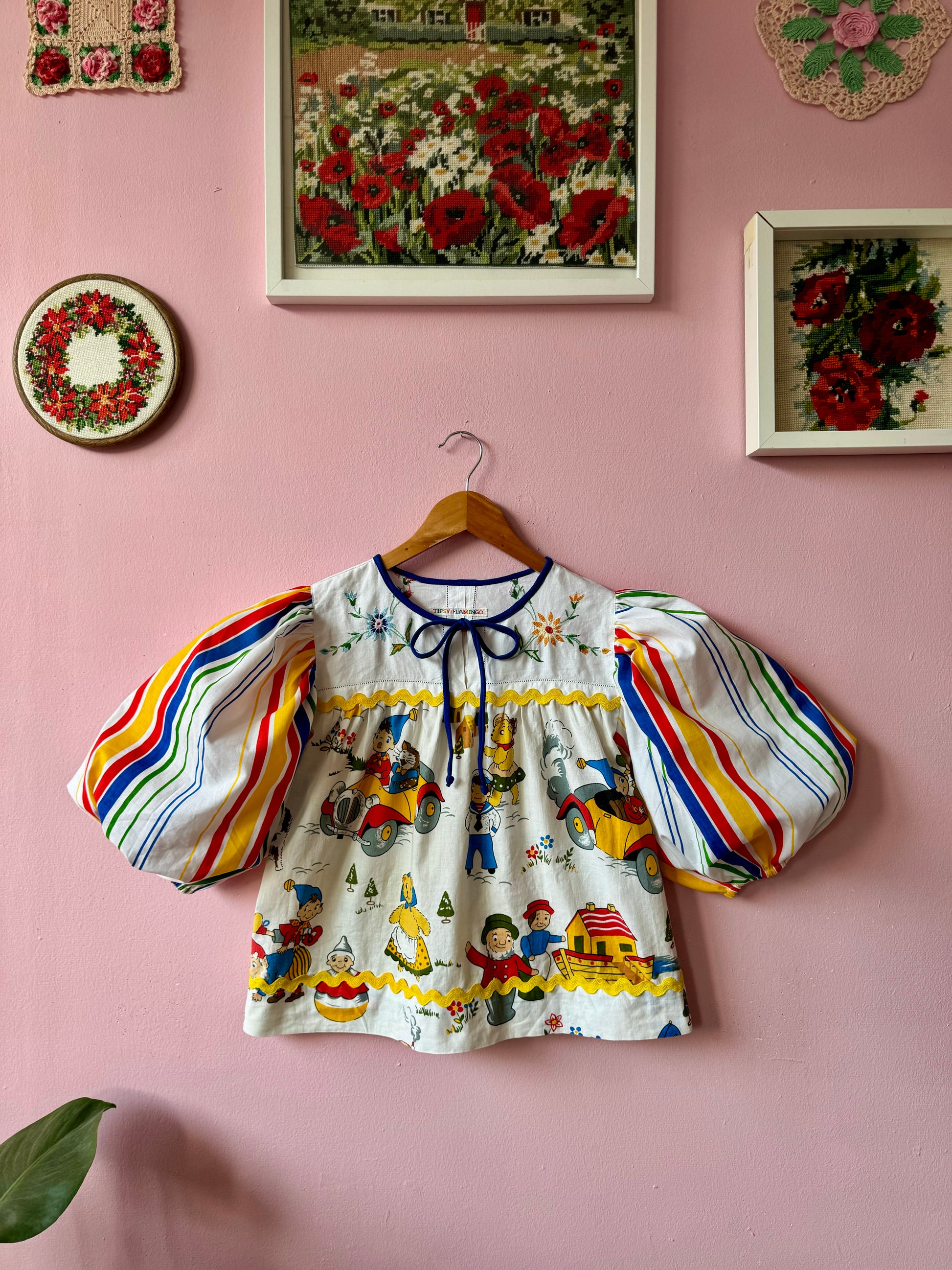 Vintage nursery print blouse with multi colours stripes sleeves made from vintage curtains and bedding