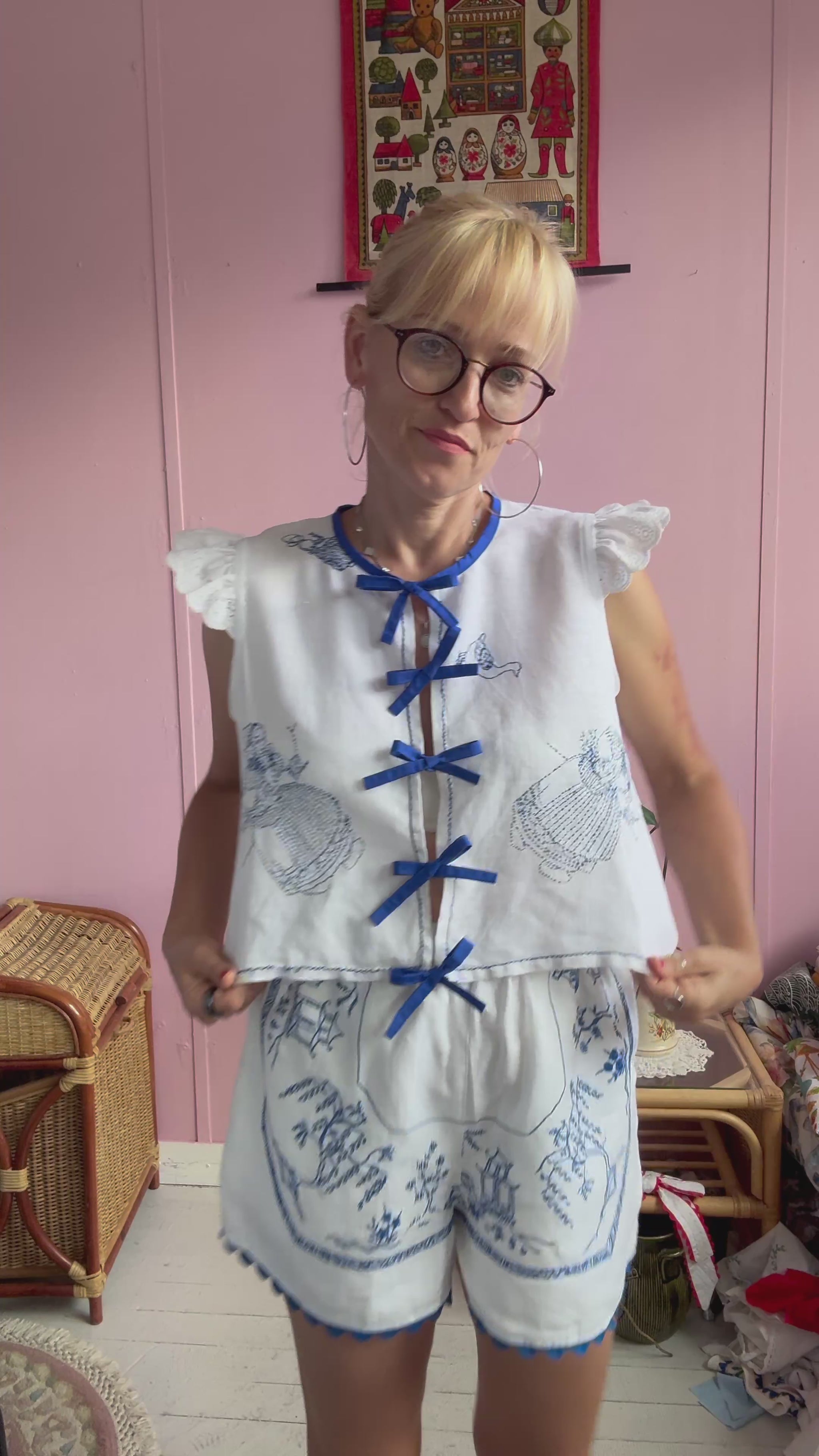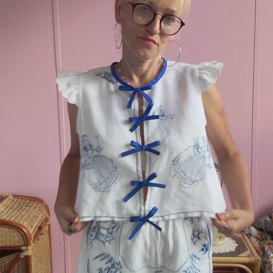 Very light white blouse made from vintage tablecloth with hand embroidery -beautiful details with delicate blue hand embroidery