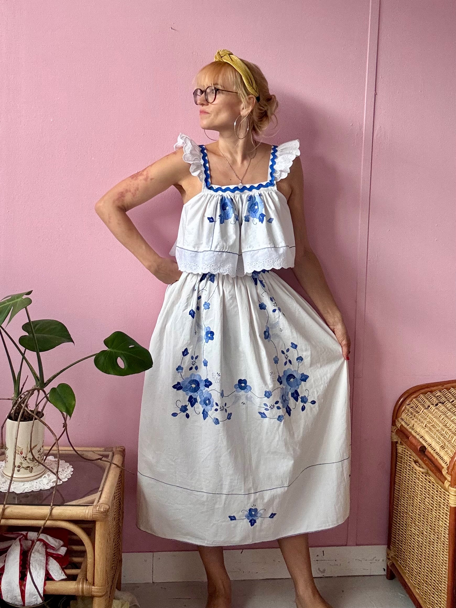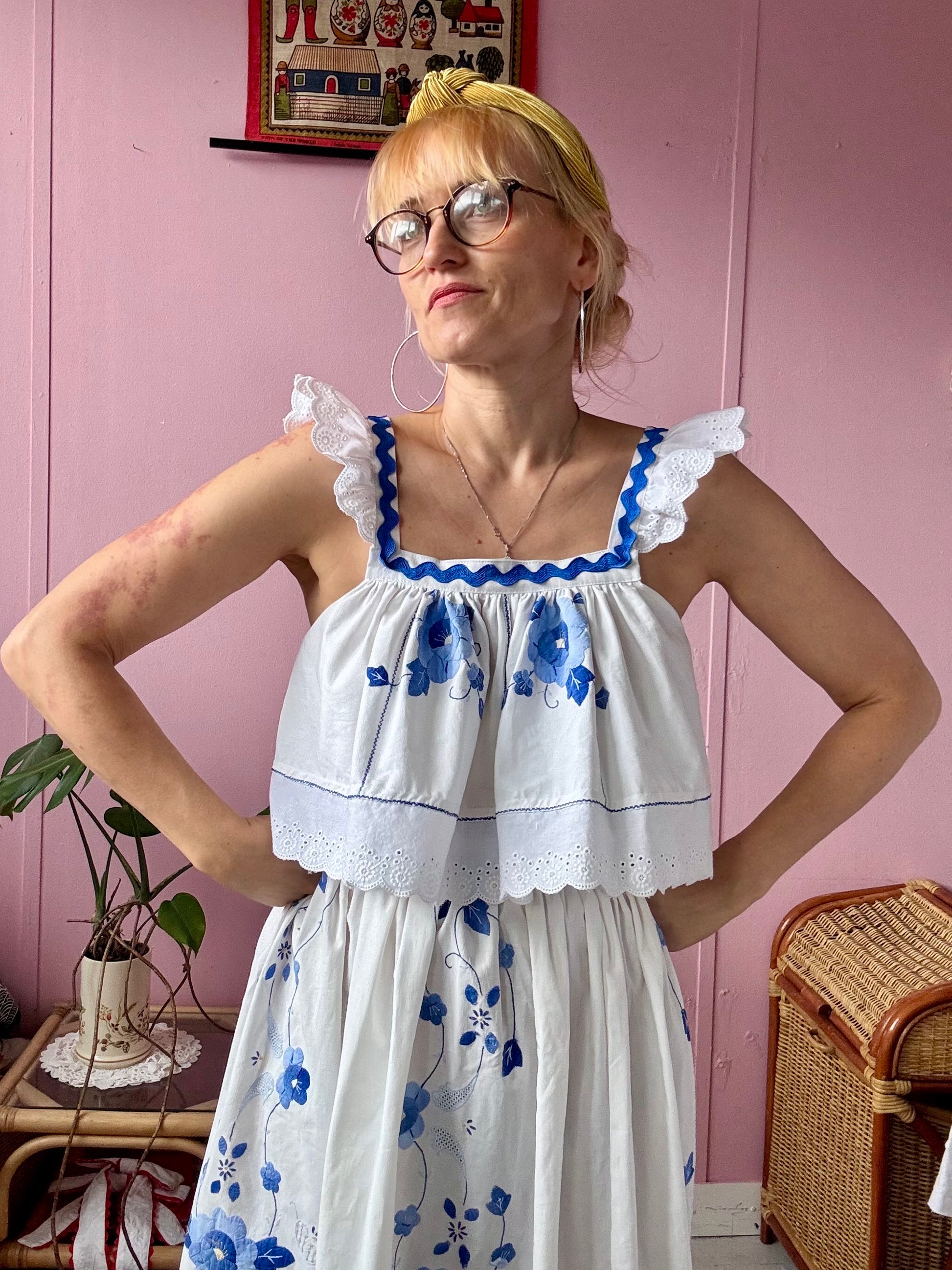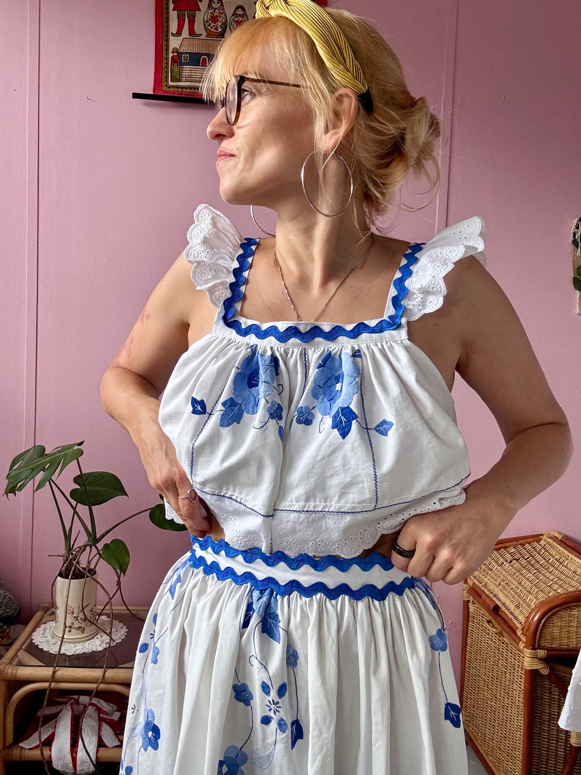 White cotton skirt and top set made from vintage tablecloth with blue floral appliqués and cross stitching lines