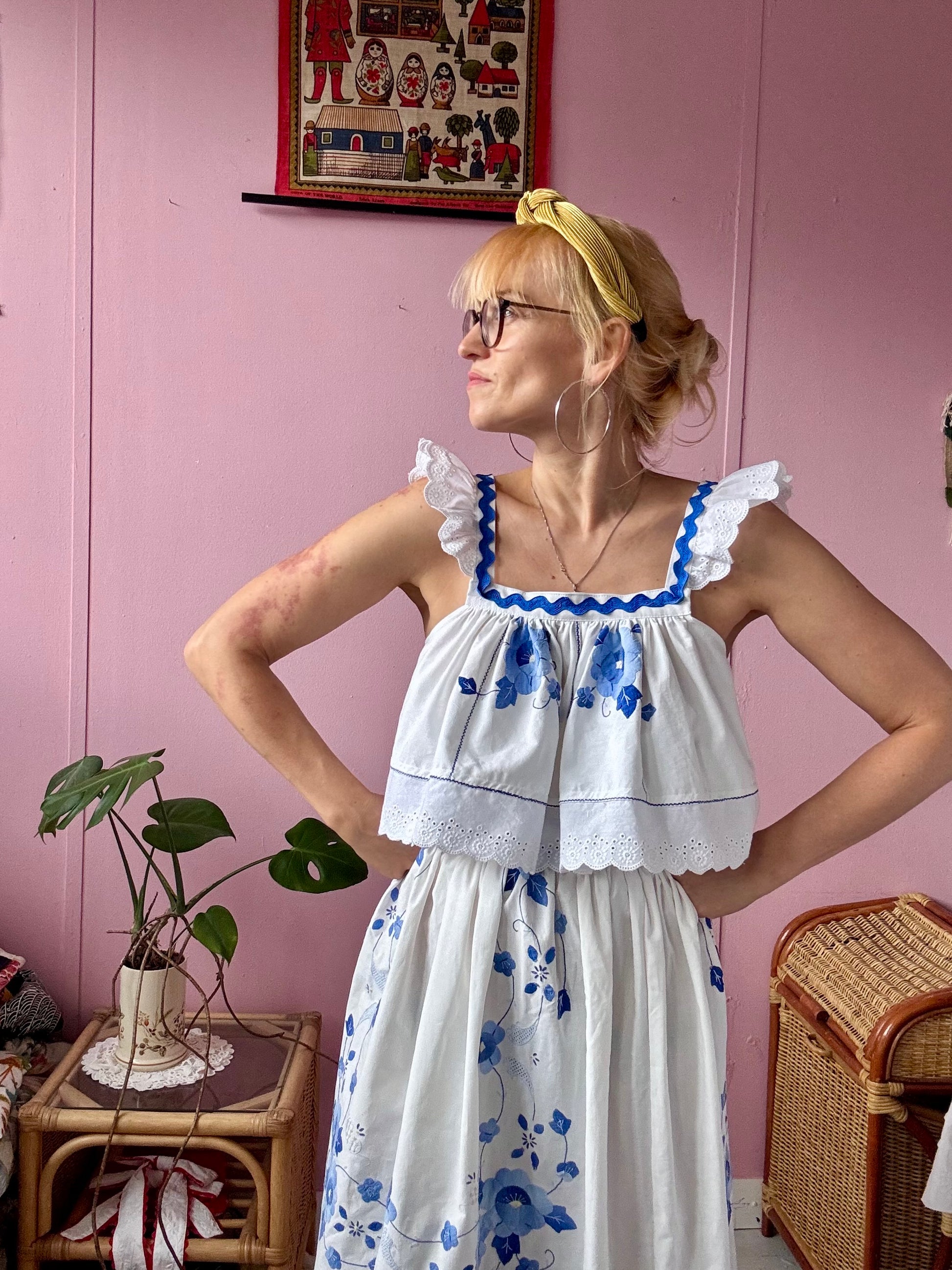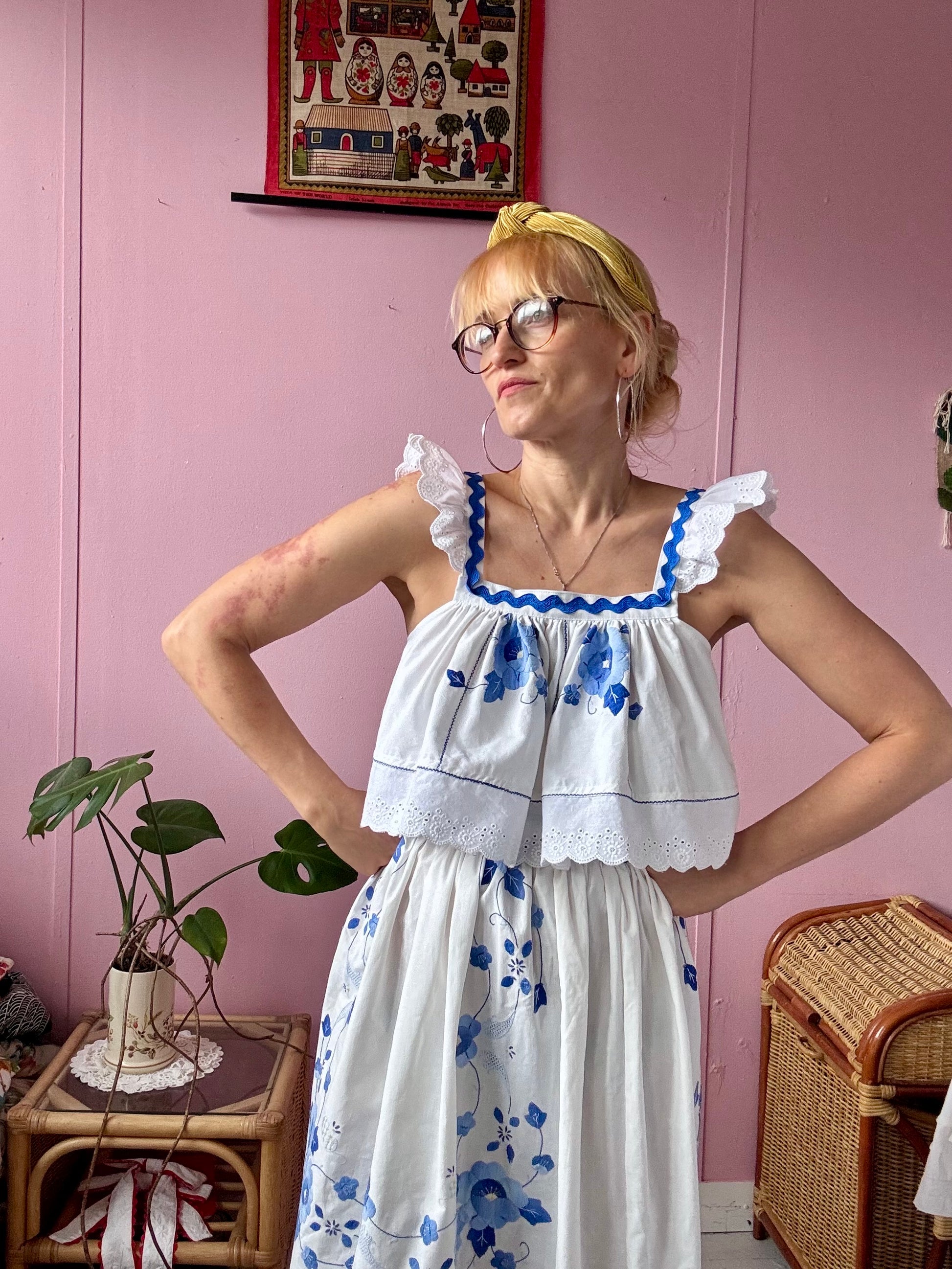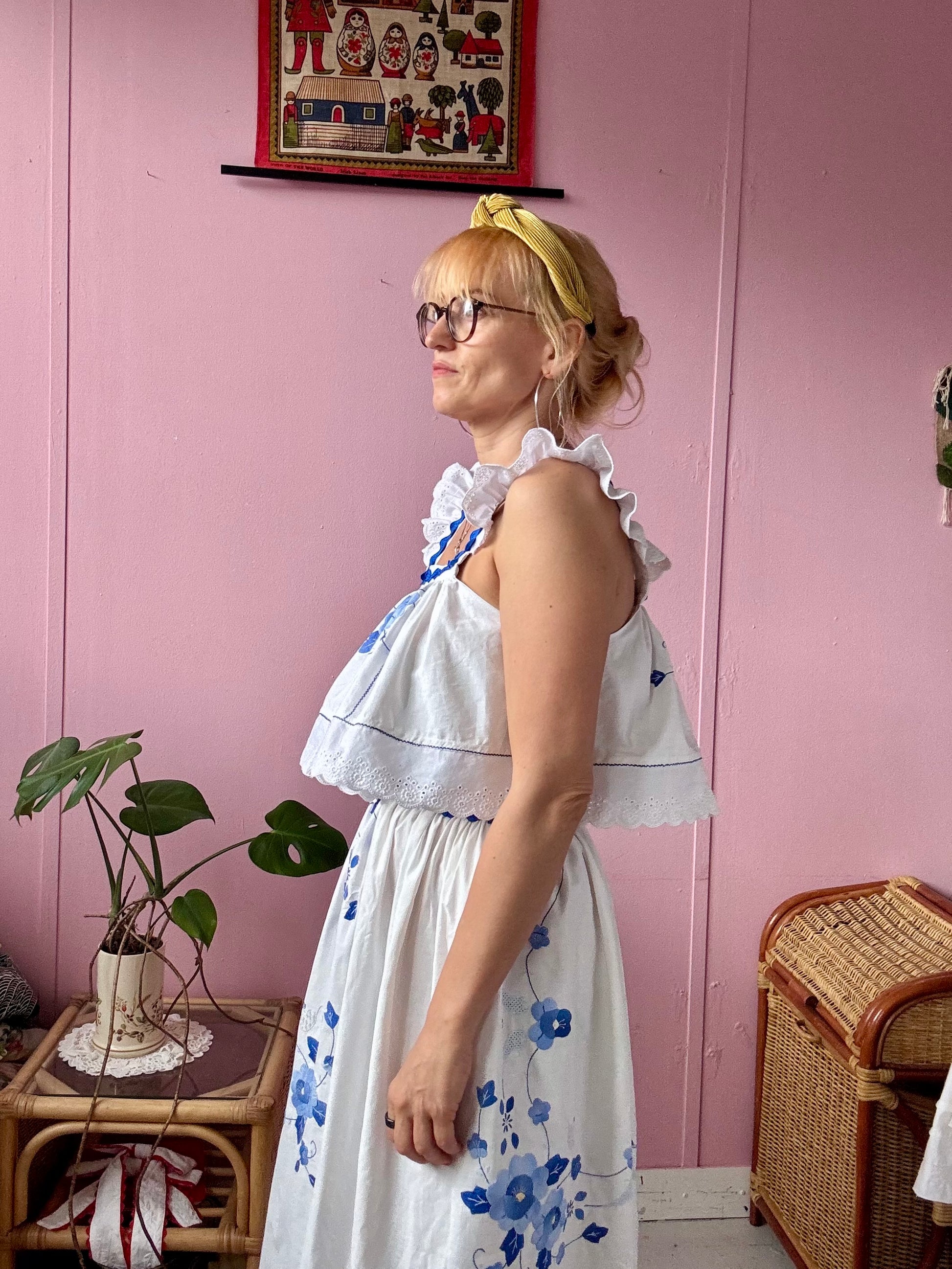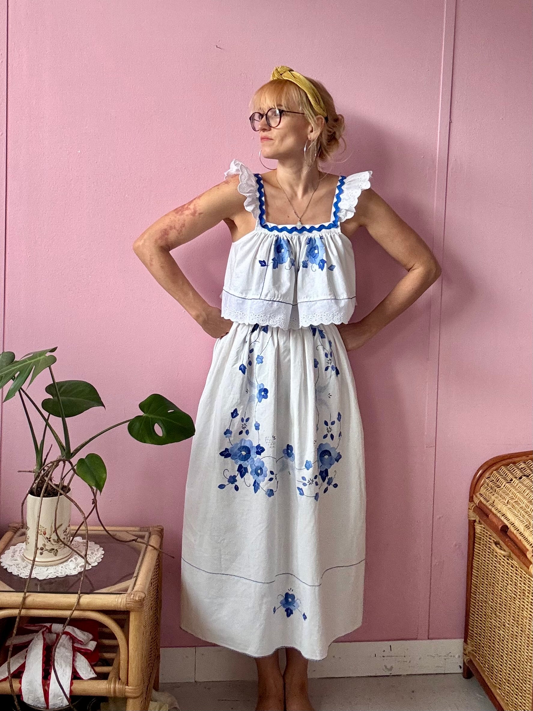 White cotton skirt and top set made from vintage tablecloth with blue floral appliqués and cross stitching lines
