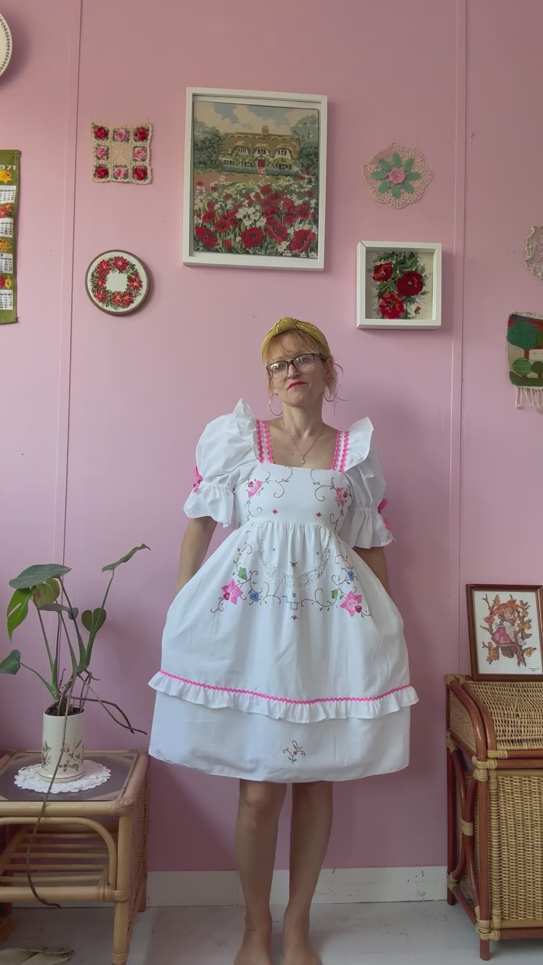 White dress with floral appliqués and pink ric rac