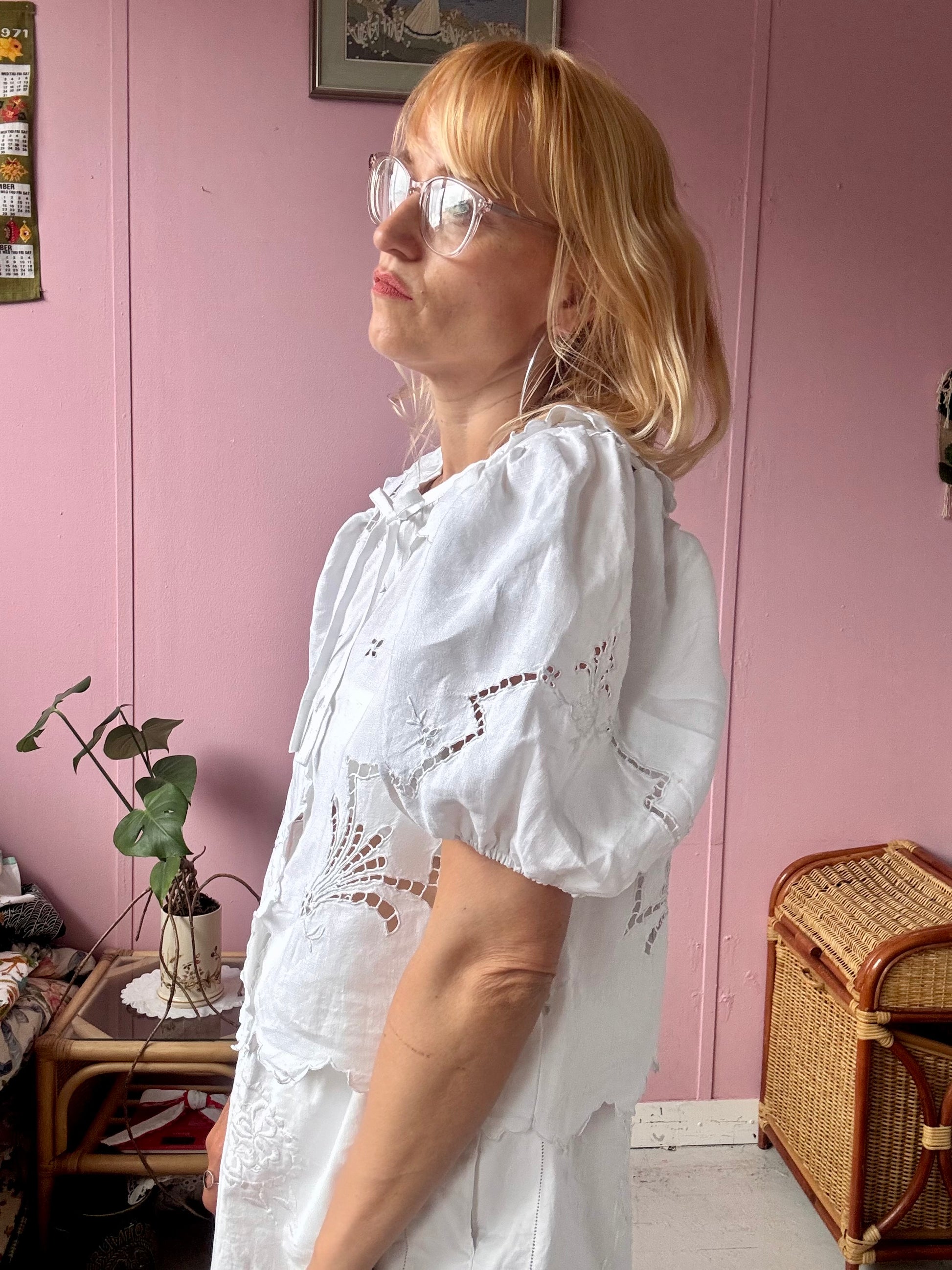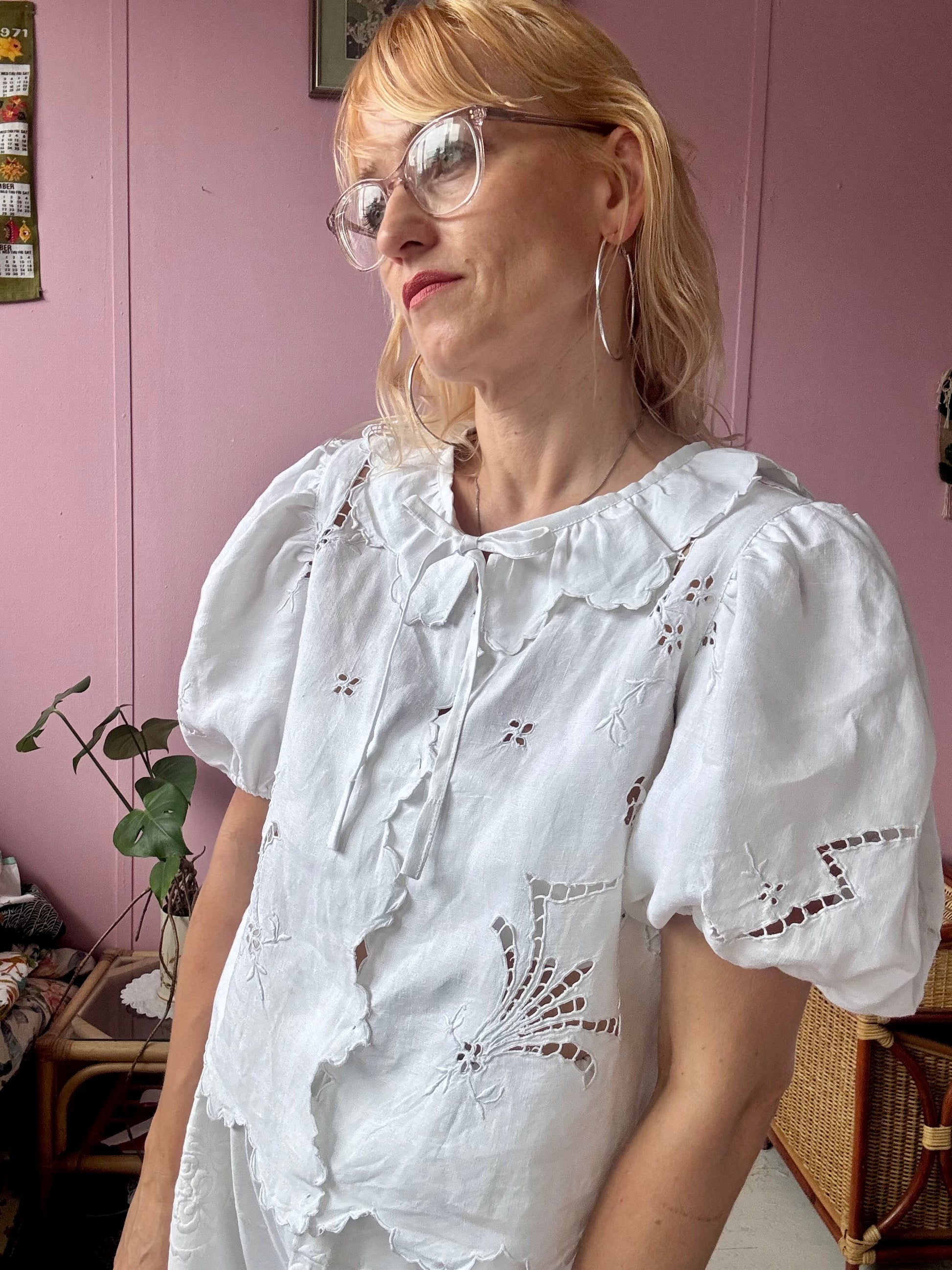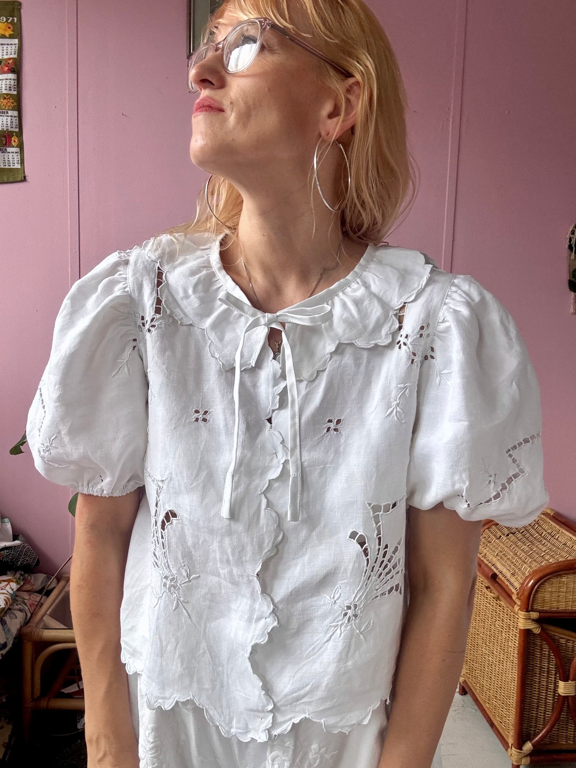 White blouse made from vintage tablecloth with hand embroidery and cut out details -light white cotton fabric