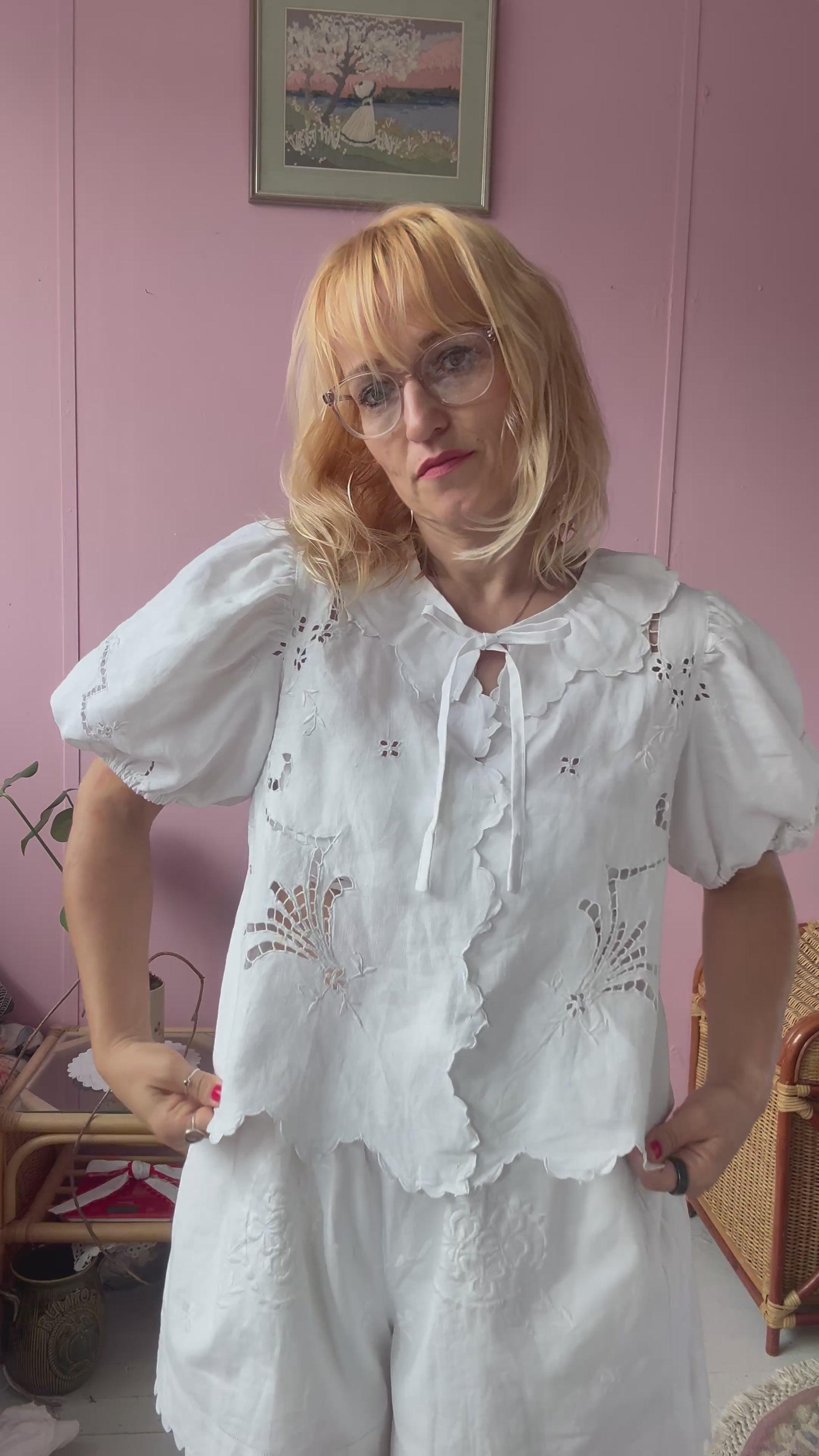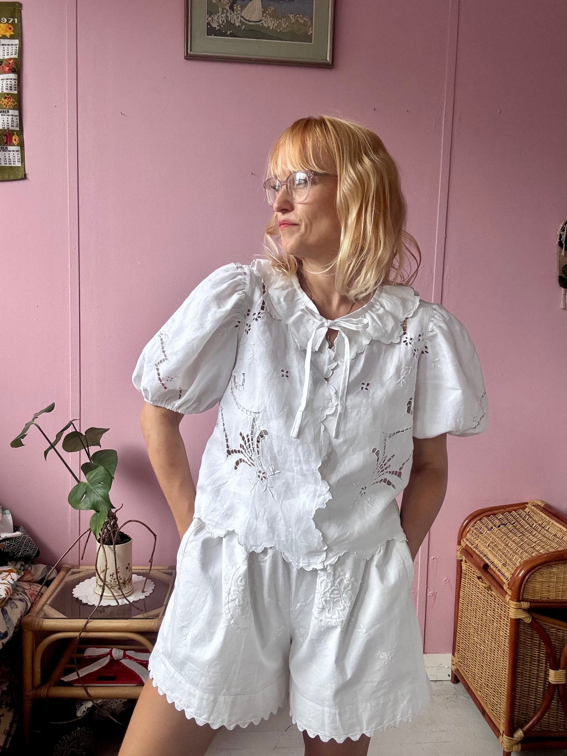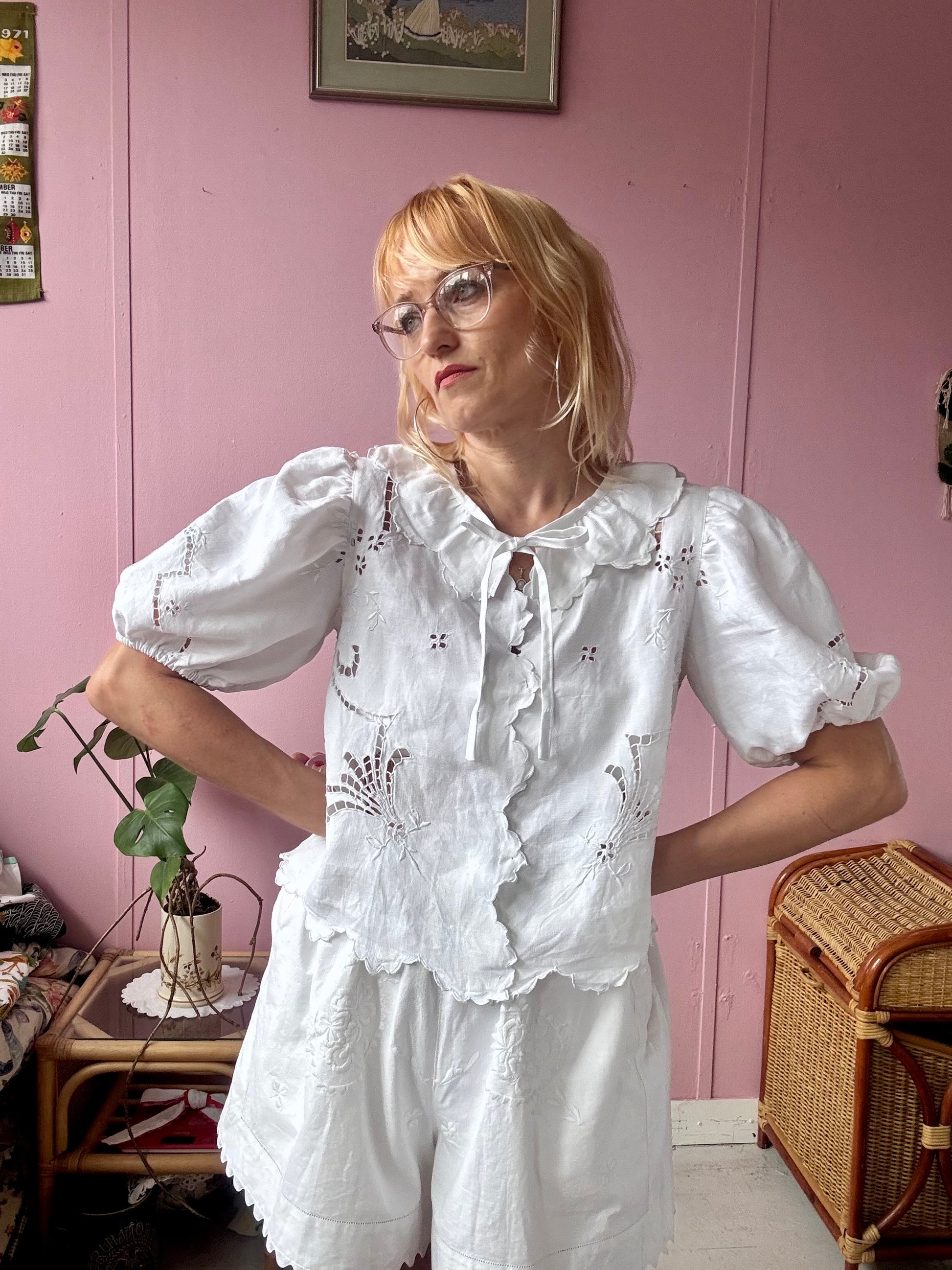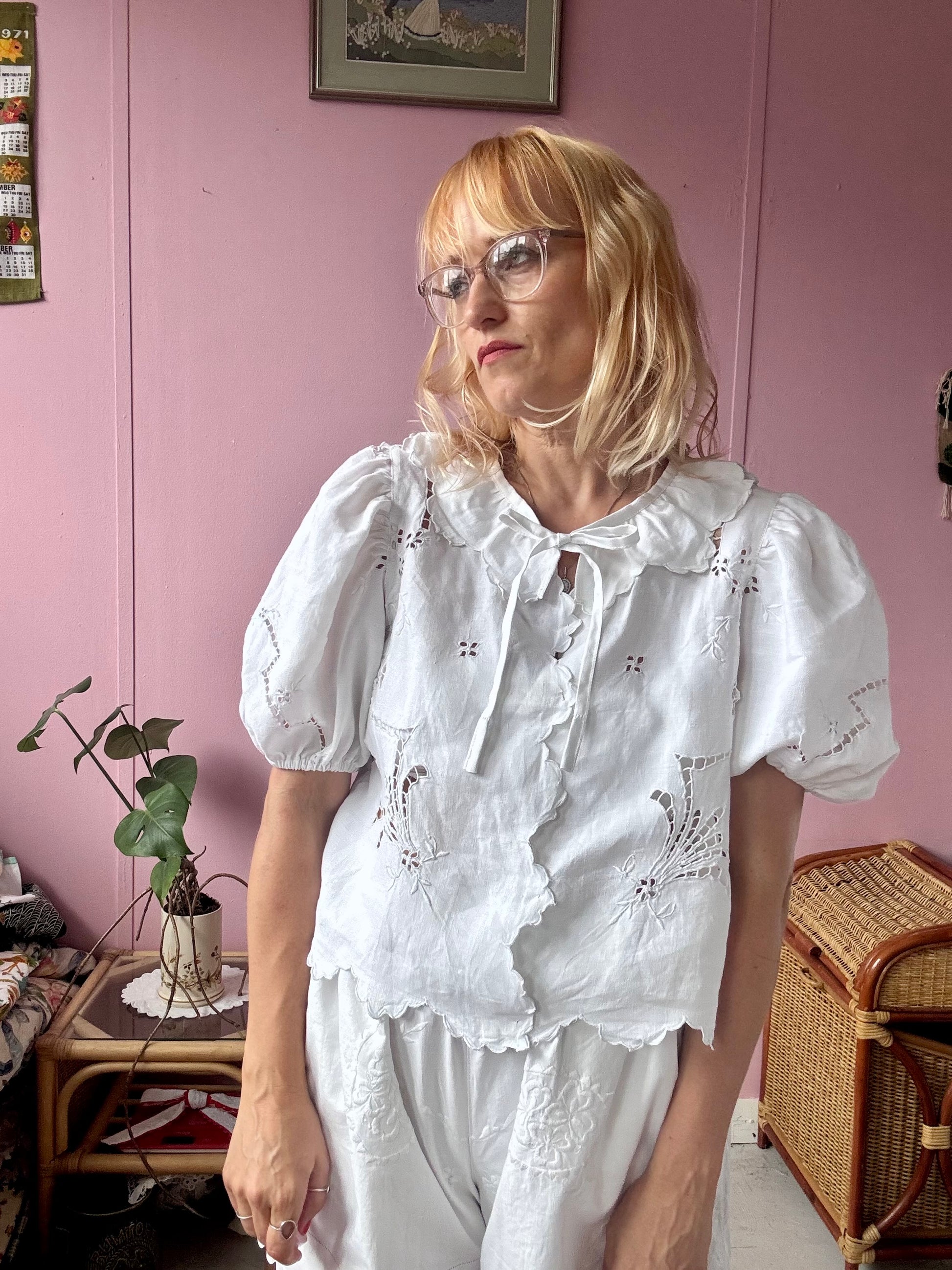 White blouse made from vintage tablecloth with hand embroidery and cut out details -light white cotton fabric