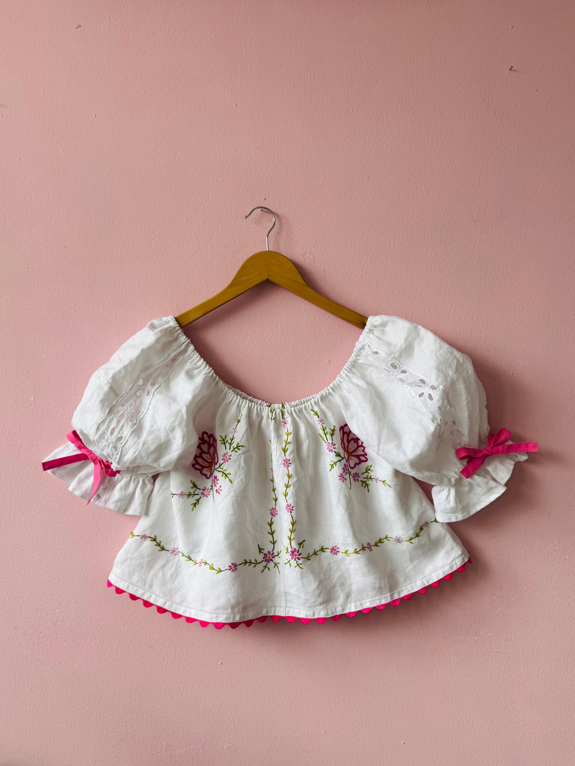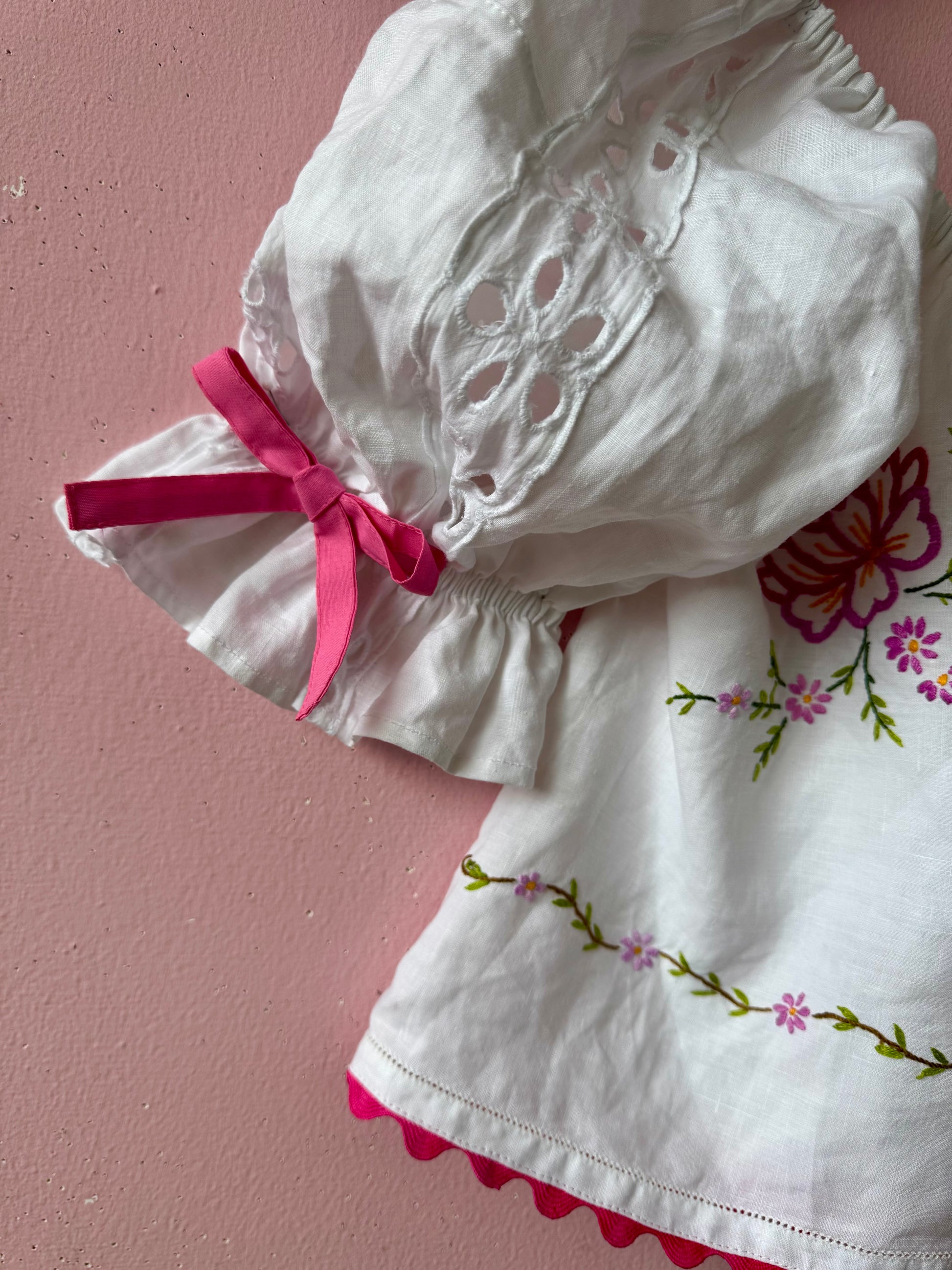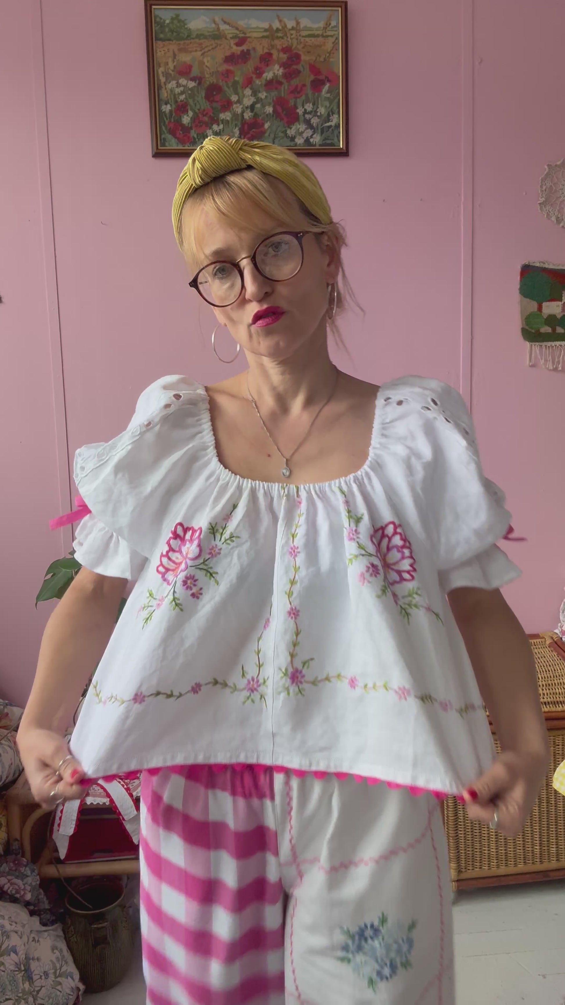 Floral and lace panels blouse made from vintage tablecloth with floral hand embroidery and pillow cases