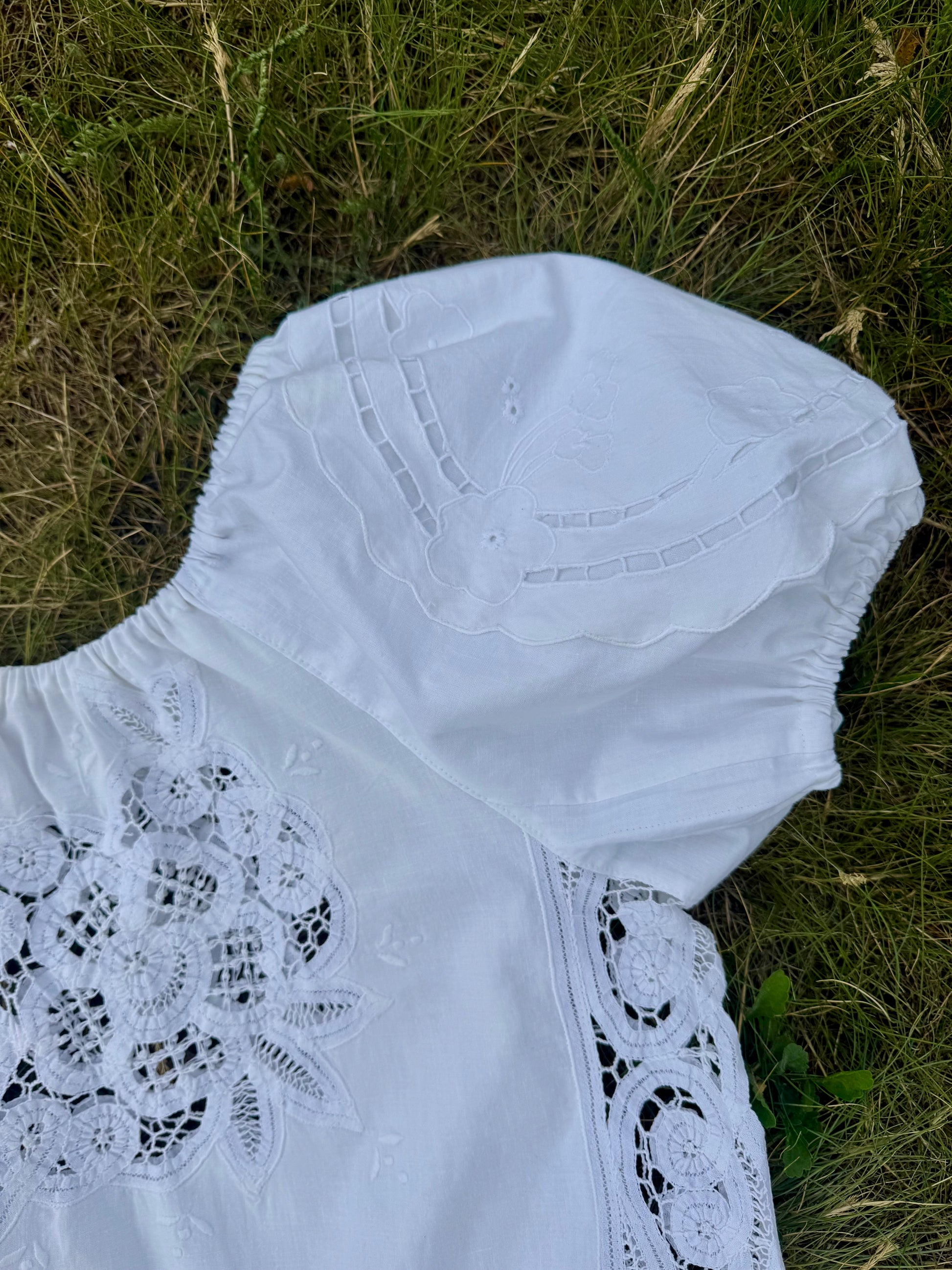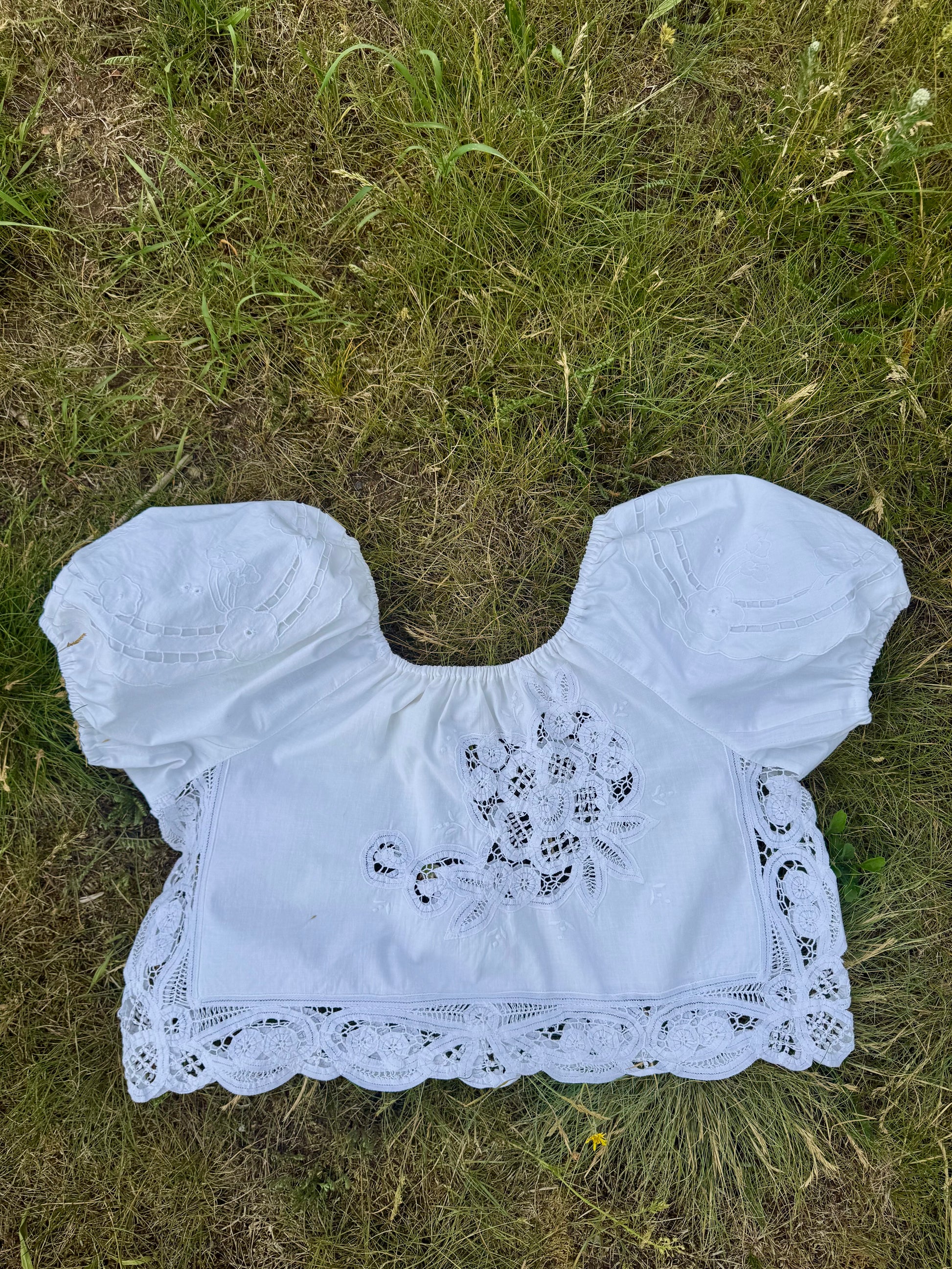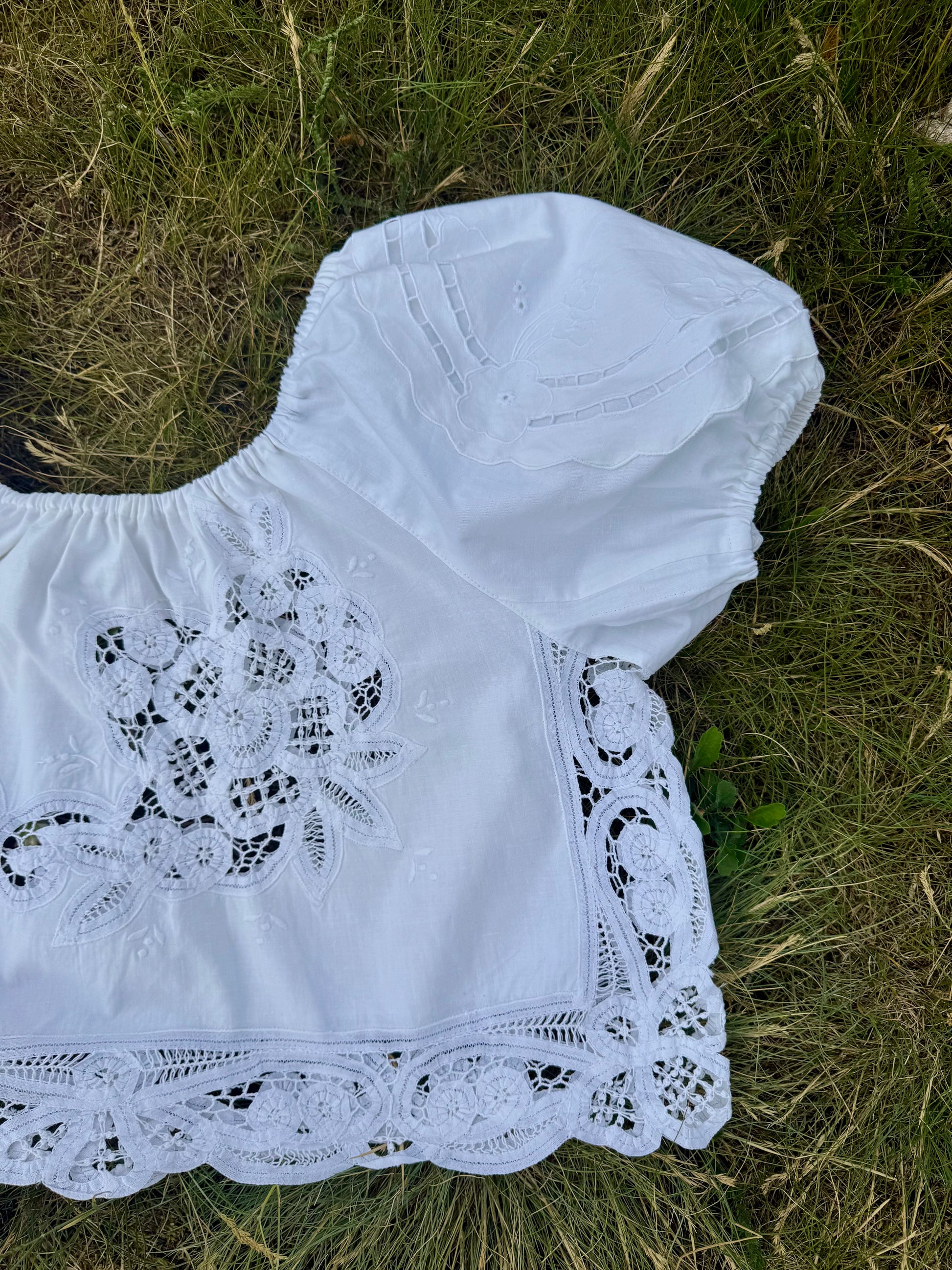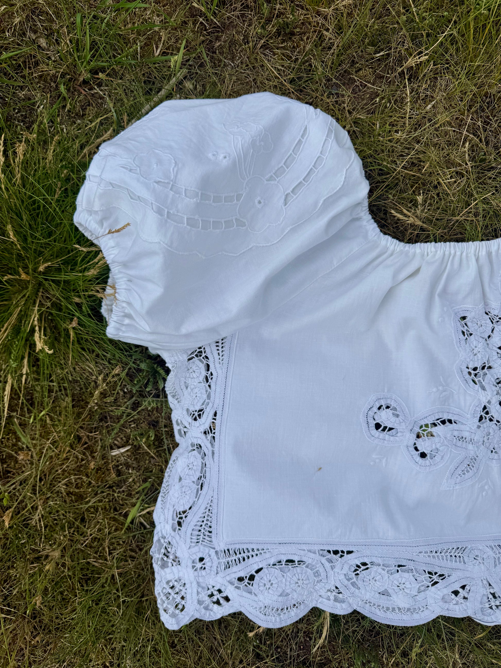 Cute little summer top made from vintage tablecloth with floral embroidery and lace on side,hemline and front