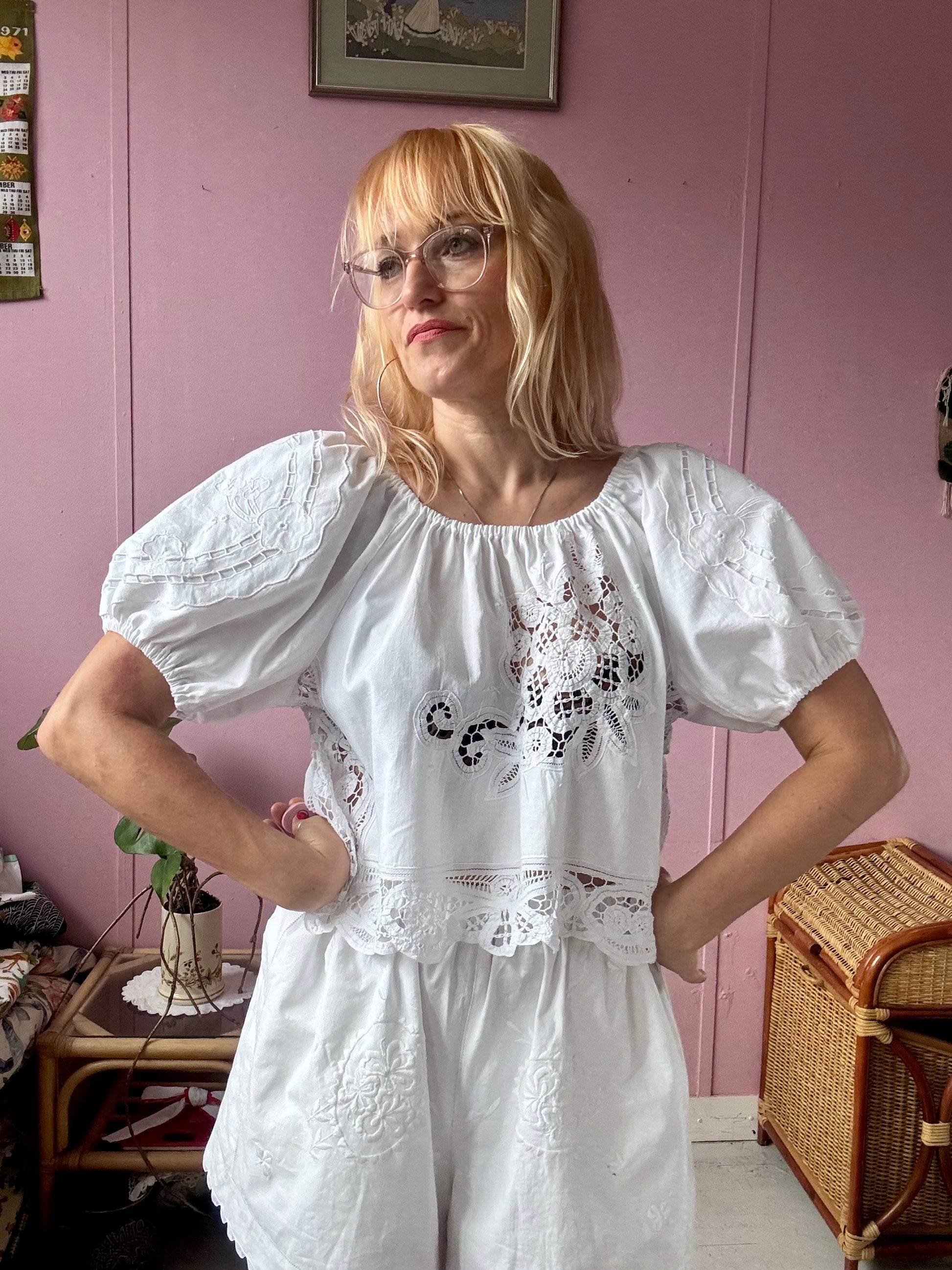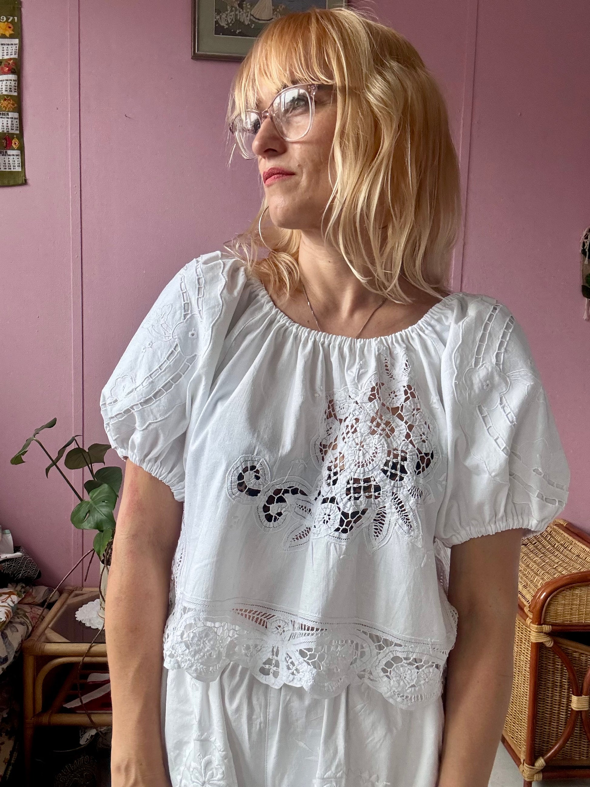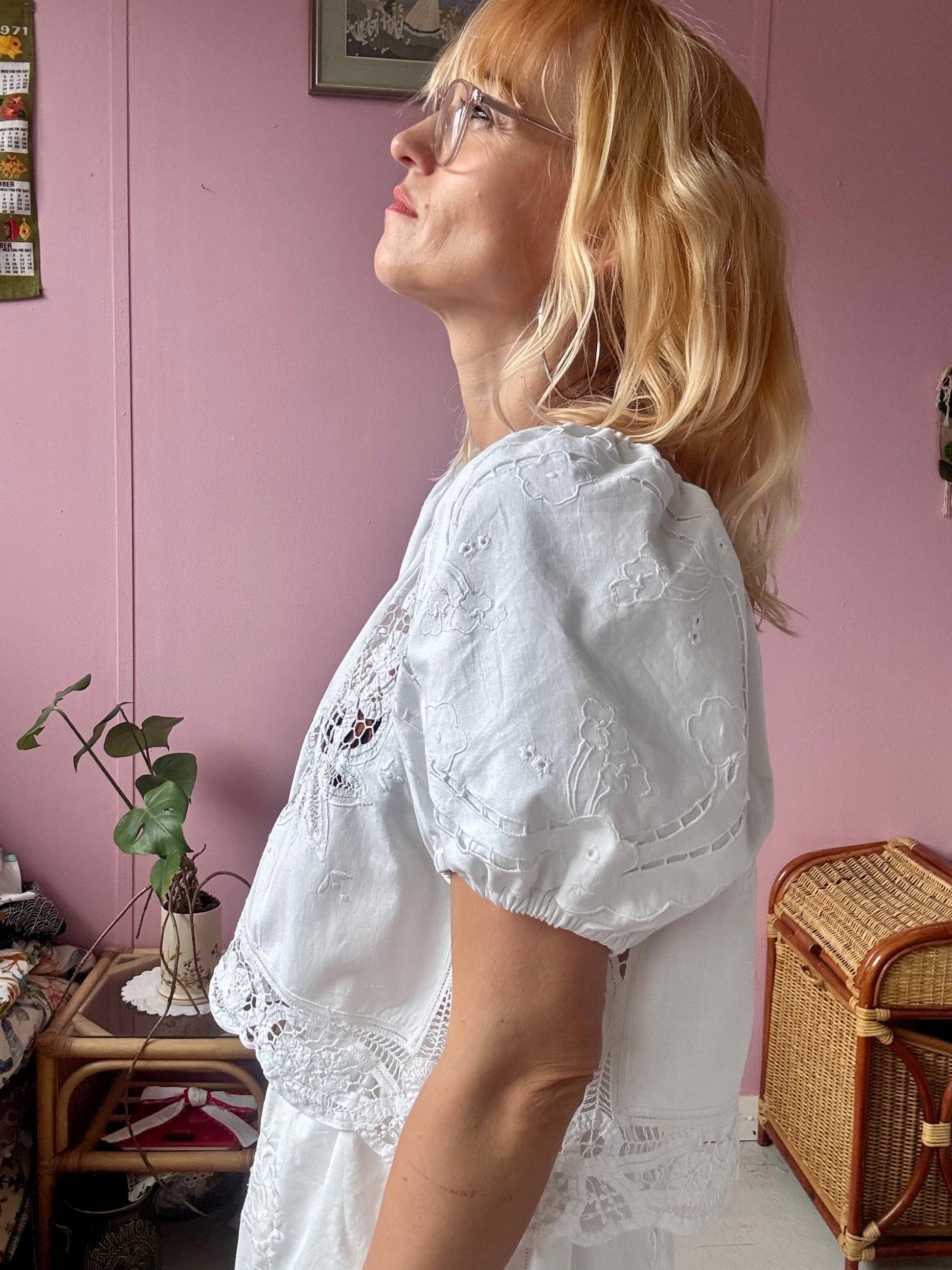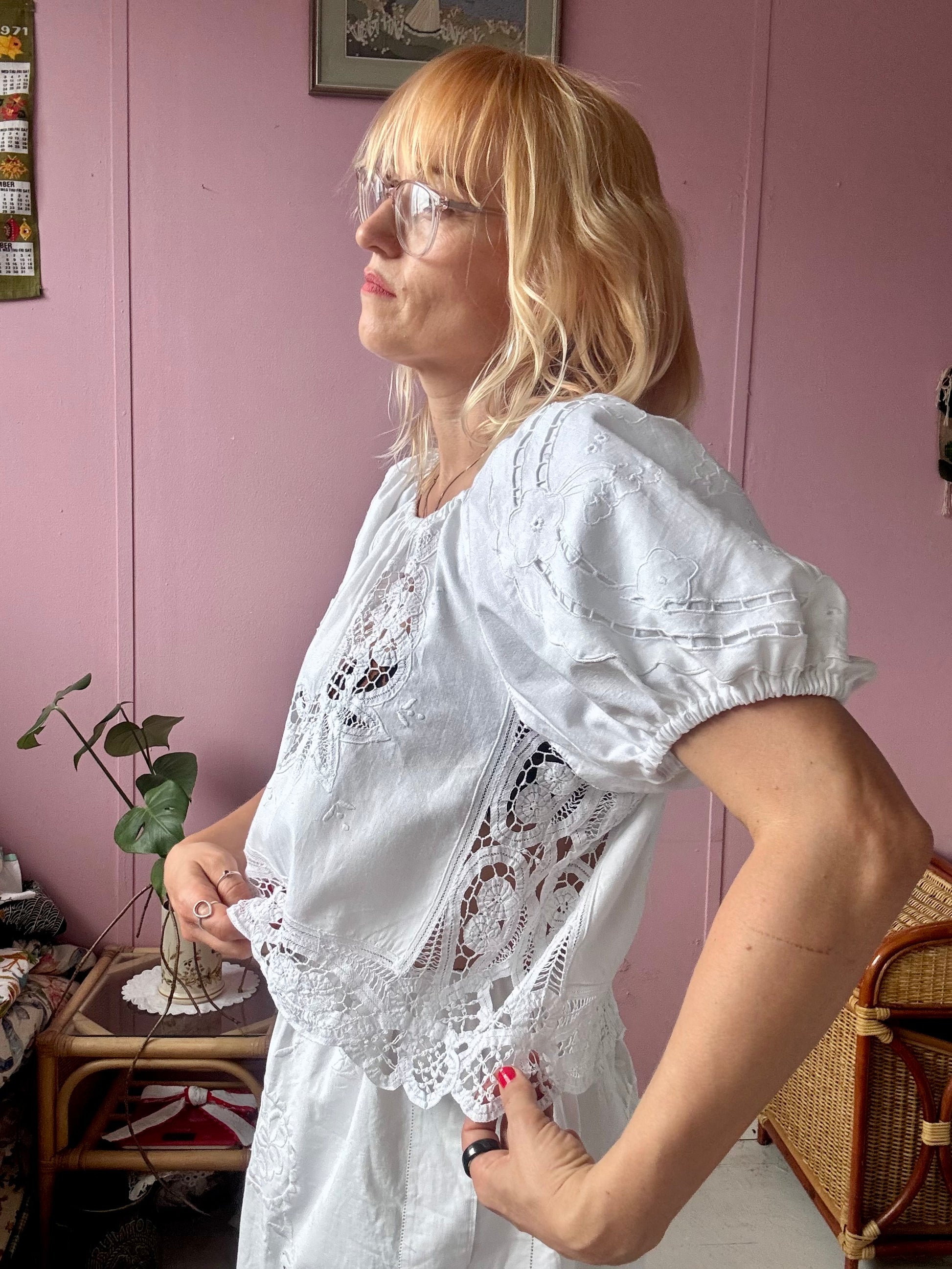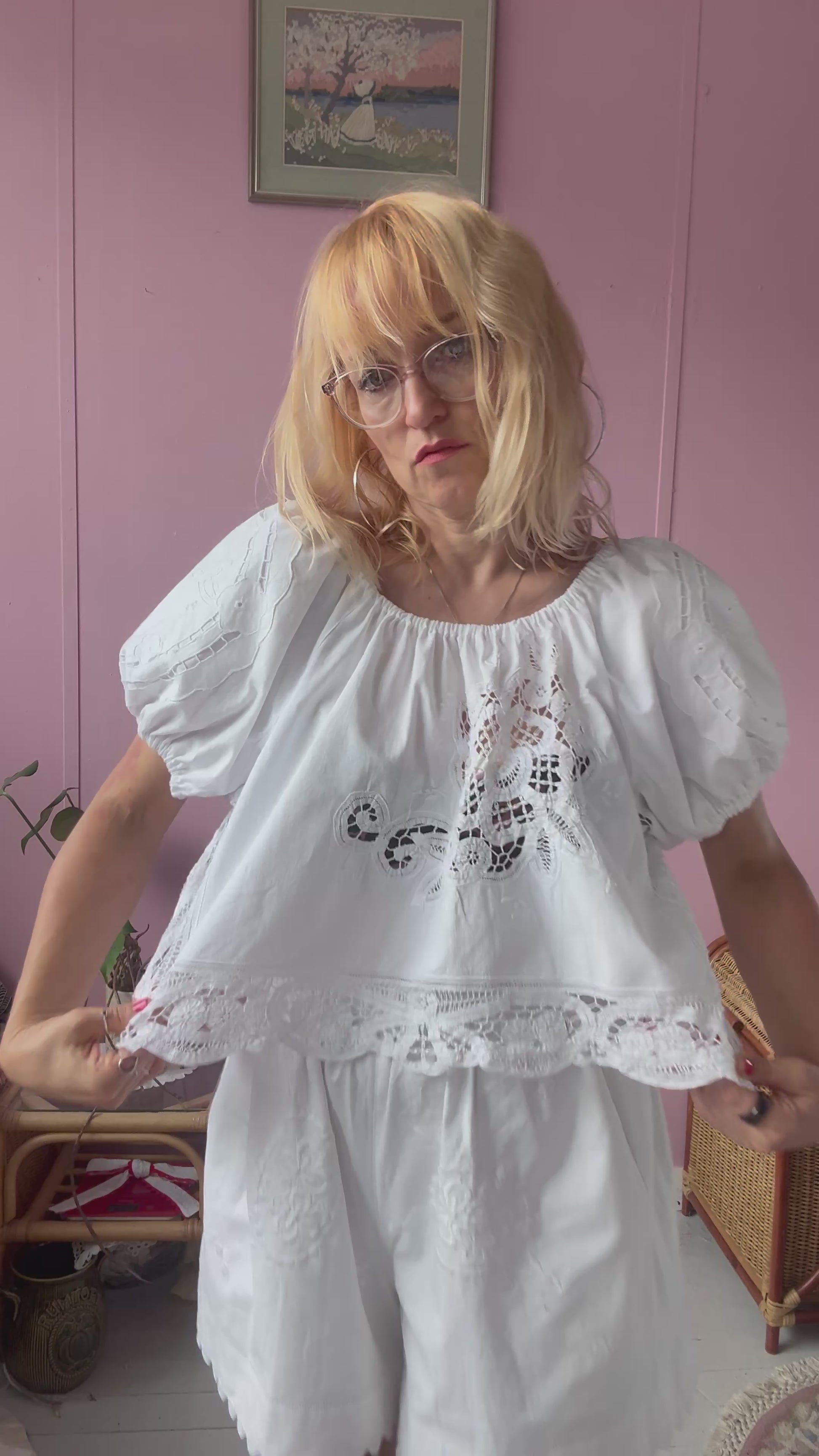 Cute little summer top made from vintage tablecloth with floral embroidery and lace on side,hemline and front