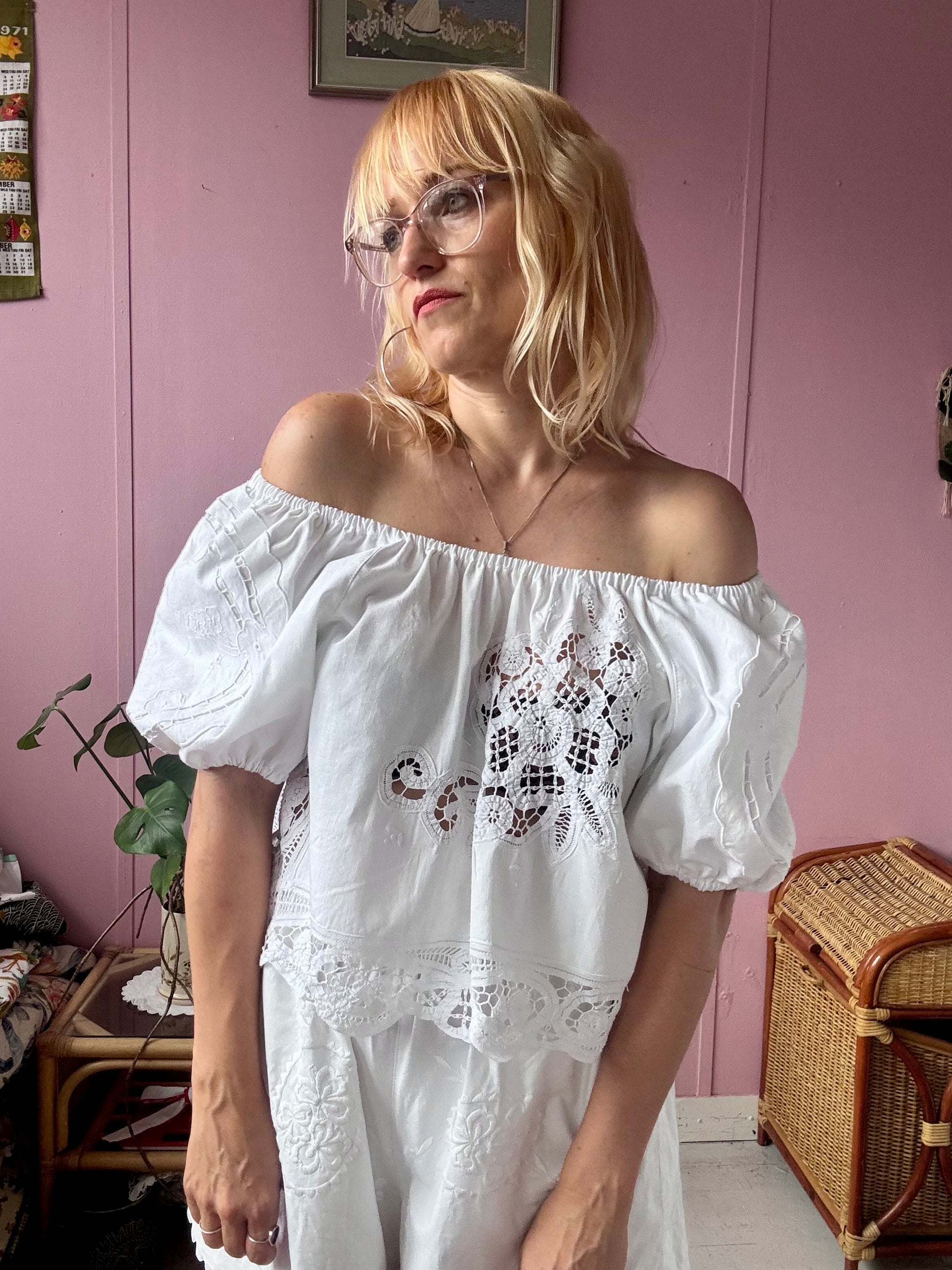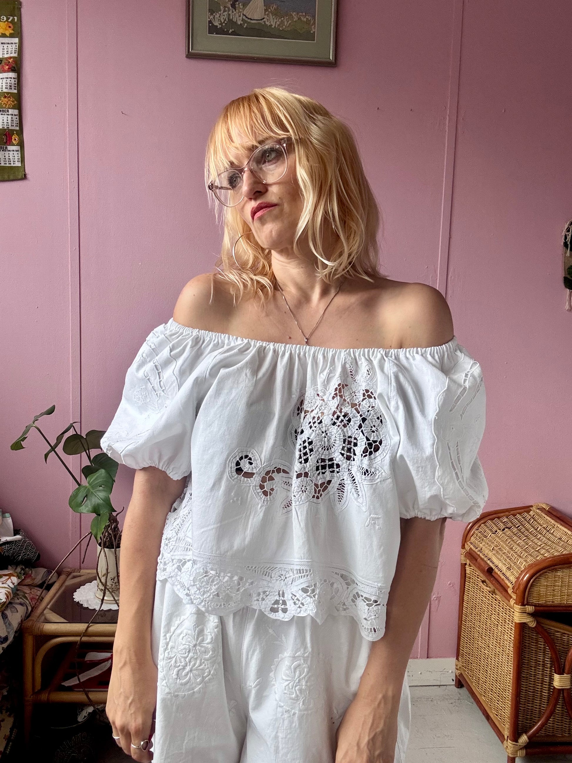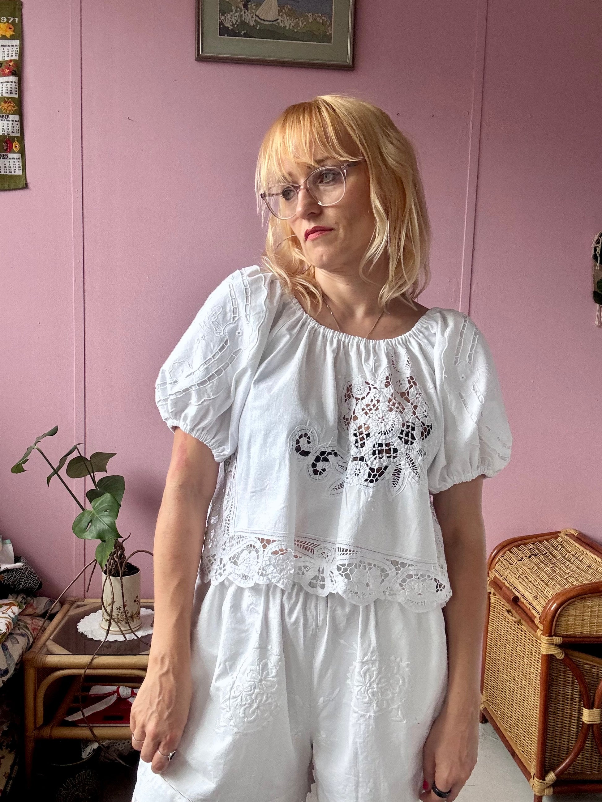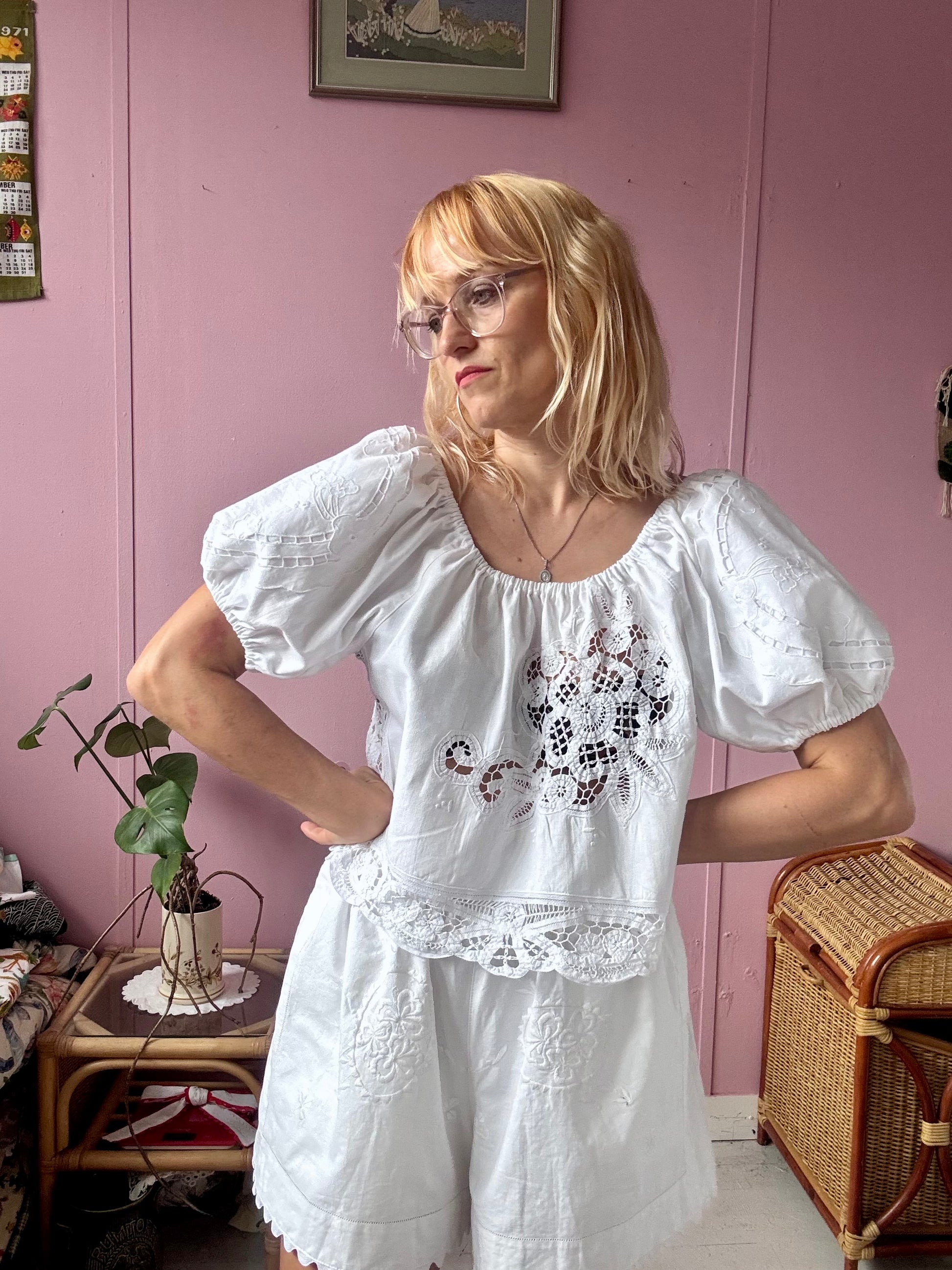 Cute little summer top made from vintage tablecloth with floral embroidery and lace on side,hemline and front