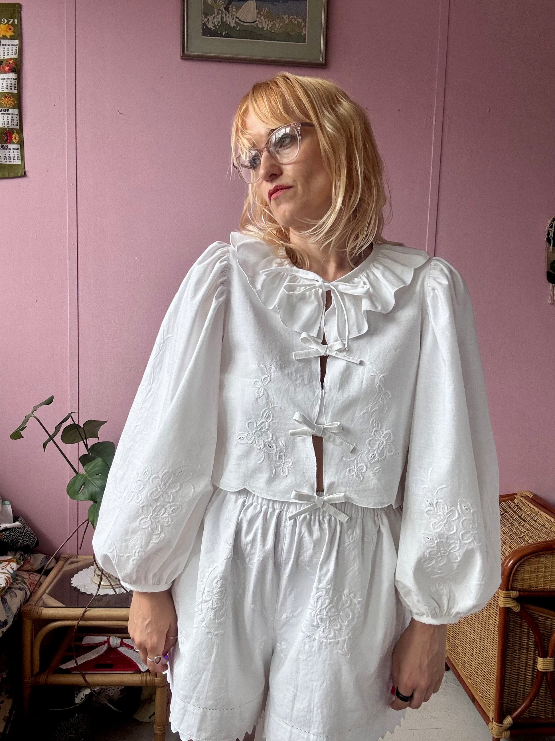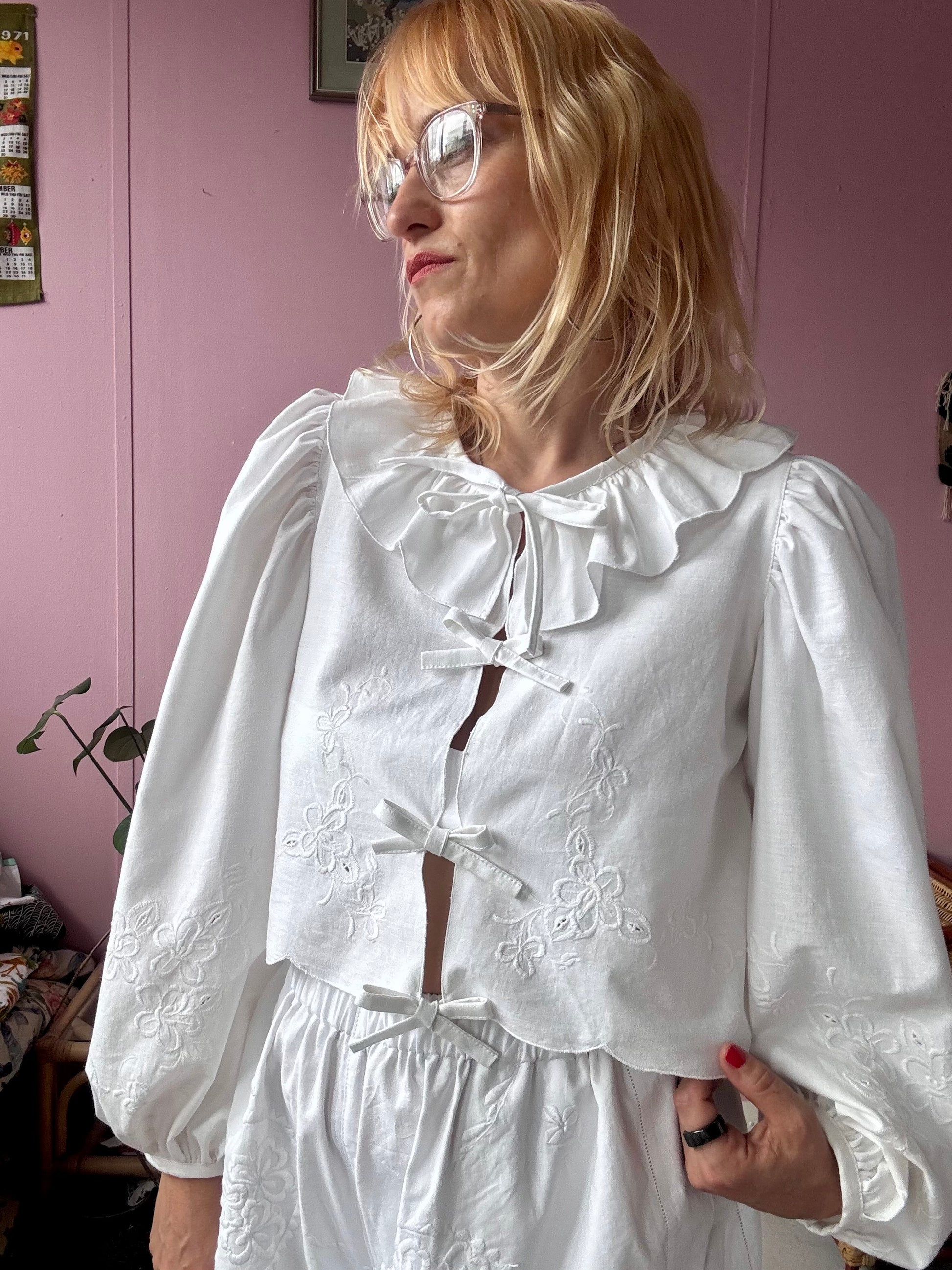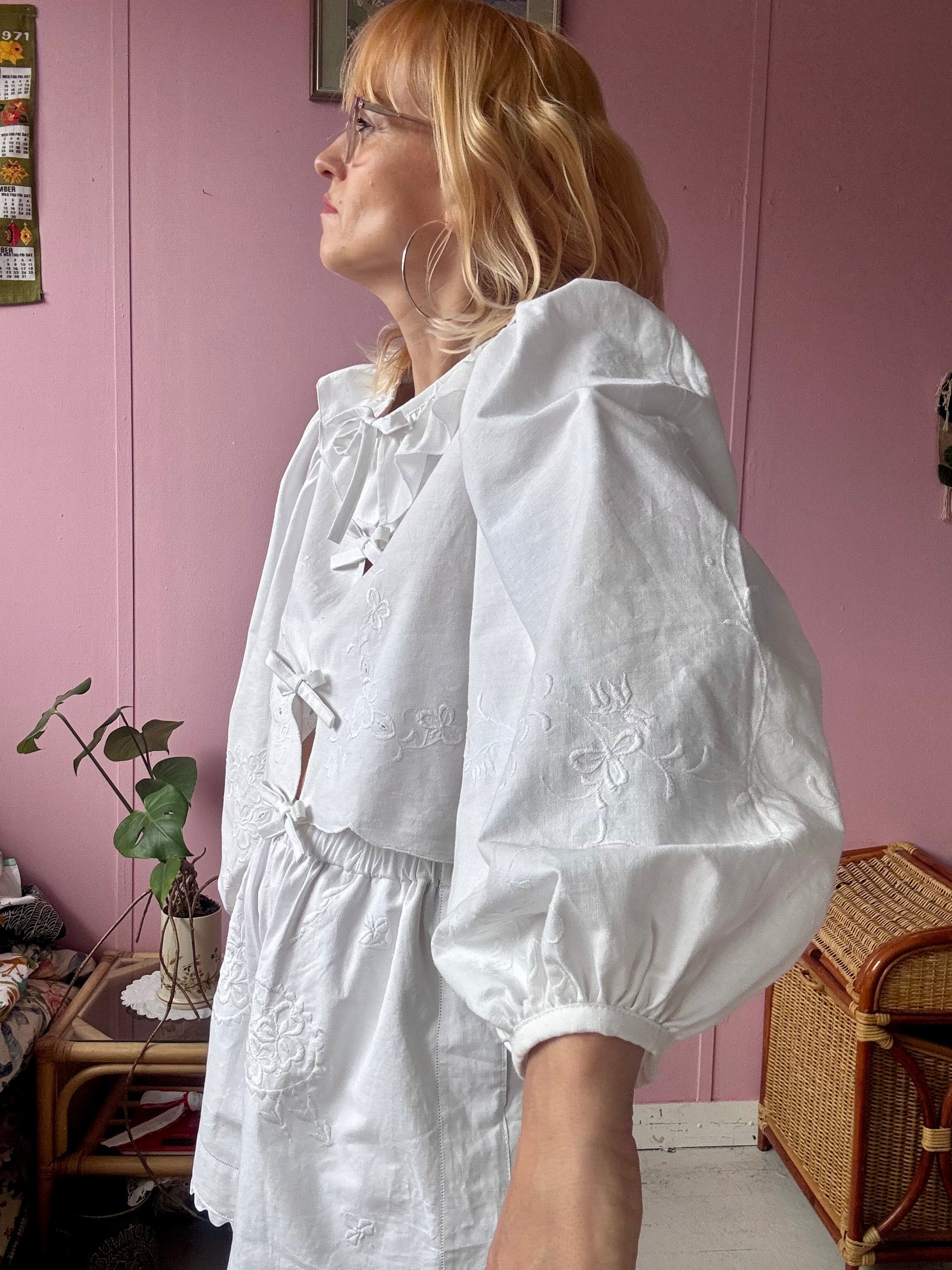 White blouse made from vintage tablecloth with floral hand embroidery - cotton fabric
