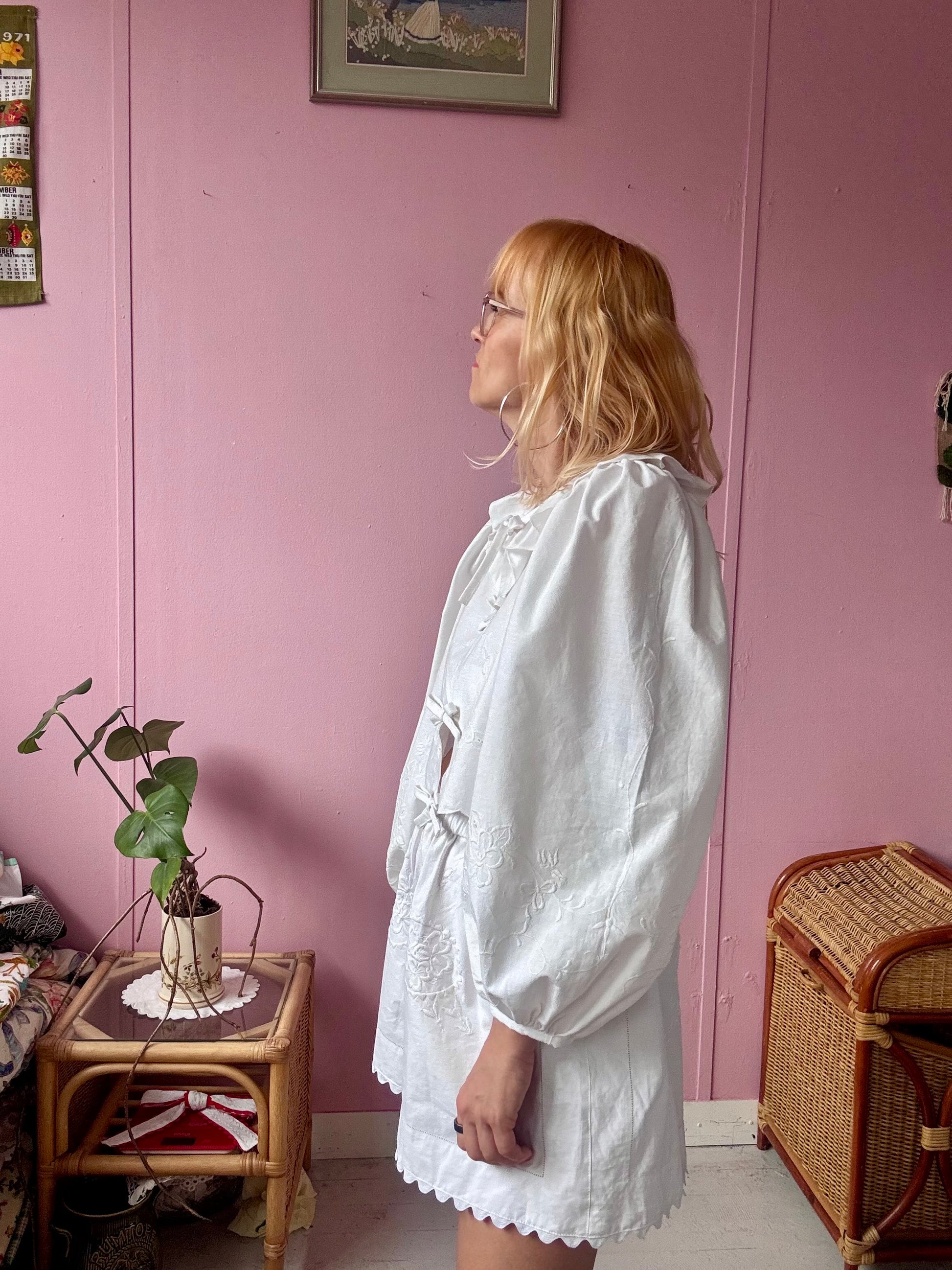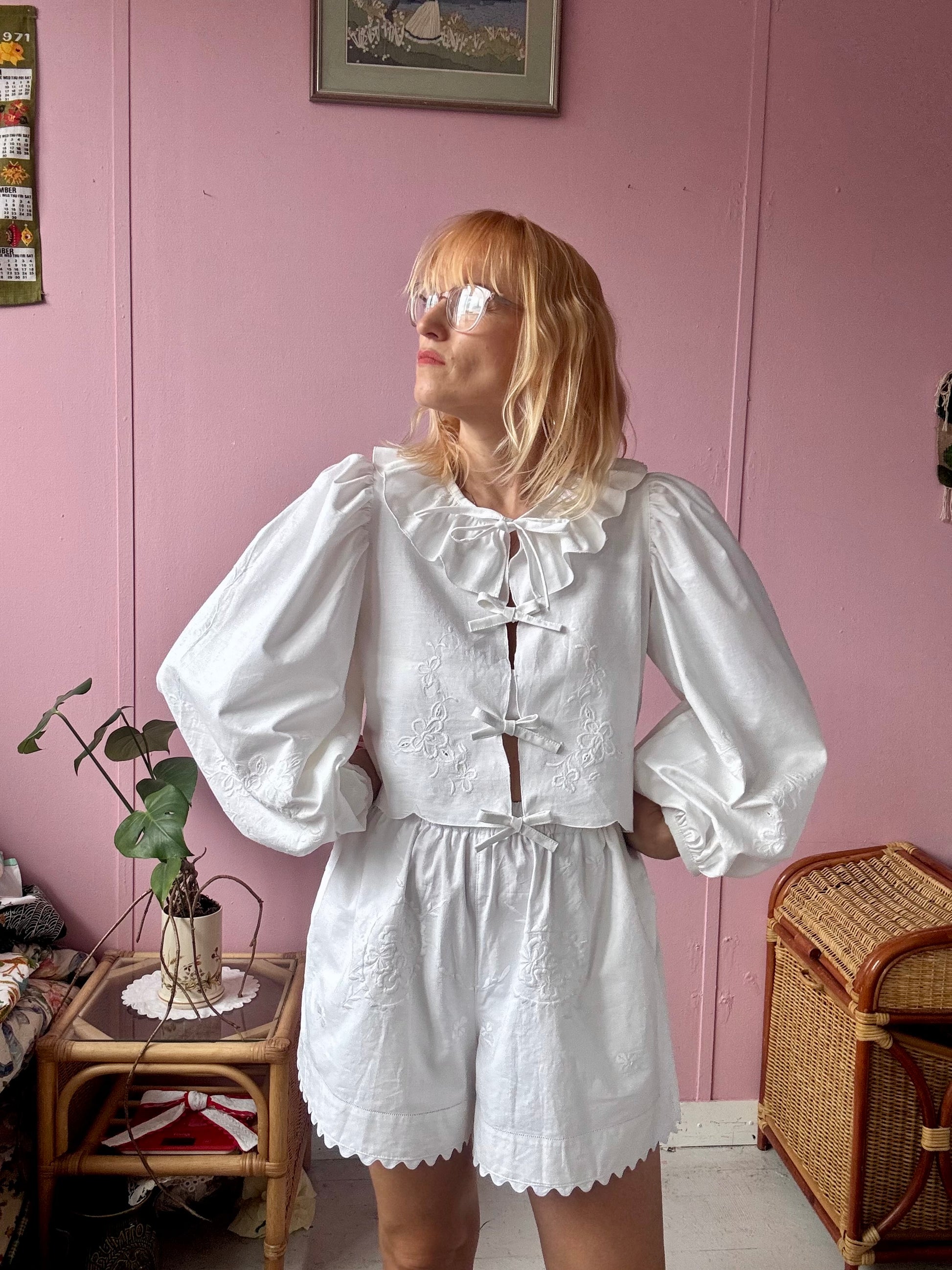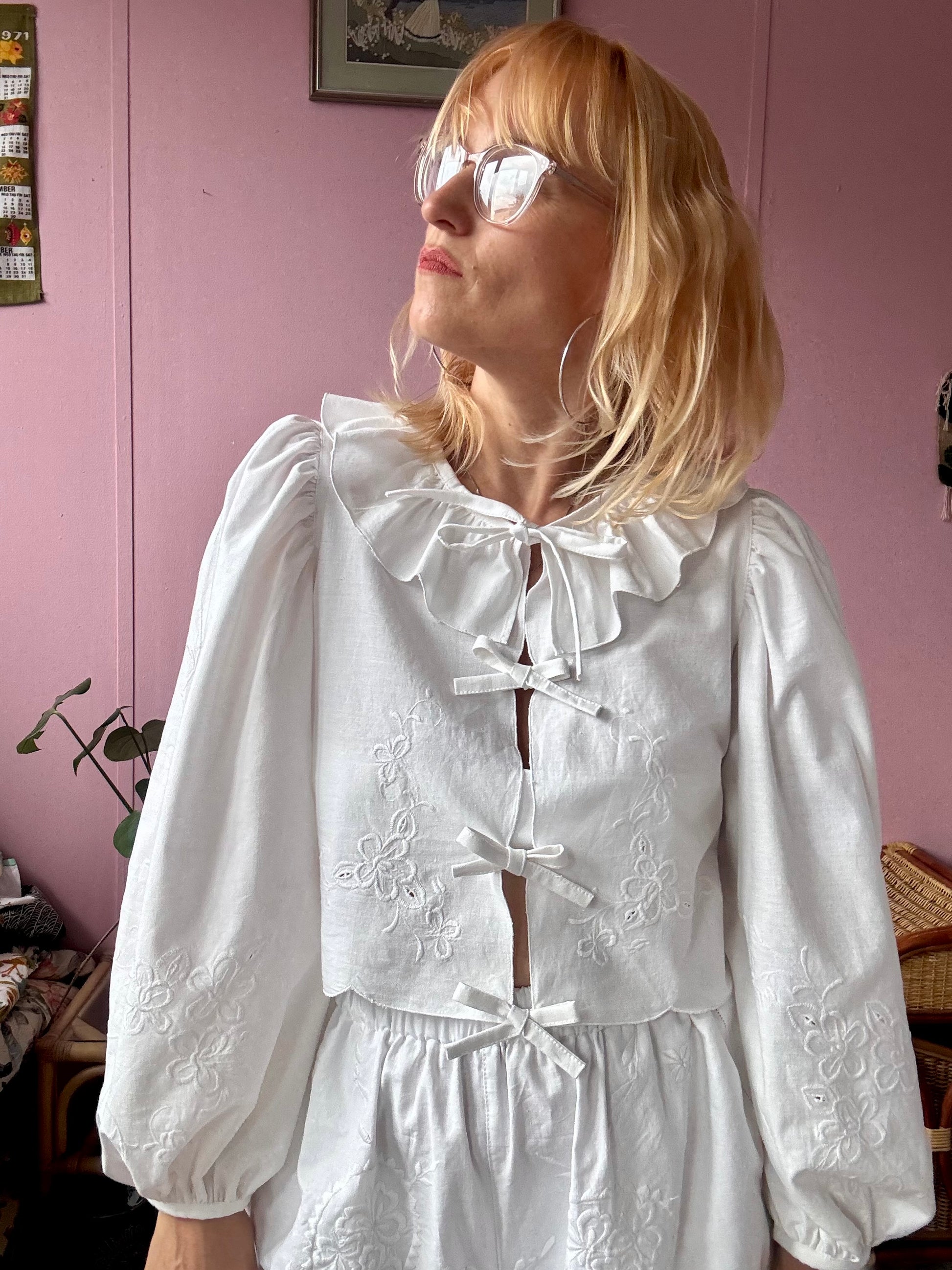 White blouse made from vintage tablecloth with floral hand embroidery - cotton fabric