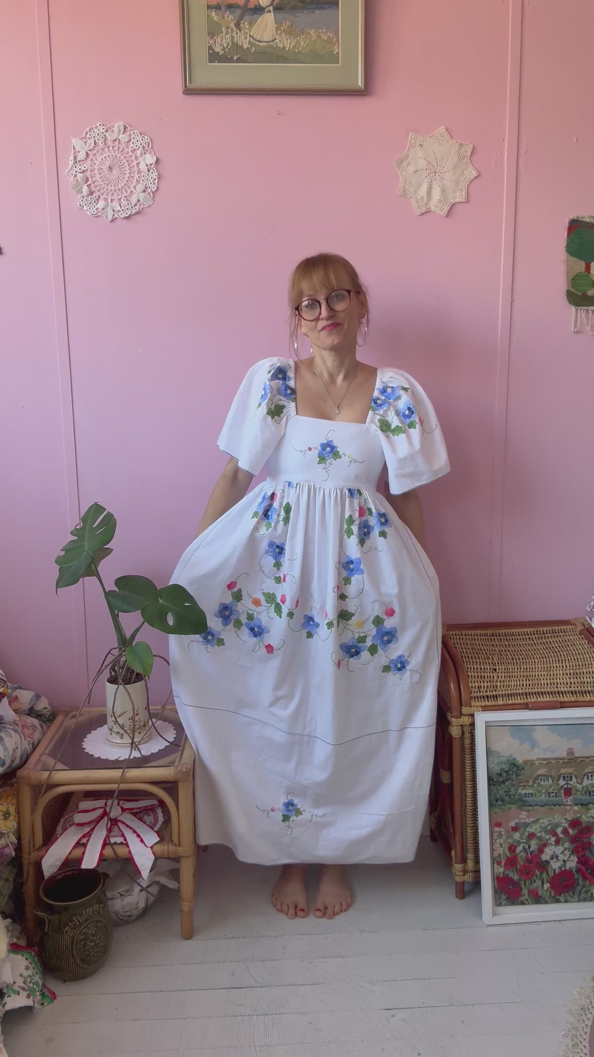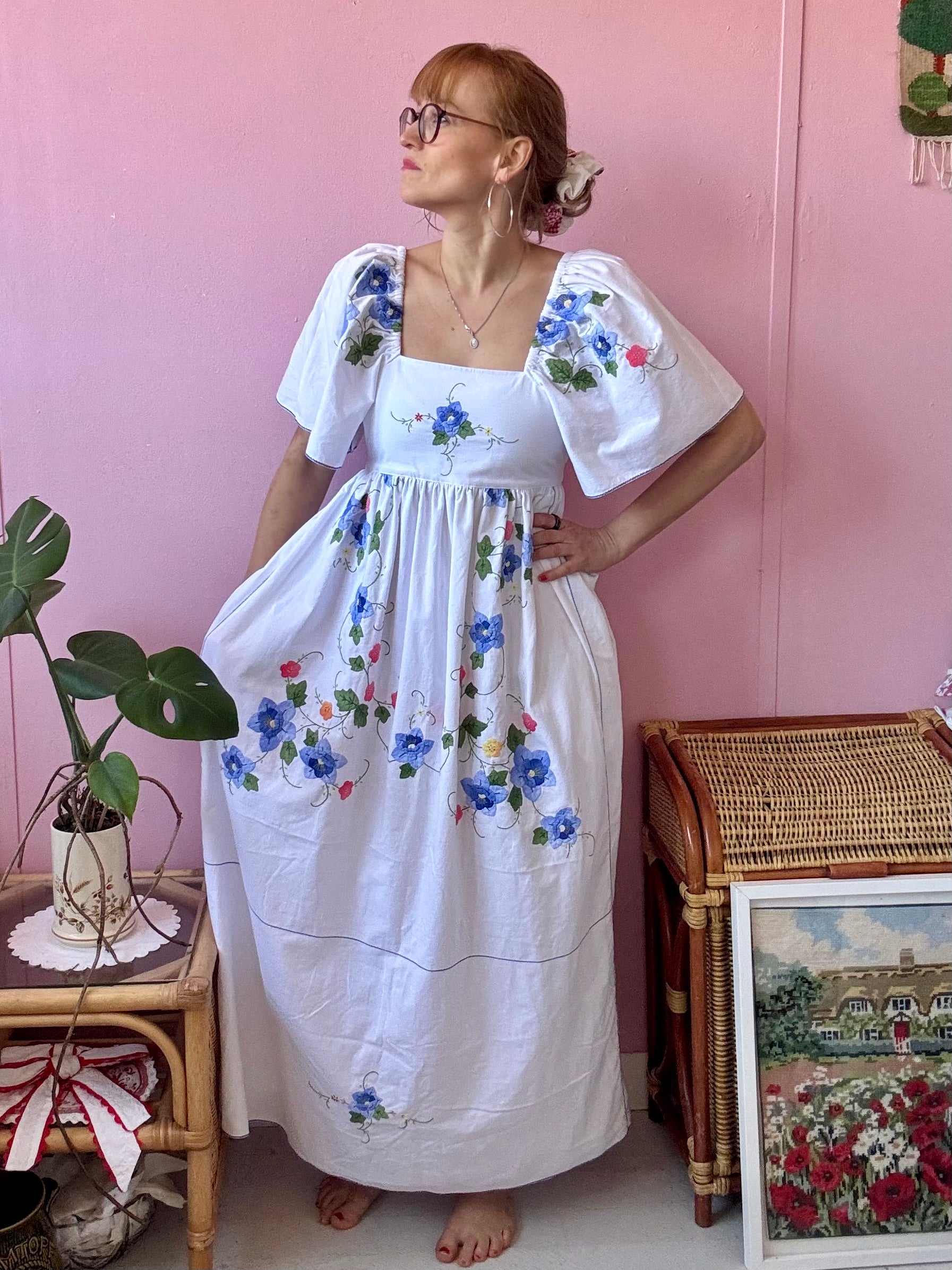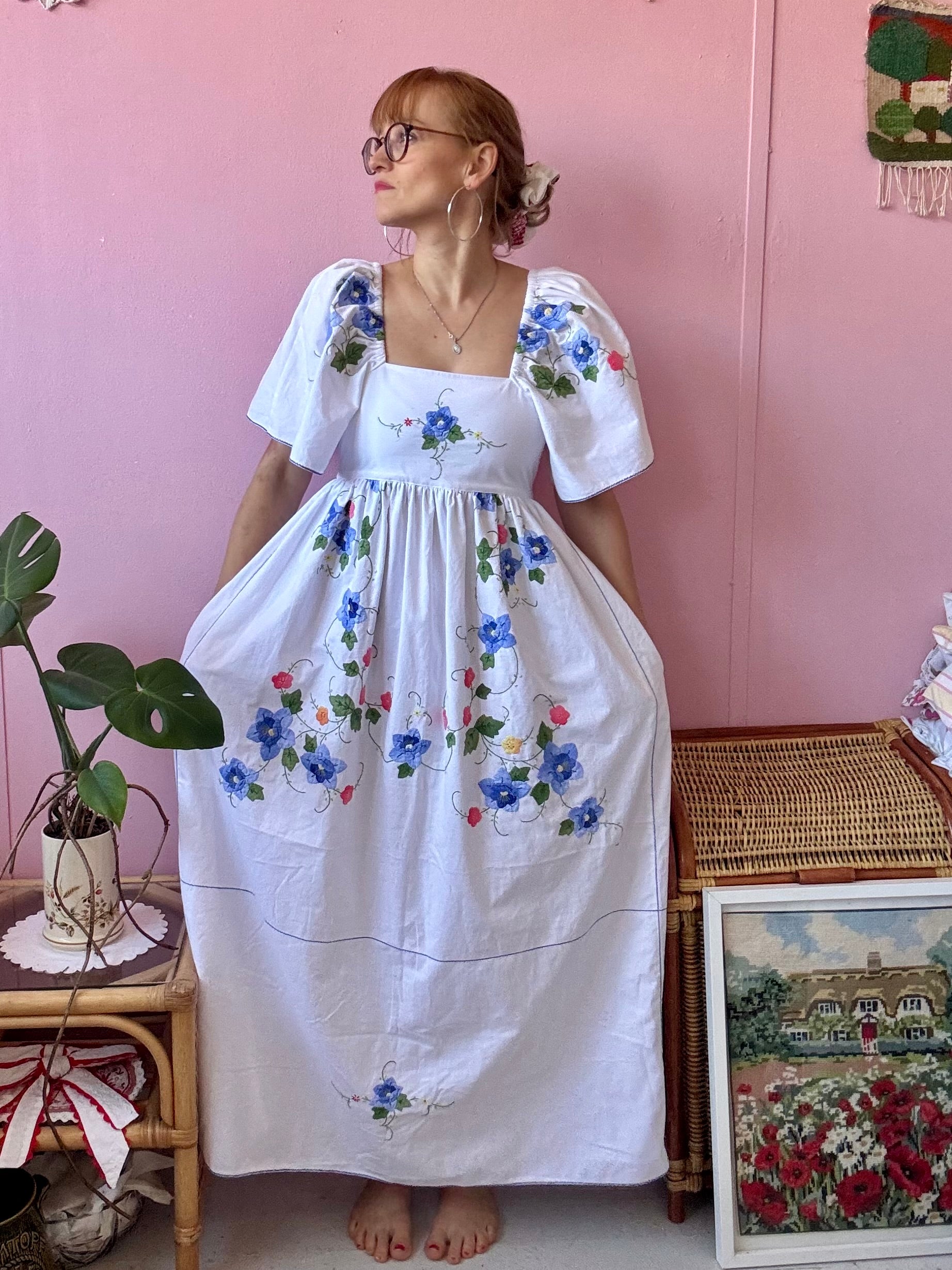 Maxi dress made from vintage tablecloth with hand embroidery-blue floral appliqués