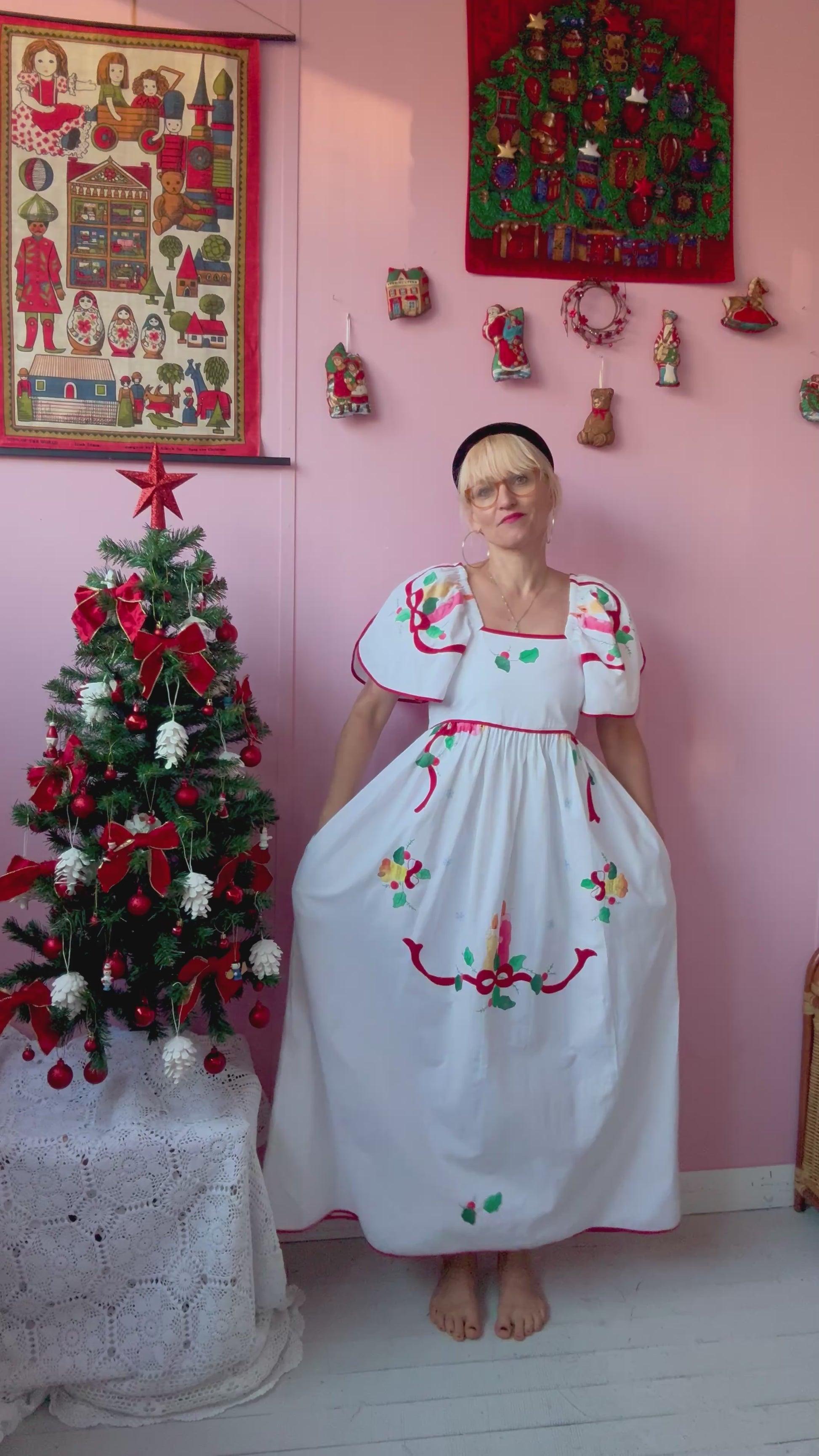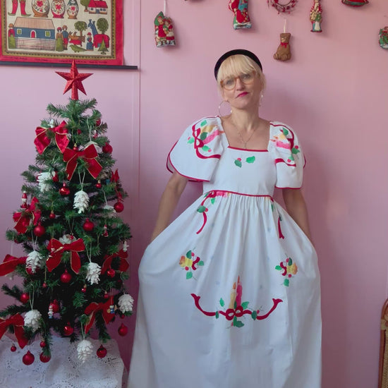 White cotton maxi dress made from vintage tablecloth with Christmas themed embroidery and appliqués