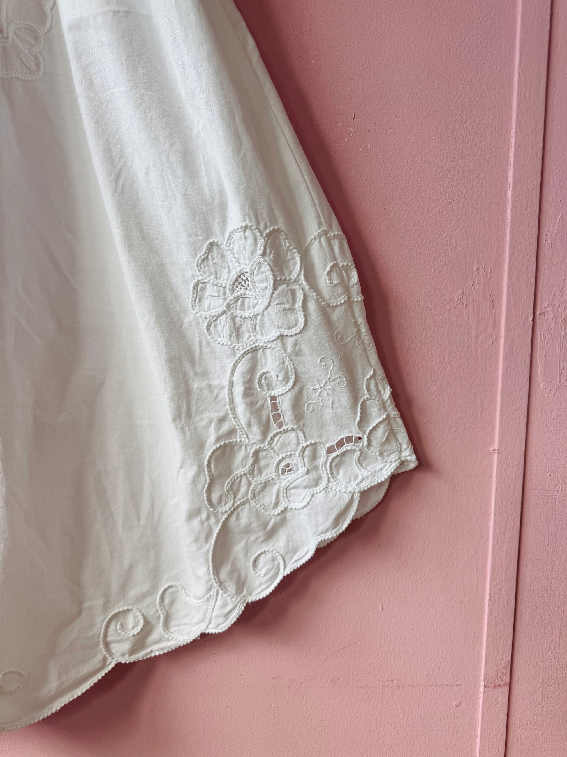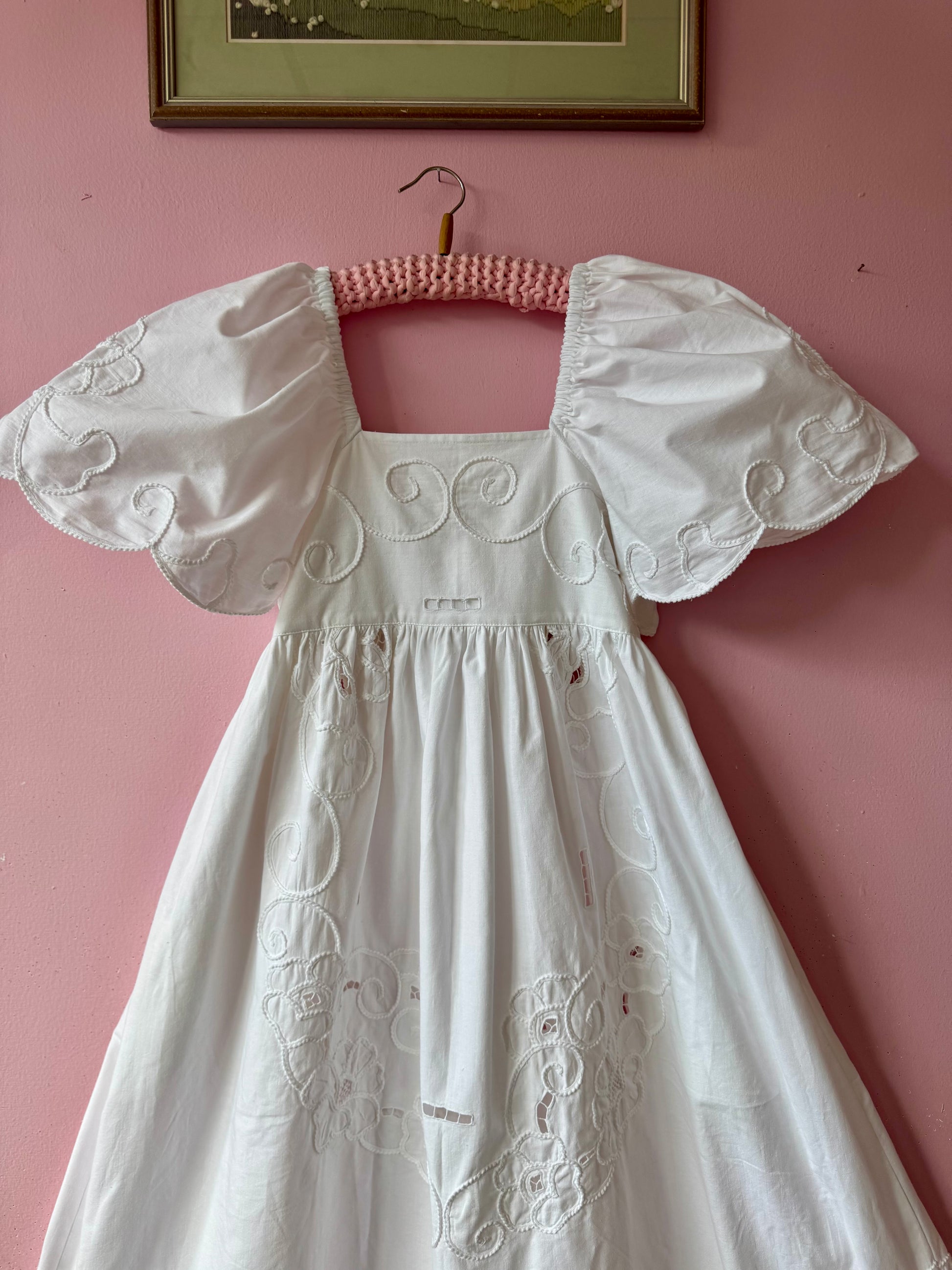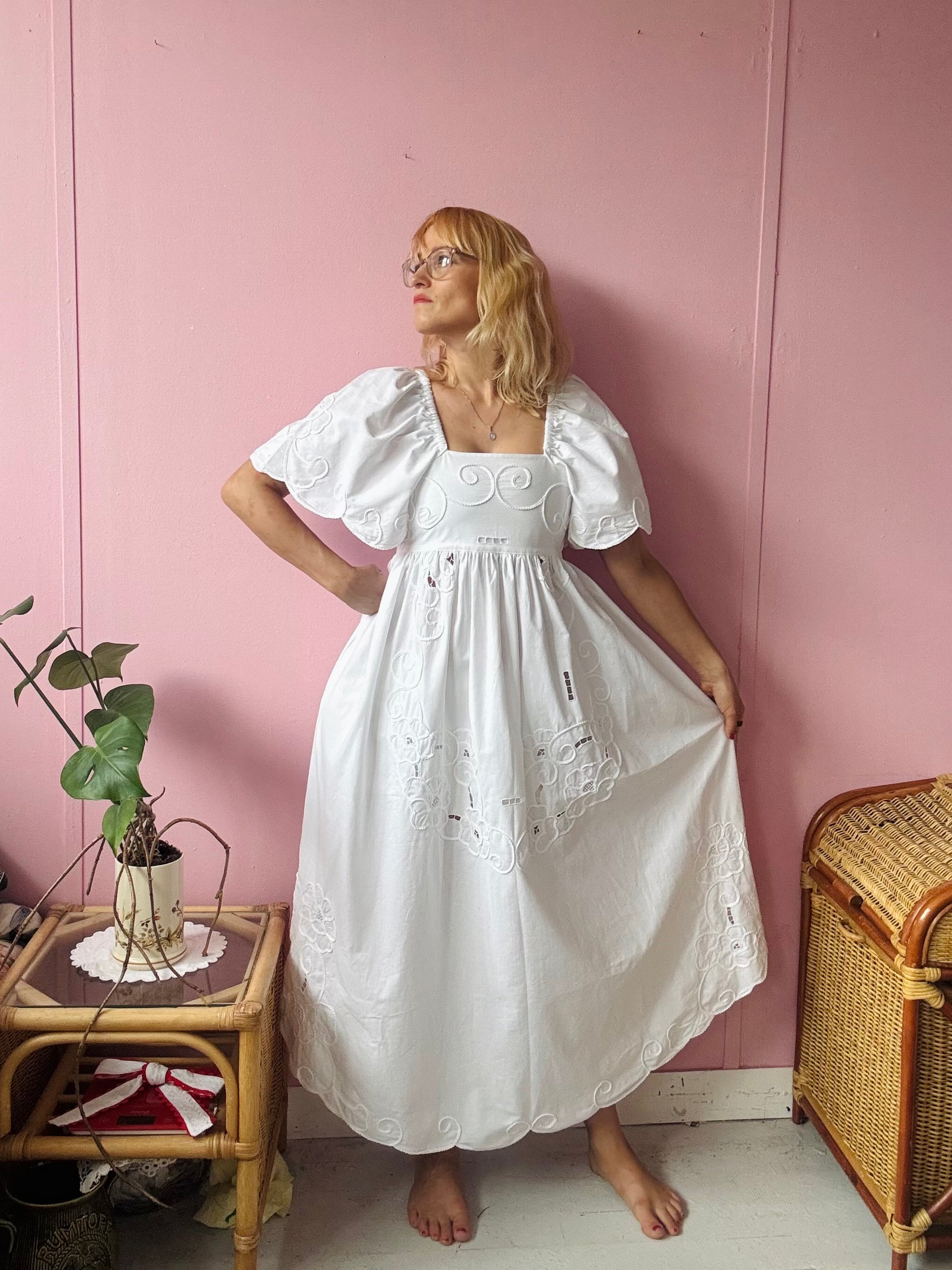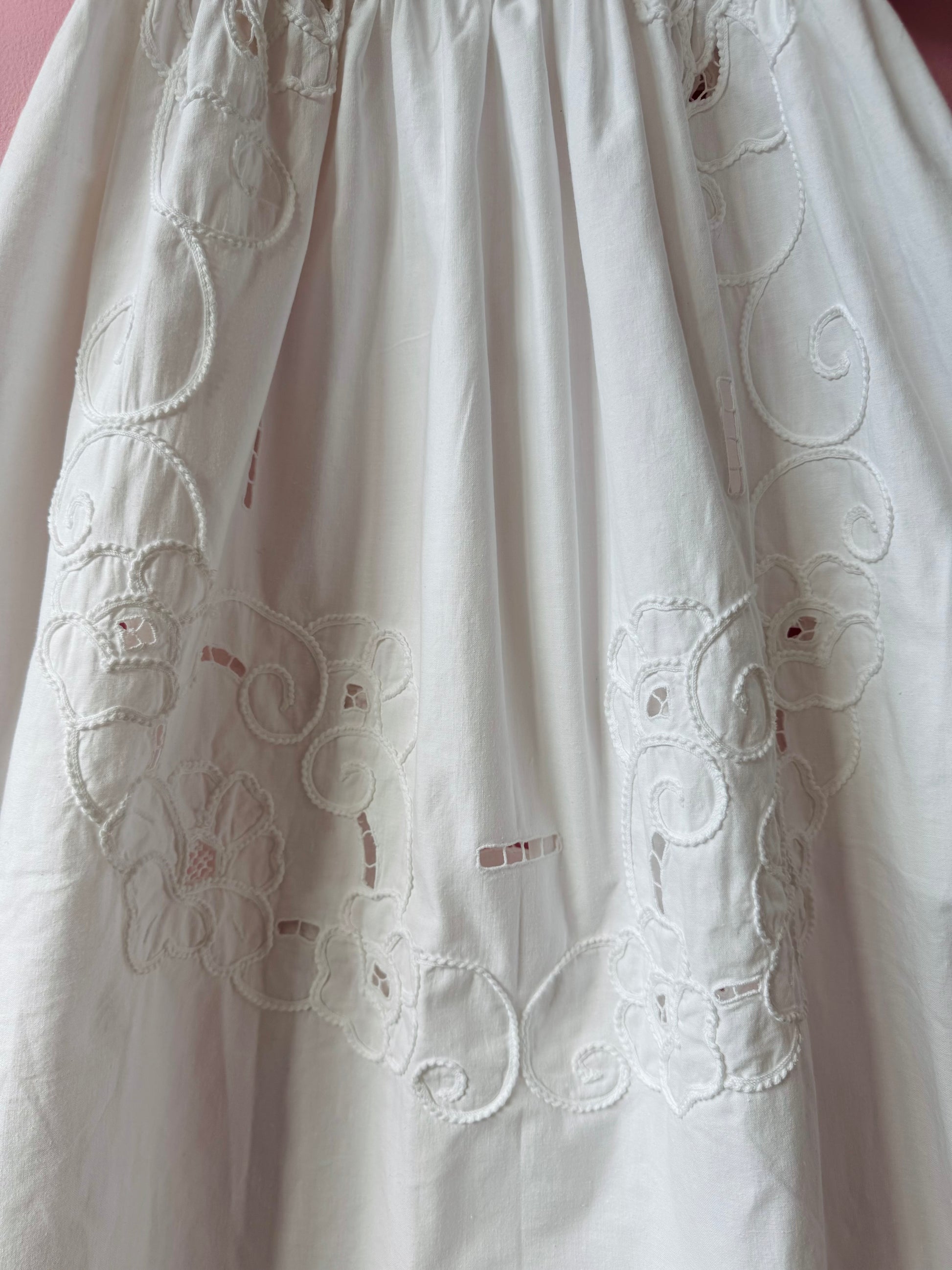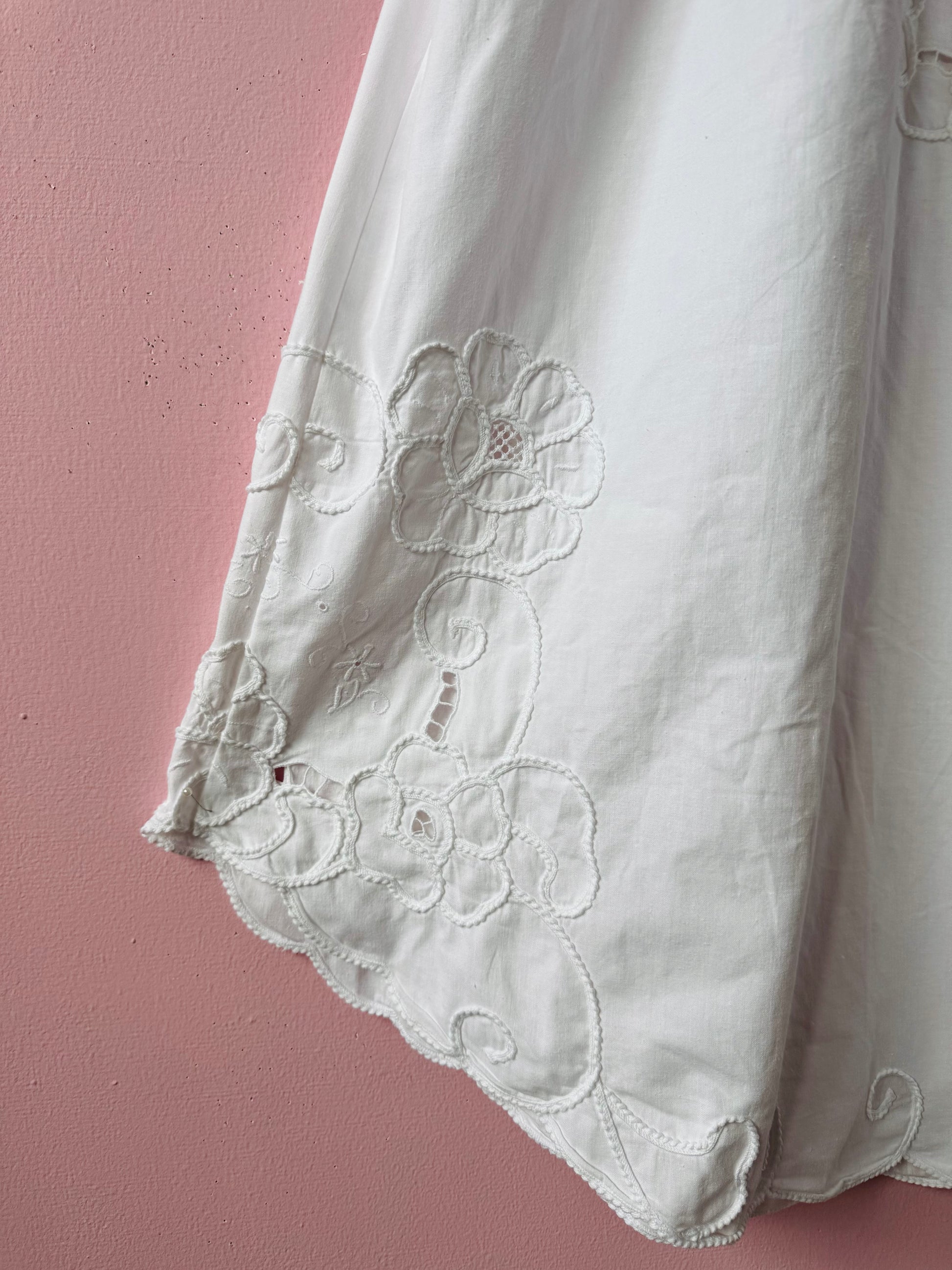 White cotton maxi dress made from vintage tablecloth with floral hand embroidery and scalloped edges -same as embroidery parts