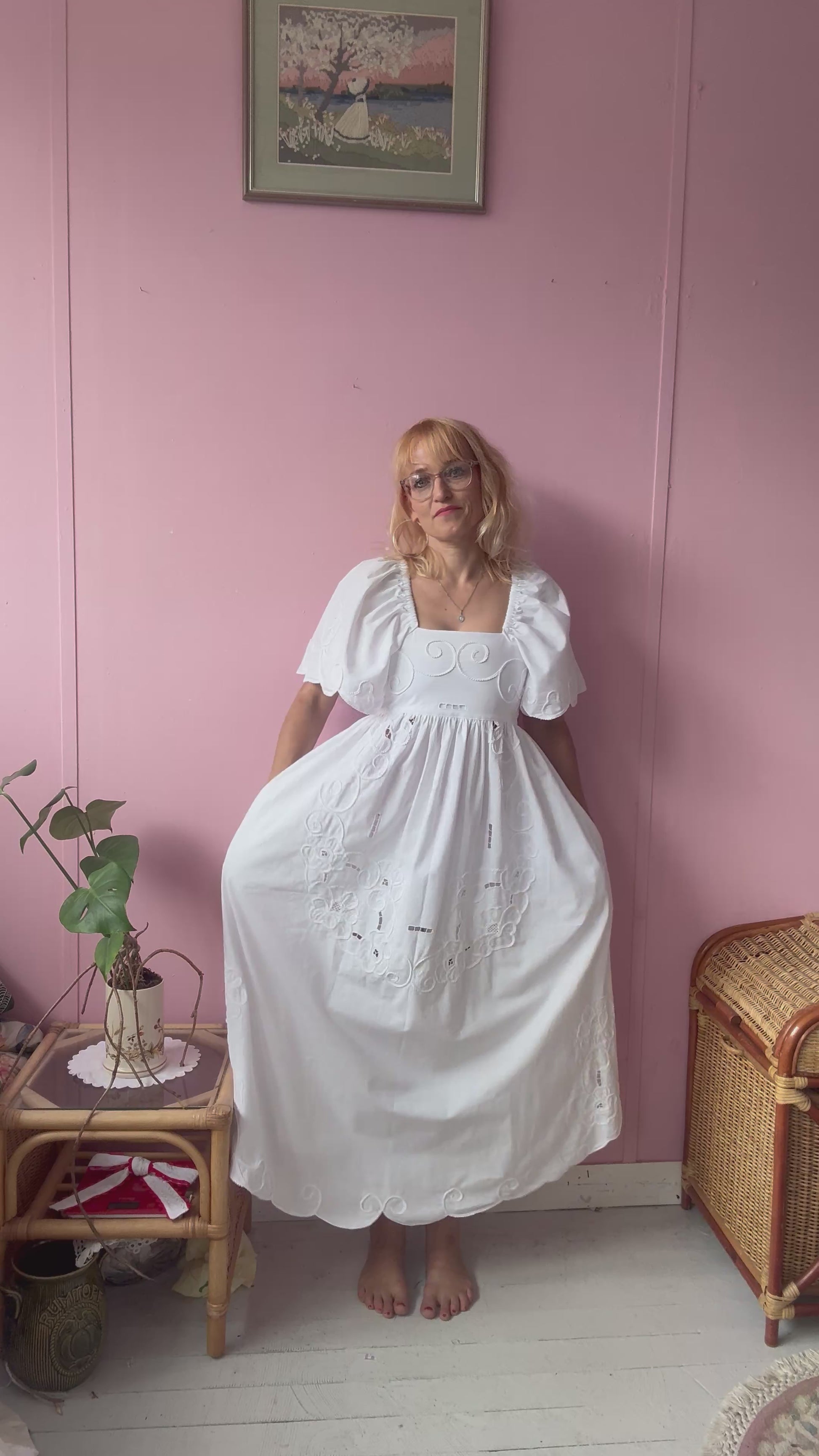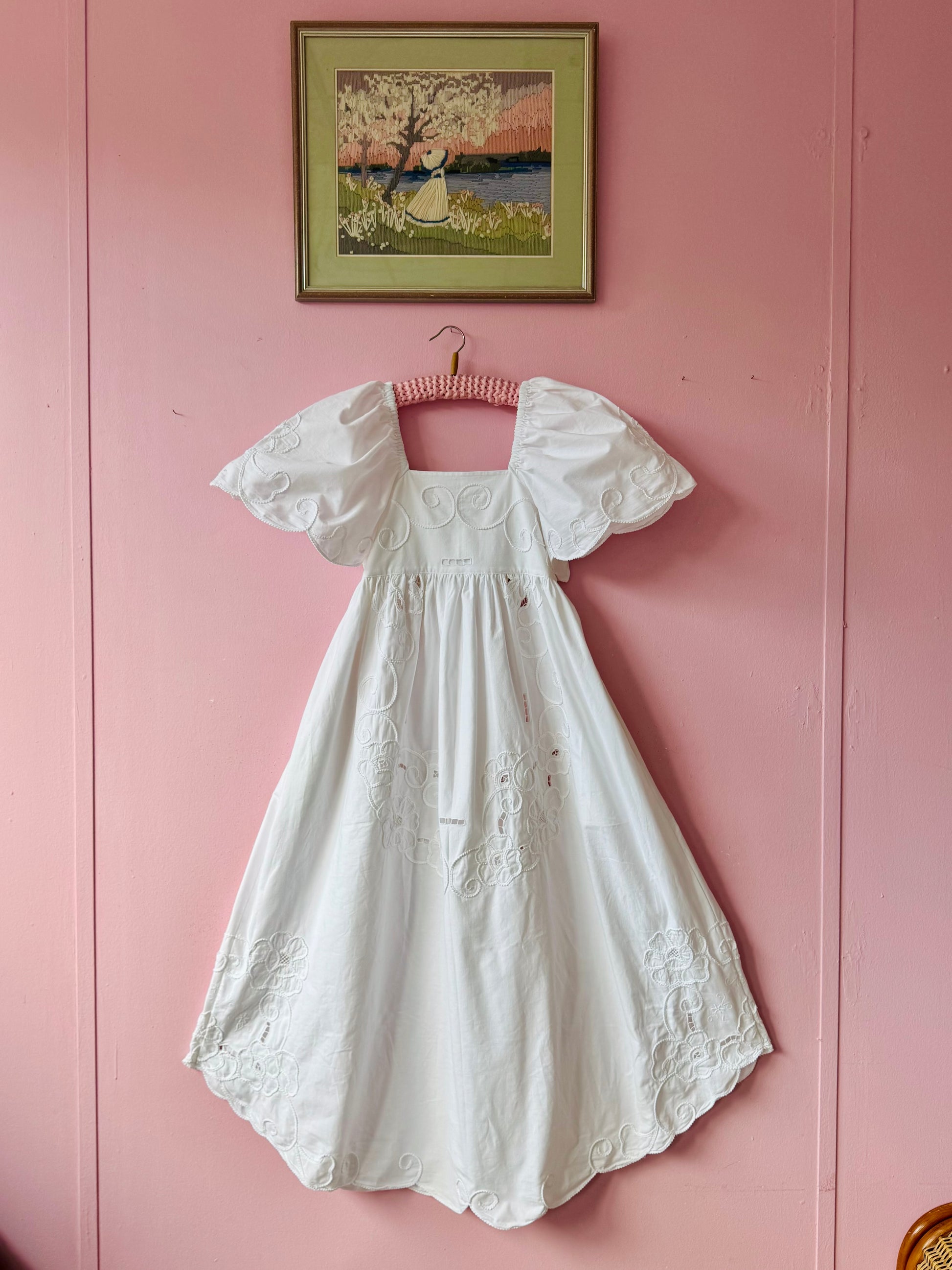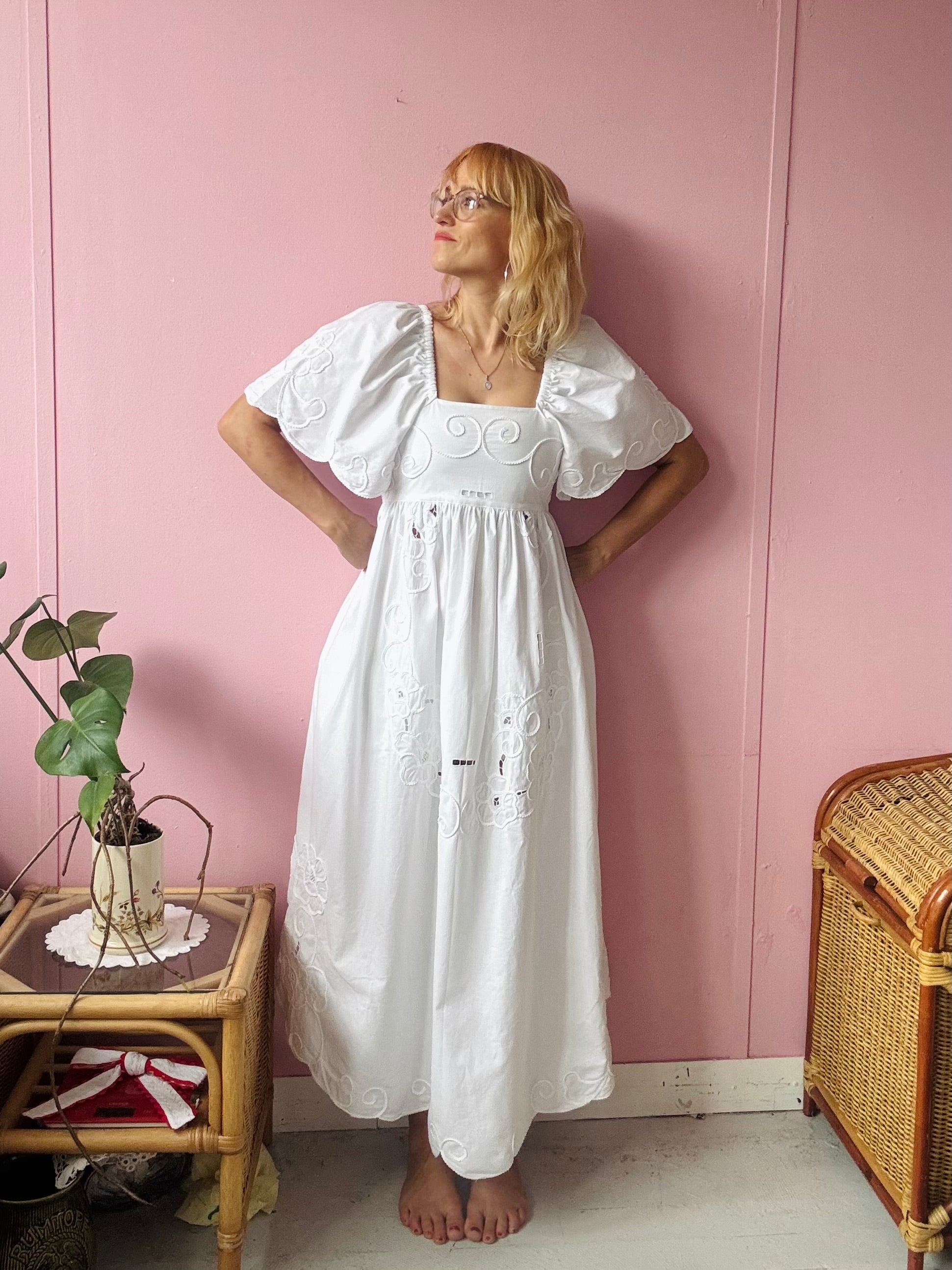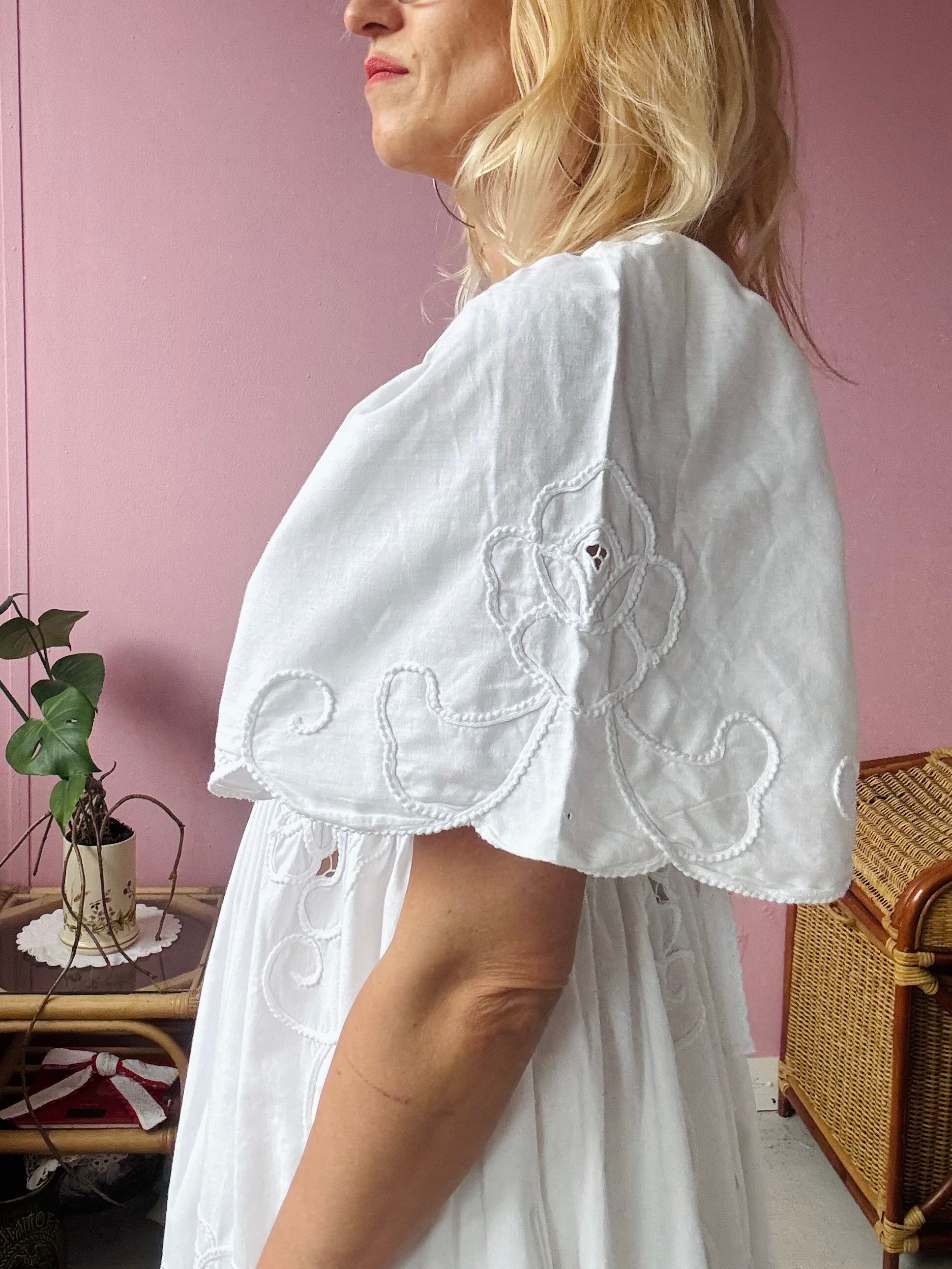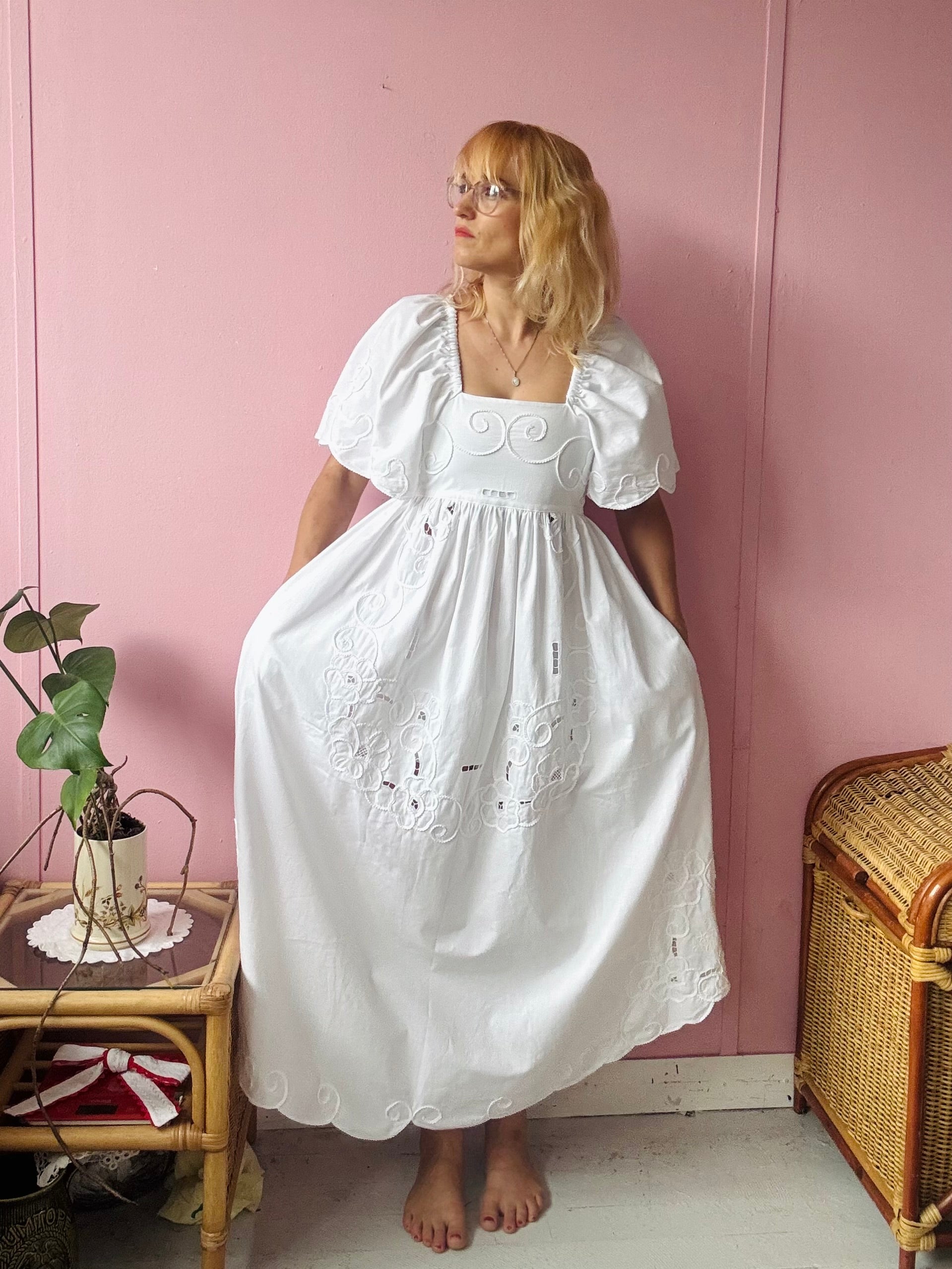 White cotton maxi dress made from vintage tablecloth with floral hand embroidery and scalloped edges -same as embroidery parts