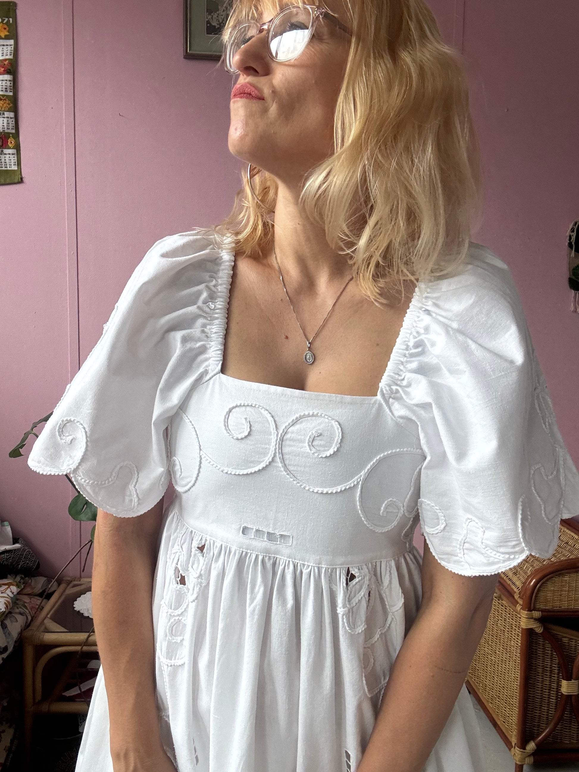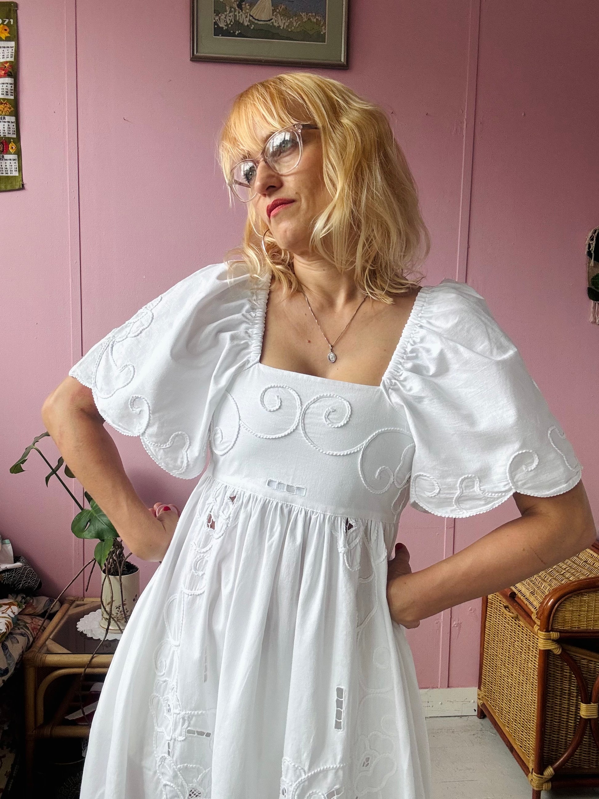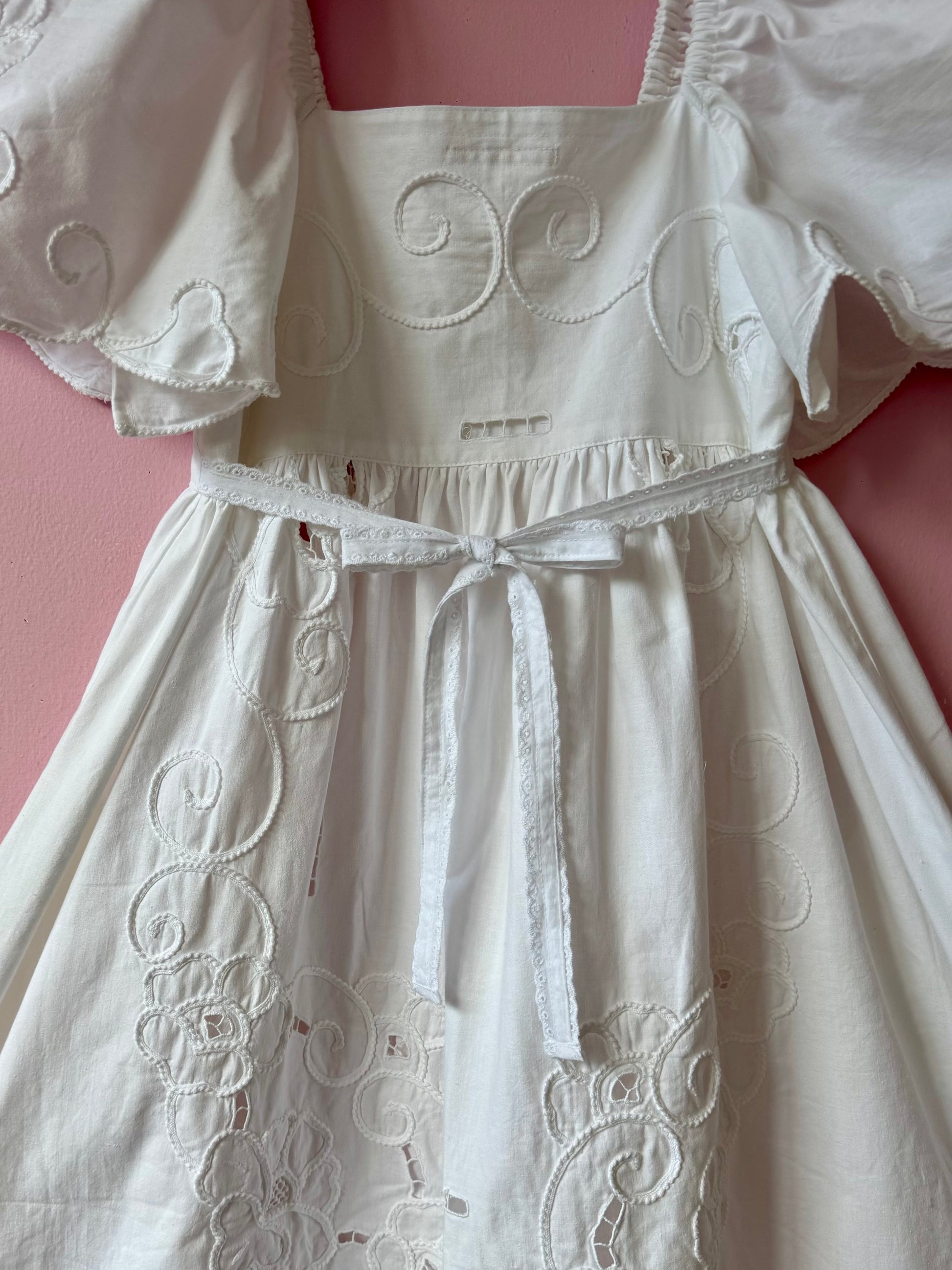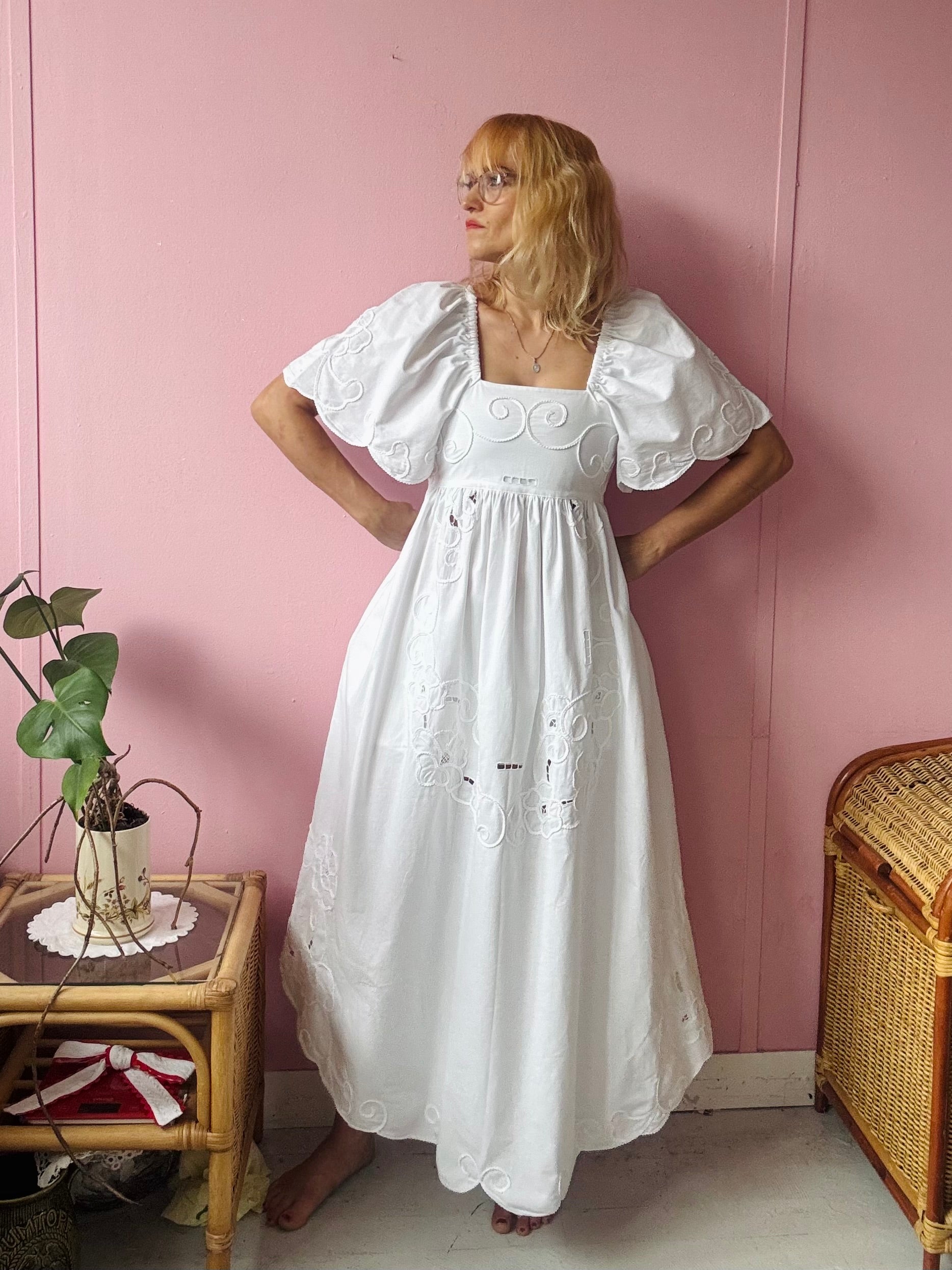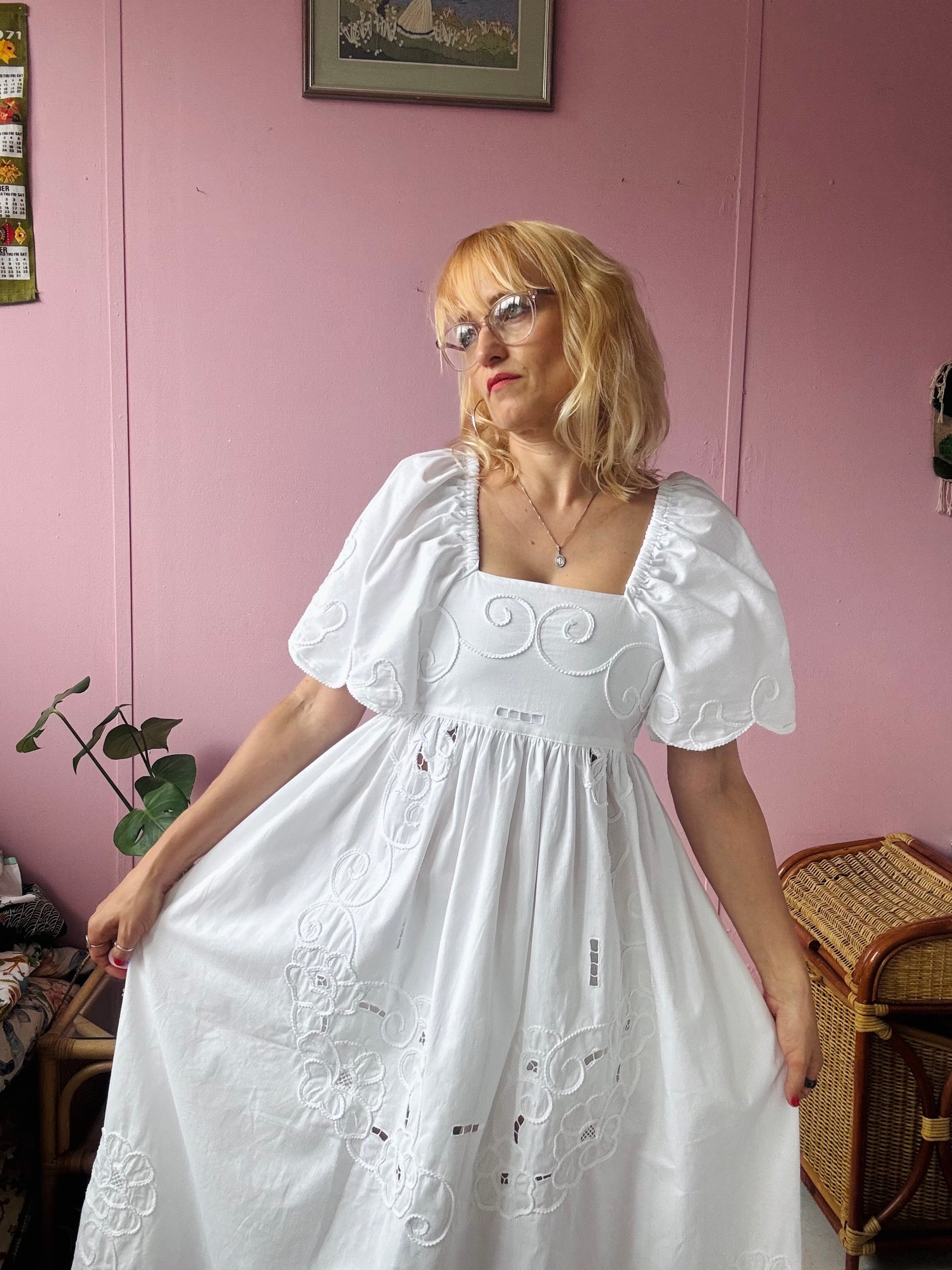 White cotton maxi dress made from vintage tablecloth with floral hand embroidery and scalloped edges -same as embroidery parts