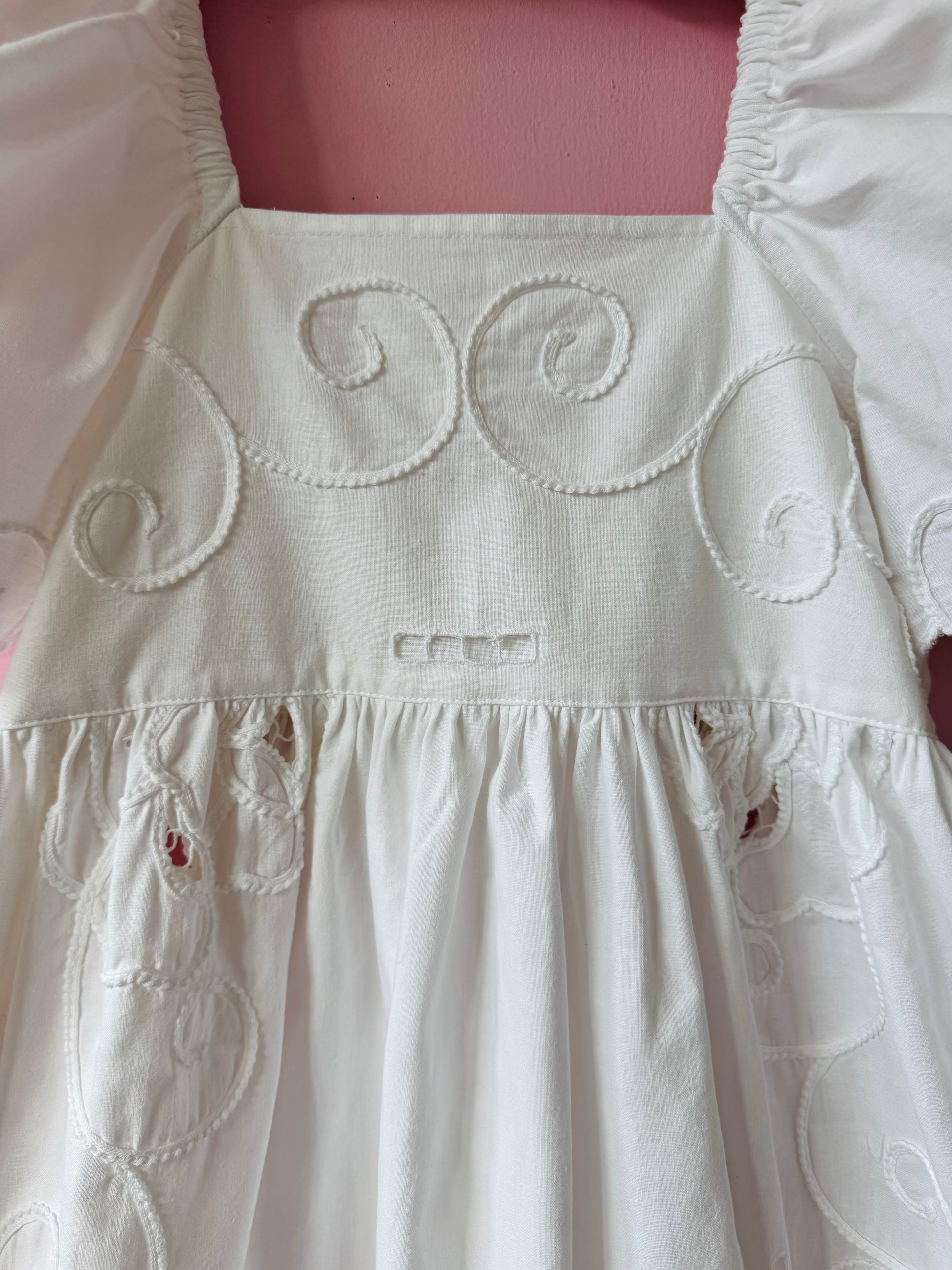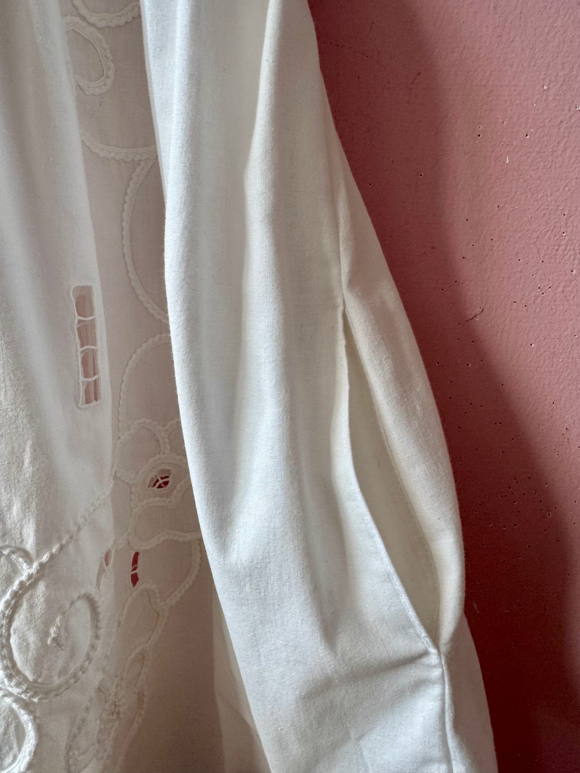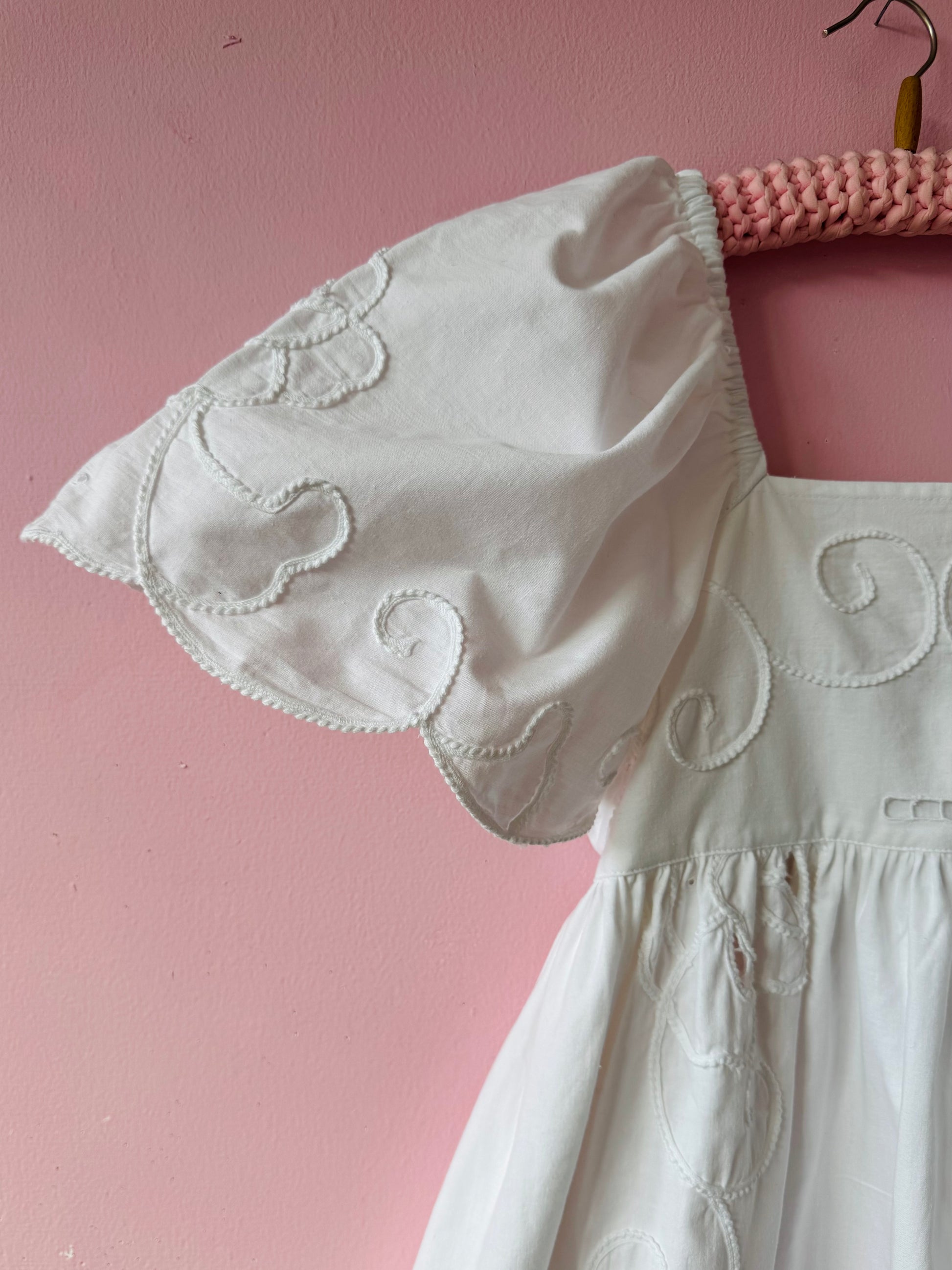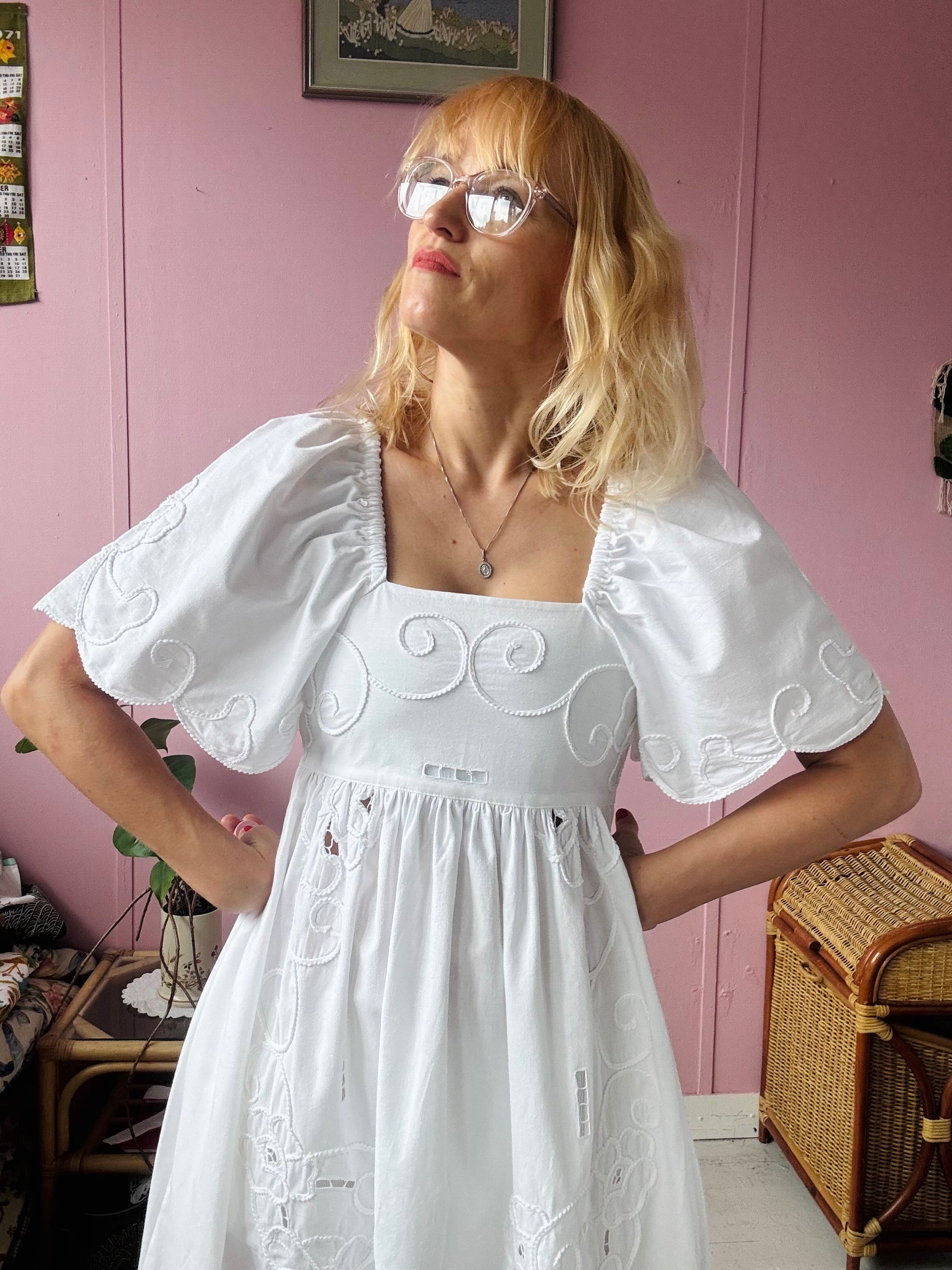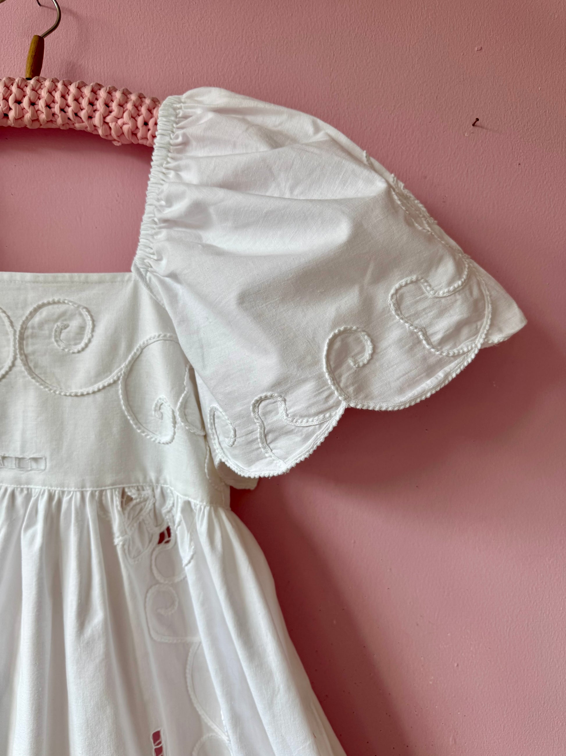 White cotton maxi dress made from vintage tablecloth with floral hand embroidery and scalloped edges -same as embroidery parts