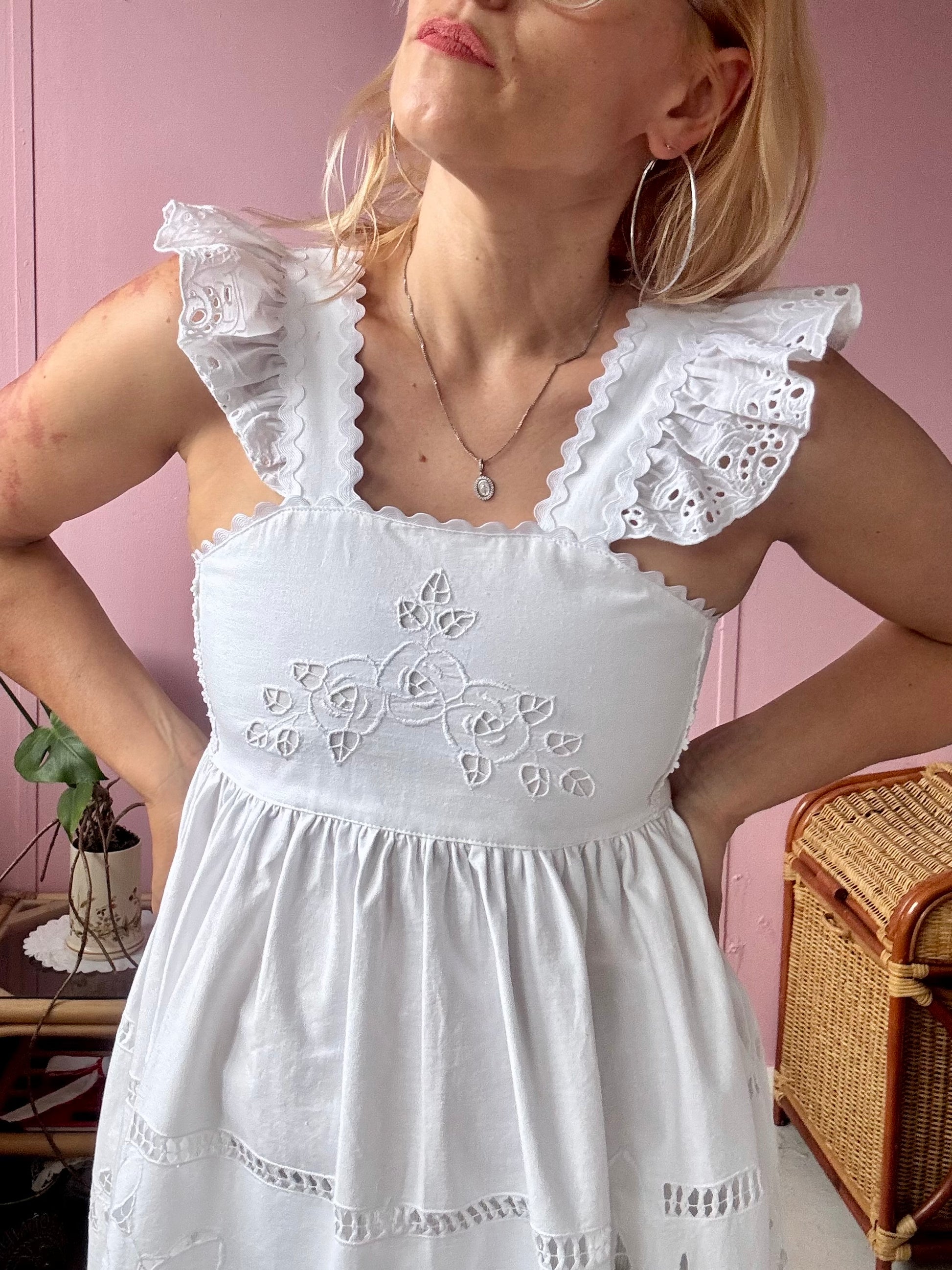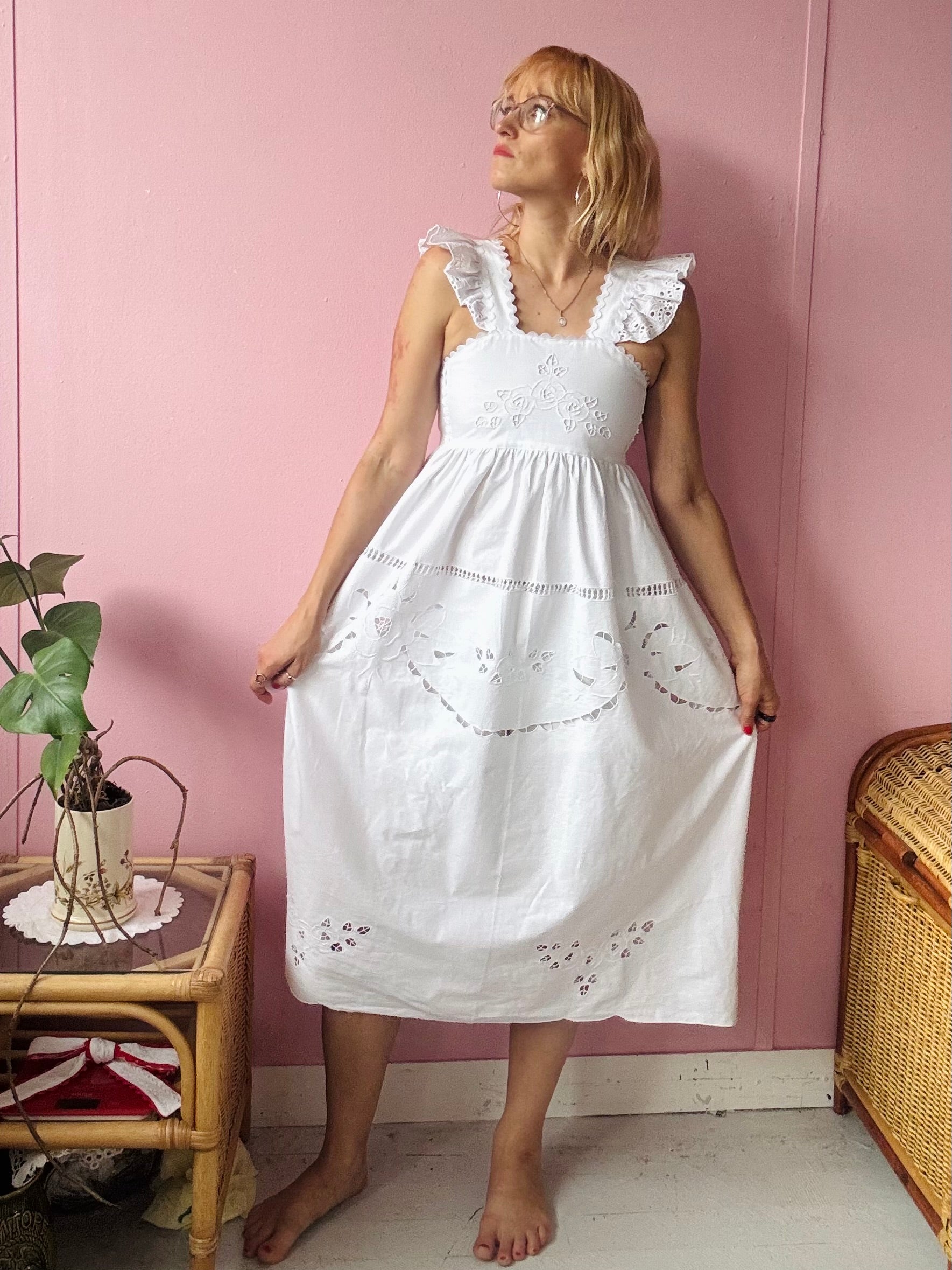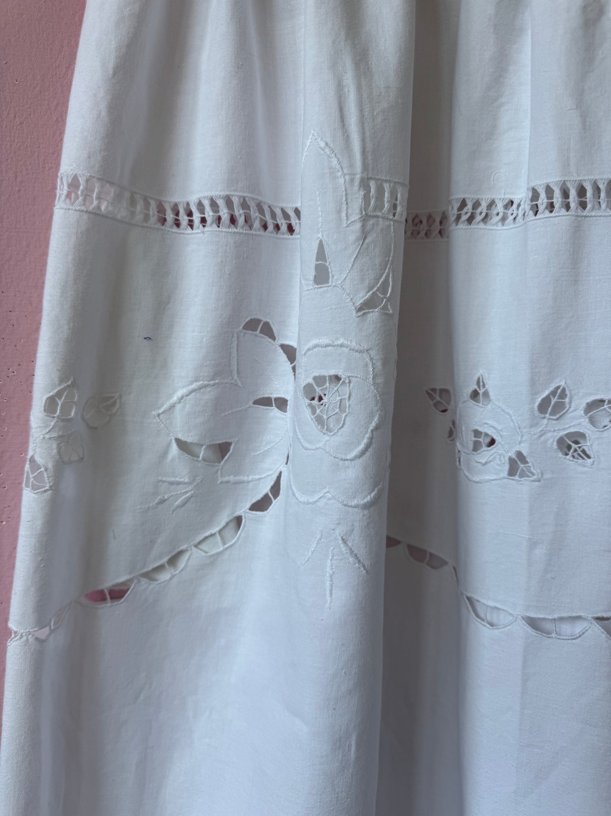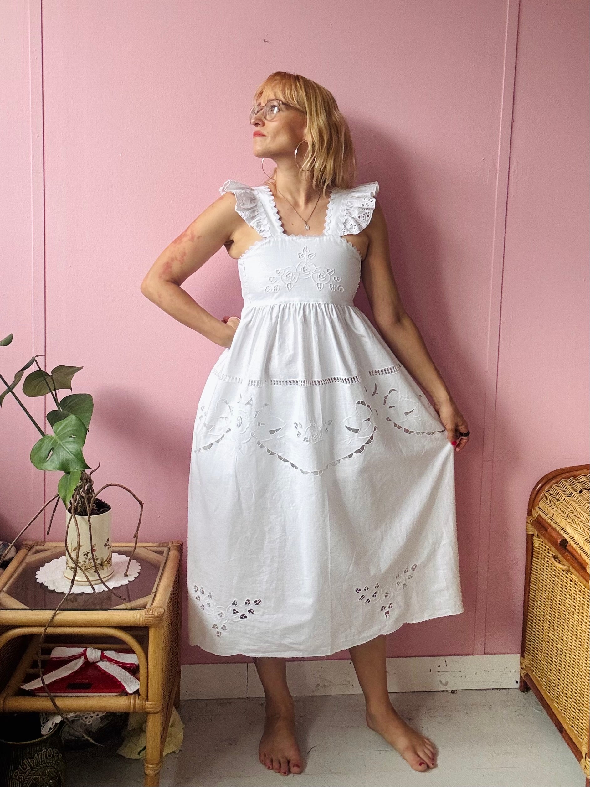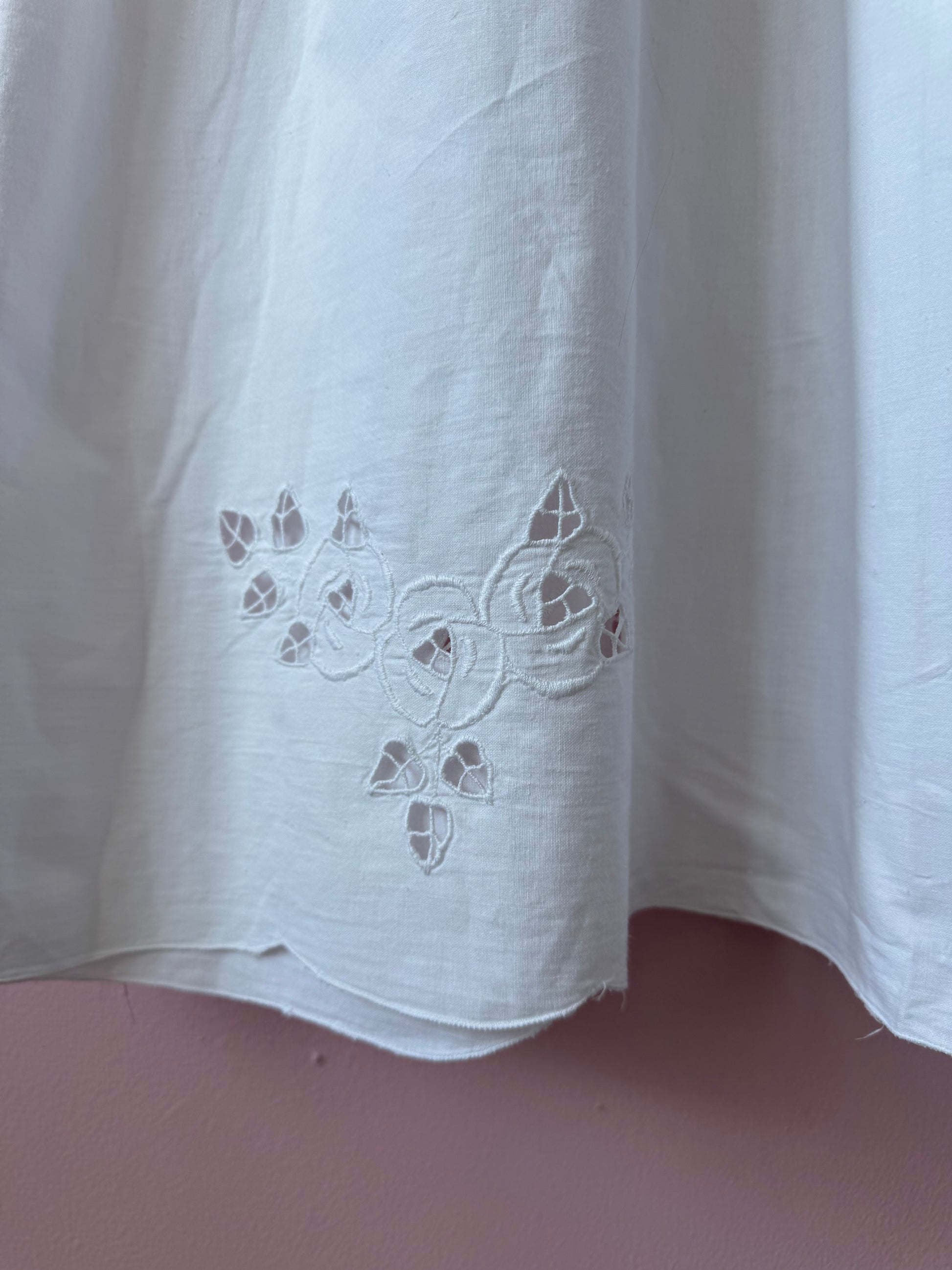White cotton midi dress made from vintage tablecloth with cut out floral embroidery