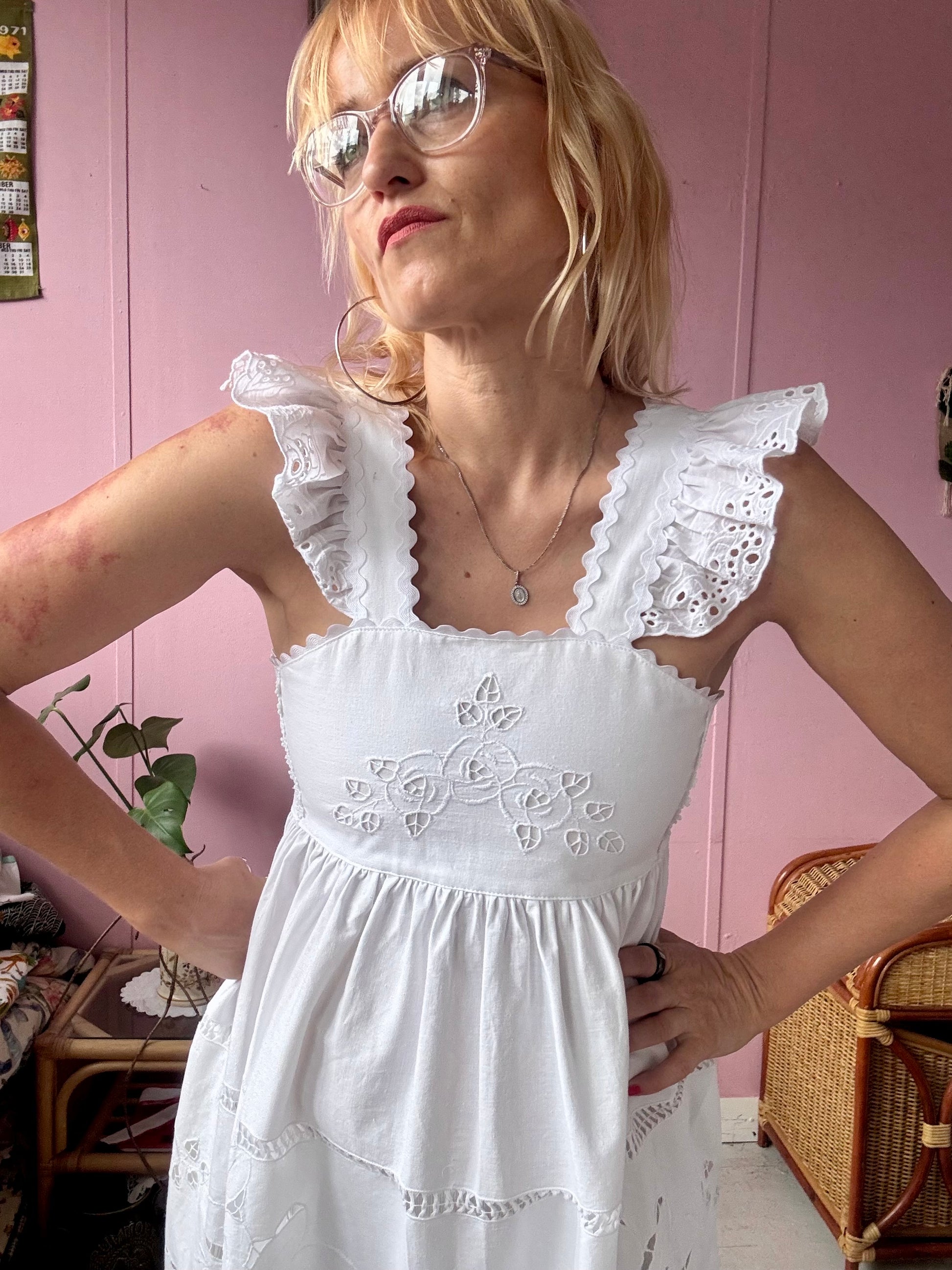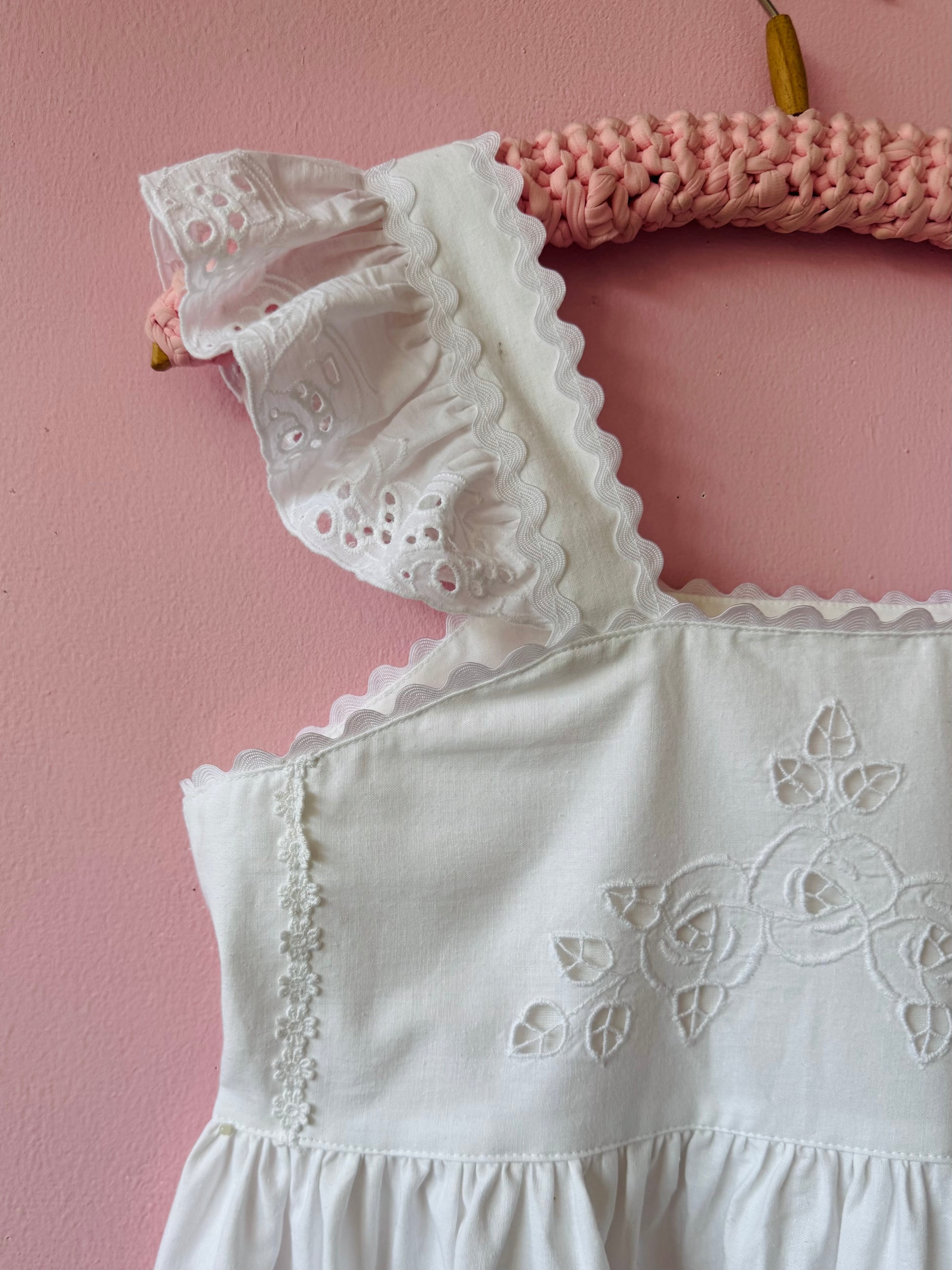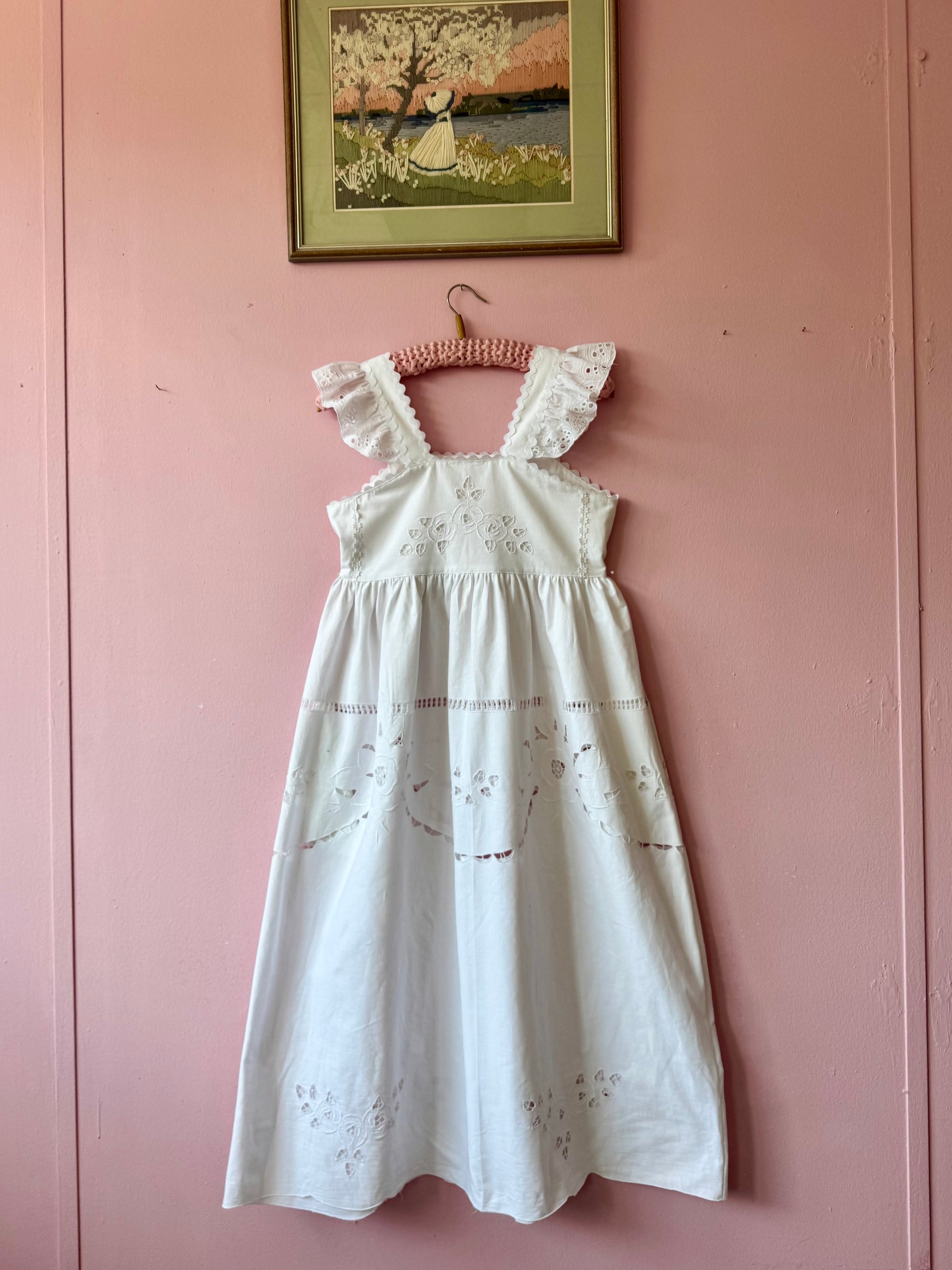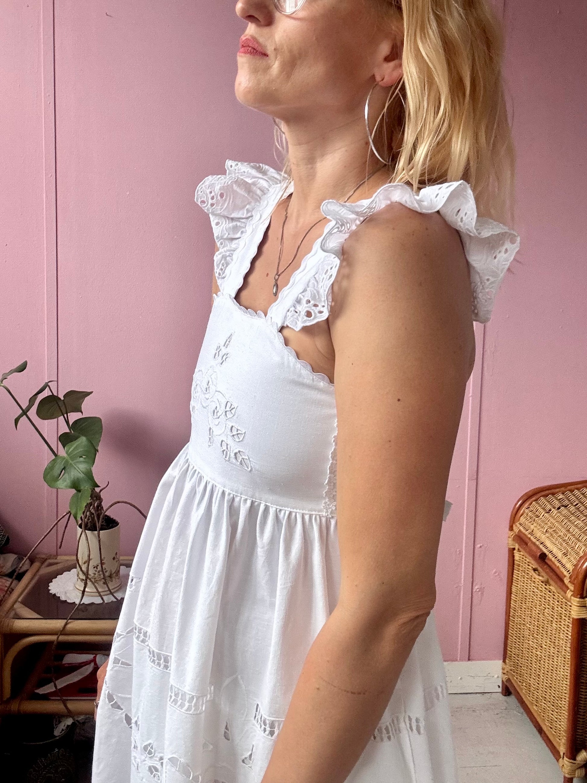 White cotton midi dress made from vintage tablecloth with cut out floral embroidery