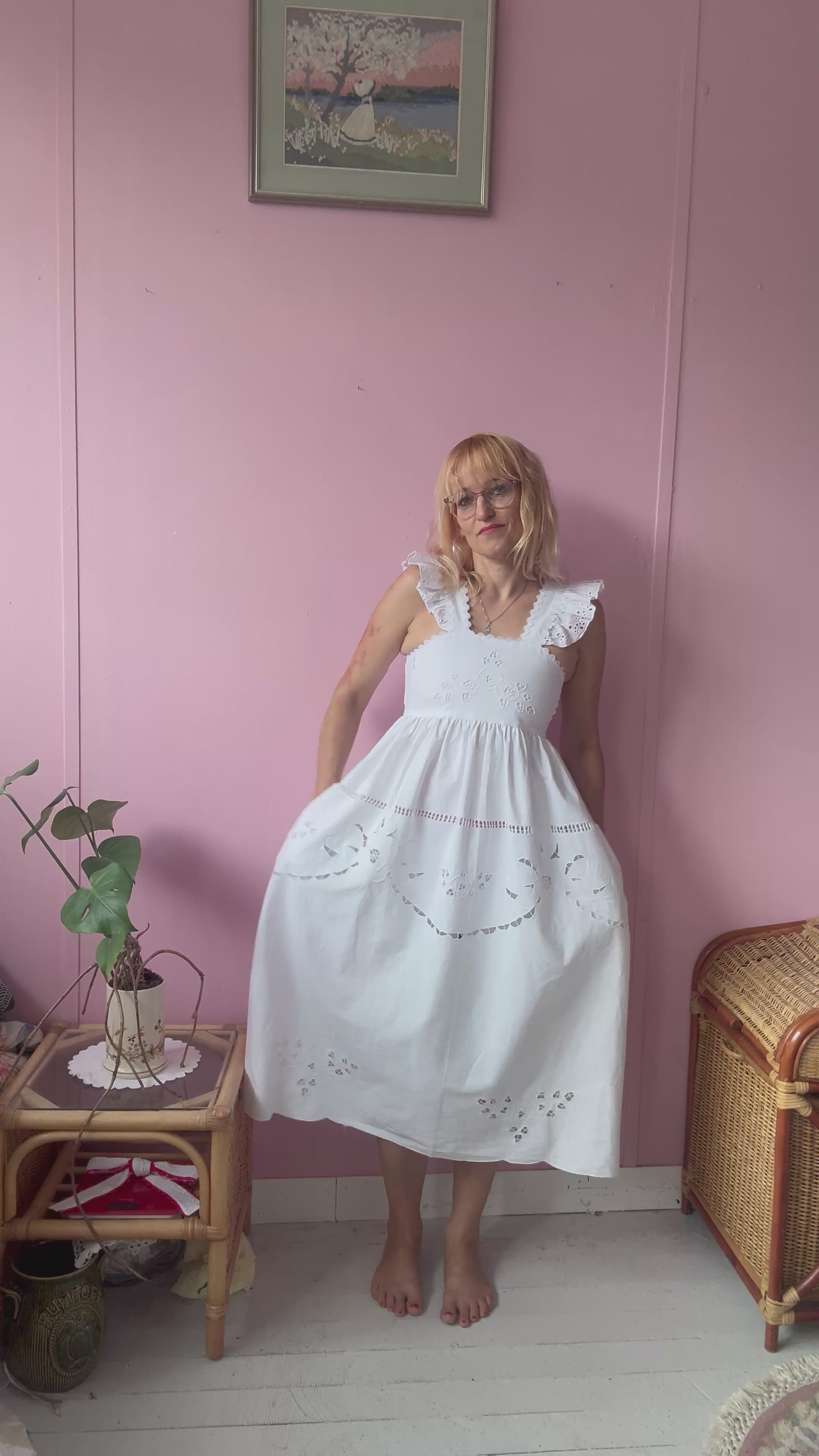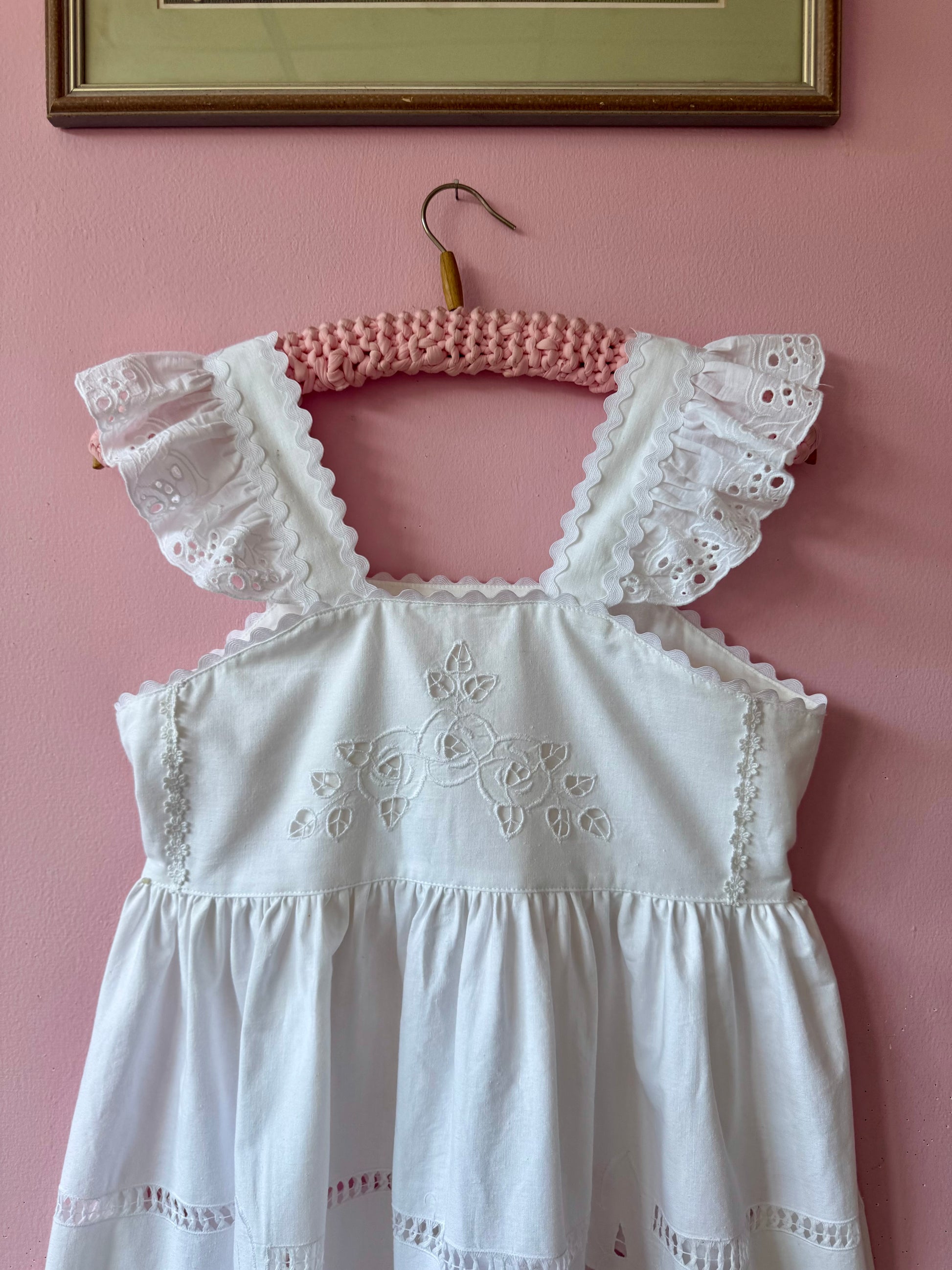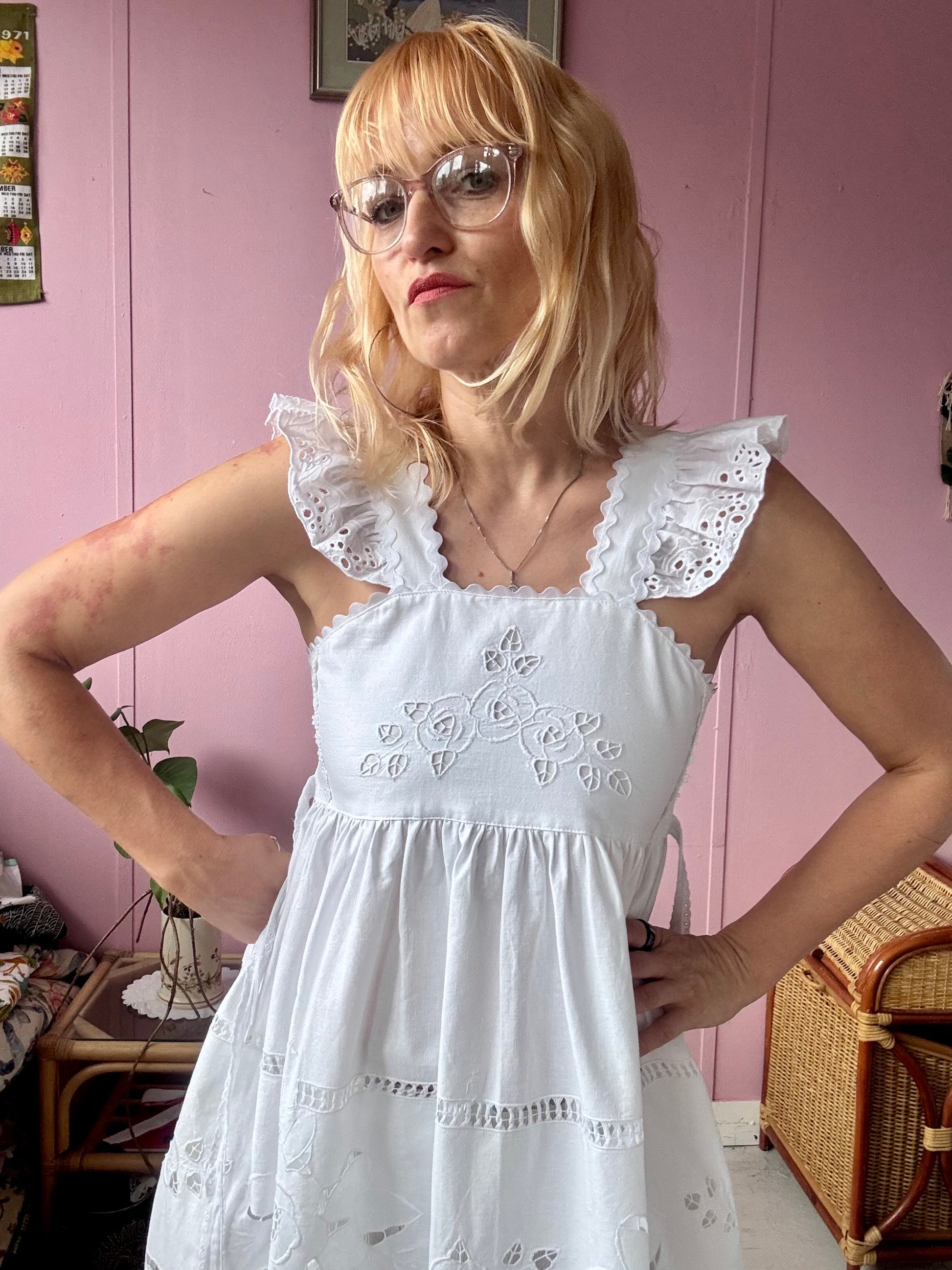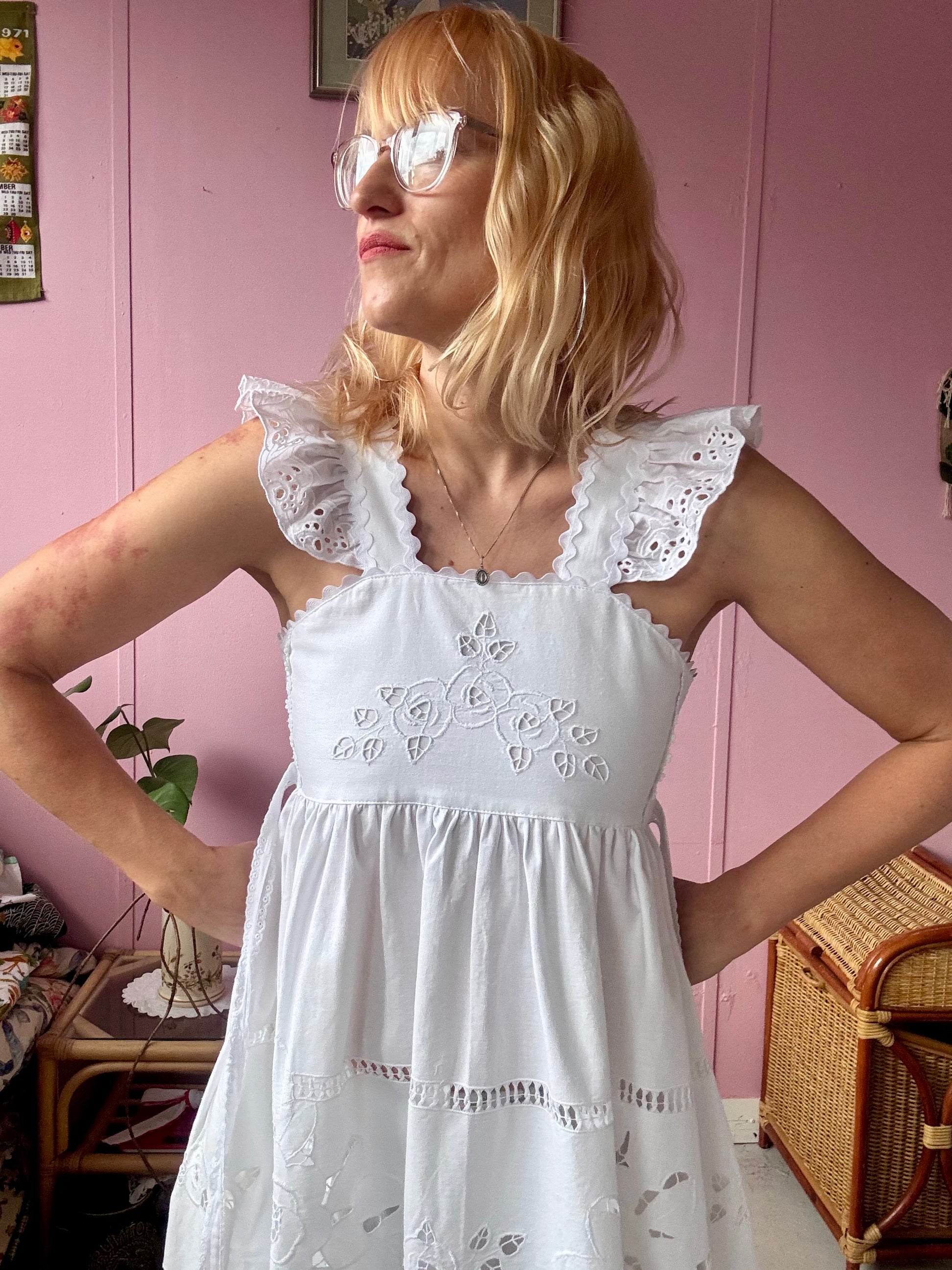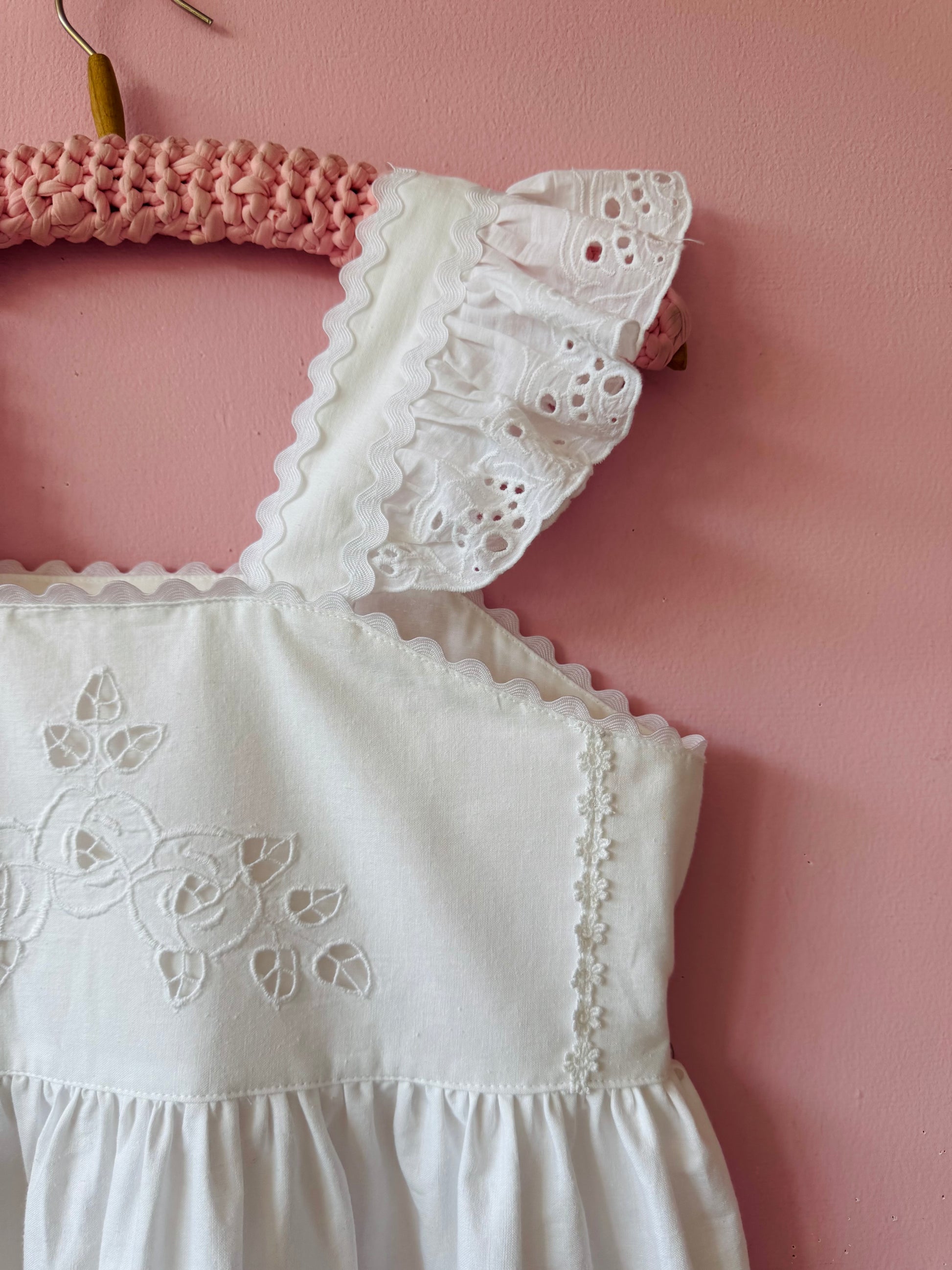 White cotton midi dress made from vintage tablecloth with cut out floral embroidery