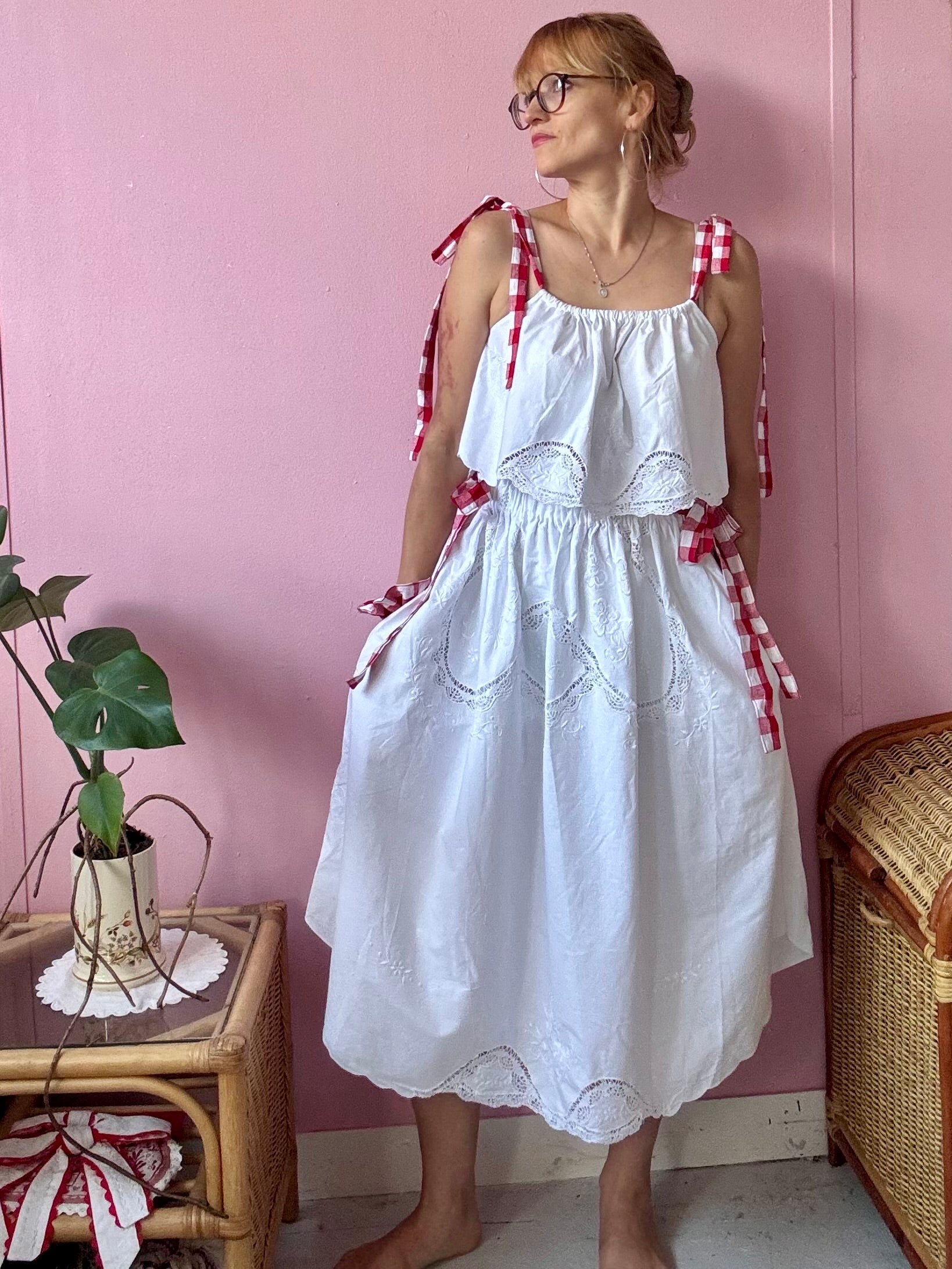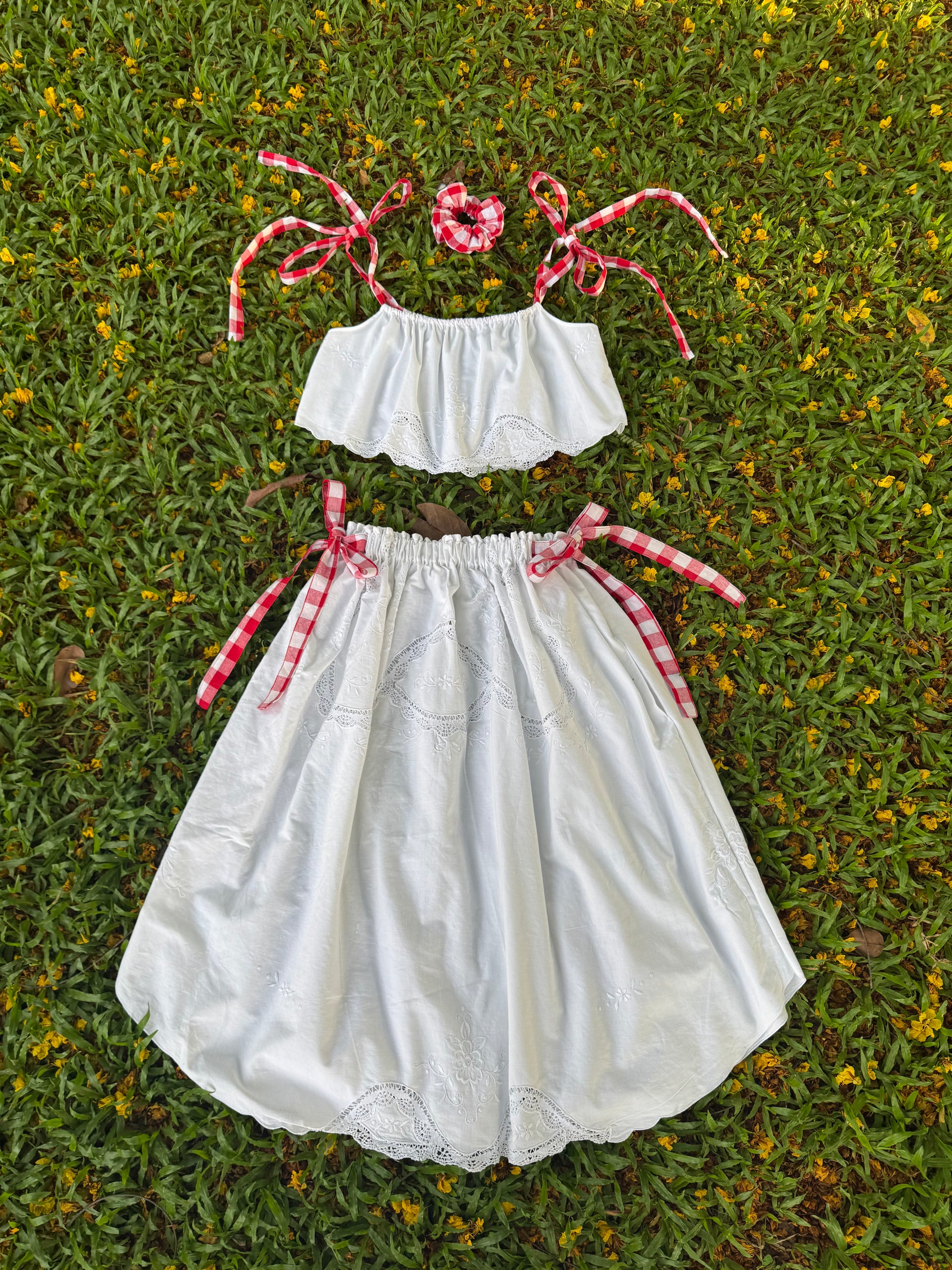 White cotton skirt and top set made from Vintage tablecloth with all white hand embroidery lace