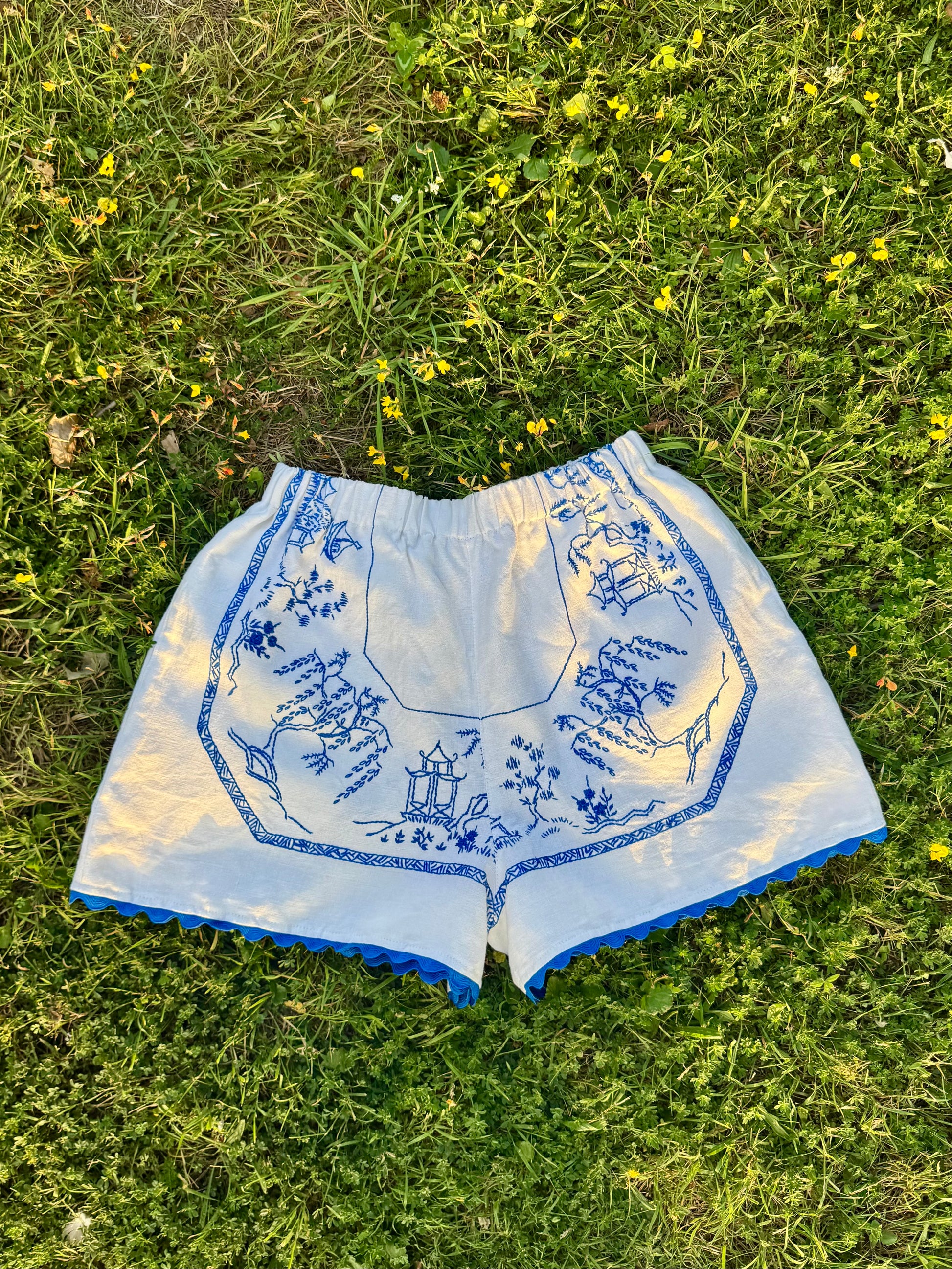 White shorts with blue hand embroidery