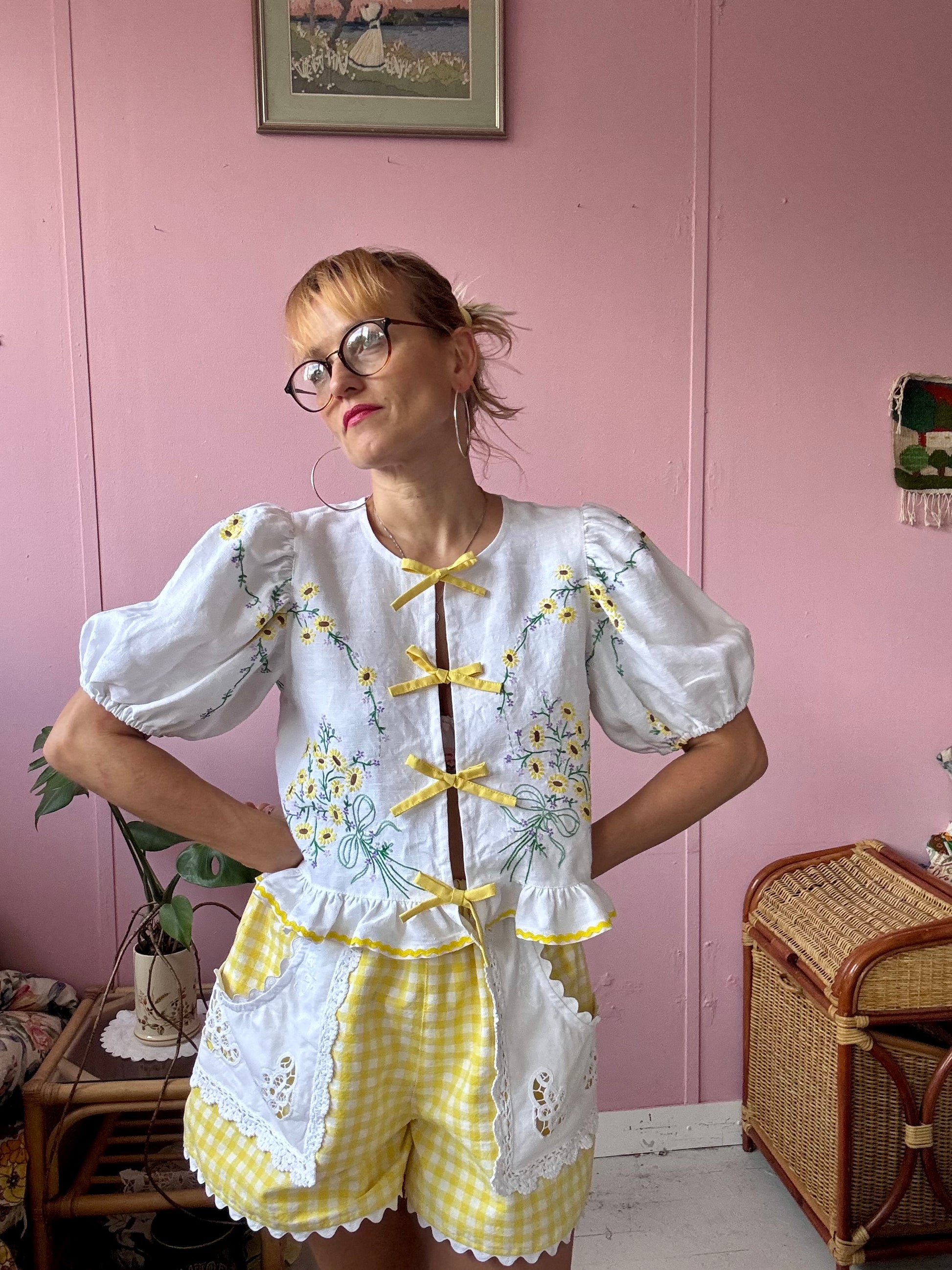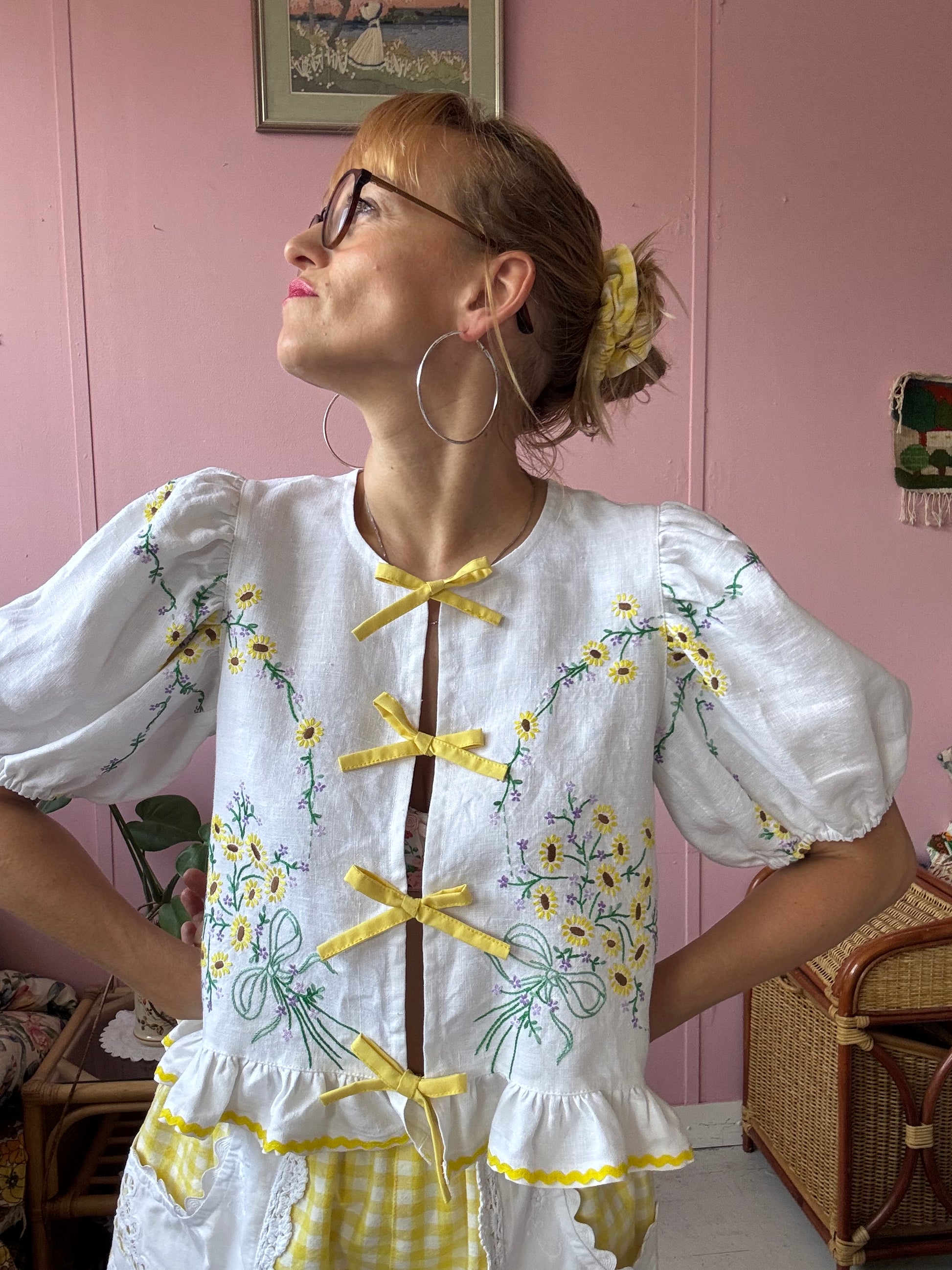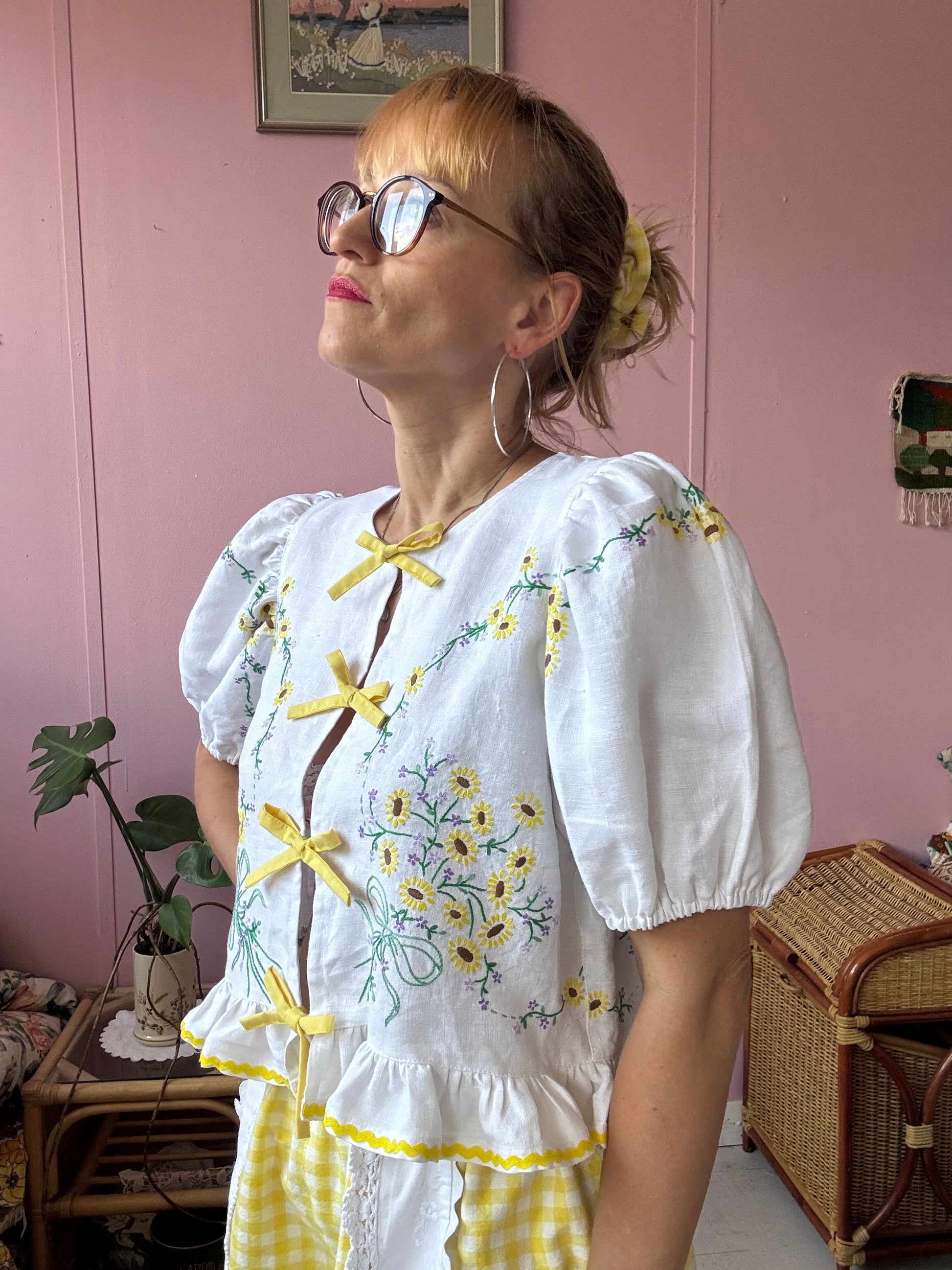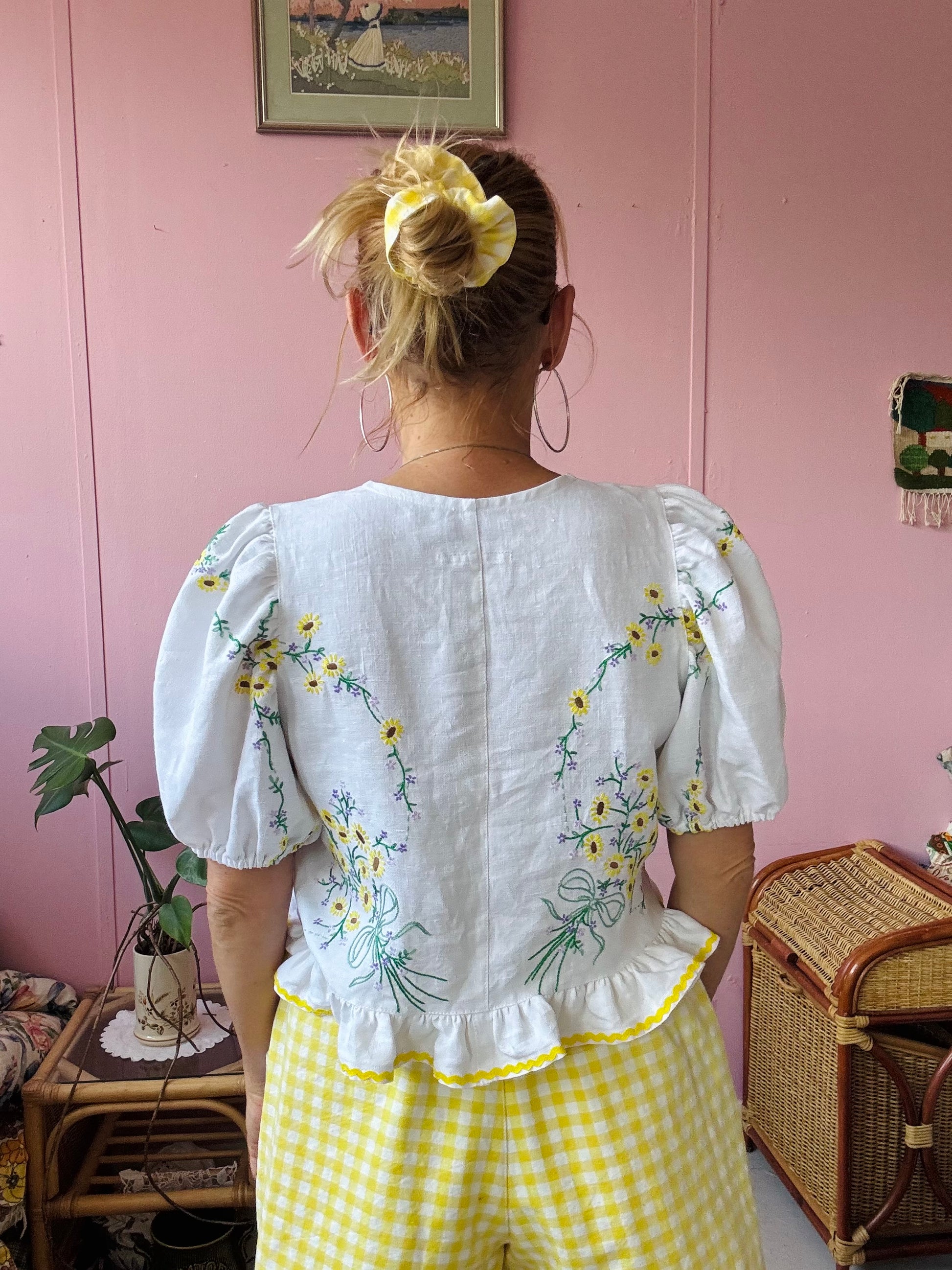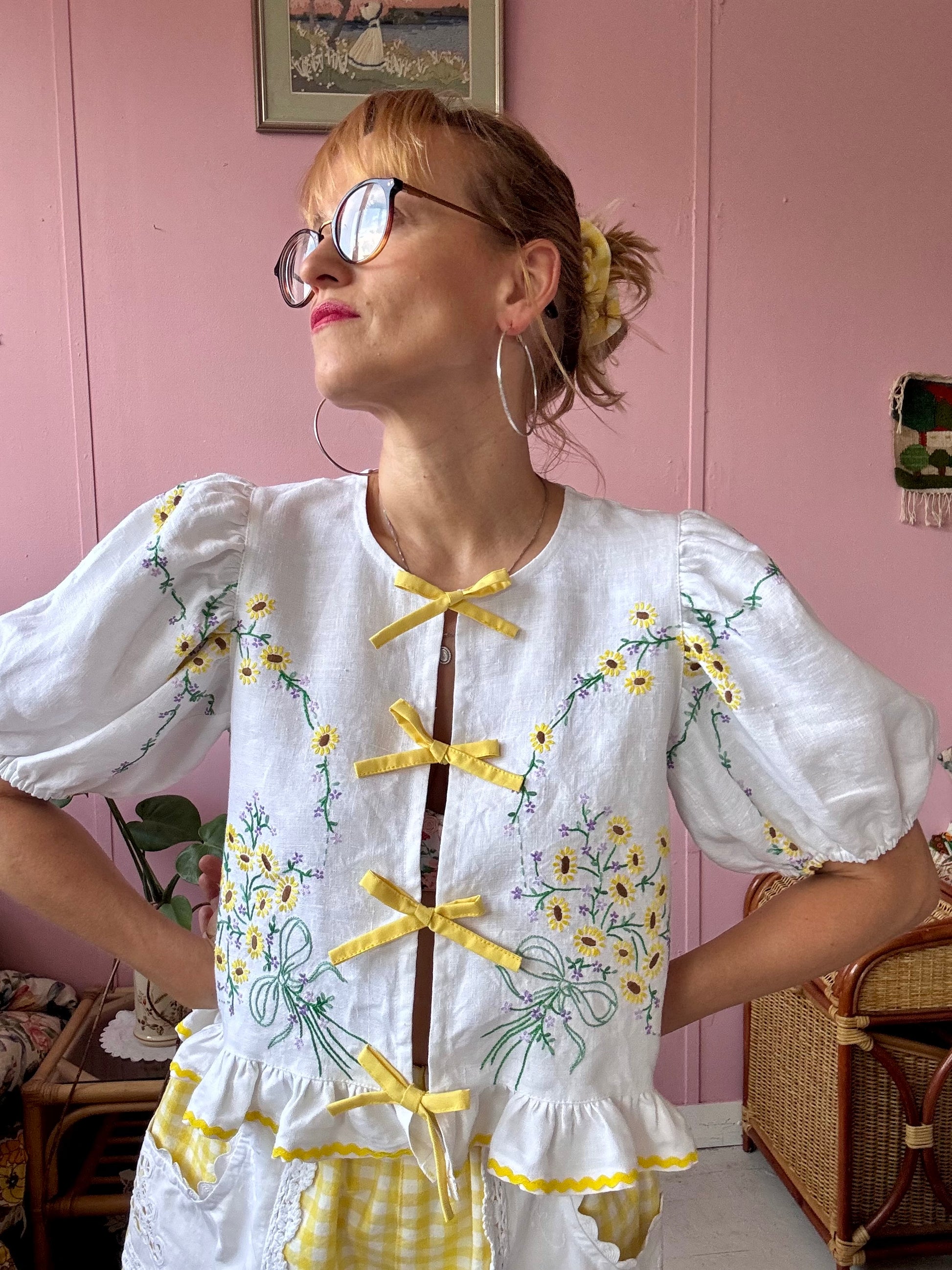 floral blouse made from vintage tablecloth with hand embroidery -beautiful yellow all over flowers
