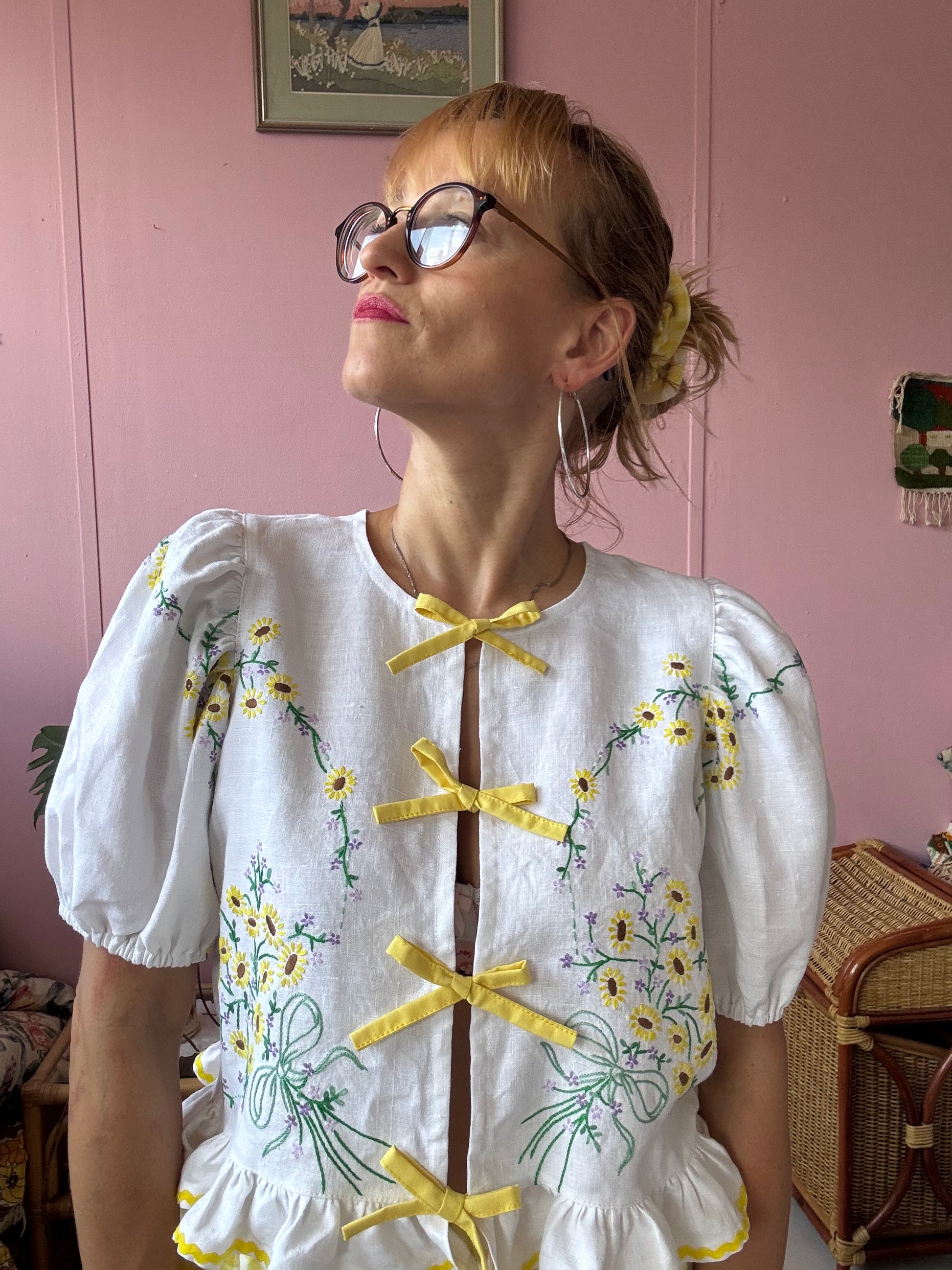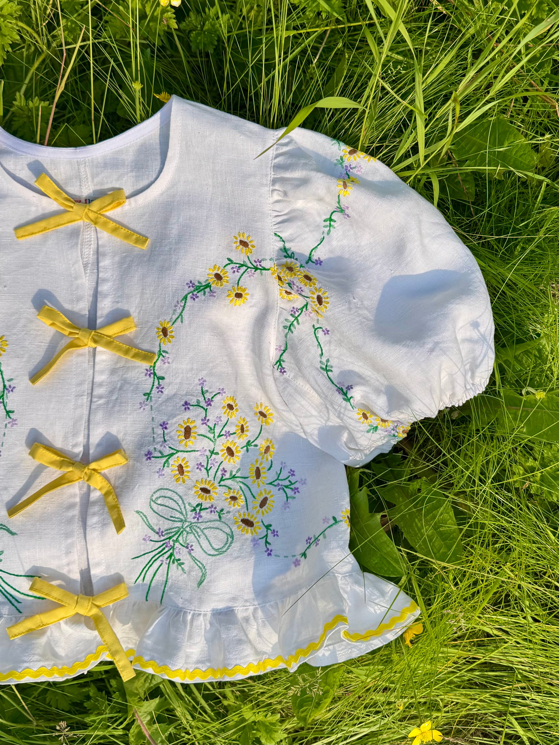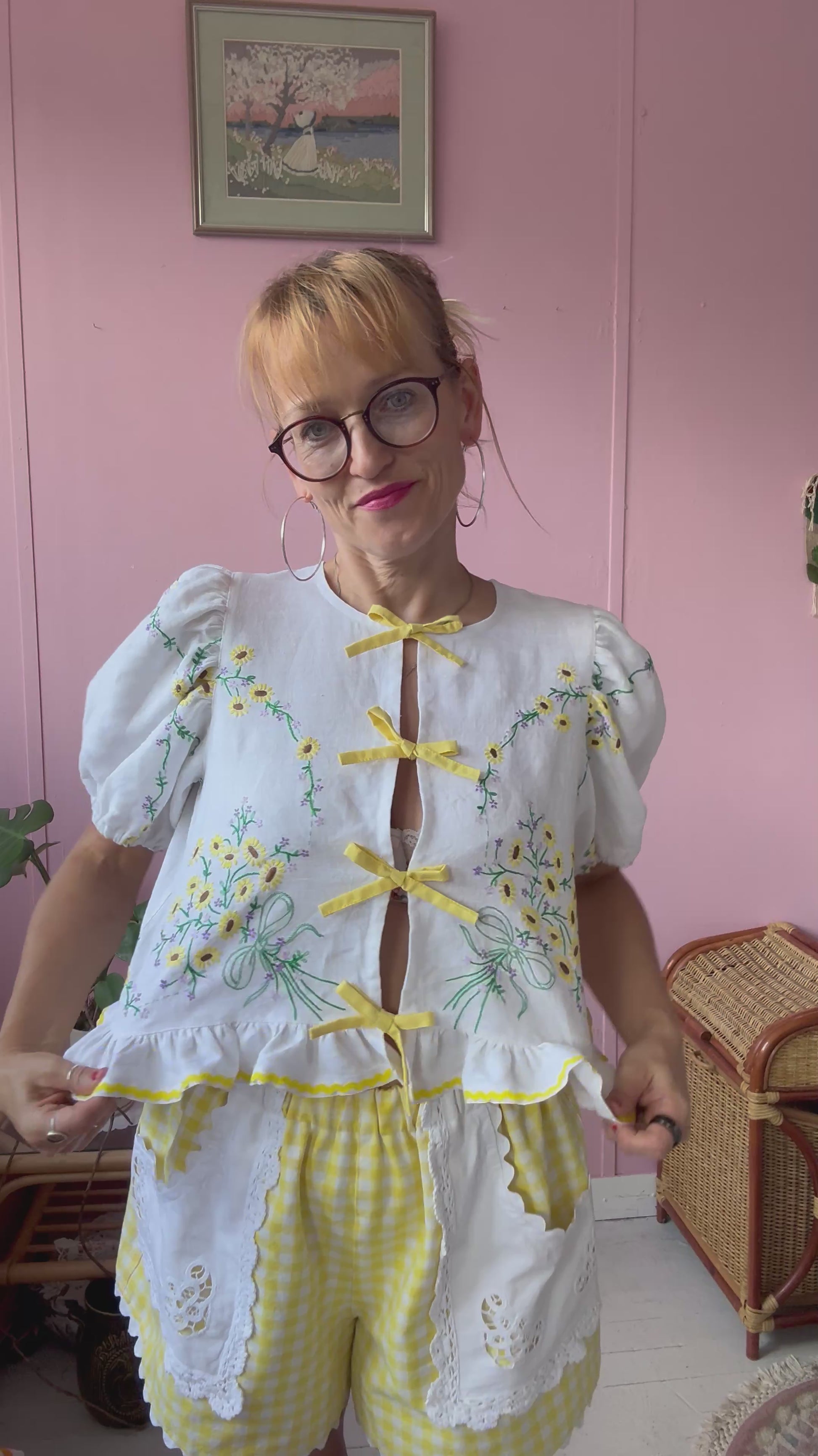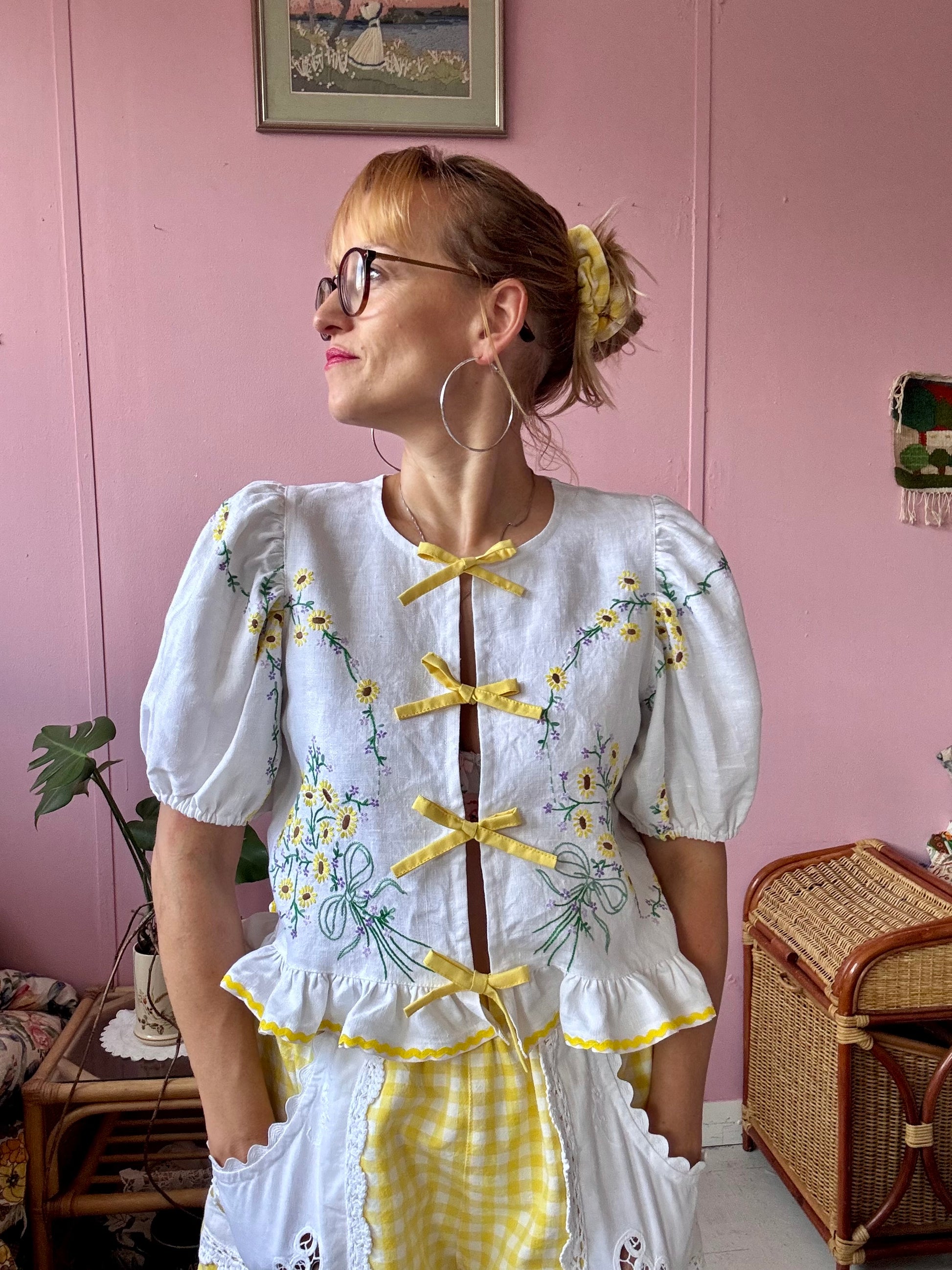 floral blouse made from vintage tablecloth with hand embroidery -beautiful yellow all over flowers
