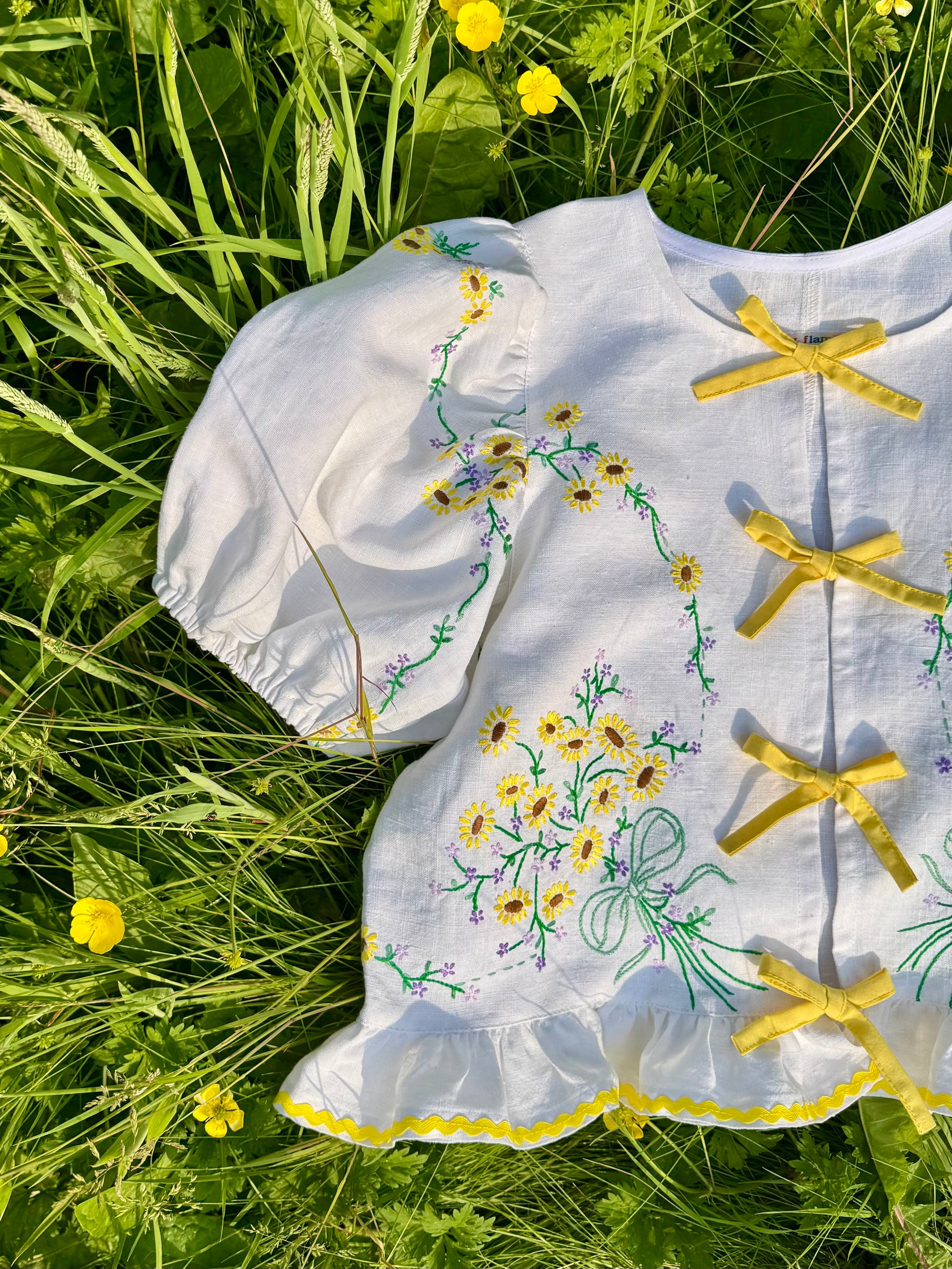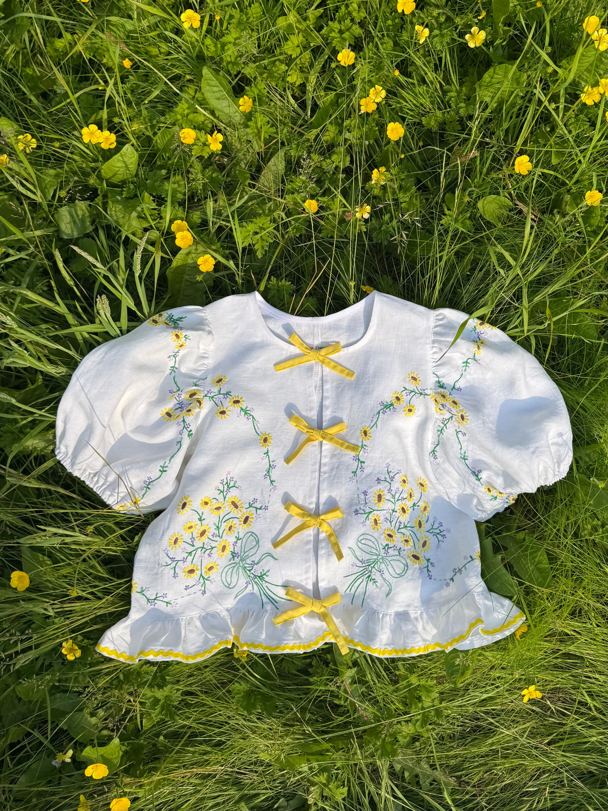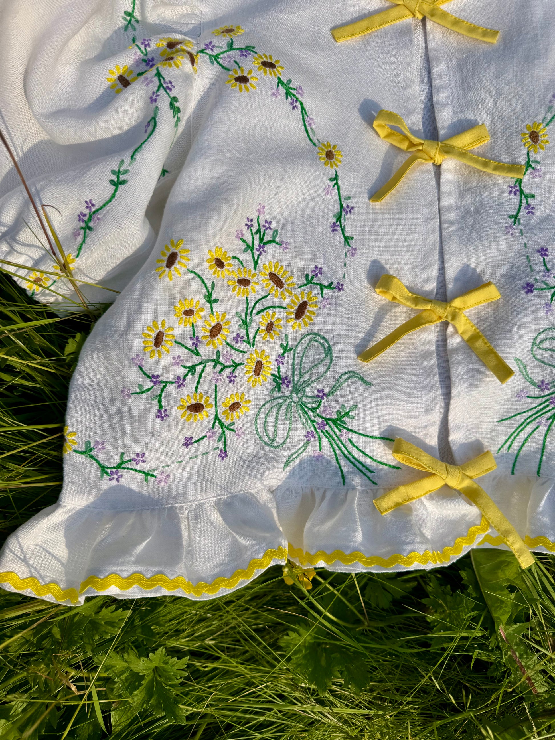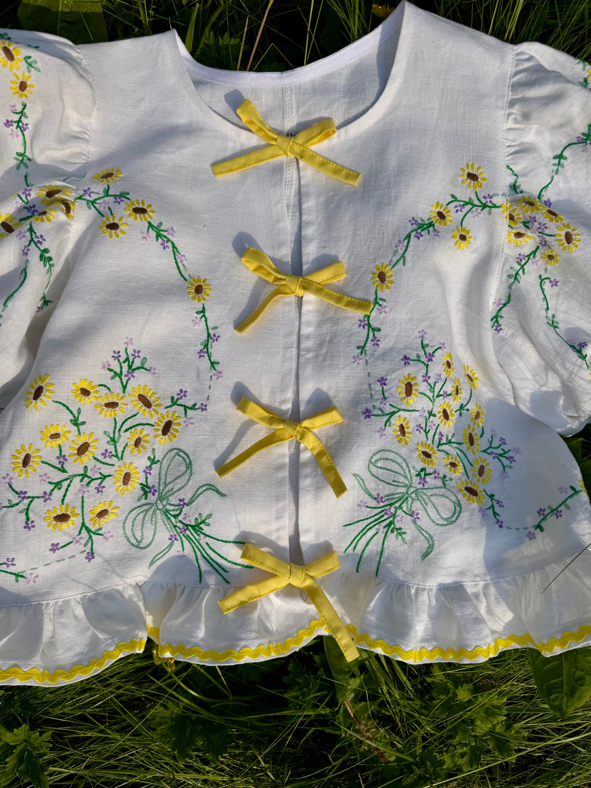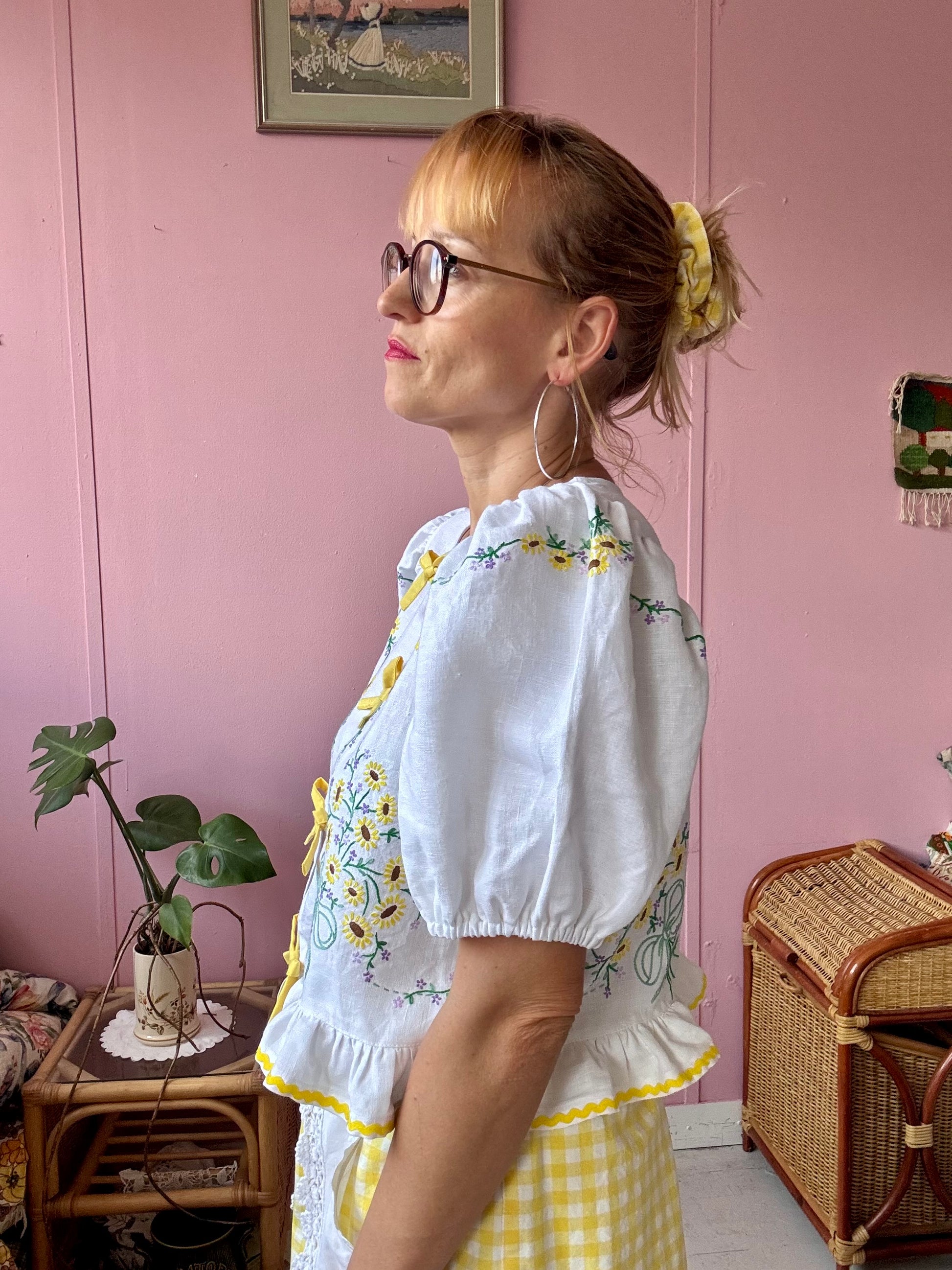 floral blouse made from vintage tablecloth with hand embroidery -beautiful yellow all over flowers