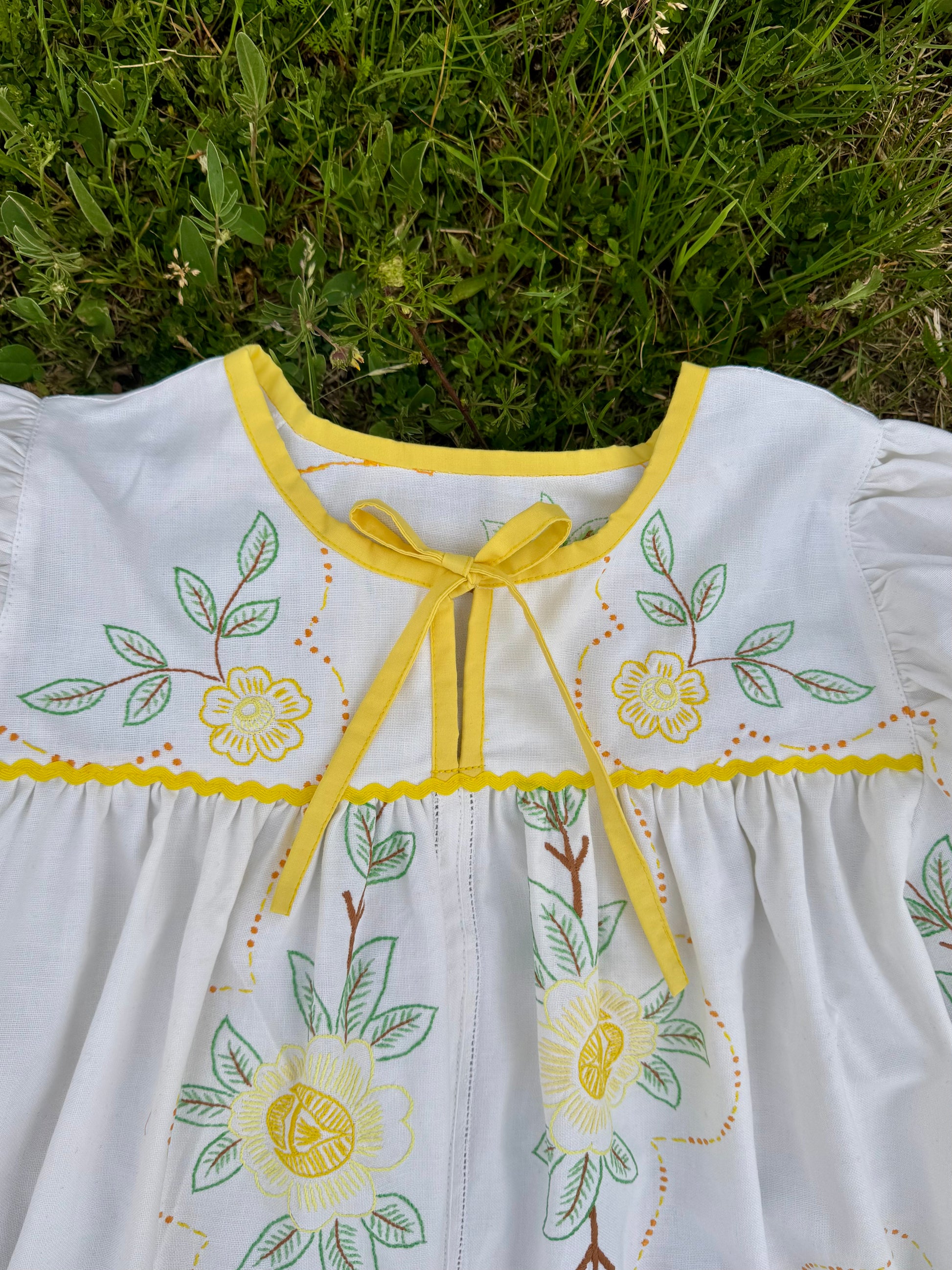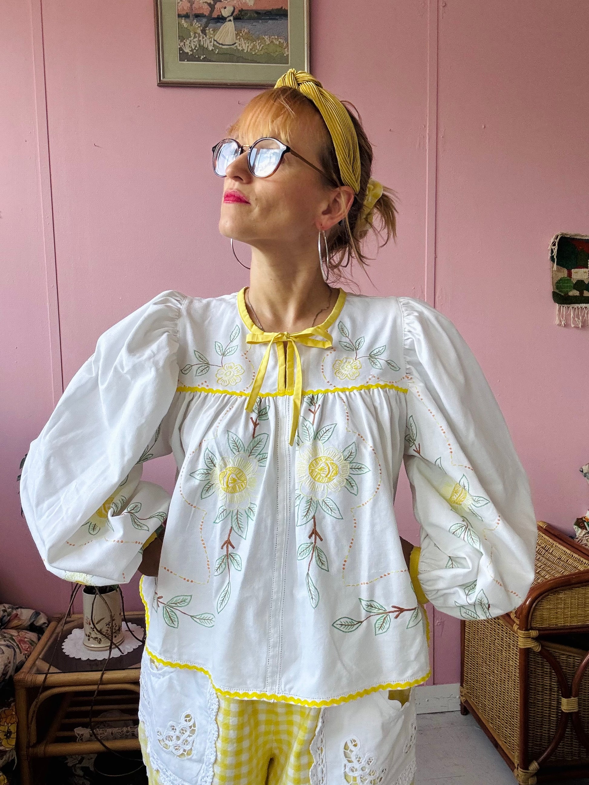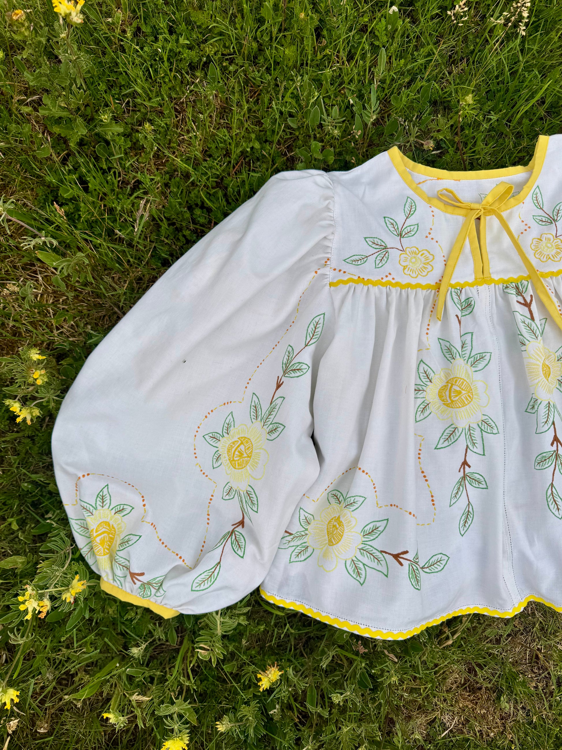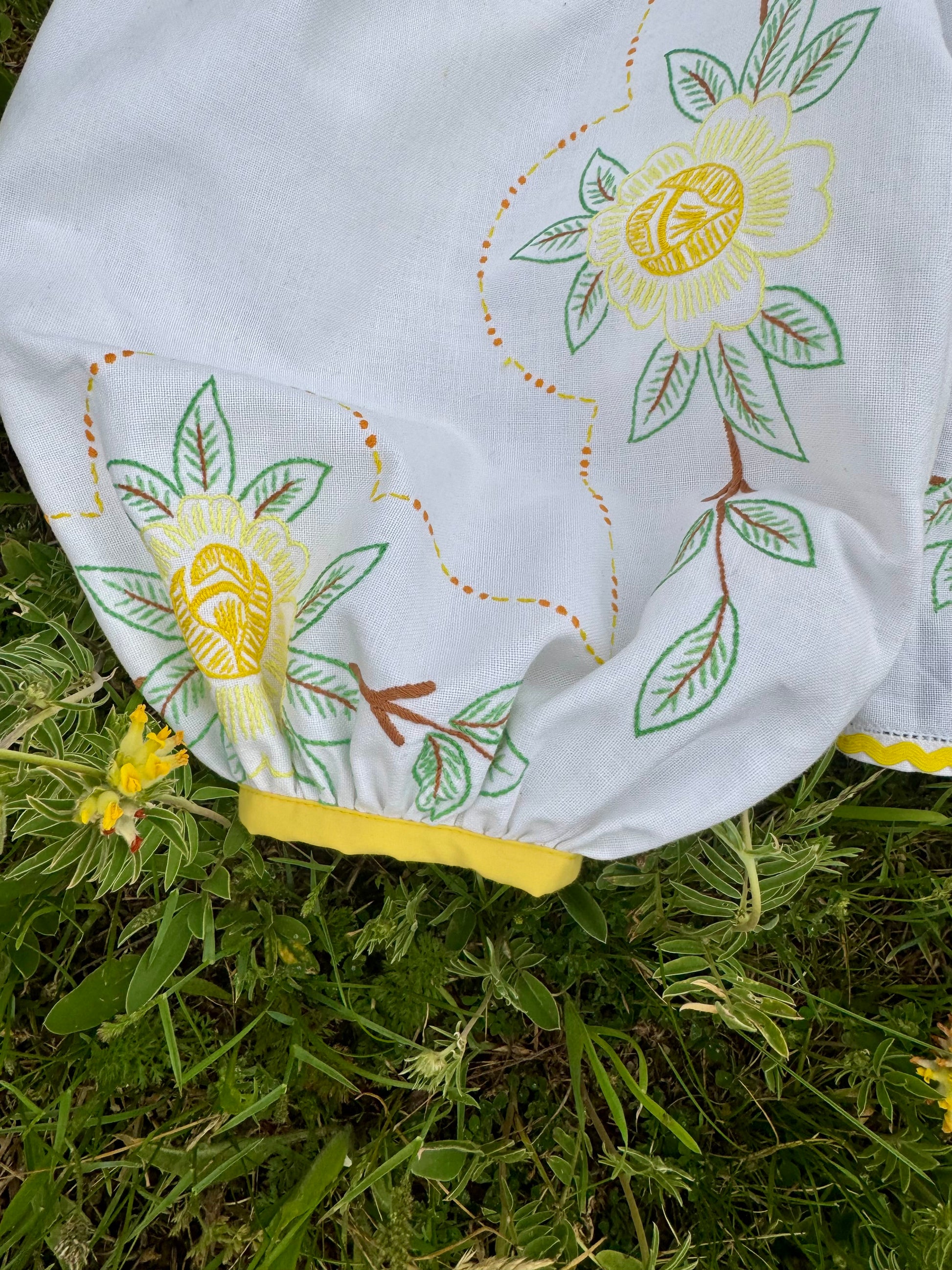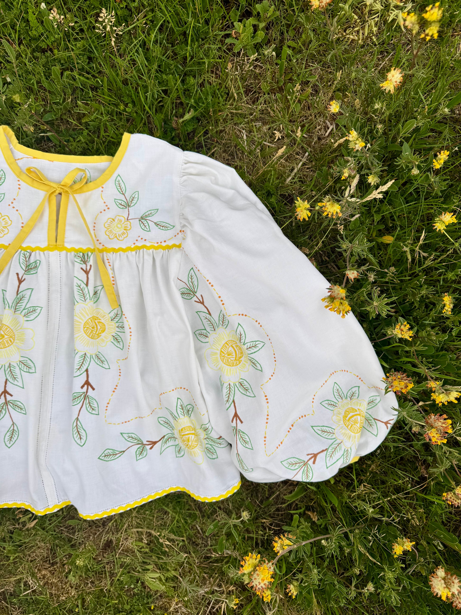 floral blouse made from vintage tablecloth with hand embroidery