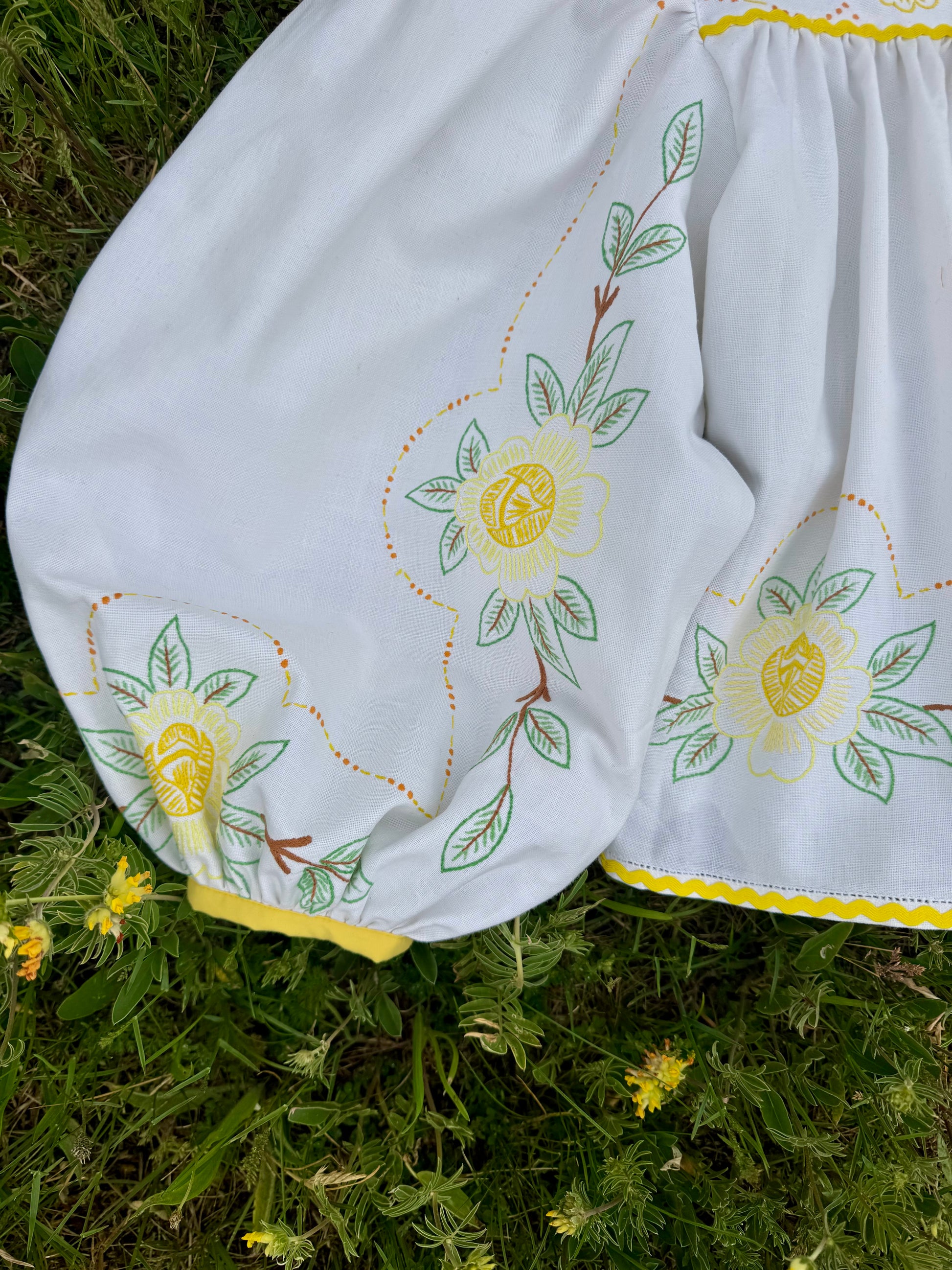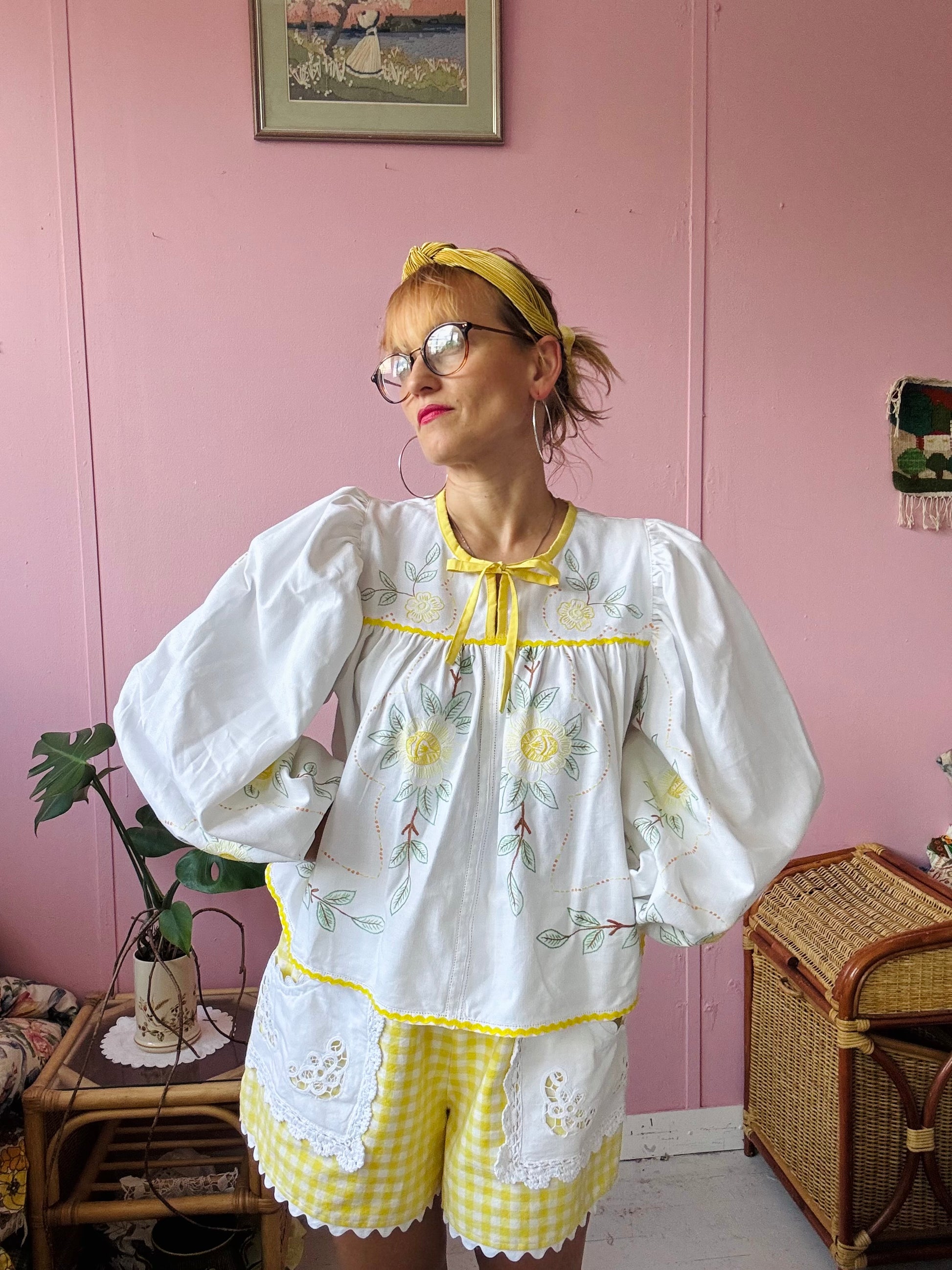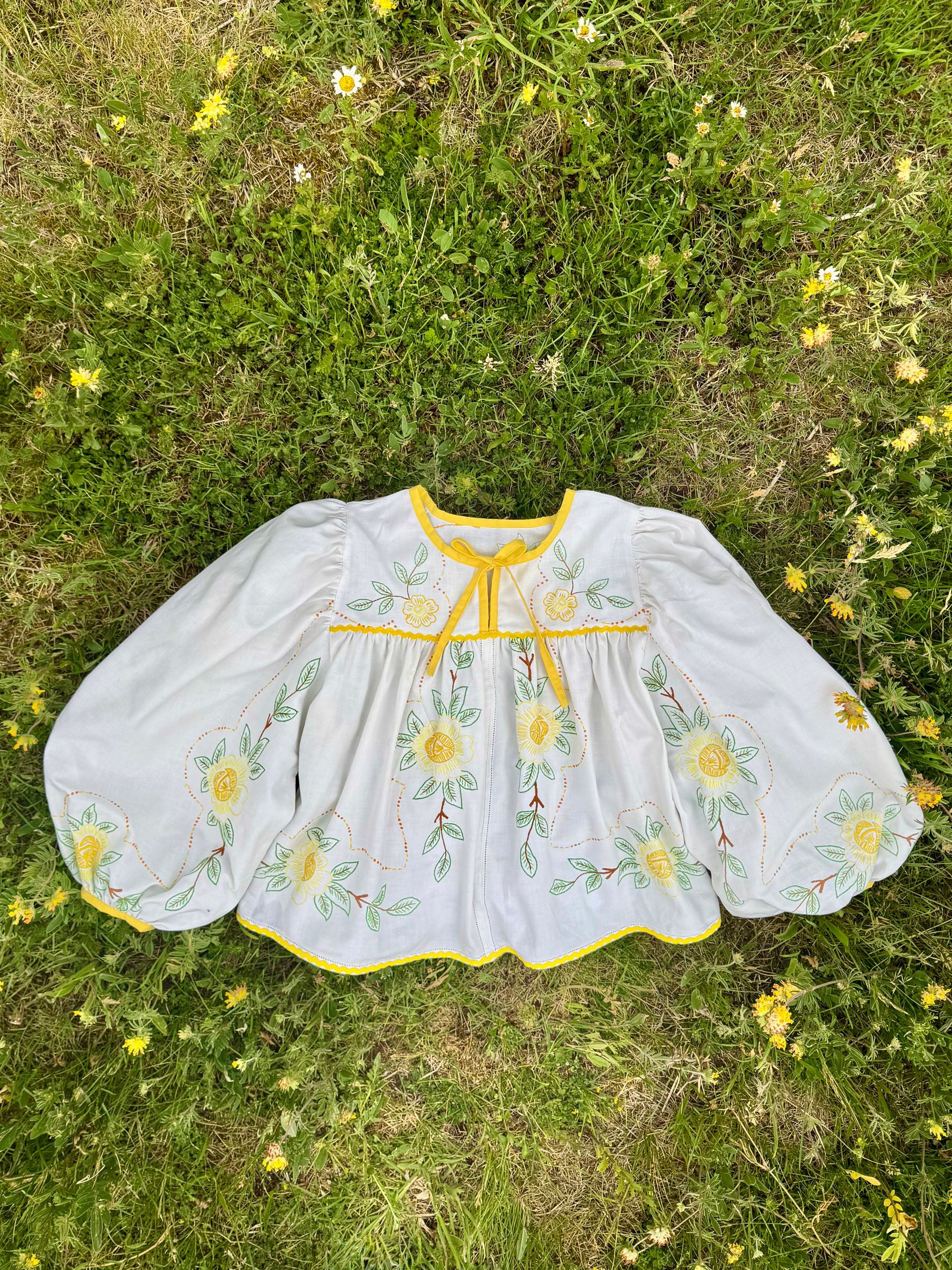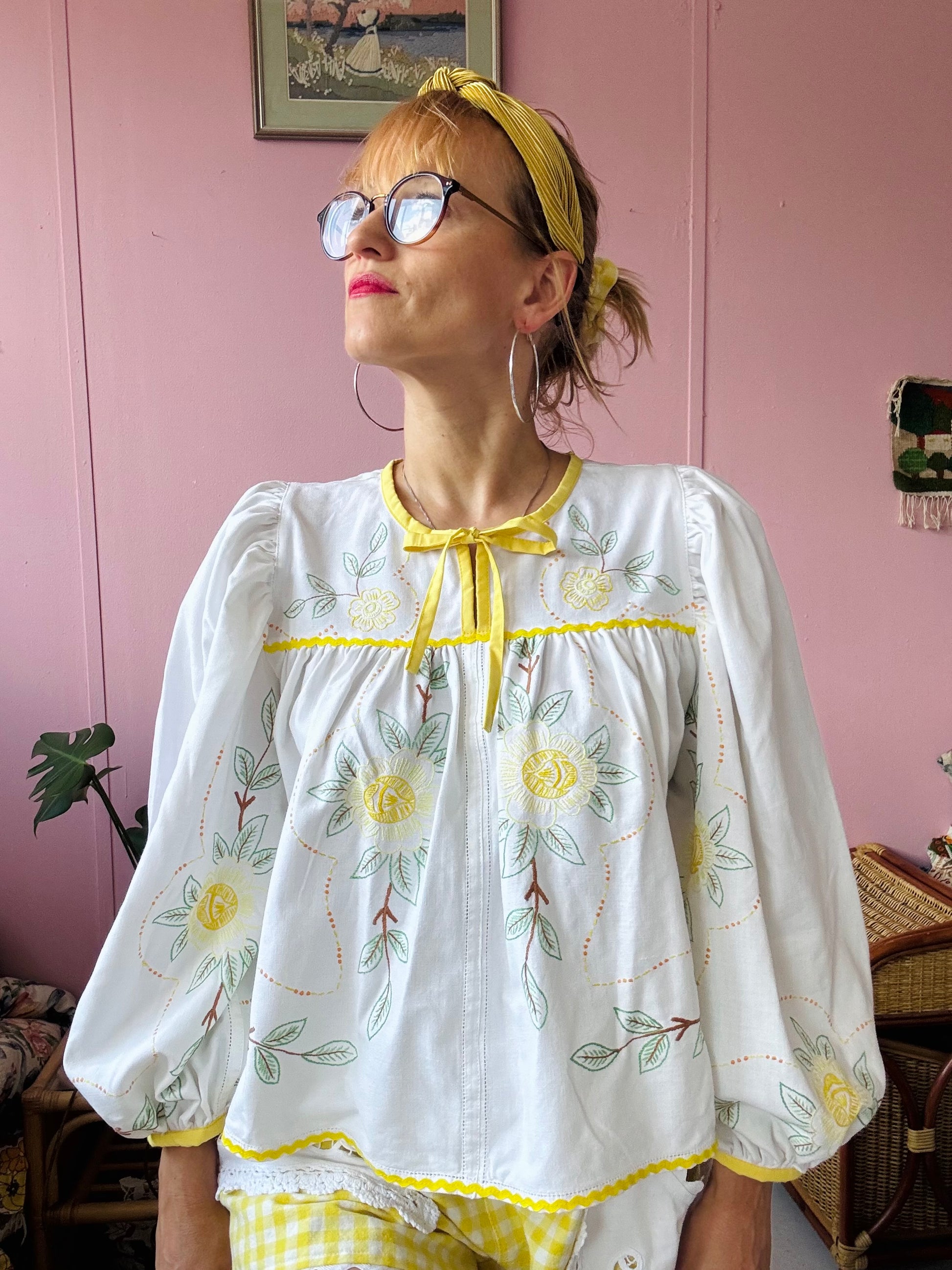 floral blouse made from vintage tablecloth with hand embroidery