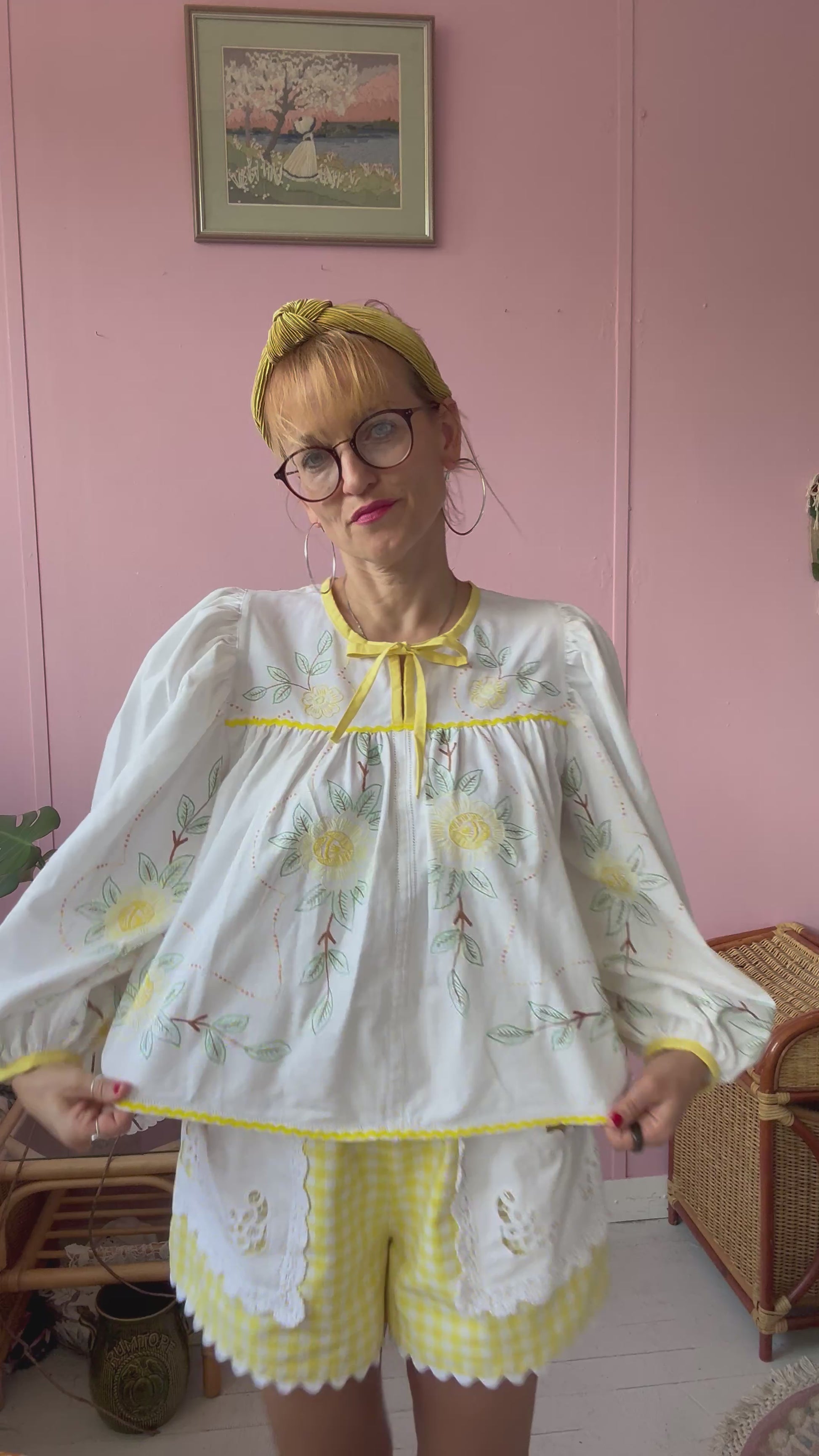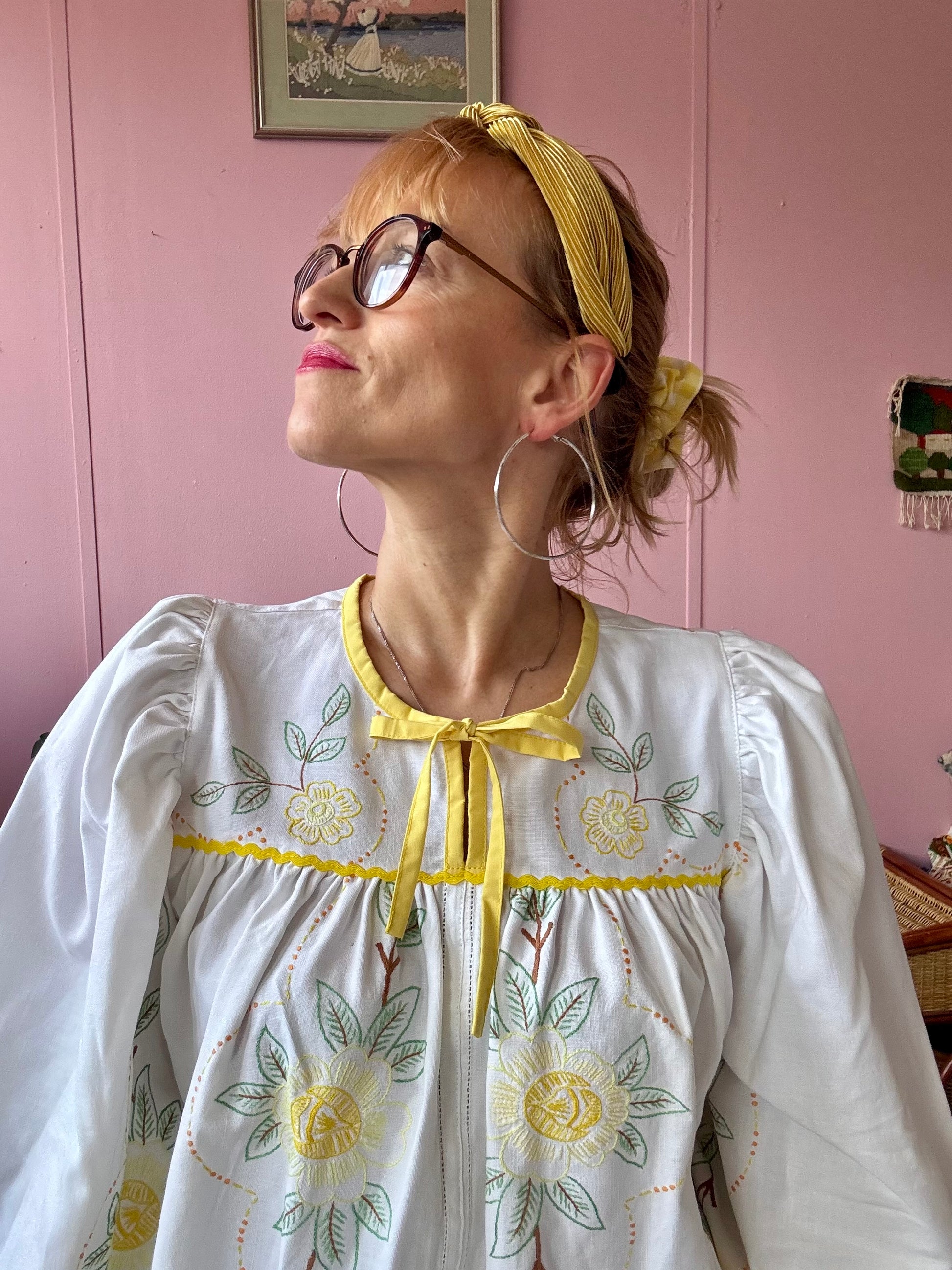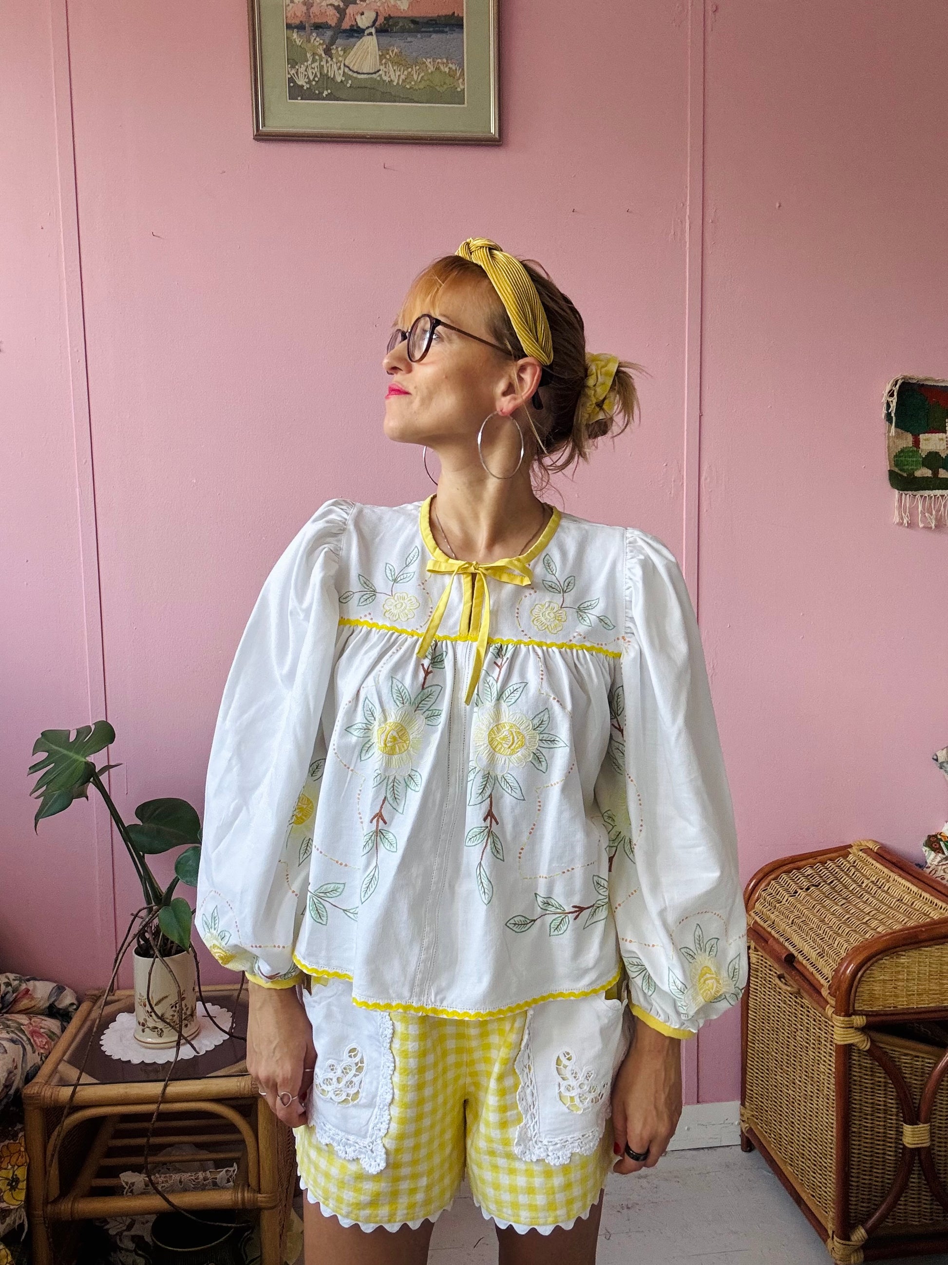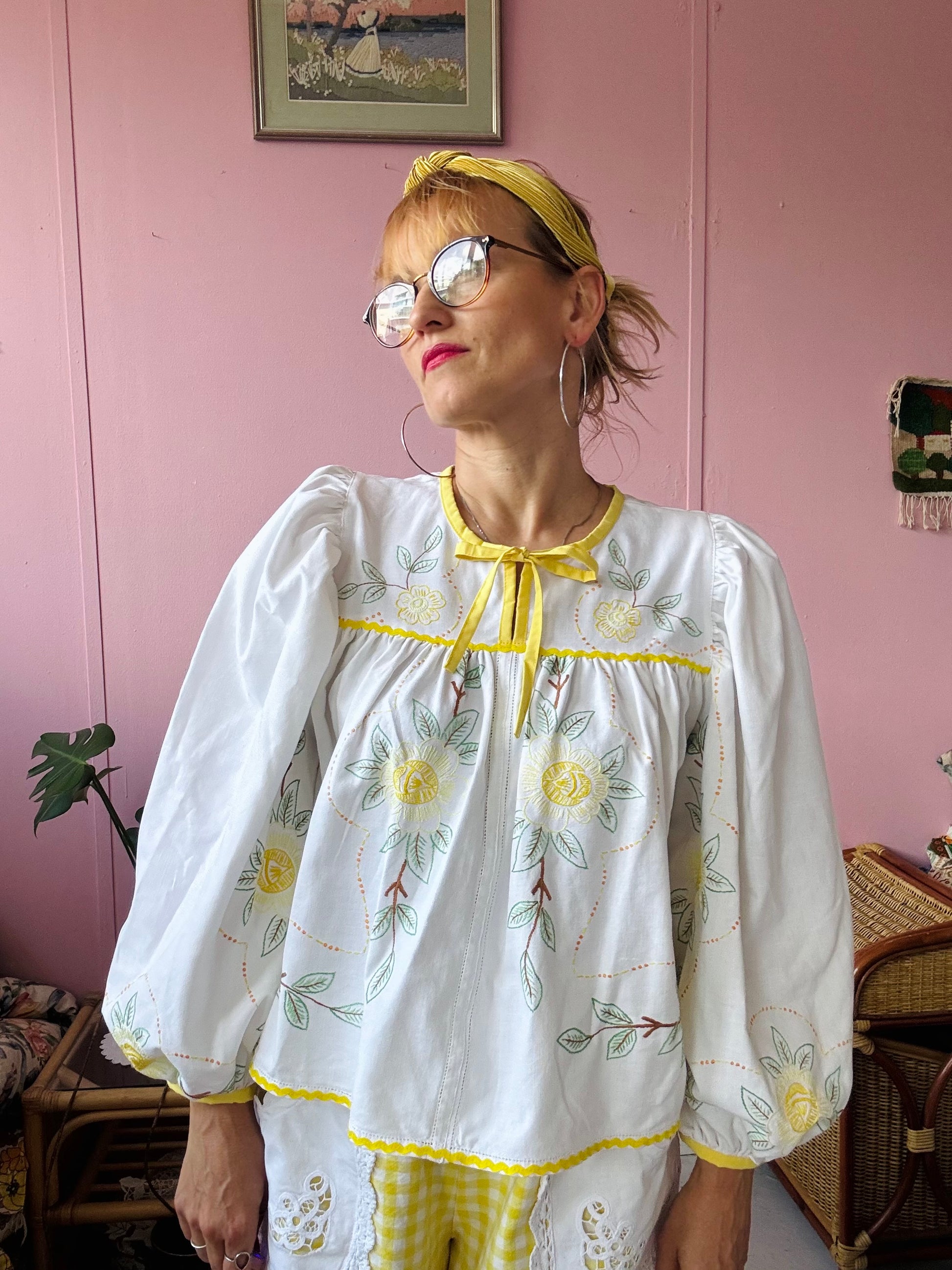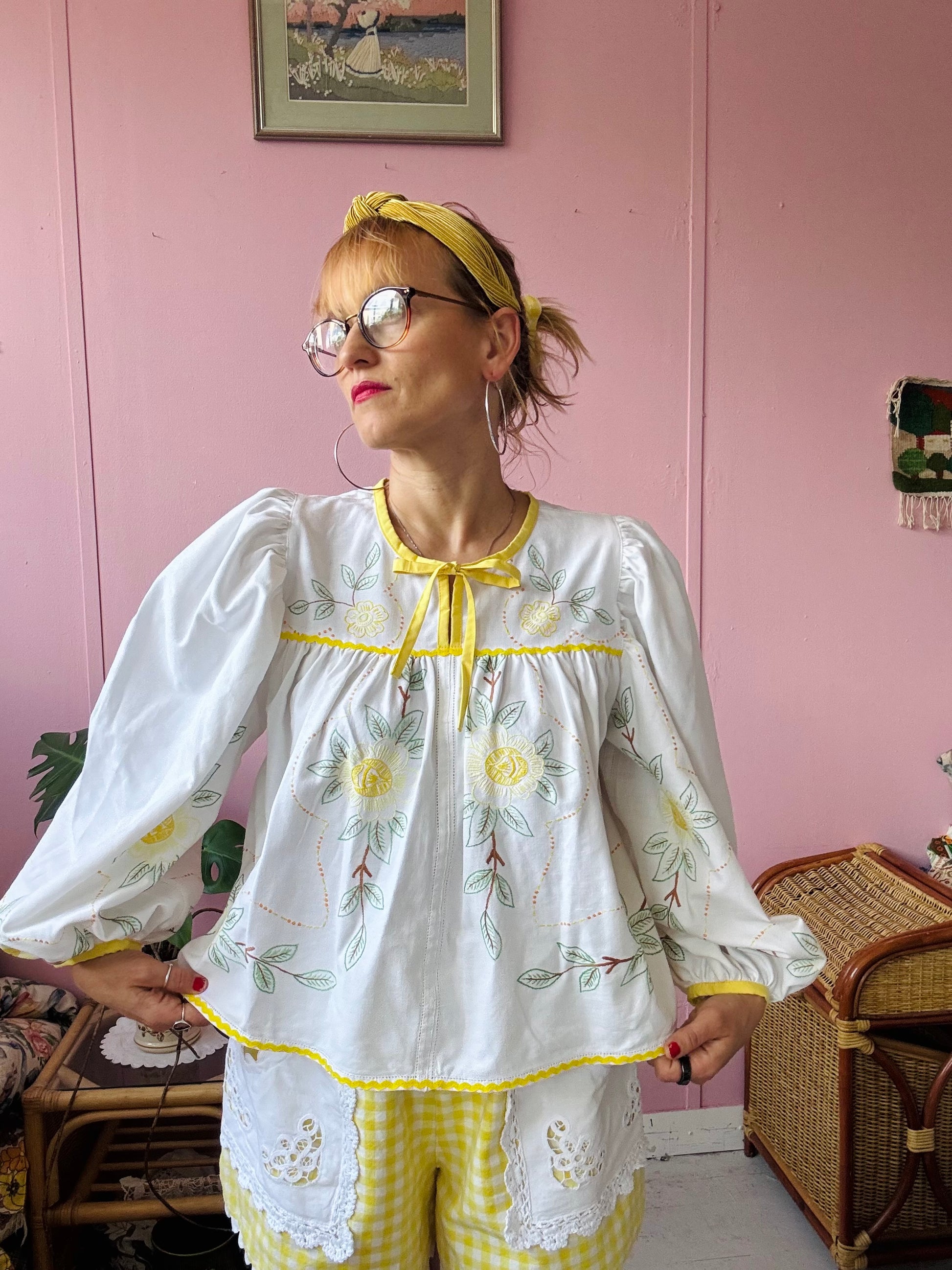 floral blouse made from vintage tablecloth with hand embroidery